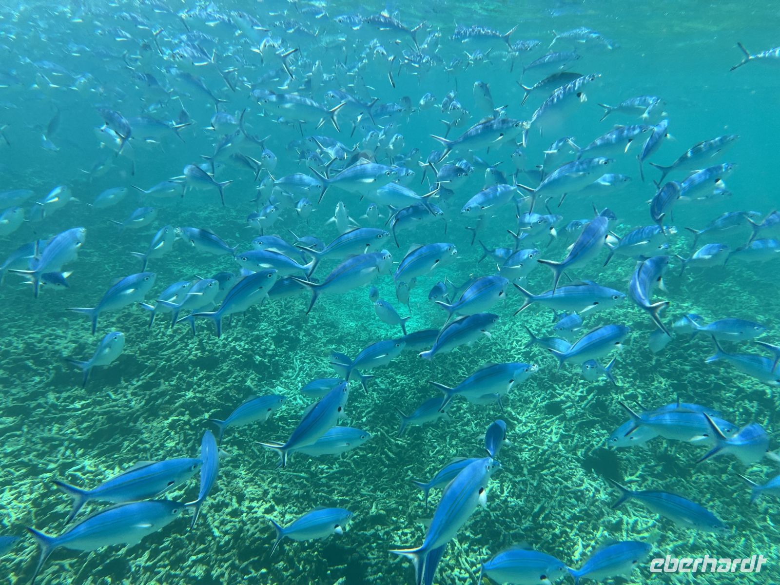 Nach einem kurzen Fotoshooting mit den Schildkröten, begeben wir uns wieder aufs Boot und machen uns bereits, für eine weitere Schnorcheleinheit. Diesmal halten wir an der kleinen Insel St. Pierre und gehen direkt vom Boot ins Wasser. Neben bunten Fischen, haben einige sogar das Glück und sehen eine Schildkröte.