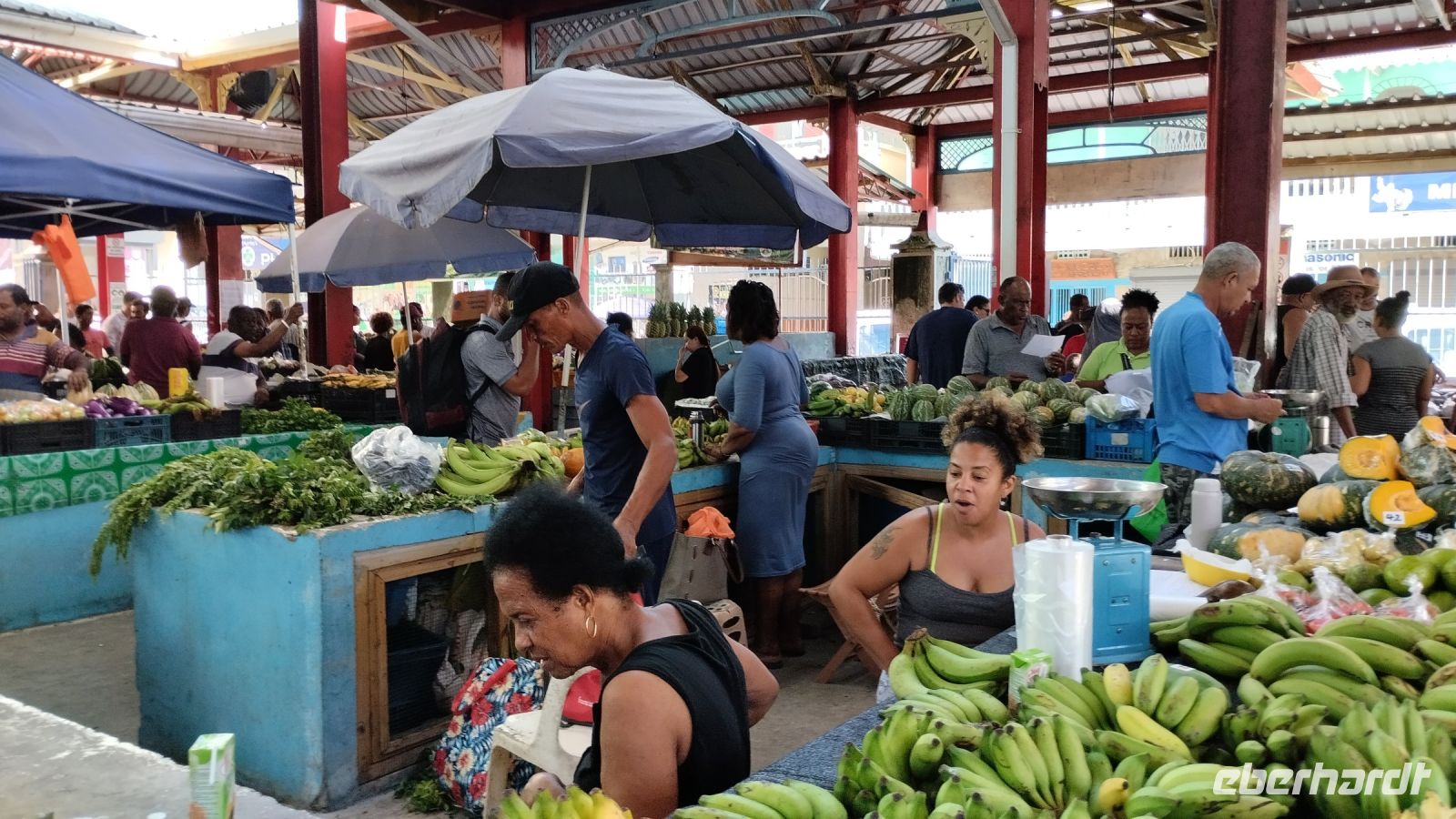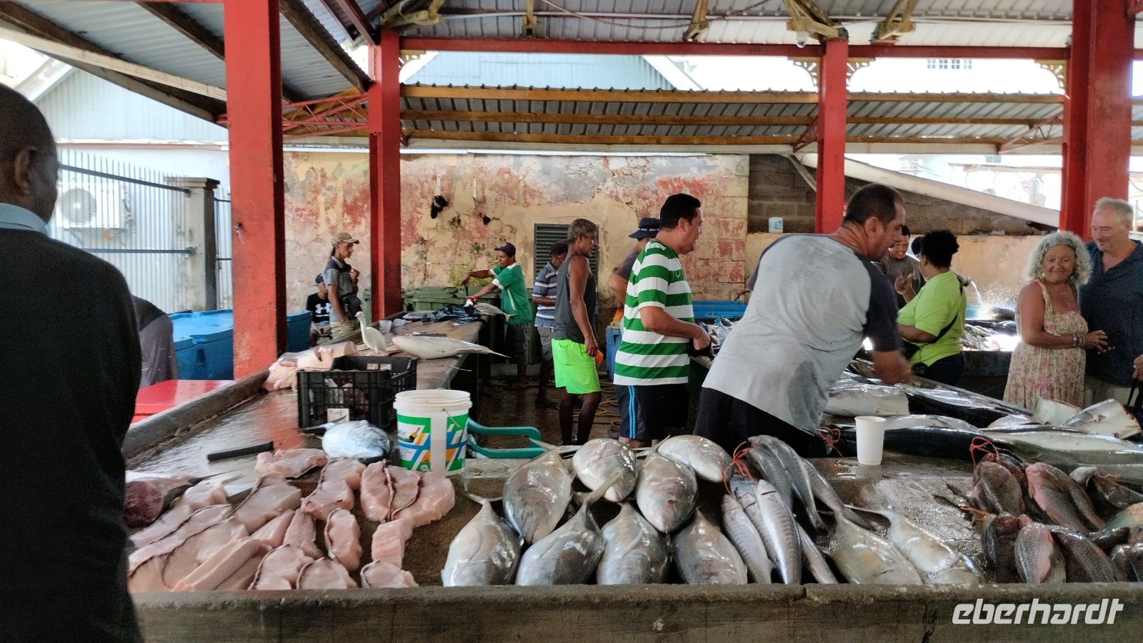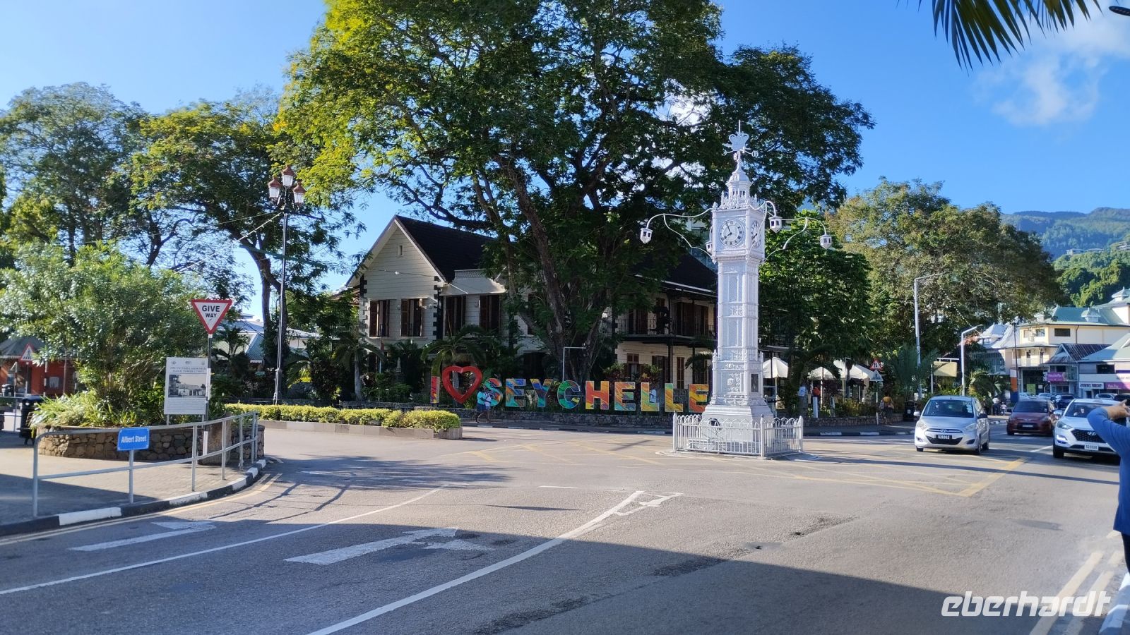 Nach einer kurzen Frühstückspause in einem Cafe am Flughafen erkunden wir die Hauptstadt Viktoria und laufen durch die engen Straßen an dem bekannten "Big Ben" vorbei zur überfüllten Markthalle. Fisch-, Obst- und Gewürzverkäufer lächeln uns manchmal an, aber sie wissen: die Touristen schauen lieber, als sie etwas kaufen... Nach dem Besuch von dem hinduistischen Tempel und der katholischen Kirche fahren wir direkt zum Hotel. Die Hitze und die Müdigkeit machen uns doch sehr zu schaffen.