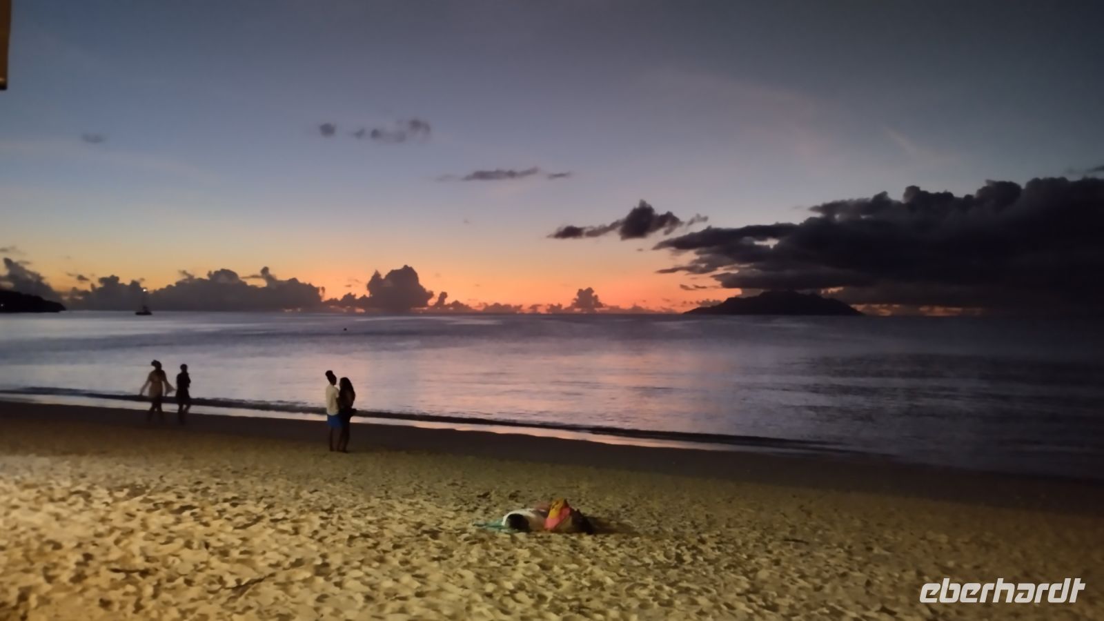 Um 16:30 Uhr werden wir abgeholt. Wir machen eine Bootsrundfahrt um die Insel La Digue und genießen dabei den schönen Sonnenuntergang und den örtlichen Rum Takamaka. Das Meer ist ruhig, es weht fast kein Wind. Wir haben also die besten Voraussetzungen für ein tolles Foto vom Sonnenuntergang am Wasser.
