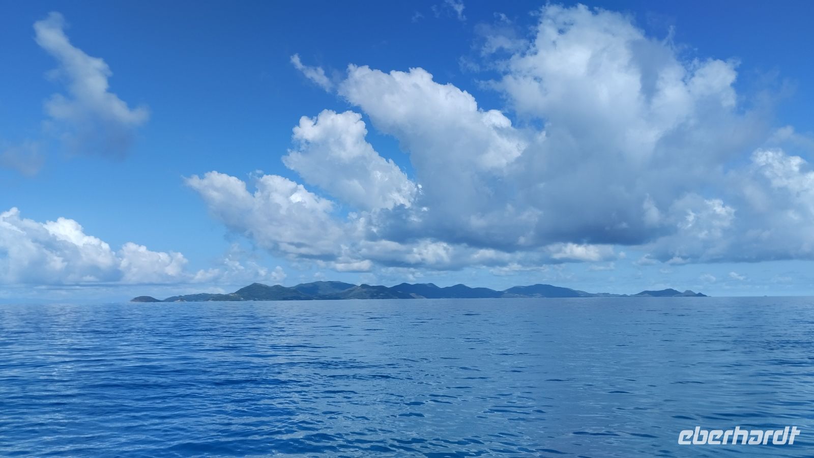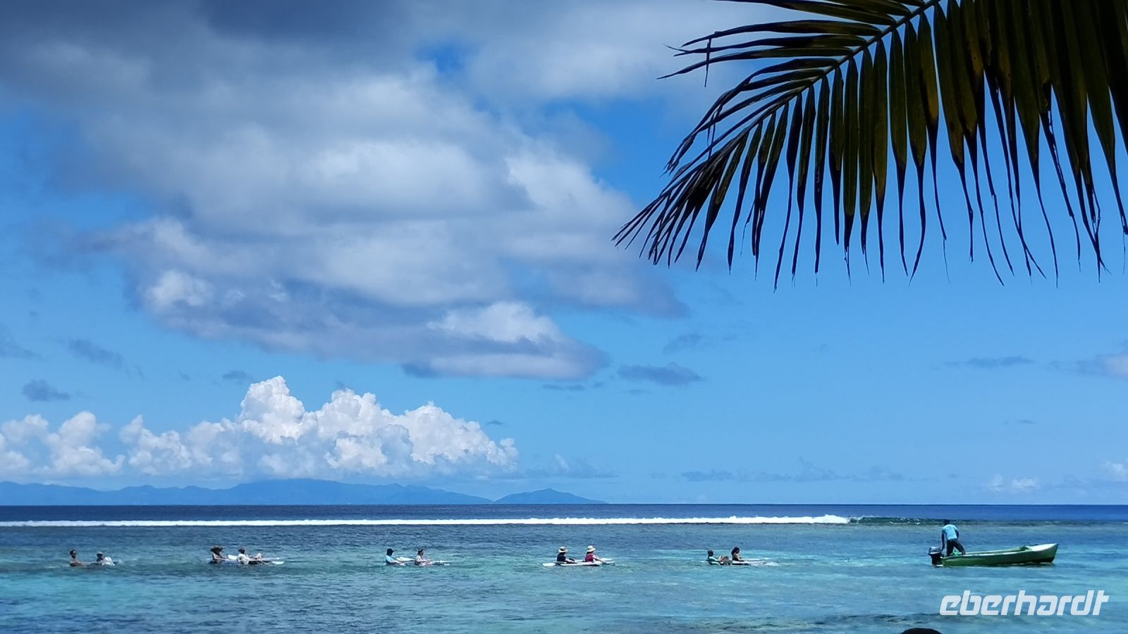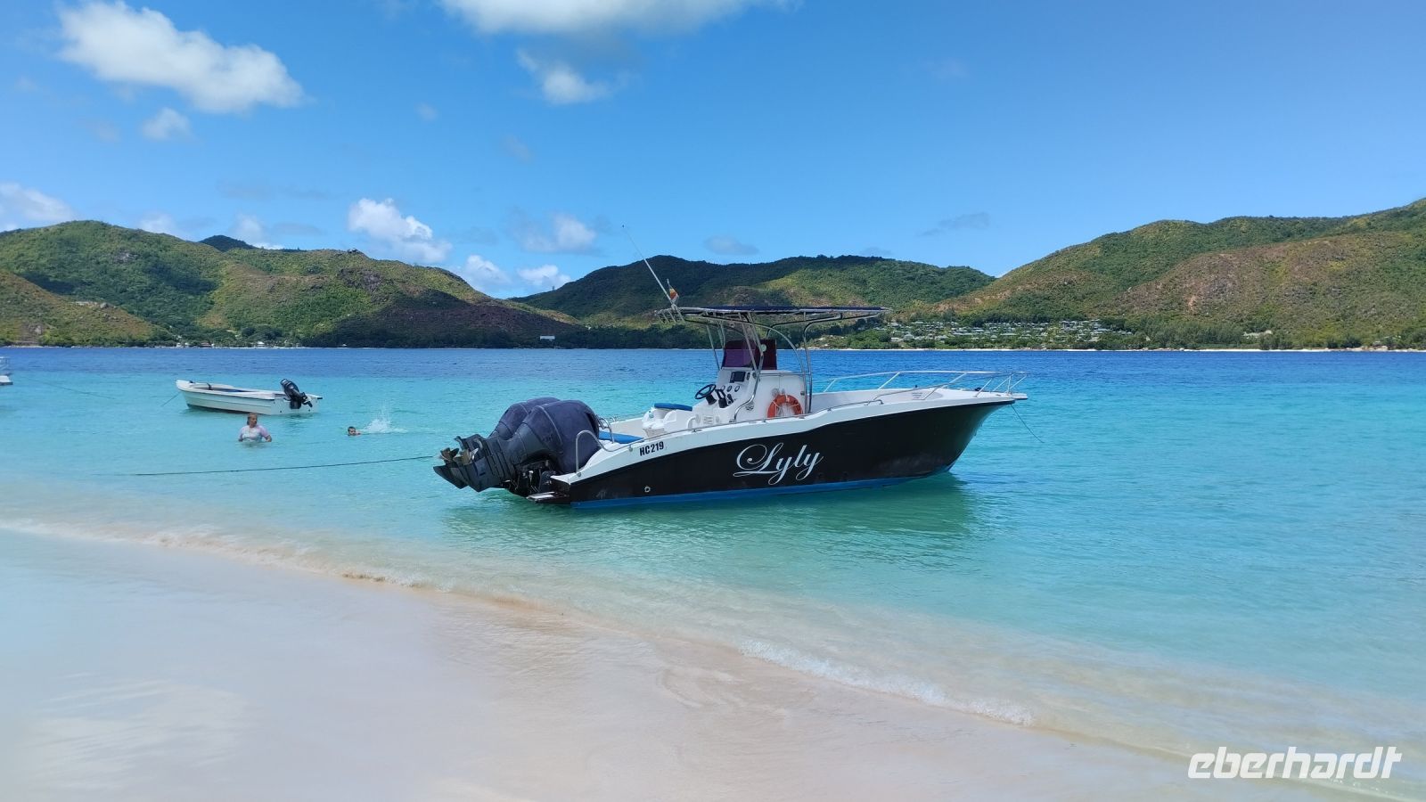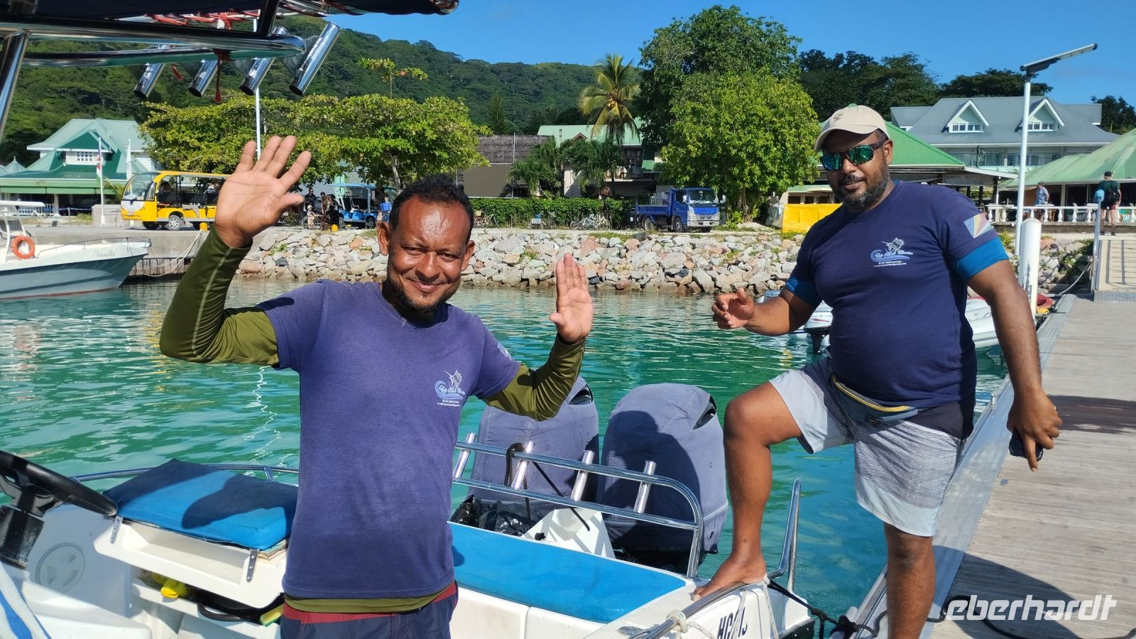 An diesem Morgen fahren wir mit dem kleinen Boot "Lyly" zur Insel Grand Soeur / Große Schwester mit den Crew-Mitgliedern Jude und Cyril. Wegen dem scharfen Korallenriff müssen wir mit einem kleinen Boot abgeholt und zum Strand gebracht werden. Danach gehen die meisten schnorcheln oder baden. Plötzlich taucht ein kleiner Haifisch in der Nähe des Strandes auf.