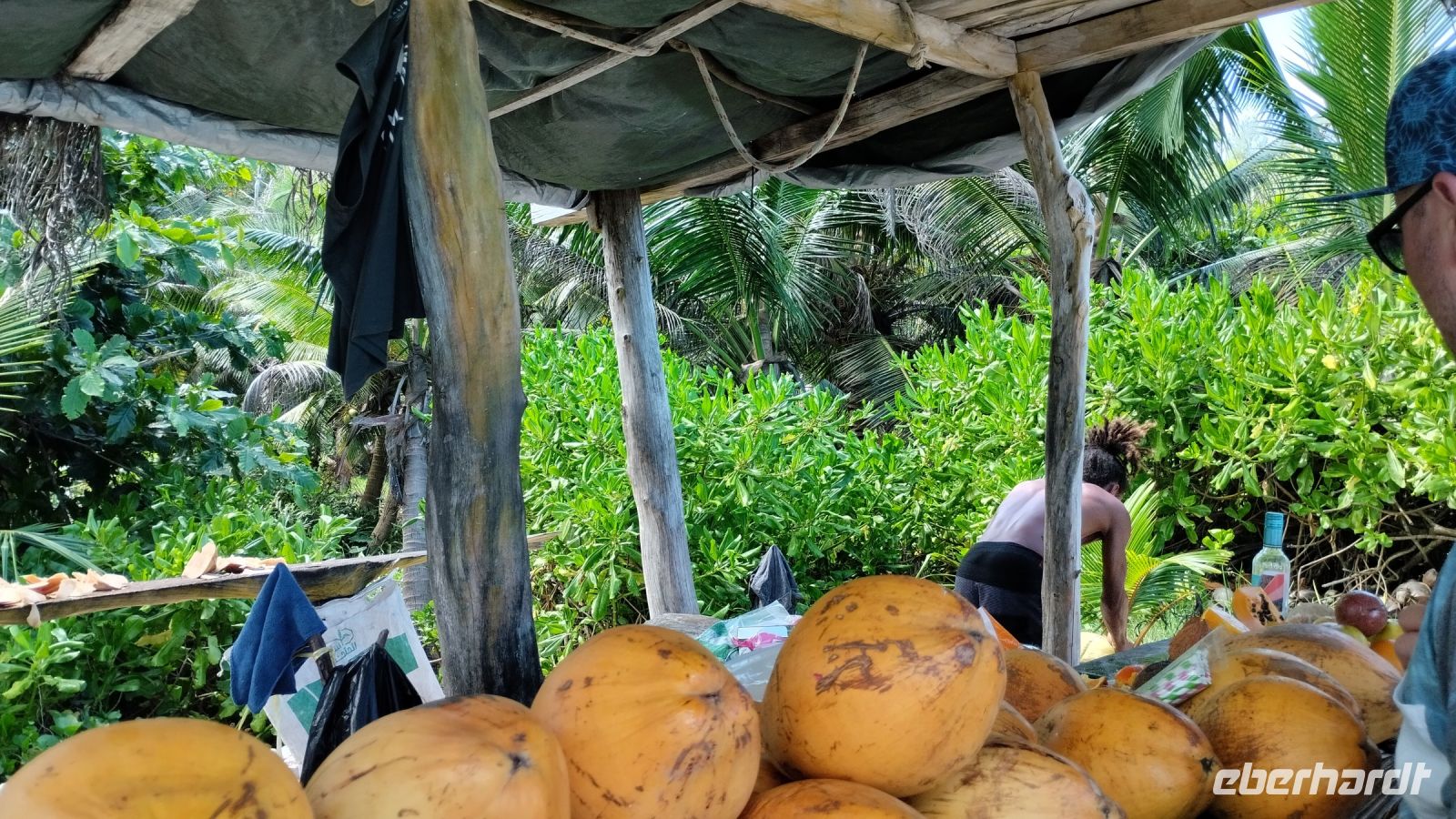 Um die Mittagszeit genießen wir das leckere kreolische Grill-Mittagessen mit Reis, Fisch, Hähnchen, Linsen, Mangosalat und Obst direkt am Strand. Anschließend laufen wir gemeinsam auf die andere Seite der Insel zum anderen malerischen Strand, wo man gut schwimmen kann. Unterwegs begegnen wir einigen Schildkröten.