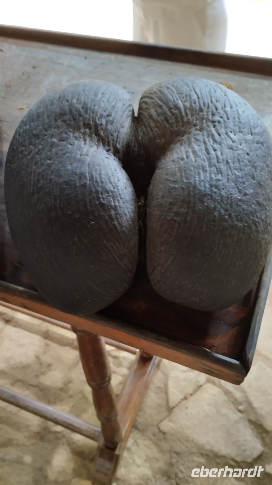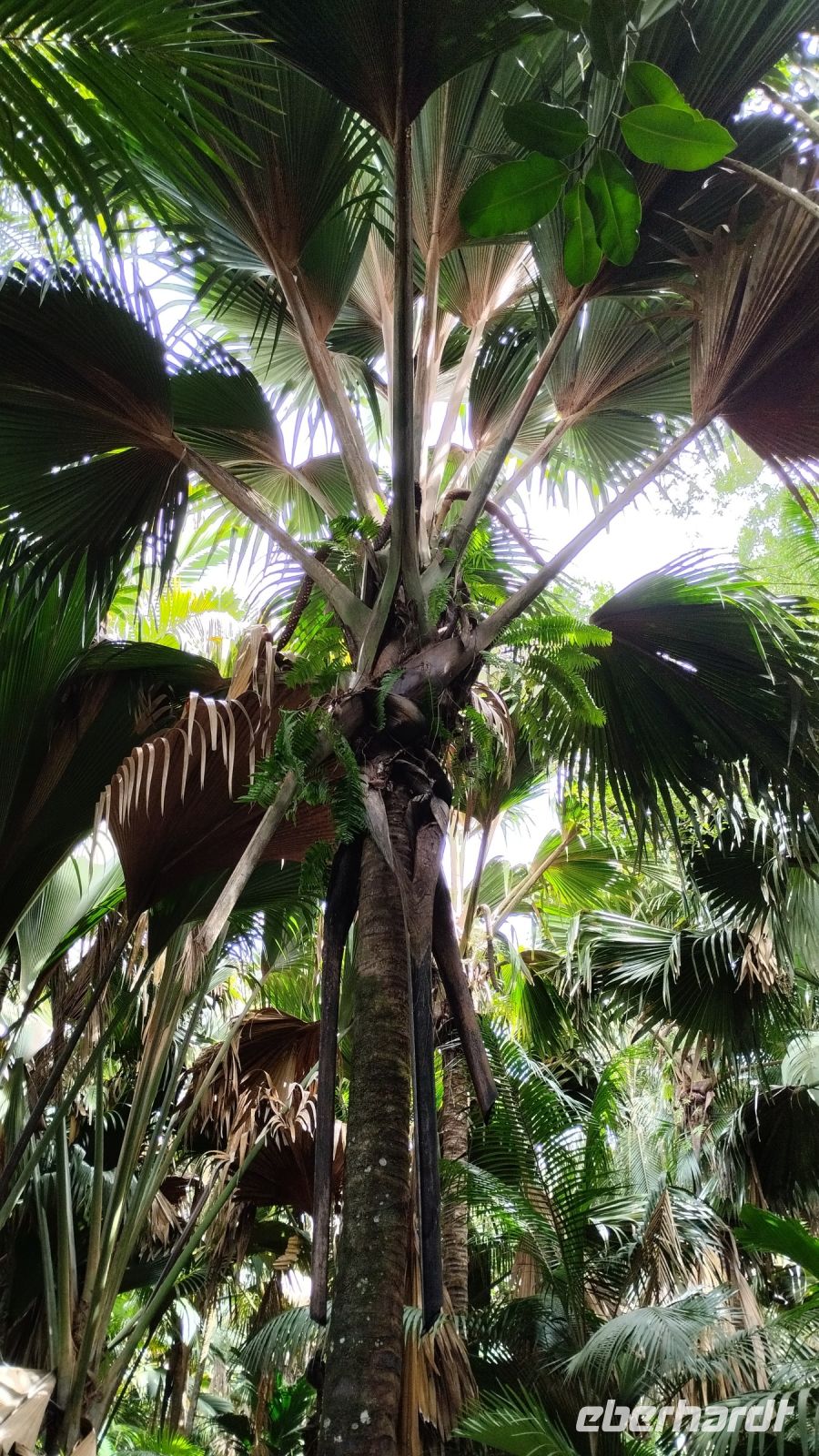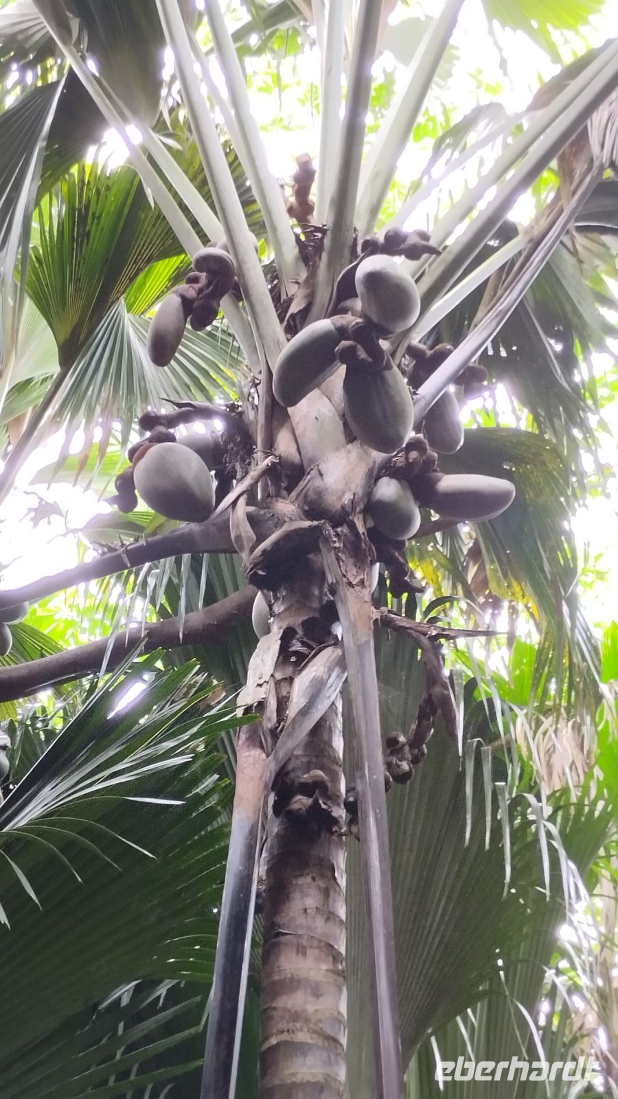 Heute nehmen wir die Fähre zur zweitgrößten Insel Praslin. Nach einer kurzen Überfahrt fahren wir zum Nationalpark Vallee de Mai, wo die endemischen Seychellenpalmen Coco de Mer wachsen. Seit 1983 steht dieses besondere Naturrefugium auf der Liste des UNESCO-Weltnaturerbes. Wir laufen durch diesen verwunschenen Tropenwald mit den riesigen Coco-de-Mer-Palmen und sind von der Größe der Blätter und der Samen dieser Palme überwältigt. So ein Samen kann bis zu 20 kg wiegen. Unterwegs sehen wir auch ein paar grüne Geckos, zwei Schnecken, hören die Geräusche des schwarzen Papageis und lauschen dem kleinen Bach am Wegesrand. Wie aus einer anderen Welt kommen mir diese Palmen vor.
