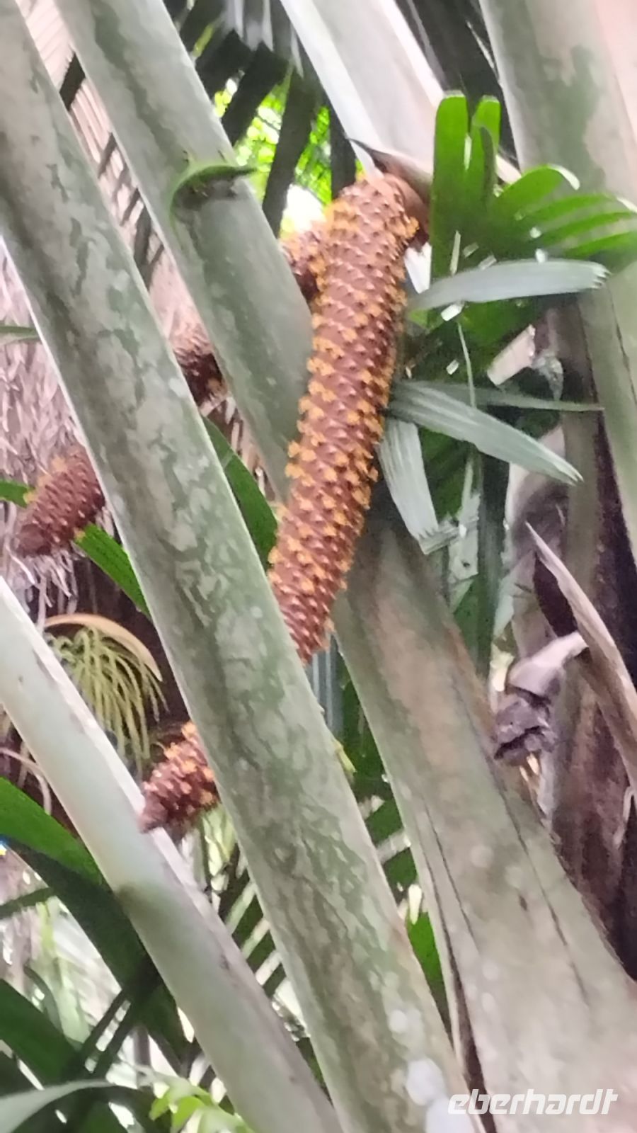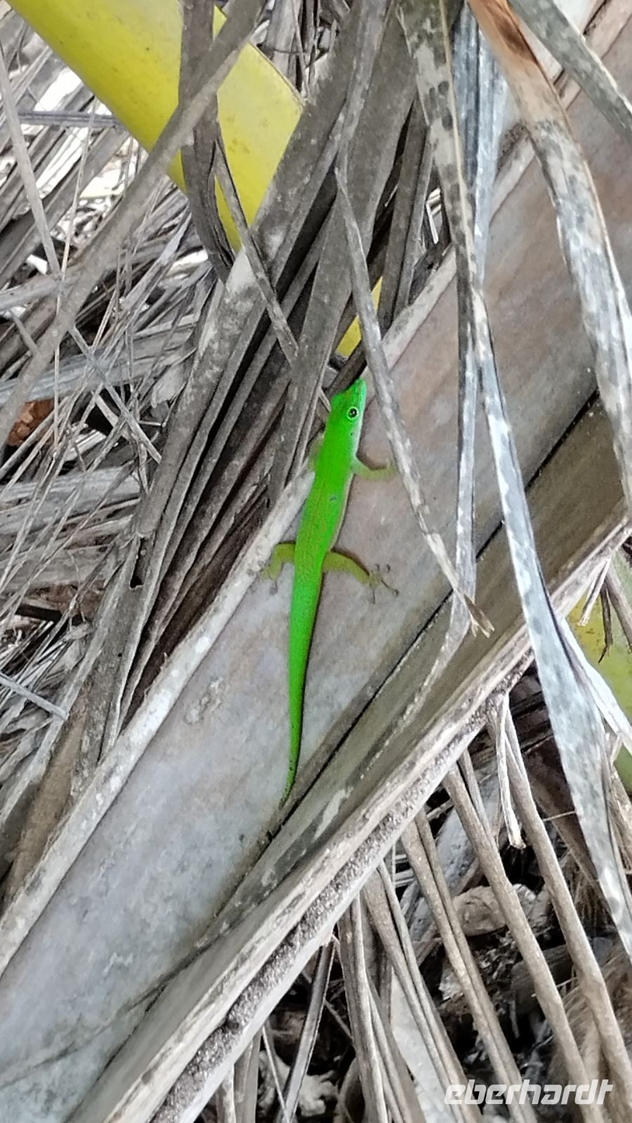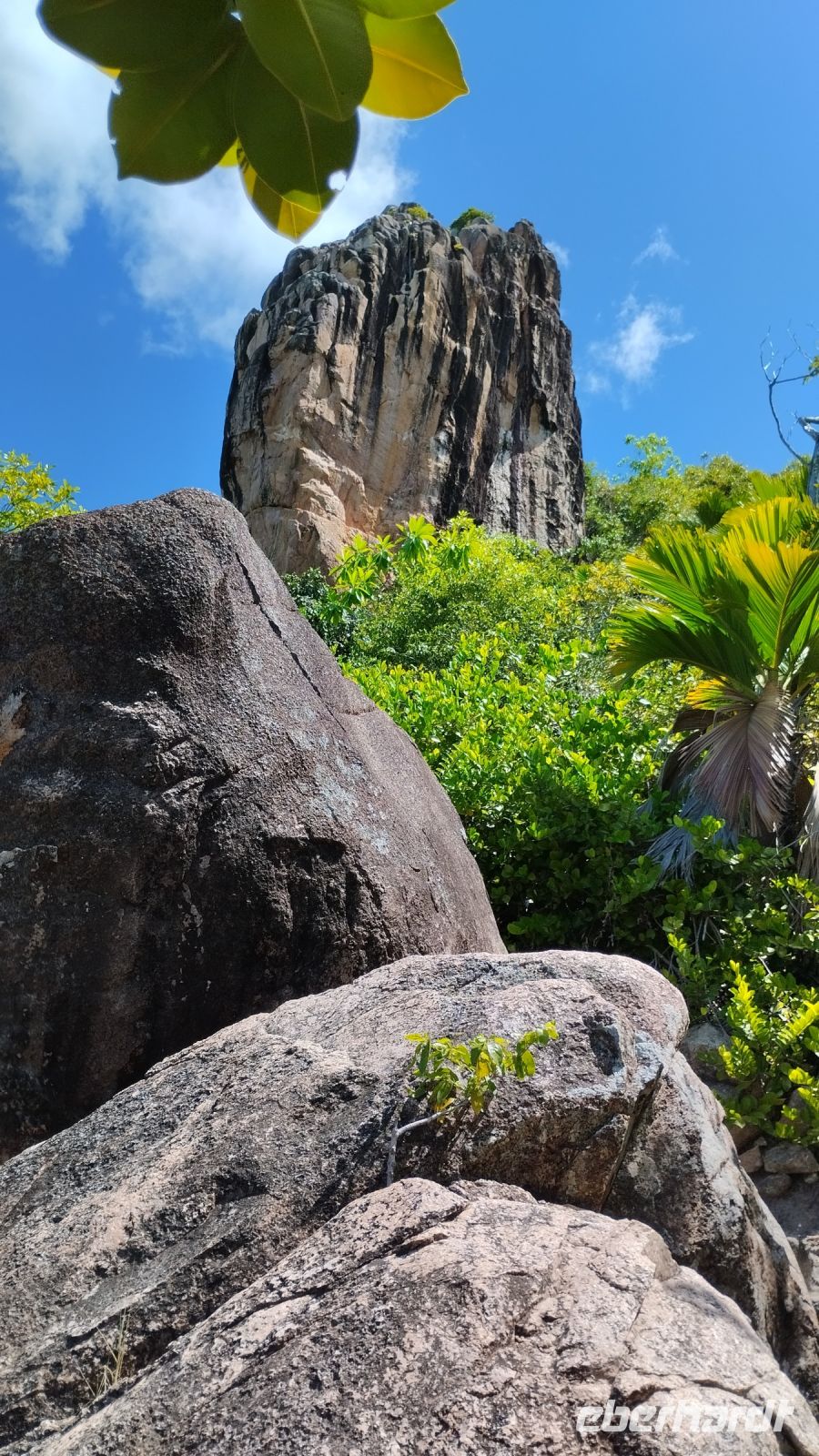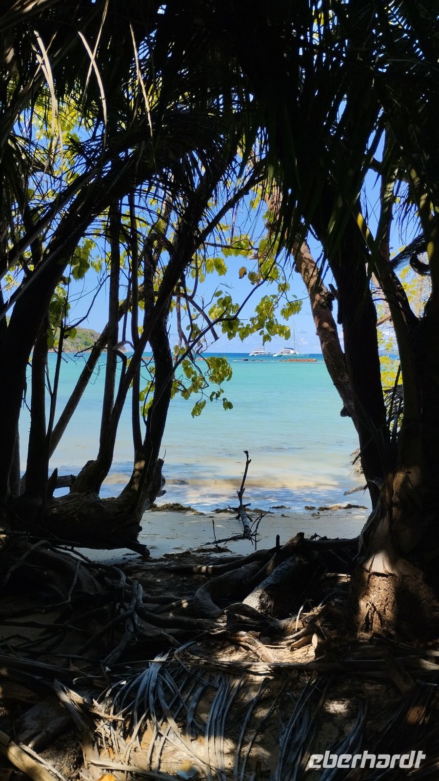 Heute nehmen wir die Fähre zur zweitgrößten Insel Praslin. Nach einer kurzen Überfahrt fahren wir zum Nationalpark Vallee de Mai, wo die endemischen Seychellenpalmen Coco de Mer wachsen. Seit 1983 steht dieses besondere Naturrefugium auf der Liste des UNESCO-Weltnaturerbes. Wir laufen durch diesen verwunschenen Tropenwald mit den riesigen Coco-de-Mer-Palmen und sind von der Größe der Blätter und der Samen dieser Palme überwältigt. So ein Samen kann bis zu 20 kg wiegen. Unterwegs sehen wir auch ein paar grüne Geckos, zwei Schnecken, hören die Geräusche des schwarzen Papageis und lauschen dem kleinen Bach am Wegesrand. Wie aus einer anderen Welt kommen mir diese Palmen vor.