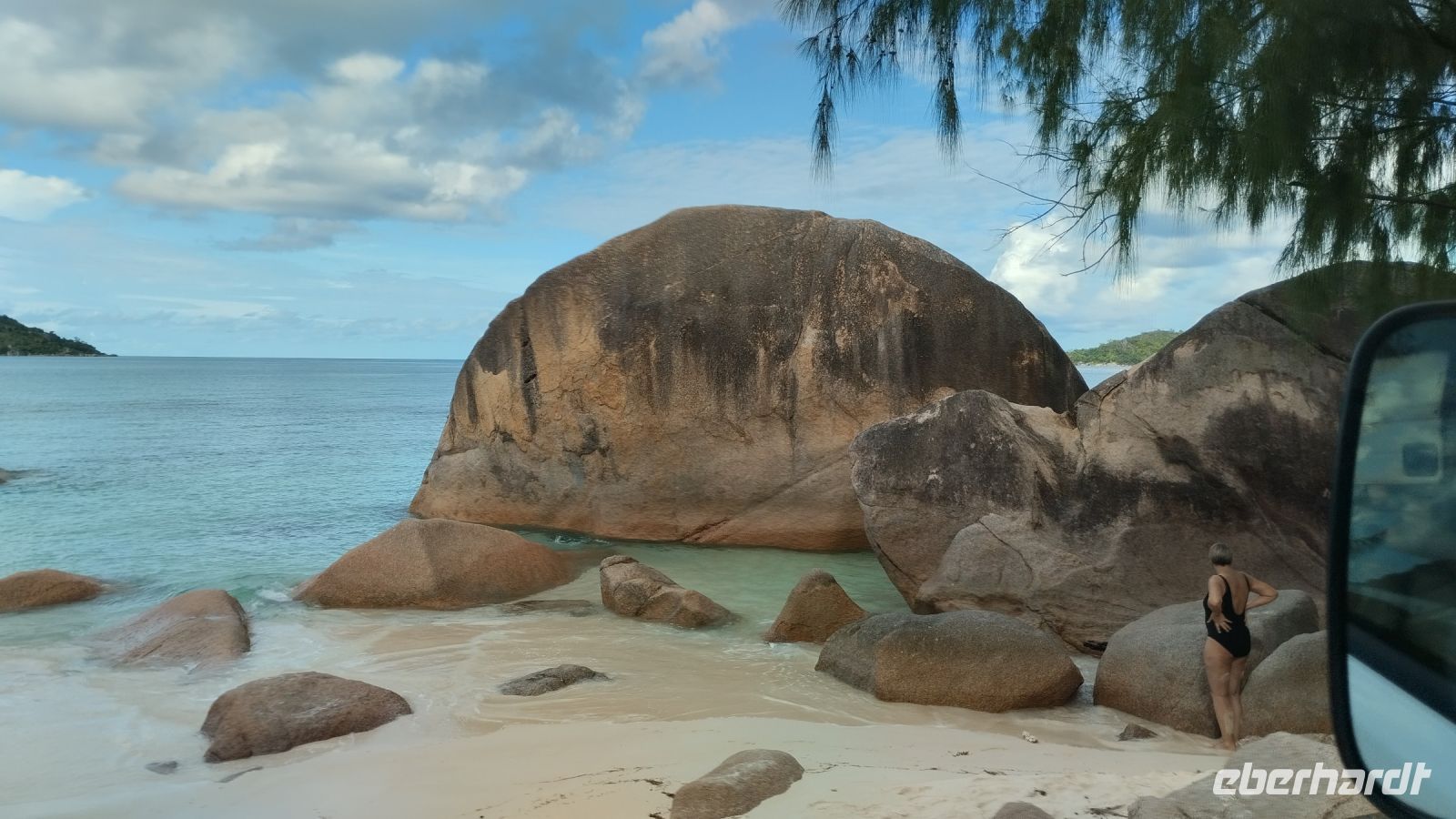 Gut ausgeschlafen, starten wir unsere Erkundung der Insel La Digue. Zuerst fahren wir zum Nationalpark, wo Cyril uns die Kokosnüsse zeigt und erklärt, was die Menschen damit alles machen können. Wir laufen von Schatten zu Schatten. Es ist sehr warm und wir freuen uns bereits auf den weltbekannten Strand. Doch davor machen wir noch ein paar Fotos von den Vanilleschoten und den Schildkröten. Endlich angekommen, springen wir ins Wasser und sind beeindruckt von den malerischen Granitfelsen am idyllischen Strand Anse Source D'Argent. Nicht umsonst kommen viele Hochzeitspaare hierher, um das Fotos ihres Lebens zu ergattern. Manche machen Drohnenaufnahmen von oben.
