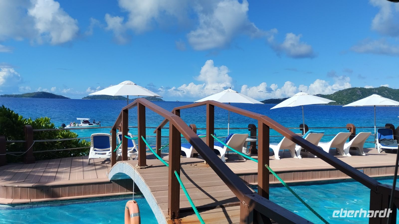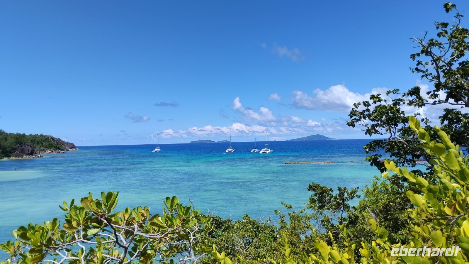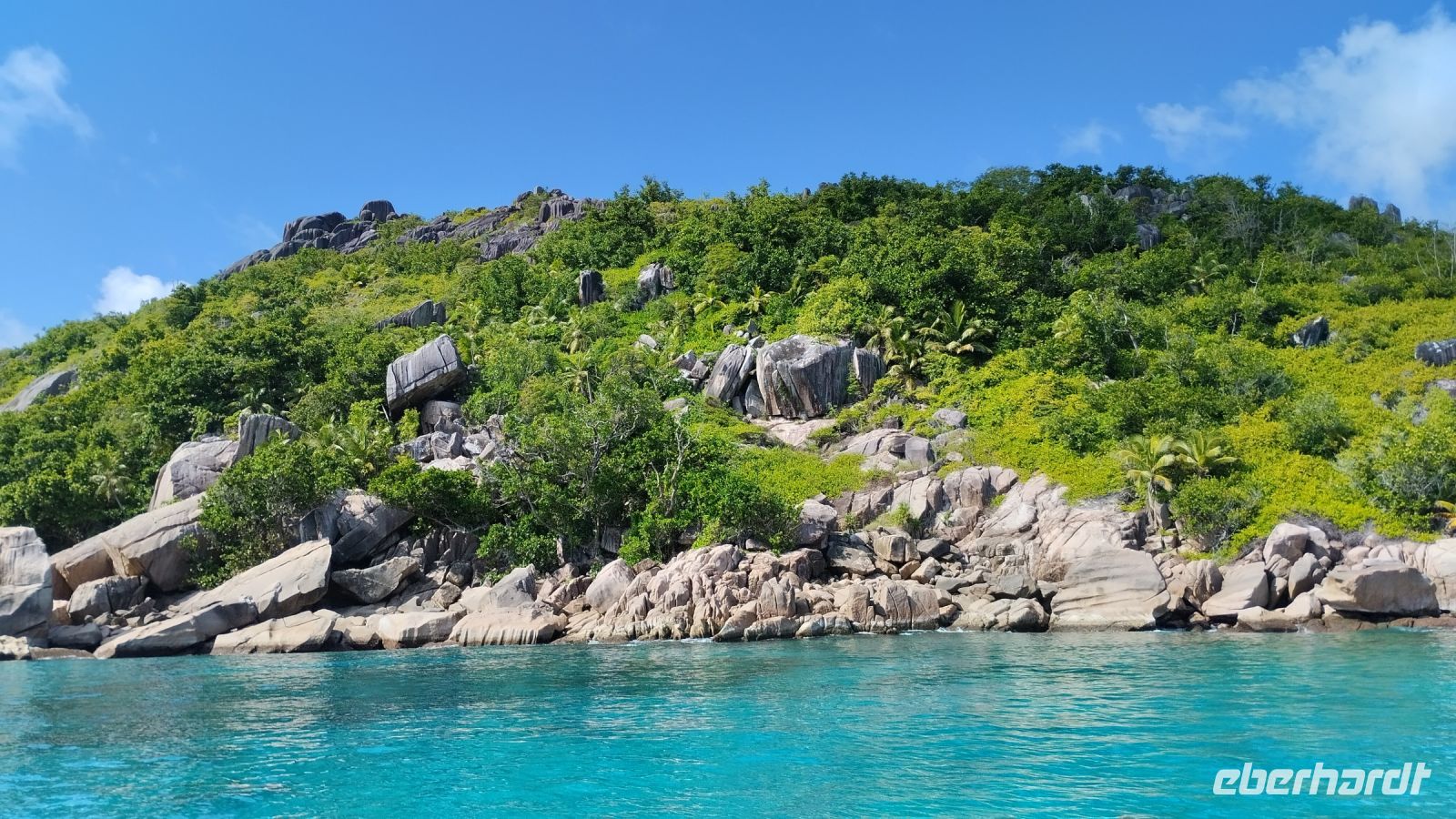 Danach ist Zeit, um sich zu stärken. Nach dem Mittagessen fahren wir an der Küste entlang zum Strand Anse Lazio, wo man schwimmen und schnorcheln kann. Manche erblicken hier viele bunte Fische. Am Nachmittag nehmen wir die Fähre zurück nach La Digue. Bevor wir jedoch zum Hotel zurückkehren, fahren wir noch hoch zum Aussichtspunkt Adlernest. Später treffen wir uns alle beim gemeinsamen Abendessen wieder.