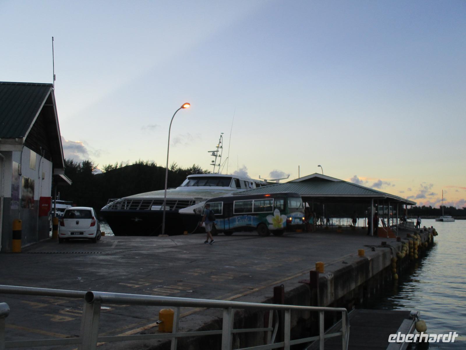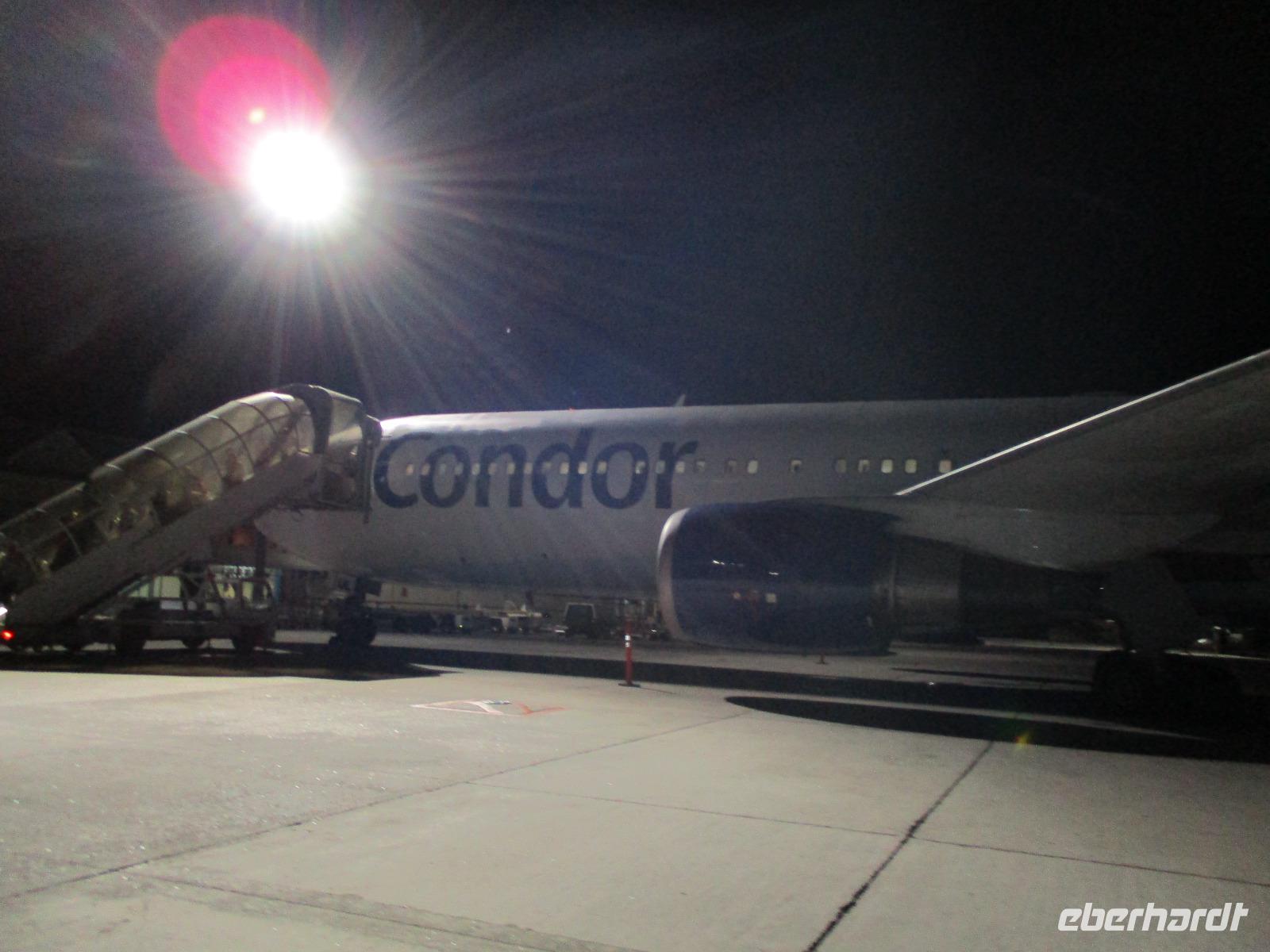 Am späten Nachmittag wurden wir mit unserem Gepäck hinüber zum Praslin Jetty gebracht. Dort nutzten wir wieder die Fähre hinüber nach Mahé. Ein bisschen Seegang sorgte für Bewegung, aber alle überstanden die etwa einstündige Überfahrt ohne Probleme. Inzwischen war es dunkel geworden, als wir auf Mahé anlegten, erwartete uns schon Cyrill. Die Freude über das Wiedersehen war auf beiden Seiten groß. Wir stiegen in einen bereitstehenden Bus, das Gepäck wurde auch gleich noch hinein geladen, und so fuhren wir zum Flughafen der Insel. Nach etwas Wartezeit erfolgte dann das Check in für den Condor-Flug nach Frankfurt. Pünktlich konnten wir auch einsteigen. Dann hieß es im Flugzeug warten. Es gab eine Verzögerung, weil wegen der Notwendigkeit, den Streckenverlauf kurzfristig zu ändern, noch Kerosin nachgetankt werden musste. Also flogen wir schließlich mit etwas Verspätung ab, die für eine verspätete Landung in Frankfurt sorgte.
