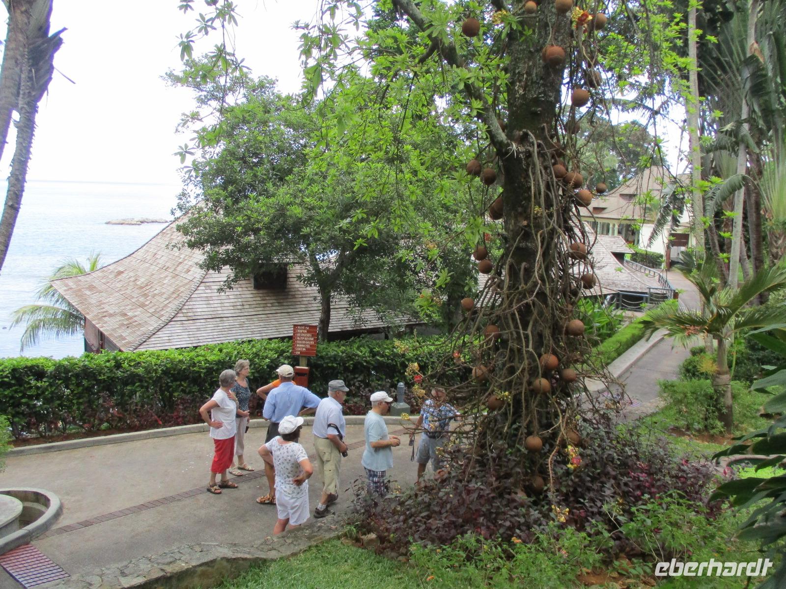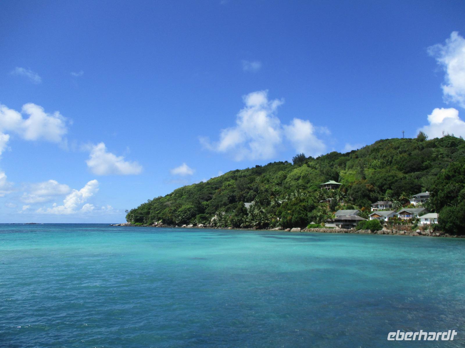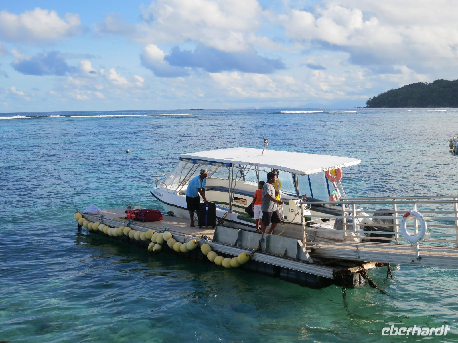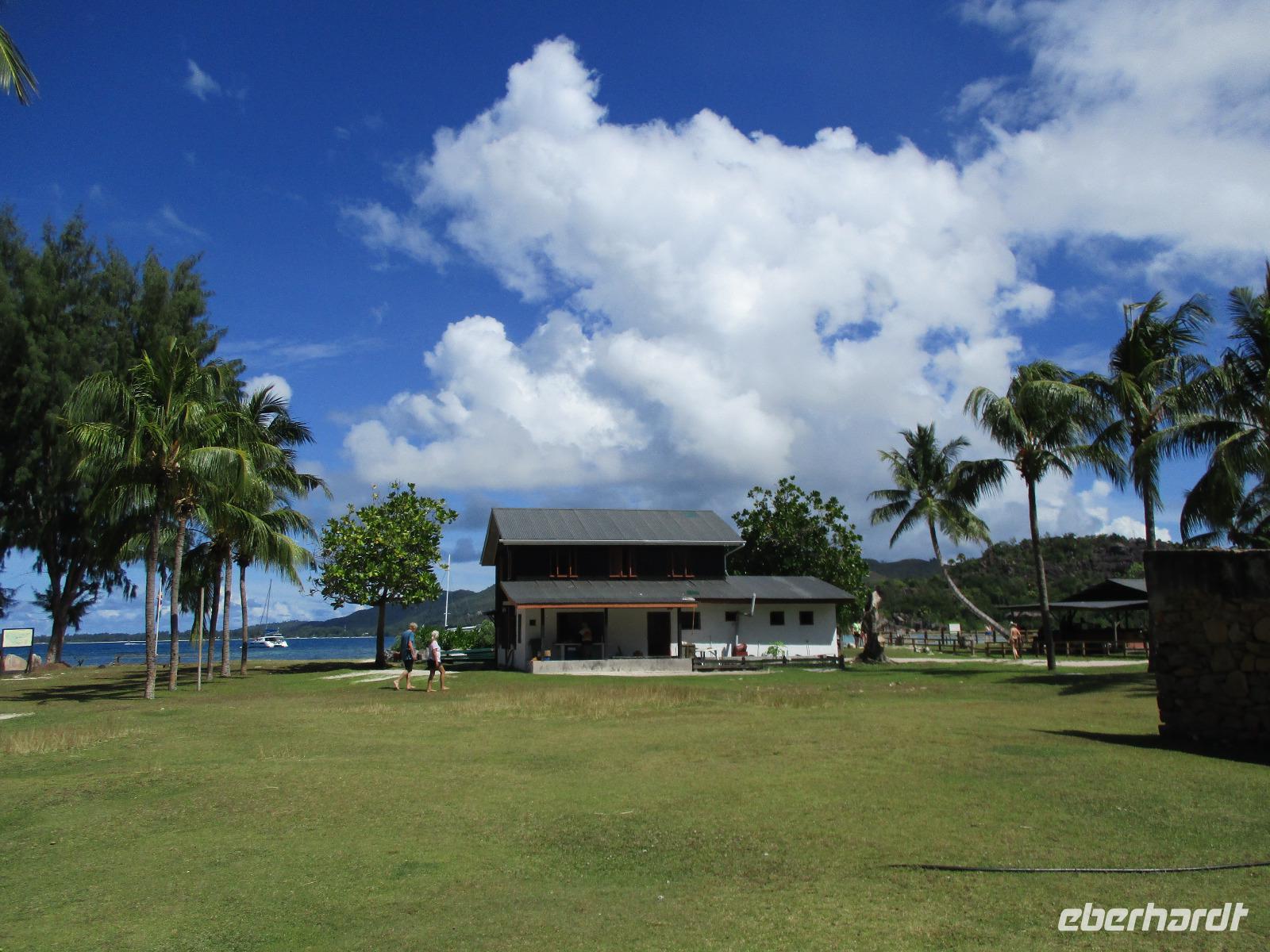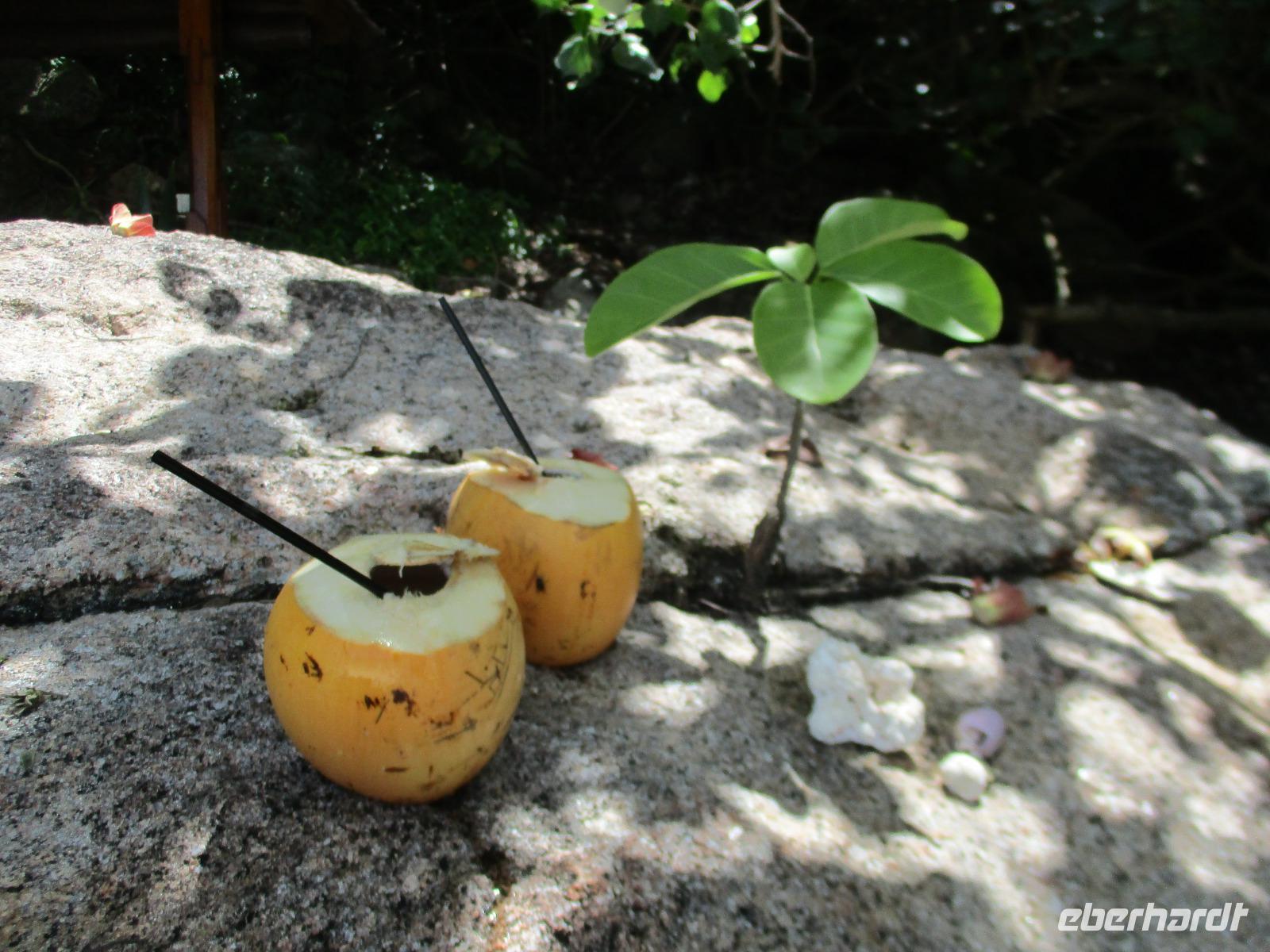 Gemeinsam mit Cyrill checkten wir aus unserem Hotel aus und stiegen pünktlich um 9:00 Uhr in unseren Bus. Heute erkundeten wir die Hauptinsel der Seychellen bei einer Rundfahrt. Cyrill erklärte uns viel über die Tier- und Pflanzenwelt und das Leben der Menschen hier auf Mahé. Hin und wieder stiegen wir aus, spazierten unter seiner Anleitung umher und erfuhren viel Interessantes von ihm. Schöne Fotos sind an diesem Tag sicher auch entstanden. Wir erreichten schließlich die Mission Lodge, ein hinter Teeplantagen versteckter Ort. Dorthin hatten sich einst Sklaven geflüchtet und eine kleine Siedlung gegründet, um den menschen-unwürdigen Bedingungen der Sklaverei auf den Plantagen zu entgehen. Die Ruinen der kleinen Hütten, die sie damals bauten, künden heute noch von dieser Zeit. Von einer Anhöhe aus hatten wir einen beeindruckenden Ausblick hinunter auf eine Bucht. Ein kräftiger Regenguss brachte uns Wasser von oben. Auf dem Rückweg zum Bus fotografierten wir noch die Jack-Frucht, oder auch Stinkfrucht genannt. Cyrill erzählte uns viel über die hier wachsenden Pflanzen, sogar die Zutaten für einen Sud zum Inhalieren aus der traditionellen Medizin der Seychellios konnte er uns nennen, natürlich alles Pflanzen, die man hier findet, unter anderem Zitronengras und die Sansibwurzel. Das Mittagessen ließen wir uns im traditionellen creolischen Restaurant „Marie Antoinette" schmecken. Viele Gäste kommen hier her, nicht nur wegen des leckeren Essens, sondern auch wegen der zahlreichen großen Landschildkröten, die es hinter uns in einem Gehege gab. Sie sollen Glück bringen, und so zieht es sicher auch viele Gäste aus diesem Grund hier her. Nach dem Essen hieß es erst einmal wieder Abschied nehmen von Cyrill und der Insel Mahé. Denn am Nachmittag sollten wir die Fähre nach Praslin besteigen, auf der zweitgrößten Insel der Seychellen würden wir die meiste Zeit unseres Aufenthaltes hier verbringen. Am Fähranleger, die hier immer Jetty heißen, verabschiedeten wir uns für diesen Tag von Cyrill, wir sollten ihn wieder sehen. Unser Gepäck wurde verladen. Nach einstündiger Überfahrt erreichten wir alle wohlbehalten den Anleger auf Praslin. Erwartet wurden wir schon von den Skippern des New Emerald Cove Hotels. Weil dieses Hotel nur auf dem Wasserweg zu erreichen ist, gingen wir zu einem kleinen Boot, unser Gepäck wurde auf ein anderes verladen und los ging es per Motorboot über die Bucht. Am anderen Ende legten wir an und betraten unser zu Hause für die nächsten zwei Wochen. Wir waren zwar erschöpft vom Tag und der Anreise, aber die Aussicht auf unsere Zeit hier zwischen Palmen, Strand und gemütlichen Bungalows gefiel uns gewaltig. Es sollte vor einiger Zeit hier mal eine Straße hin gebaut werden, irgendwie konnte das Projekt nicht vollendet werden, weil private Landbesitzer nichts davon für die Straße verkaufen wollten. Für uns stellte sich das als riesiger Glücksfall dar, denn so konnten wir unsere Zeit hier in Abgeschiedenheit und Ruhe genießen. Nur wenige Gäste fasst das Hotel überhaupt, manchmal waren wir die einzigen, die den langen weißen Sandstrand benutzten. Also ein herrlicher Ort für ein paar erholsame Tage im Paradies. Wir wurden mit einem Cocktail begrüßt und später in unsere Bungalows geführt. Wir erfuhren einiges zu den Möglichkeiten im Hotel, so werden beispielsweise kostenfreie Schnorchel- und Wanderausflüge angeboten. Nach dem gemeinsamen Abendessen schliefen wir unsere erste Nacht im New Emerald Cove Hotel und freuten uns auf die kommenden Tage hier.
