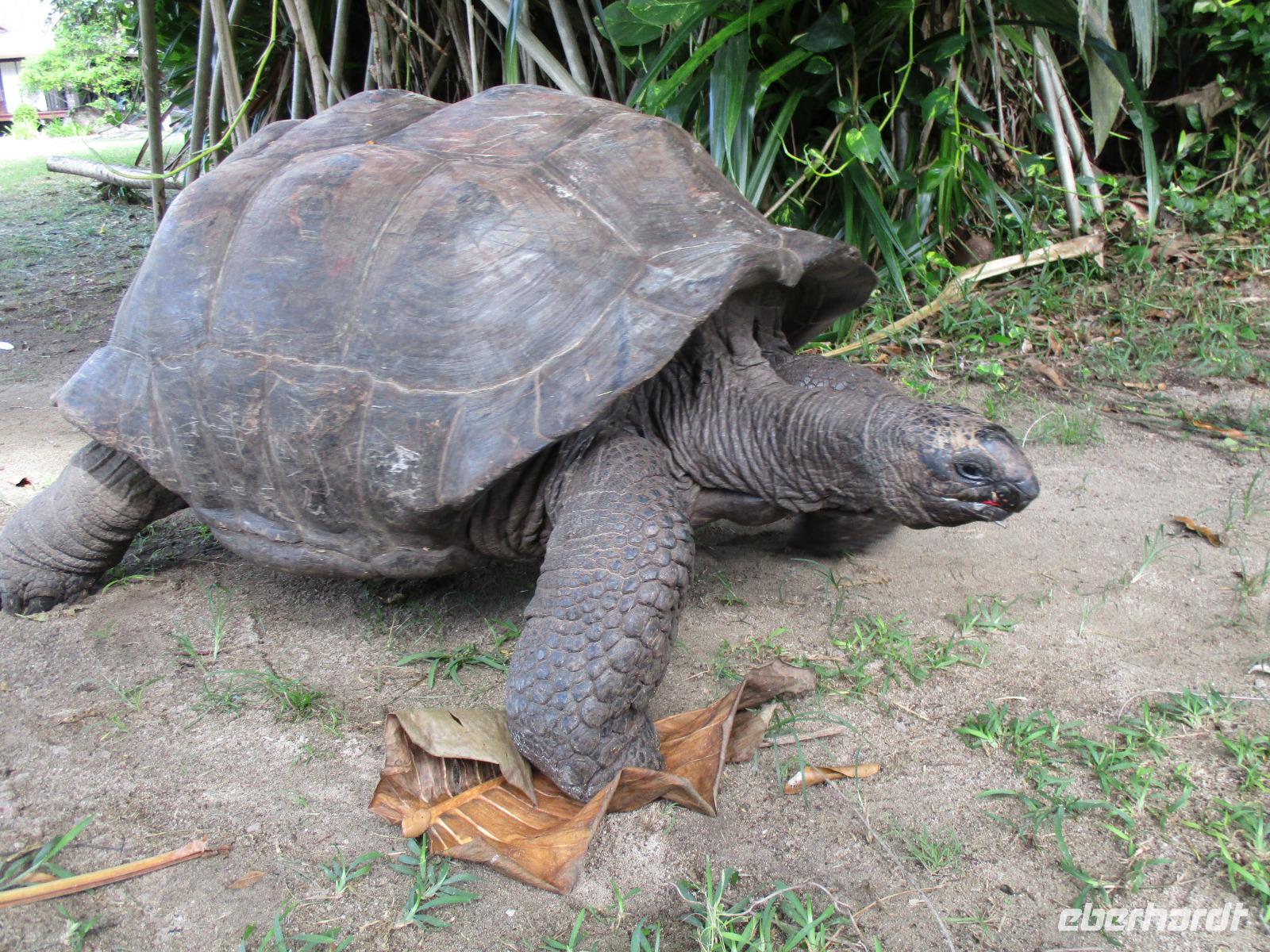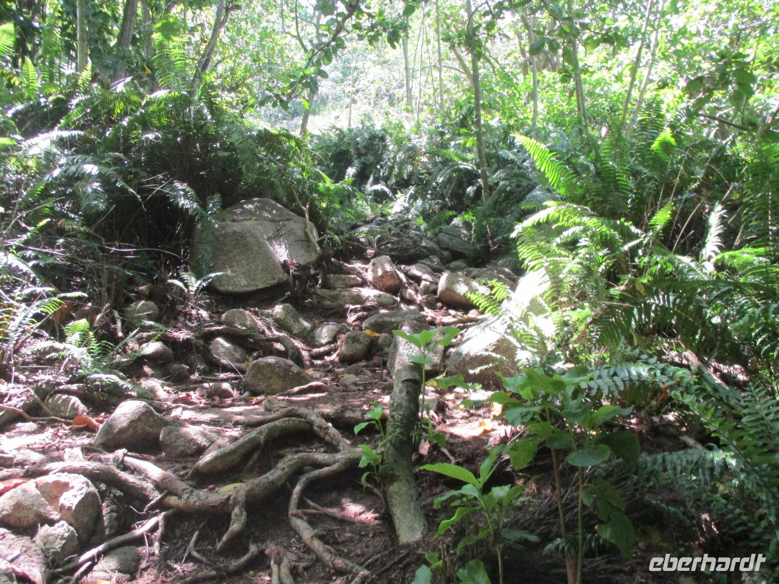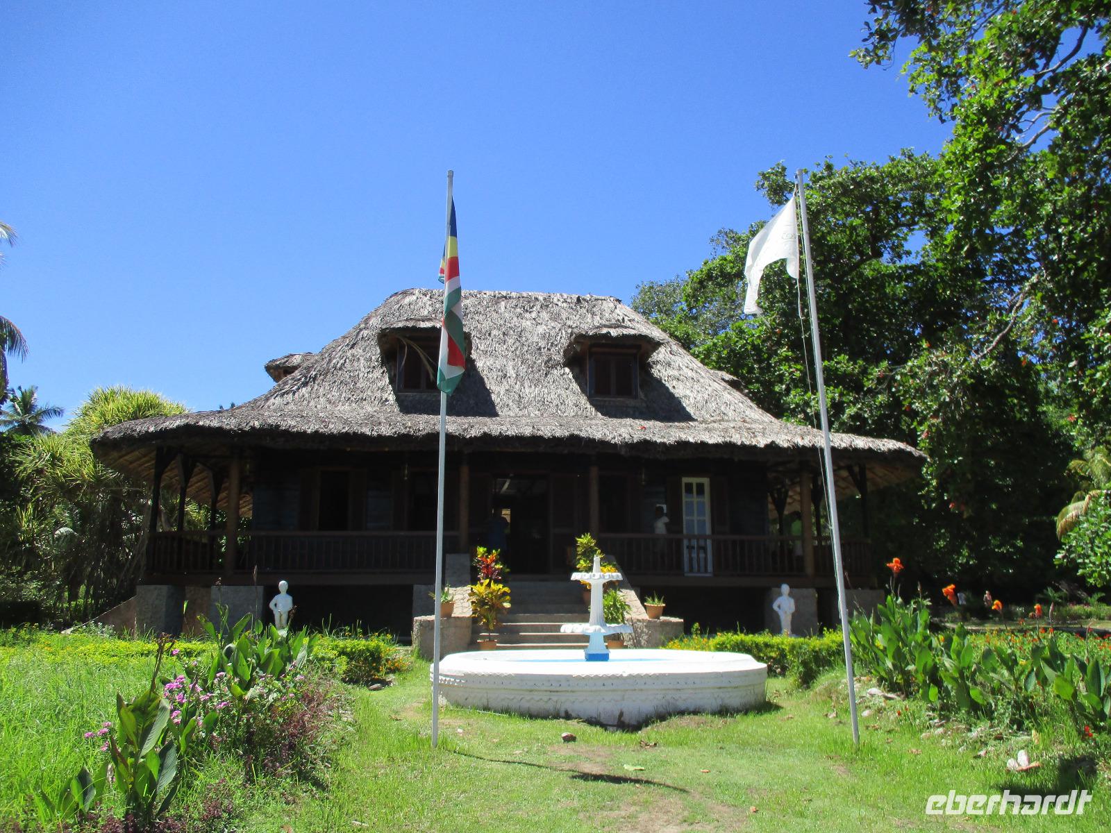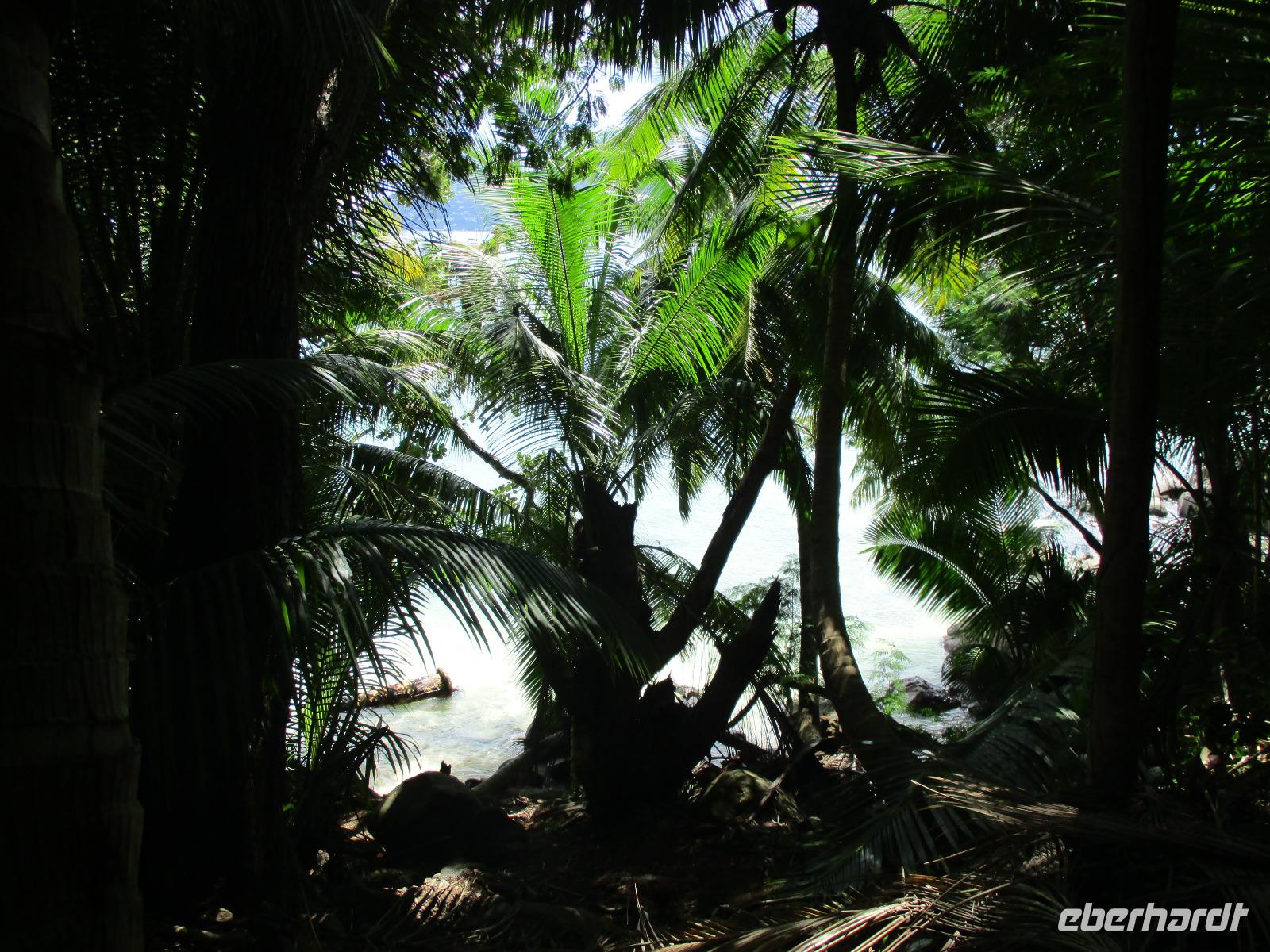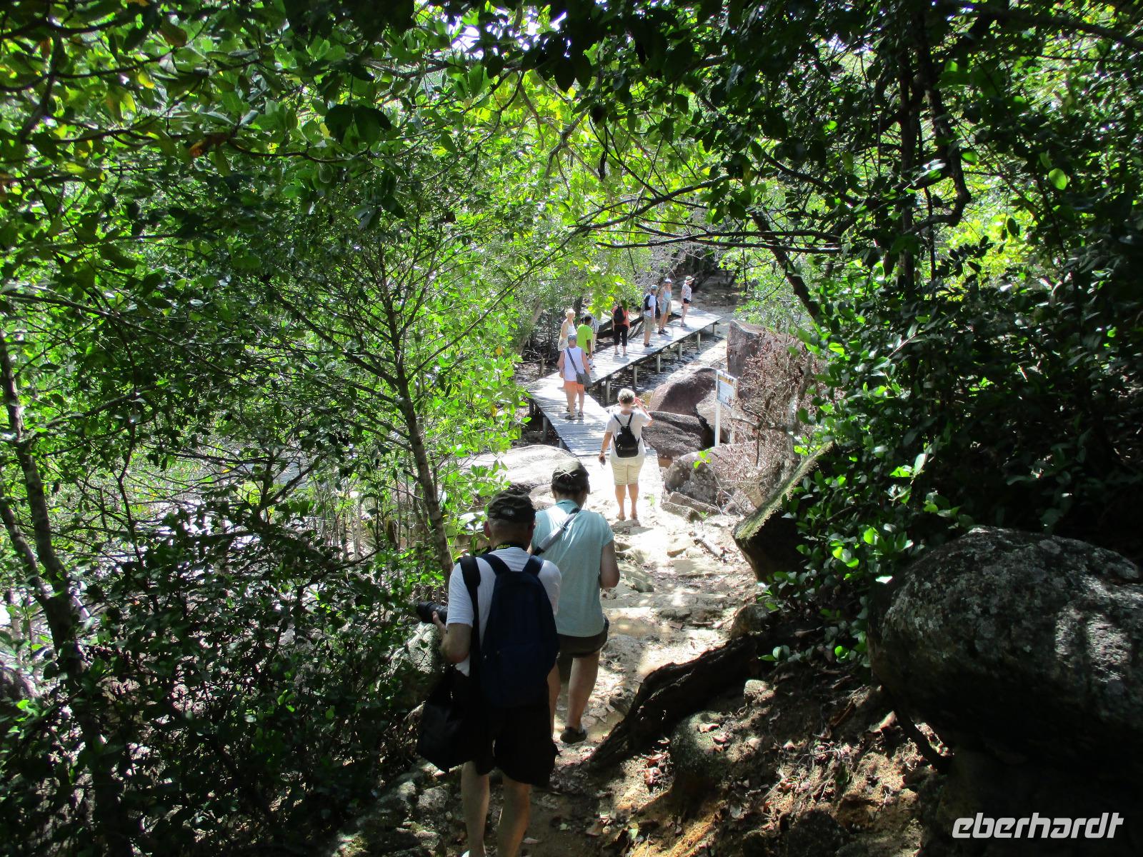 Gemeinsam mit Cyrill checkten wir aus unserem Hotel aus und stiegen pünktlich um 9:00 Uhr in unseren Bus. Heute erkundeten wir die Hauptinsel der Seychellen bei einer Rundfahrt. Cyrill erklärte uns viel über die Tier- und Pflanzenwelt und das Leben der Menschen hier auf Mahé. Hin und wieder stiegen wir aus, spazierten unter seiner Anleitung umher und erfuhren viel Interessantes von ihm. Schöne Fotos sind an diesem Tag sicher auch entstanden. Wir erreichten schließlich die Mission Lodge, ein hinter Teeplantagen versteckter Ort. Dorthin hatten sich einst Sklaven geflüchtet und eine kleine Siedlung gegründet, um den menschen-unwürdigen Bedingungen der Sklaverei auf den Plantagen zu entgehen. Die Ruinen der kleinen Hütten, die sie damals bauten, künden heute noch von dieser Zeit. Von einer Anhöhe aus hatten wir einen beeindruckenden Ausblick hinunter auf eine Bucht. Ein kräftiger Regenguss brachte uns Wasser von oben. Auf dem Rückweg zum Bus fotografierten wir noch die Jack-Frucht, oder auch Stinkfrucht genannt. Cyrill erzählte uns viel über die hier wachsenden Pflanzen, sogar die Zutaten für einen Sud zum Inhalieren aus der traditionellen Medizin der Seychellios konnte er uns nennen, natürlich alles Pflanzen, die man hier findet, unter anderem Zitronengras und die Sansibwurzel. Das Mittagessen ließen wir uns im traditionellen creolischen Restaurant „Marie Antoinette" schmecken. Viele Gäste kommen hier her, nicht nur wegen des leckeren Essens, sondern auch wegen der zahlreichen großen Landschildkröten, die es hinter uns in einem Gehege gab. Sie sollen Glück bringen, und so zieht es sicher auch viele Gäste aus diesem Grund hier her. Nach dem Essen hieß es erst einmal wieder Abschied nehmen von Cyrill und der Insel Mahé. Denn am Nachmittag sollten wir die Fähre nach Praslin besteigen, auf der zweitgrößten Insel der Seychellen würden wir die meiste Zeit unseres Aufenthaltes hier verbringen. Am Fähranleger, die hier immer Jetty heißen, verabschiedeten wir uns für diesen Tag von Cyrill, wir sollten ihn wieder sehen. Unser Gepäck wurde verladen. Nach einstündiger Überfahrt erreichten wir alle wohlbehalten den Anleger auf Praslin. Erwartet wurden wir schon von den Skippern des New Emerald Cove Hotels. Weil dieses Hotel nur auf dem Wasserweg zu erreichen ist, gingen wir zu einem kleinen Boot, unser Gepäck wurde auf ein anderes verladen und los ging es per Motorboot über die Bucht. Am anderen Ende legten wir an und betraten unser zu Hause für die nächsten zwei Wochen. Wir waren zwar erschöpft vom Tag und der Anreise, aber die Aussicht auf unsere Zeit hier zwischen Palmen, Strand und gemütlichen Bungalows gefiel uns gewaltig. Es sollte vor einiger Zeit hier mal eine Straße hin gebaut werden, irgendwie konnte das Projekt nicht vollendet werden, weil private Landbesitzer nichts davon für die Straße verkaufen wollten. Für uns stellte sich das als riesiger Glücksfall dar, denn so konnten wir unsere Zeit hier in Abgeschiedenheit und Ruhe genießen. Nur wenige Gäste fasst das Hotel überhaupt, manchmal waren wir die einzigen, die den langen weißen Sandstrand benutzten. Also ein herrlicher Ort für ein paar erholsame Tage im Paradies. Wir wurden mit einem Cocktail begrüßt und später in unsere Bungalows geführt. Wir erfuhren einiges zu den Möglichkeiten im Hotel, so werden beispielsweise kostenfreie Schnorchel- und Wanderausflüge angeboten. Nach dem gemeinsamen Abendessen schliefen wir unsere erste Nacht im New Emerald Cove Hotel und freuten uns auf die kommenden Tage hier.