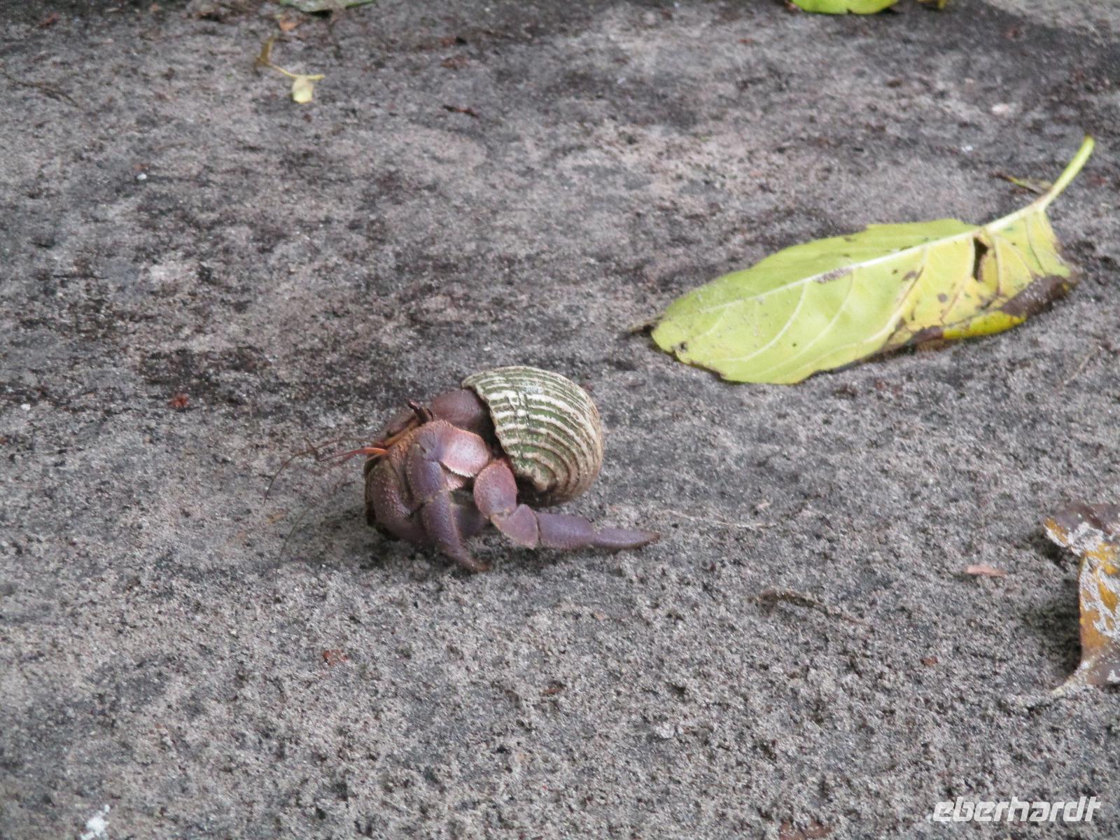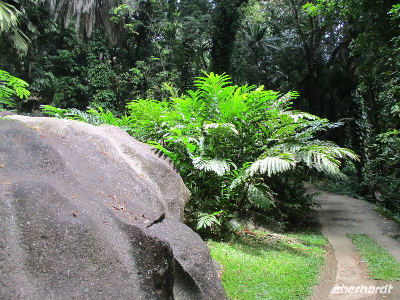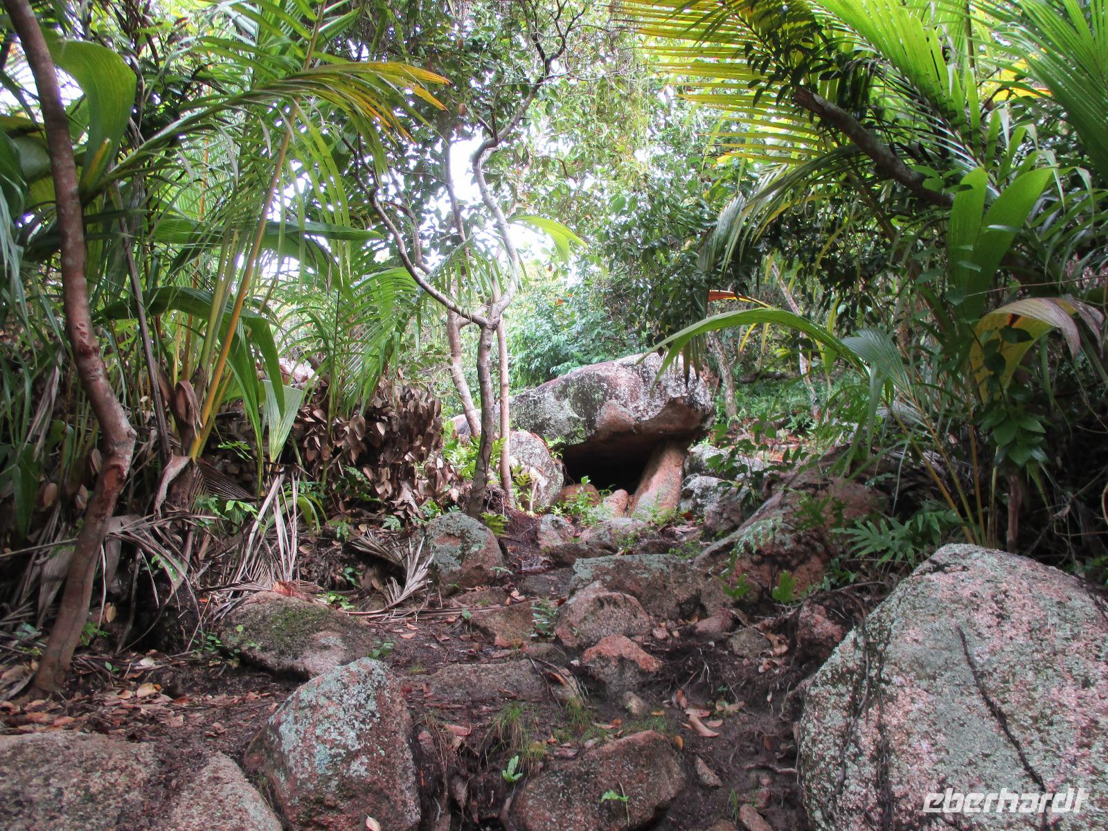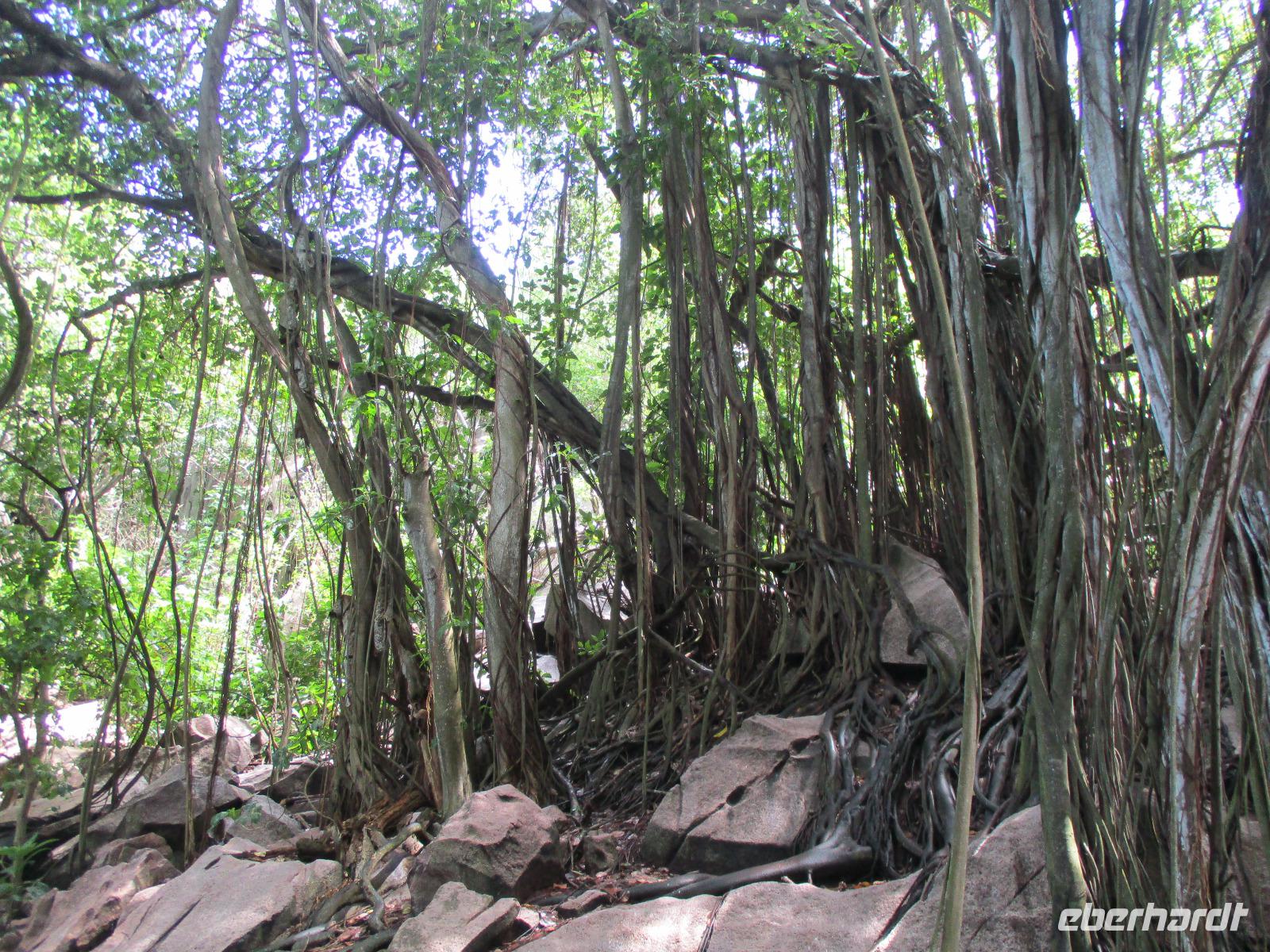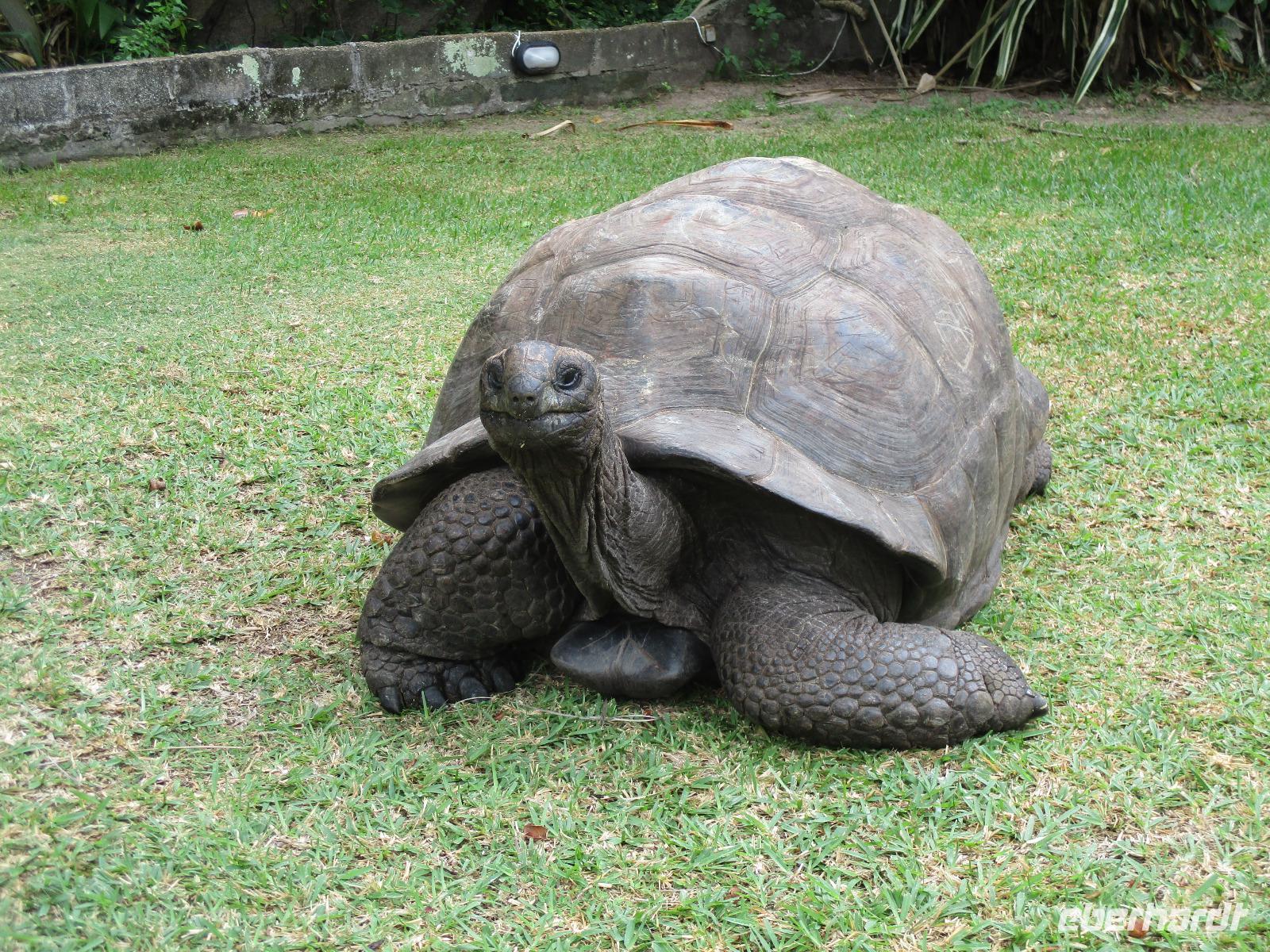Gemeinsam mit Cyrill checkten wir aus unserem Hotel aus und stiegen pünktlich um 9:00 Uhr in unseren Bus. Heute erkundeten wir die Hauptinsel der Seychellen bei einer Rundfahrt. Cyrill erklärte uns viel über die Tier- und Pflanzenwelt und das Leben der Menschen hier auf Mahé. Hin und wieder stiegen wir aus, spazierten unter seiner Anleitung umher und erfuhren viel Interessantes von ihm. Schöne Fotos sind an diesem Tag sicher auch entstanden. Wir erreichten schließlich die Mission Lodge, ein hinter Teeplantagen versteckter Ort. Dorthin hatten sich einst Sklaven geflüchtet und eine kleine Siedlung gegründet, um den menschen-unwürdigen Bedingungen der Sklaverei auf den Plantagen zu entgehen. Die Ruinen der kleinen Hütten, die sie damals bauten, künden heute noch von dieser Zeit. Von einer Anhöhe aus hatten wir einen beeindruckenden Ausblick hinunter auf eine Bucht. Ein kräftiger Regenguss brachte uns Wasser von oben. Auf dem Rückweg zum Bus fotografierten wir noch die Jack-Frucht, oder auch Stinkfrucht genannt. Cyrill erzählte uns viel über die hier wachsenden Pflanzen, sogar die Zutaten für einen Sud zum Inhalieren aus der traditionellen Medizin der Seychellios konnte er uns nennen, natürlich alles Pflanzen, die man hier findet, unter anderem Zitronengras und die Sansibwurzel. Das Mittagessen ließen wir uns im traditionellen creolischen Restaurant „Marie Antoinette" schmecken. Viele Gäste kommen hier her, nicht nur wegen des leckeren Essens, sondern auch wegen der zahlreichen großen Landschildkröten, die es hinter uns in einem Gehege gab. Sie sollen Glück bringen, und so zieht es sicher auch viele Gäste aus diesem Grund hier her. Nach dem Essen hieß es erst einmal wieder Abschied nehmen von Cyrill und der Insel Mahé. Denn am Nachmittag sollten wir die Fähre nach Praslin besteigen, auf der zweitgrößten Insel der Seychellen würden wir die meiste Zeit unseres Aufenthaltes hier verbringen. Am Fähranleger, die hier immer Jetty heißen, verabschiedeten wir uns für diesen Tag von Cyrill, wir sollten ihn wieder sehen. Unser Gepäck wurde verladen. Nach einstündiger Überfahrt erreichten wir alle wohlbehalten den Anleger auf Praslin. Erwartet wurden wir schon von den Skippern des New Emerald Cove Hotels. Weil dieses Hotel nur auf dem Wasserweg zu erreichen ist, gingen wir zu einem kleinen Boot, unser Gepäck wurde auf ein anderes verladen und los ging es per Motorboot über die Bucht. Am anderen Ende legten wir an und betraten unser zu Hause für die nächsten zwei Wochen. Wir waren zwar erschöpft vom Tag und der Anreise, aber die Aussicht auf unsere Zeit hier zwischen Palmen, Strand und gemütlichen Bungalows gefiel uns gewaltig. Es sollte vor einiger Zeit hier mal eine Straße hin gebaut werden, irgendwie konnte das Projekt nicht vollendet werden, weil private Landbesitzer nichts davon für die Straße verkaufen wollten. Für uns stellte sich das als riesiger Glücksfall dar, denn so konnten wir unsere Zeit hier in Abgeschiedenheit und Ruhe genießen. Nur wenige Gäste fasst das Hotel überhaupt, manchmal waren wir die einzigen, die den langen weißen Sandstrand benutzten. Also ein herrlicher Ort für ein paar erholsame Tage im Paradies. Wir wurden mit einem Cocktail begrüßt und später in unsere Bungalows geführt. Wir erfuhren einiges zu den Möglichkeiten im Hotel, so werden beispielsweise kostenfreie Schnorchel- und Wanderausflüge angeboten. Nach dem gemeinsamen Abendessen schliefen wir unsere erste Nacht im New Emerald Cove Hotel und freuten uns auf die kommenden Tage hier.