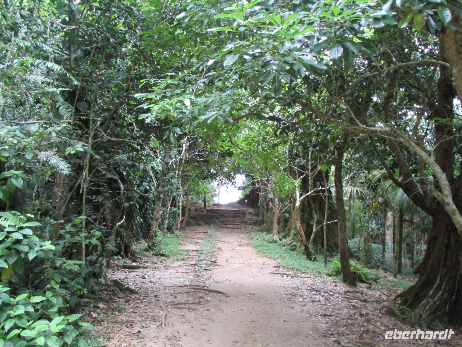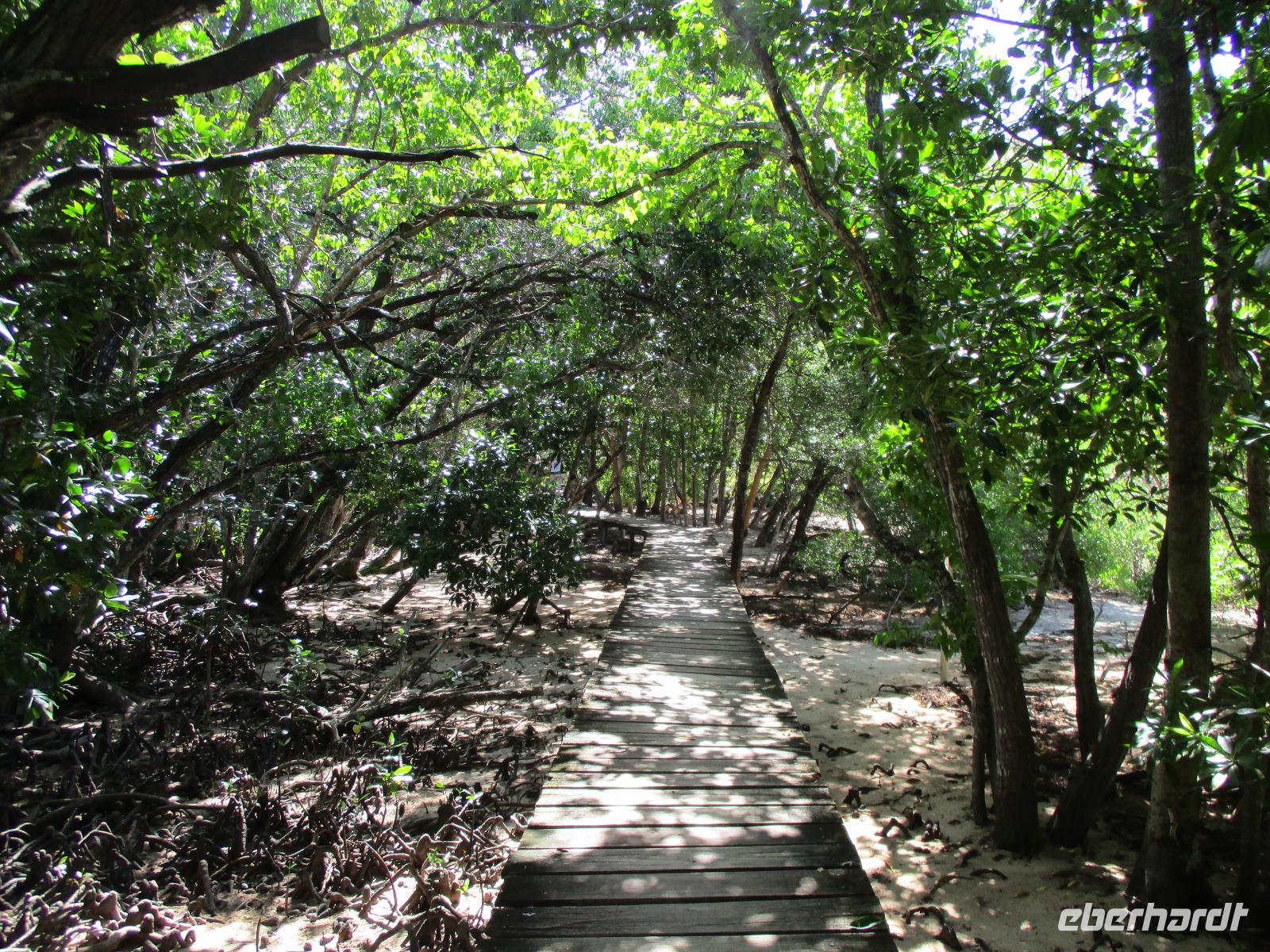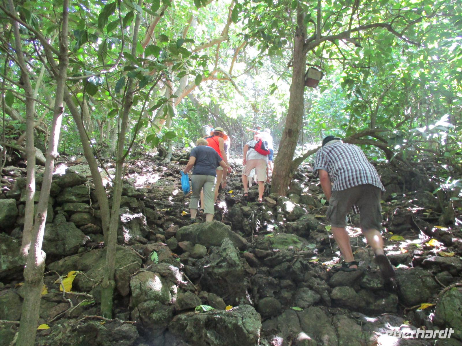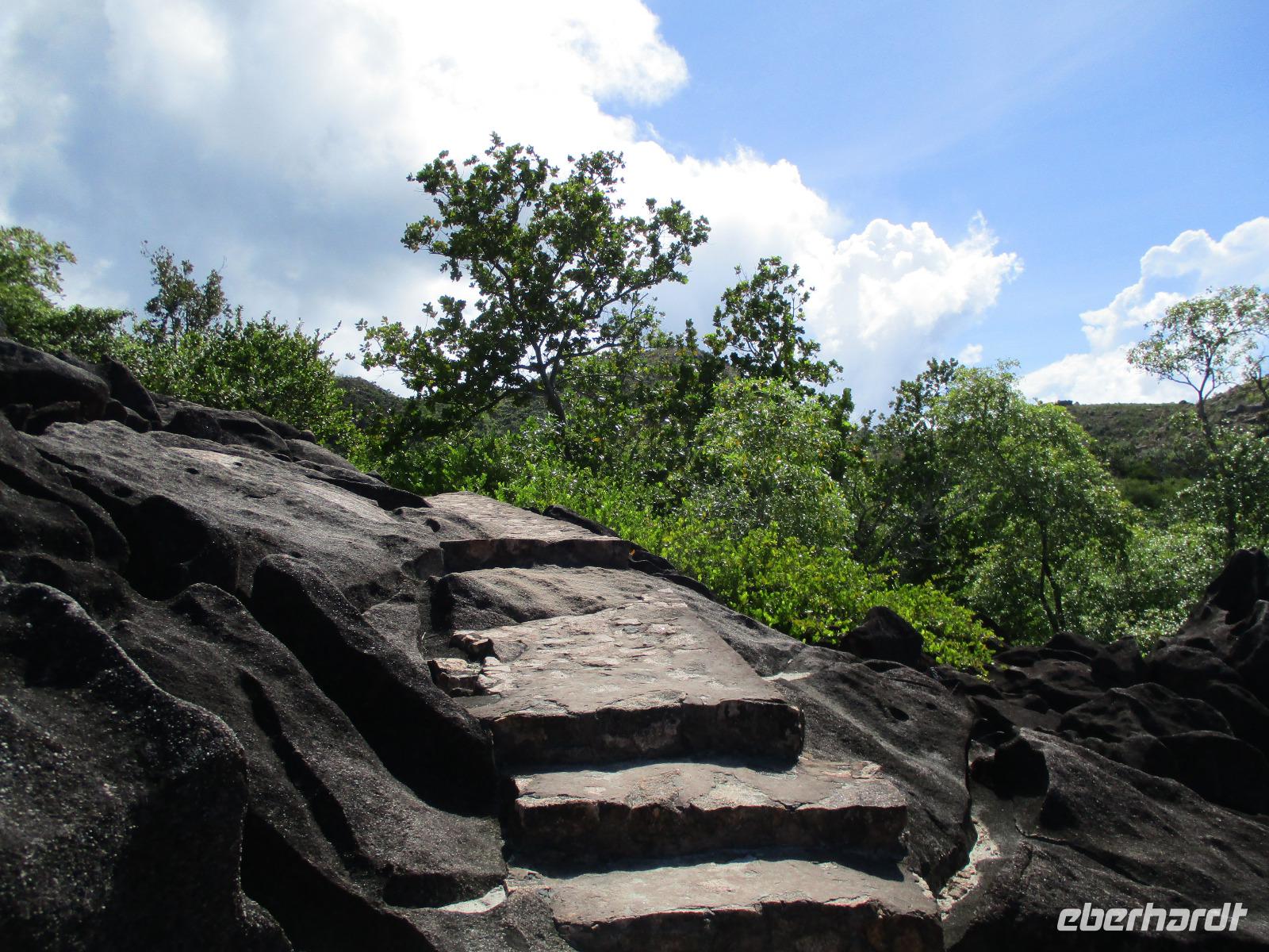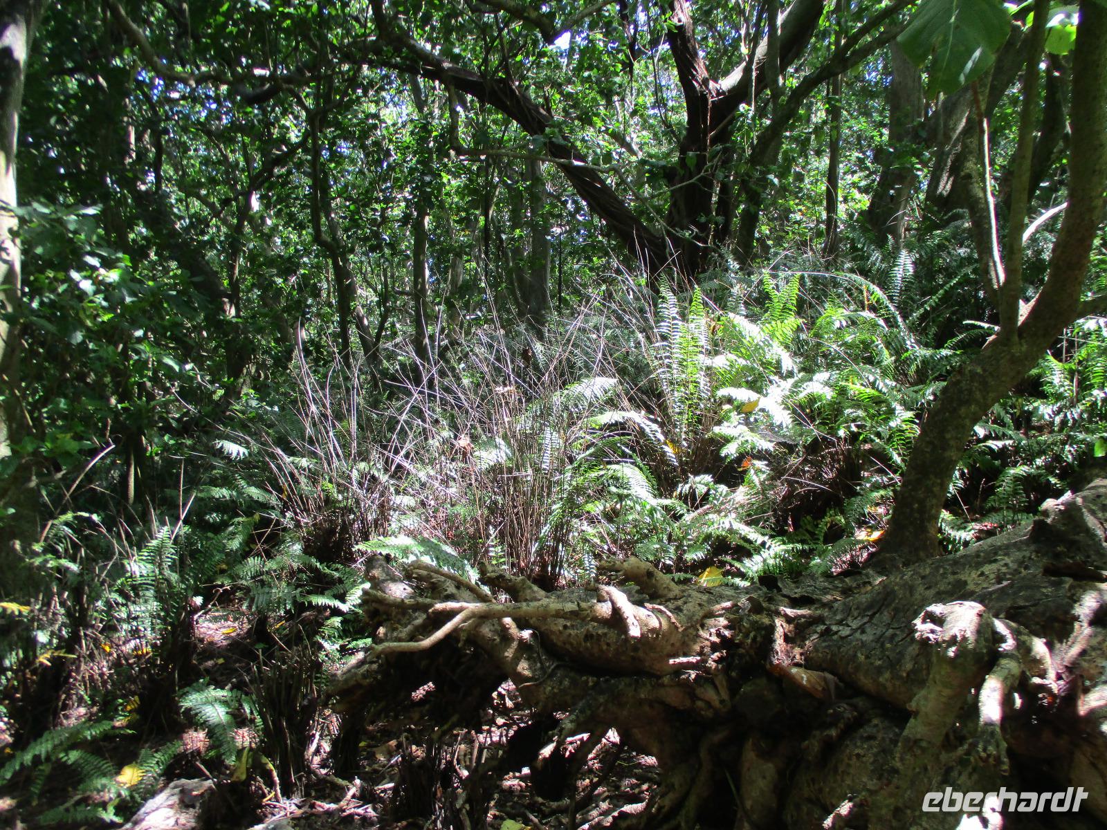 Gemeinsam mit Cyrill checkten wir aus unserem Hotel aus und stiegen pünktlich um 9:00 Uhr in unseren Bus. Heute erkundeten wir die Hauptinsel der Seychellen bei einer Rundfahrt. Cyrill erklärte uns viel über die Tier- und Pflanzenwelt und das Leben der Menschen hier auf Mahé. Hin und wieder stiegen wir aus, spazierten unter seiner Anleitung umher und erfuhren viel Interessantes von ihm. Schöne Fotos sind an diesem Tag sicher auch entstanden. Wir erreichten schließlich die Mission Lodge, ein hinter Teeplantagen versteckter Ort. Dorthin hatten sich einst Sklaven geflüchtet und eine kleine Siedlung gegründet, um den menschen-unwürdigen Bedingungen der Sklaverei auf den Plantagen zu entgehen. Die Ruinen der kleinen Hütten, die sie damals bauten, künden heute noch von dieser Zeit. Von einer Anhöhe aus hatten wir einen beeindruckenden Ausblick hinunter auf eine Bucht. Ein kräftiger Regenguss brachte uns Wasser von oben. Auf dem Rückweg zum Bus fotografierten wir noch die Jack-Frucht, oder auch Stinkfrucht genannt. Cyrill erzählte uns viel über die hier wachsenden Pflanzen, sogar die Zutaten für einen Sud zum Inhalieren aus der traditionellen Medizin der Seychellios konnte er uns nennen, natürlich alles Pflanzen, die man hier findet, unter anderem Zitronengras und die Sansibwurzel. Das Mittagessen ließen wir uns im traditionellen creolischen Restaurant „Marie Antoinette" schmecken. Viele Gäste kommen hier her, nicht nur wegen des leckeren Essens, sondern auch wegen der zahlreichen großen Landschildkröten, die es hinter uns in einem Gehege gab. Sie sollen Glück bringen, und so zieht es sicher auch viele Gäste aus diesem Grund hier her. Nach dem Essen hieß es erst einmal wieder Abschied nehmen von Cyrill und der Insel Mahé. Denn am Nachmittag sollten wir die Fähre nach Praslin besteigen, auf der zweitgrößten Insel der Seychellen würden wir die meiste Zeit unseres Aufenthaltes hier verbringen. Am Fähranleger, die hier immer Jetty heißen, verabschiedeten wir uns für diesen Tag von Cyrill, wir sollten ihn wieder sehen. Unser Gepäck wurde verladen. Nach einstündiger Überfahrt erreichten wir alle wohlbehalten den Anleger auf Praslin. Erwartet wurden wir schon von den Skippern des New Emerald Cove Hotels. Weil dieses Hotel nur auf dem Wasserweg zu erreichen ist, gingen wir zu einem kleinen Boot, unser Gepäck wurde auf ein anderes verladen und los ging es per Motorboot über die Bucht. Am anderen Ende legten wir an und betraten unser zu Hause für die nächsten zwei Wochen. Wir waren zwar erschöpft vom Tag und der Anreise, aber die Aussicht auf unsere Zeit hier zwischen Palmen, Strand und gemütlichen Bungalows gefiel uns gewaltig. Es sollte vor einiger Zeit hier mal eine Straße hin gebaut werden, irgendwie konnte das Projekt nicht vollendet werden, weil private Landbesitzer nichts davon für die Straße verkaufen wollten. Für uns stellte sich das als riesiger Glücksfall dar, denn so konnten wir unsere Zeit hier in Abgeschiedenheit und Ruhe genießen. Nur wenige Gäste fasst das Hotel überhaupt, manchmal waren wir die einzigen, die den langen weißen Sandstrand benutzten. Also ein herrlicher Ort für ein paar erholsame Tage im Paradies. Wir wurden mit einem Cocktail begrüßt und später in unsere Bungalows geführt. Wir erfuhren einiges zu den Möglichkeiten im Hotel, so werden beispielsweise kostenfreie Schnorchel- und Wanderausflüge angeboten. Nach dem gemeinsamen Abendessen schliefen wir unsere erste Nacht im New Emerald Cove Hotel und freuten uns auf die kommenden Tage hier.