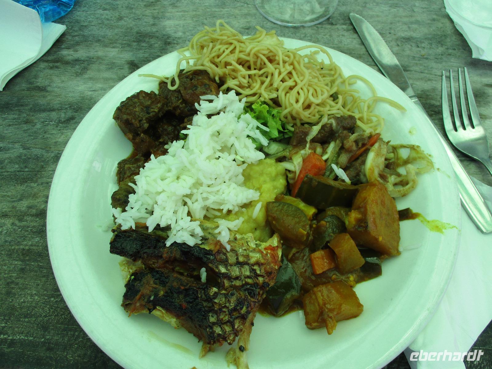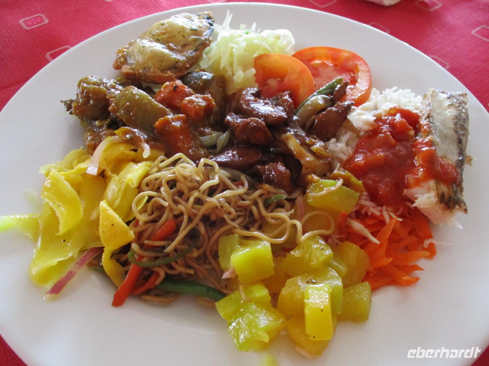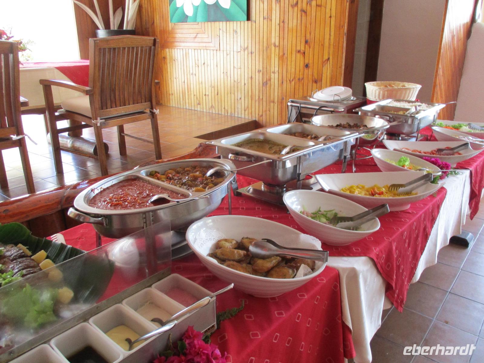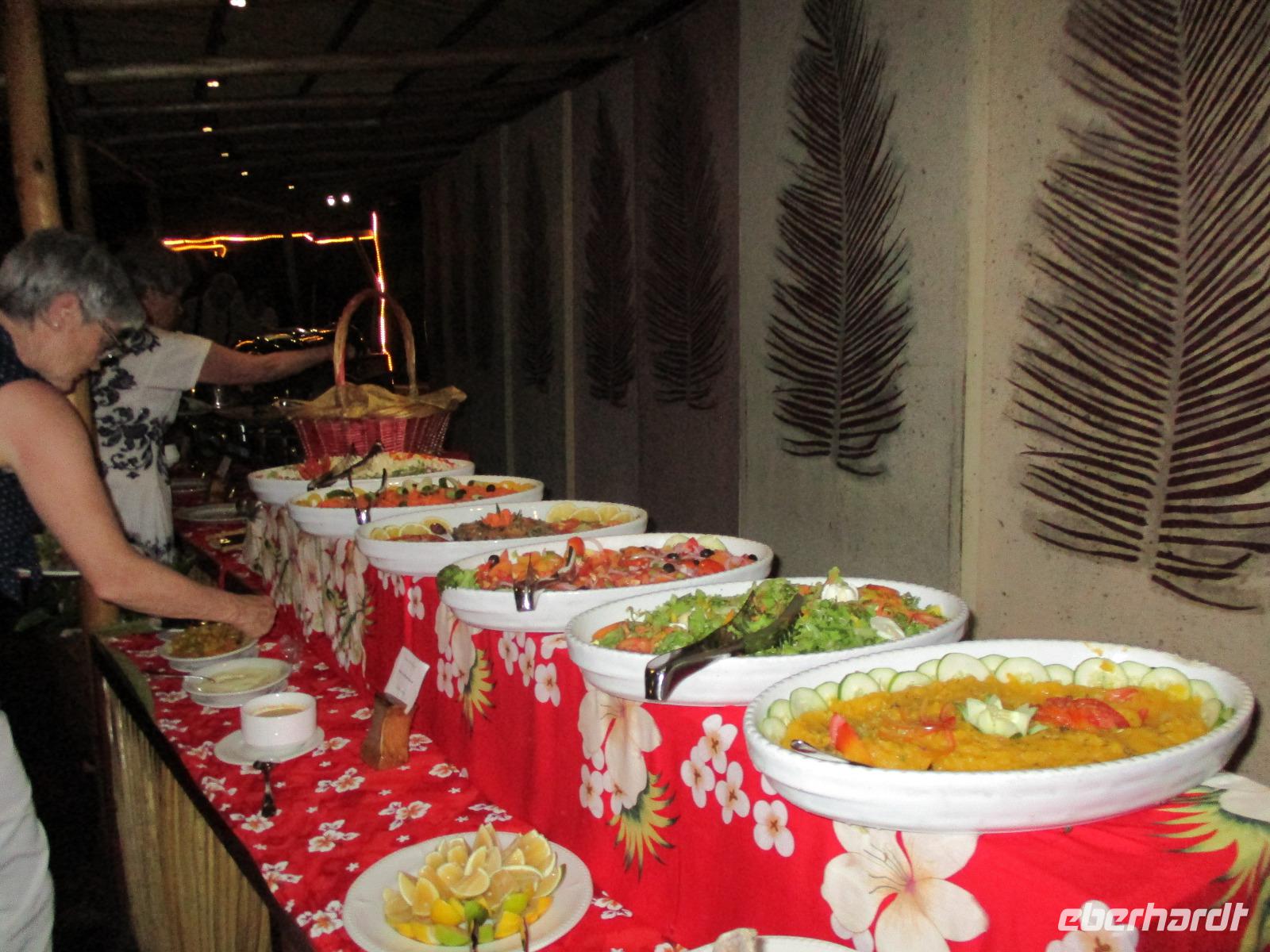 Jeden Abend fanden wir uns im Restaurant ein, das im Freien mit Leckereien vom Buffet auf uns wartete. Lediglich ein Dach gibt es über dem Restaurant, denn manchmal regnet es hier auch, und wenn, dann gleich heftig.