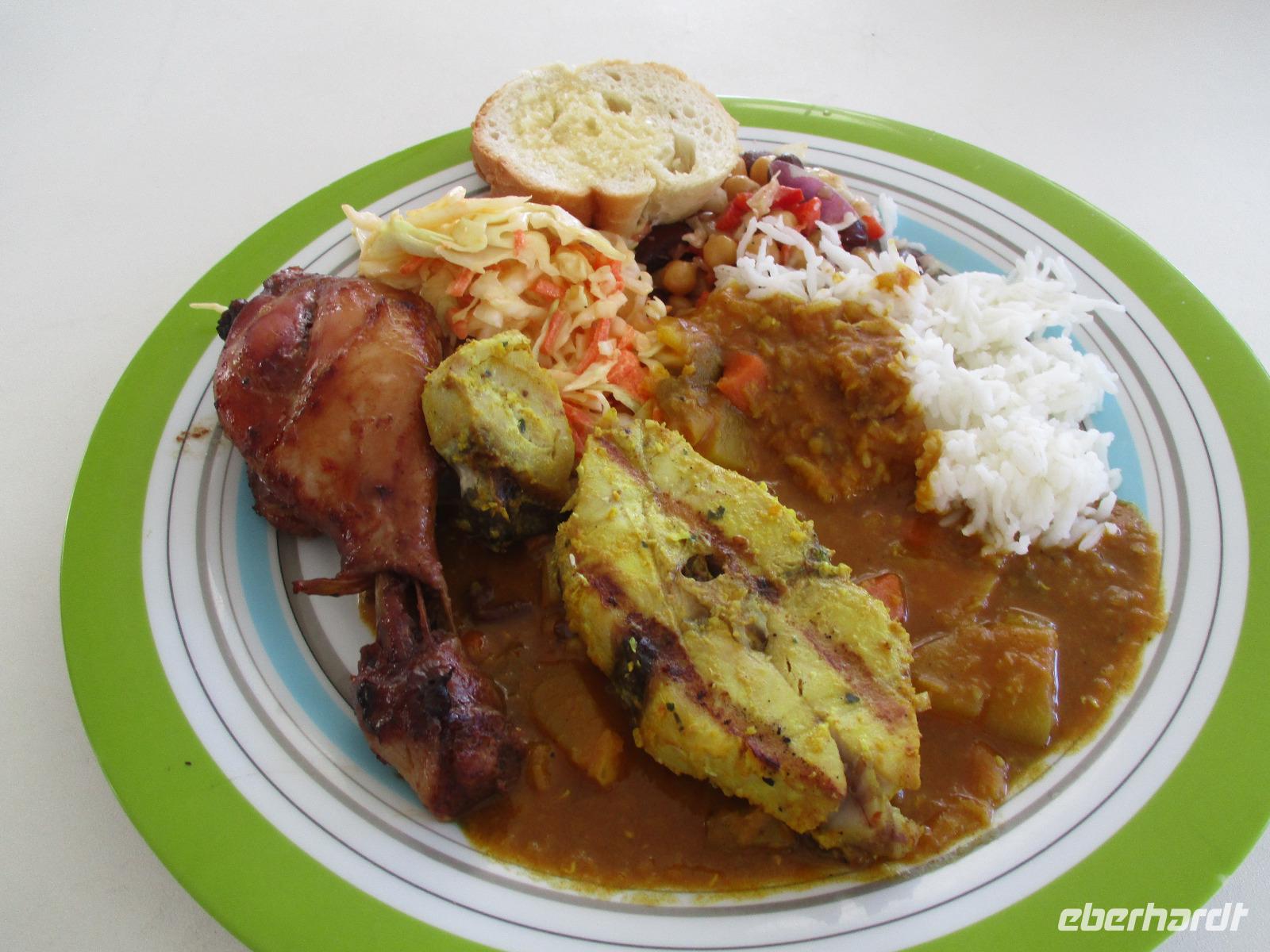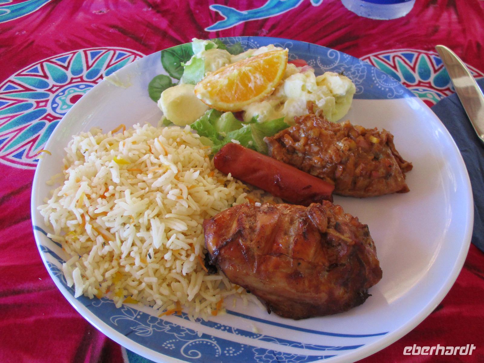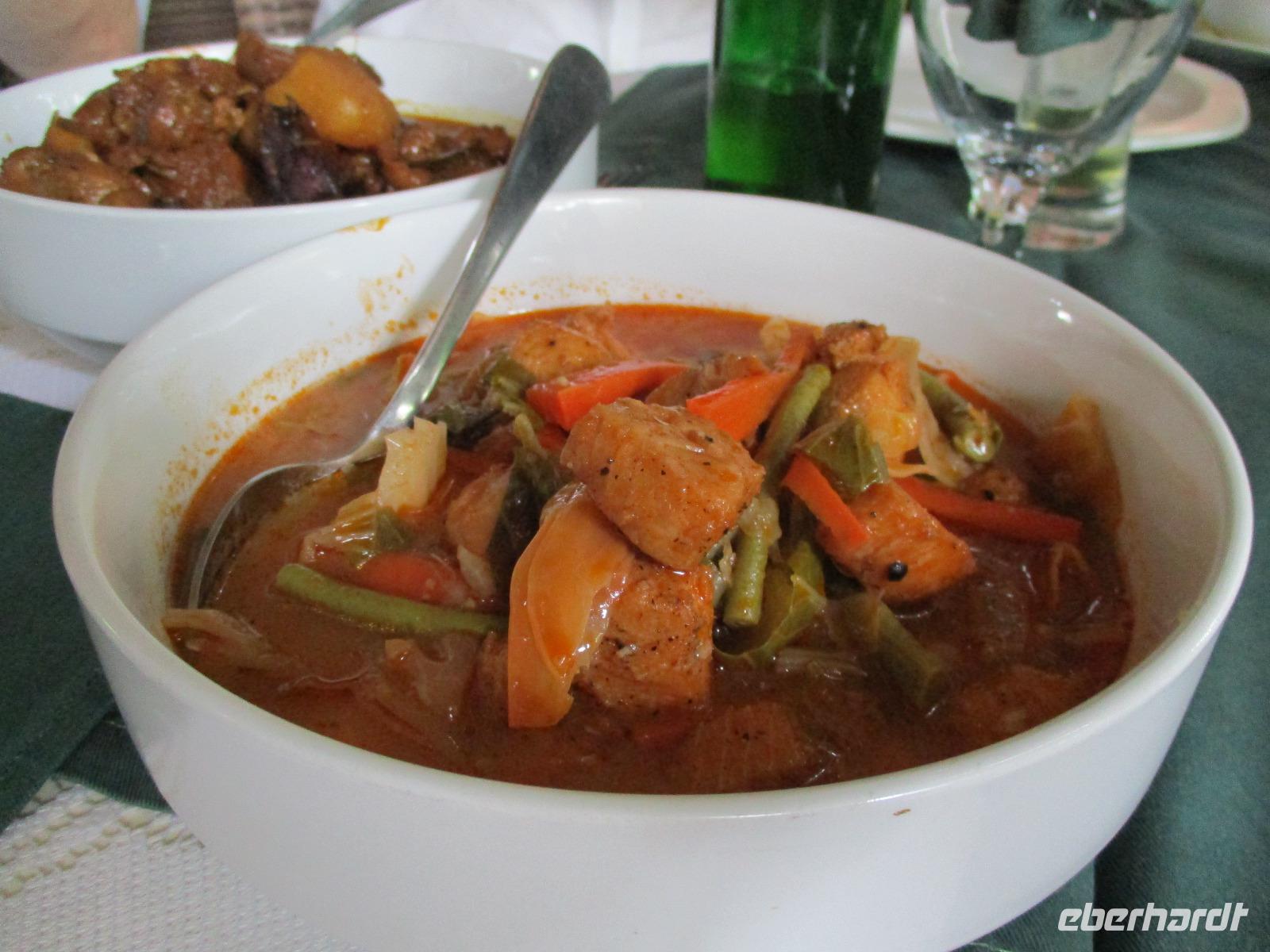 Jeden Abend fanden wir uns im Restaurant ein, das im Freien mit Leckereien vom Buffet auf uns wartete. Lediglich ein Dach gibt es über dem Restaurant, denn manchmal regnet es hier auch, und wenn, dann gleich heftig.