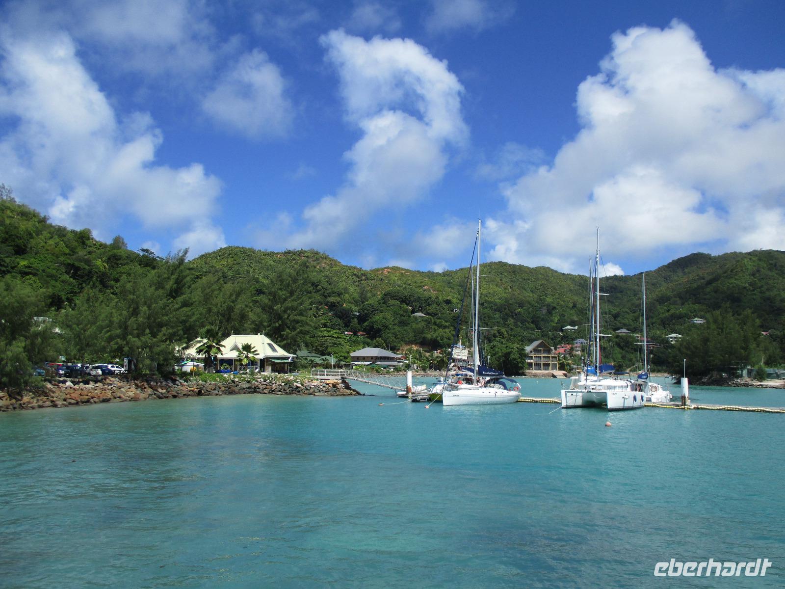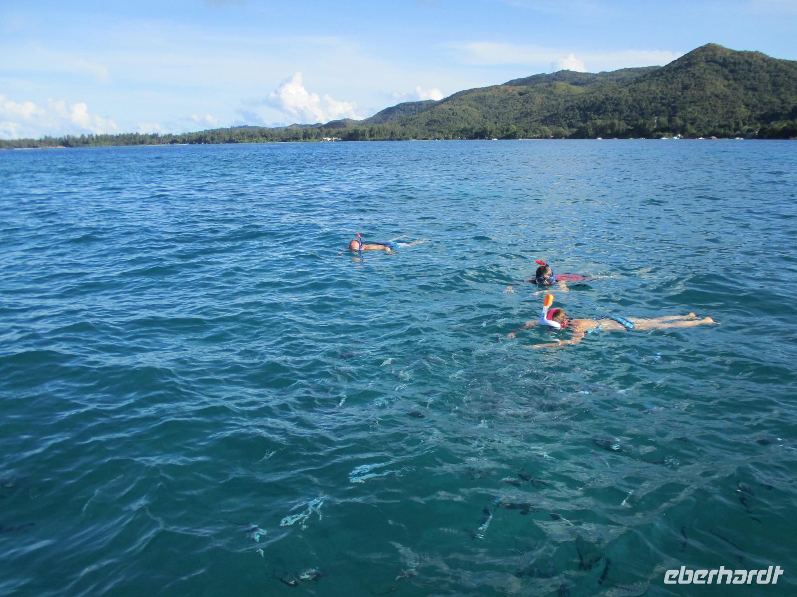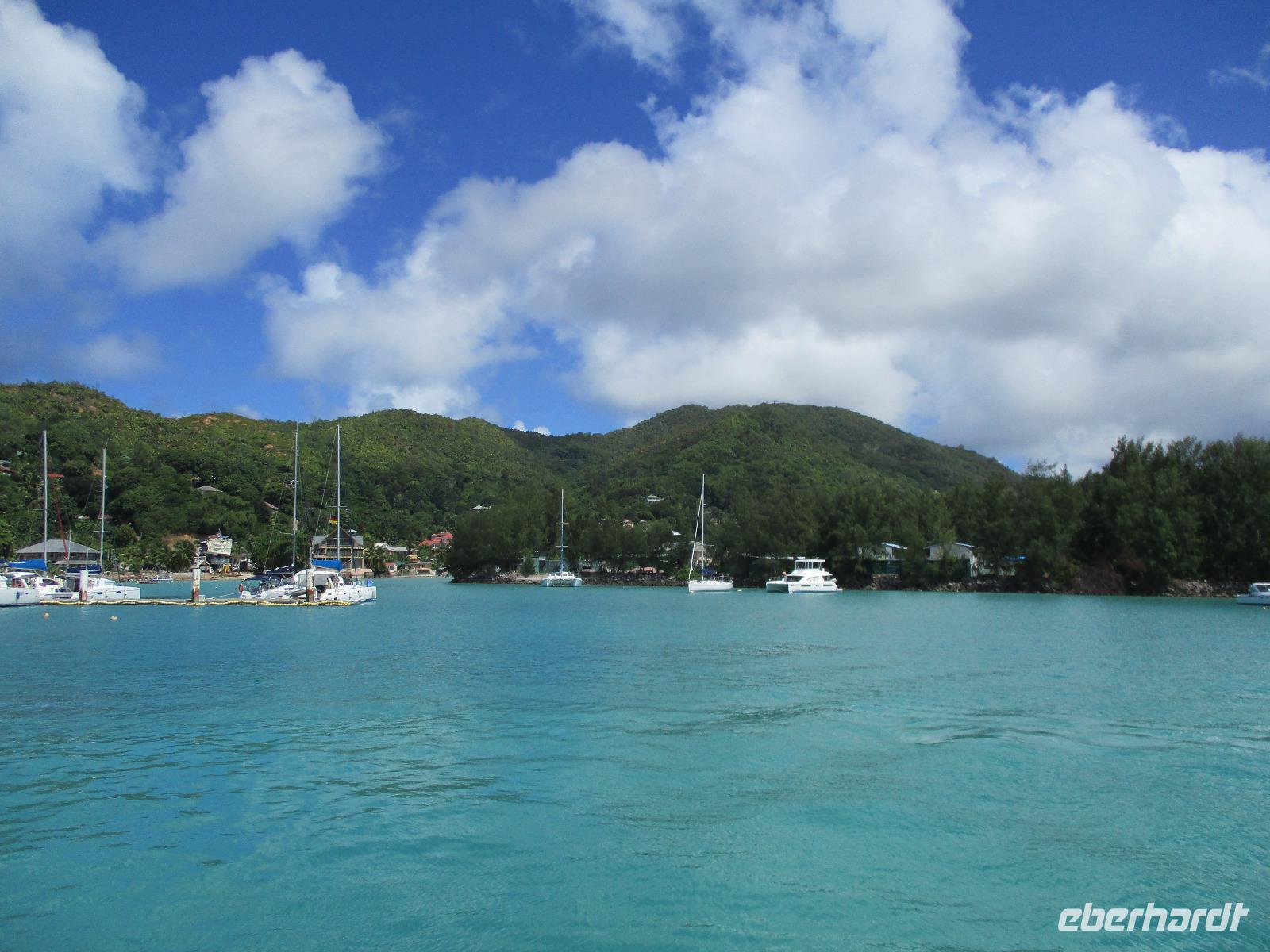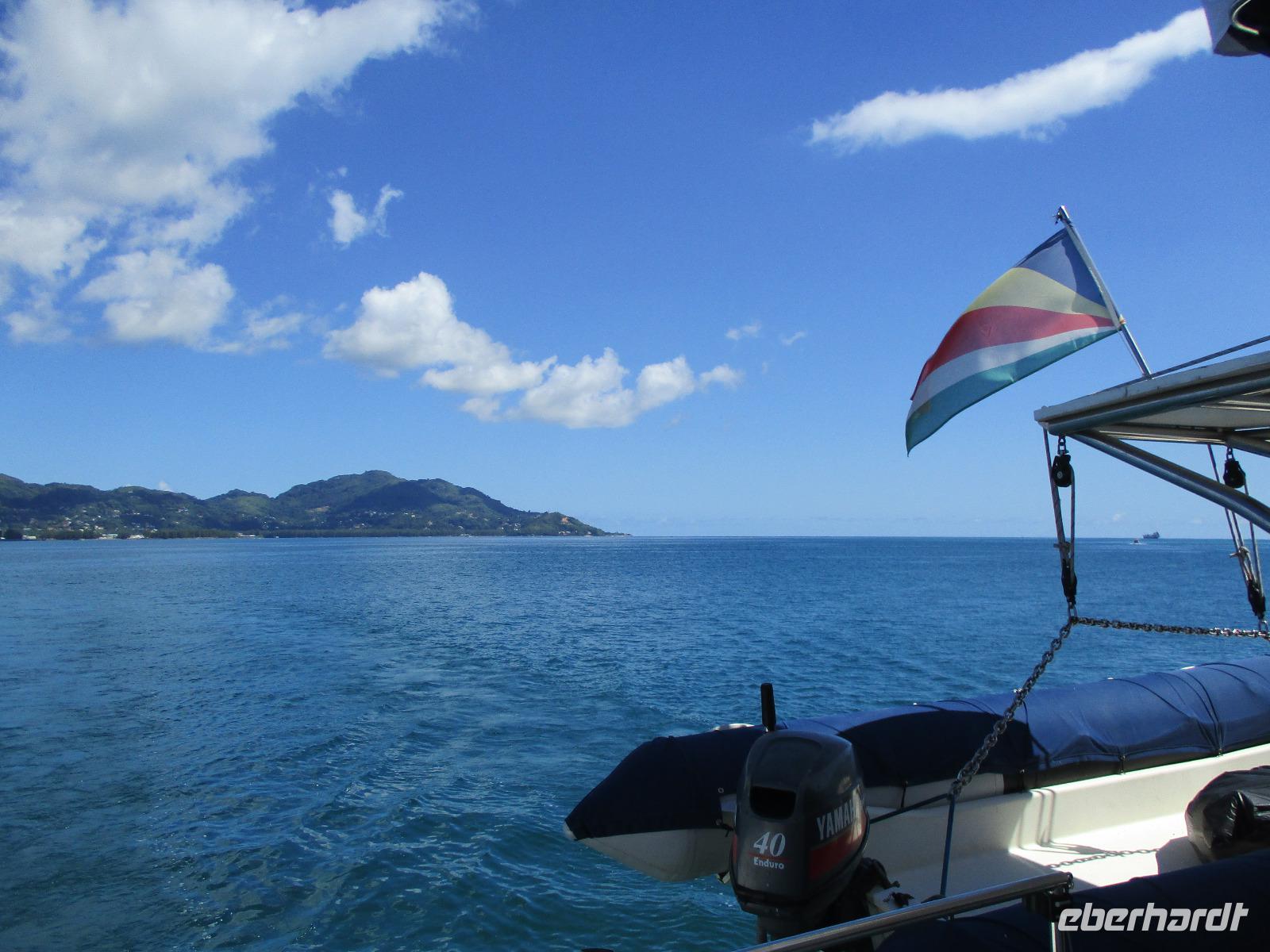 Gleich nach dem Frühstück wurden wir von Cyrill und einem Kleinbus abgeholt. Wir fuhren auf sich windenden Straßen, gesäumt von Palmen, herrlichen Ausblicken aufs Meer und bunten Häusern, hinunter bis zum Hafen von Victoria. Ein Katamaran wartete schon auf uns, und wir begannen unsere Fahrt hinaus zum St. Anne Marine Park, das ist ein Nationalpark bestehend aus 6 Inseln und dem Wasser drum herum. Wir genossen die Fahrt, während eine traumhafte Landschaft an uns vorbeizog. Auch Fische wurden gefüttert, die sogleich in dichten Schwärmen neben unserem Katamaran auftauchten und schöne Fotomotive lieferten. Wir konnten schnorcheln und mit einem Glasbodenboot fahren. Der Meeresboden glitt an uns vorbei, durch die Glasscheiben unter Wasser konnten wir verschiedene Korallenarten und auch einige Fische entdecken. Die Namen der Korallen kommen von deren Aussehen, wie uns Cyrill erklärte. So sahen wir zum Beispiel Salat-, Gehirn- und Fingerkorallen. Auf dem Katamaran ließen wir uns ein leckeres Mittagessen schmecken und am Nachmittag legten wir an der Insel Moyenne an. Wir stiegen ins seichte Wasser vor dem weißen Strand. Ein kleiner Aufstieg führte uns hinauf bis zur Kapelle der Insel, wo auch das Grab des Engländers Brendon Grimshaw zu finden ist, dem einst die Insel gehört hatte und der seitdem für die Erhaltung der ursprünglichen Natur hier gekämpft hatte. Erste große Landschildkröten luden zu zaghaften Begegnungen mit den urzeitlichen Tieren ein. Wir fotografierten so manchen überwältigenden Ausblick aufs türkisfarbene Meer im Sonnenschein. Während einer Pause am Strand ruhten wir aus im Schatten oder genossen die Sonne und das Meer. Am späten Nachmittag schließlich legte unser Katamaran schließlich wieder im Hafen von Victoria an, wir stiegen in unseren kleinen Bus und wurden zurück zum Hotel gebracht. Ein bisschen Freizeit noch, dann trafen wir uns wieder zum gemeinsamen Abendessen. Danach gingen die meisten in ihre Zimmer, einige Gäste unserer Gruppe genossen den Abend noch am Hotelpool bei einem Getränk aus der Bar, eine Liveband spielte und sorgte für einen entspannten Abend.