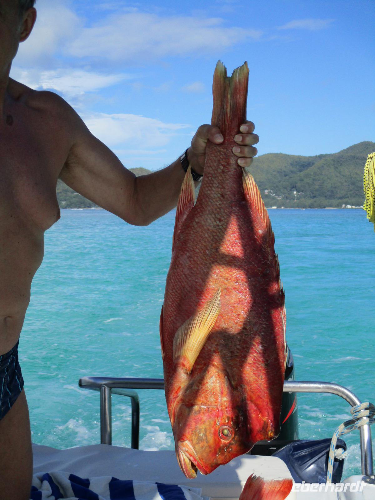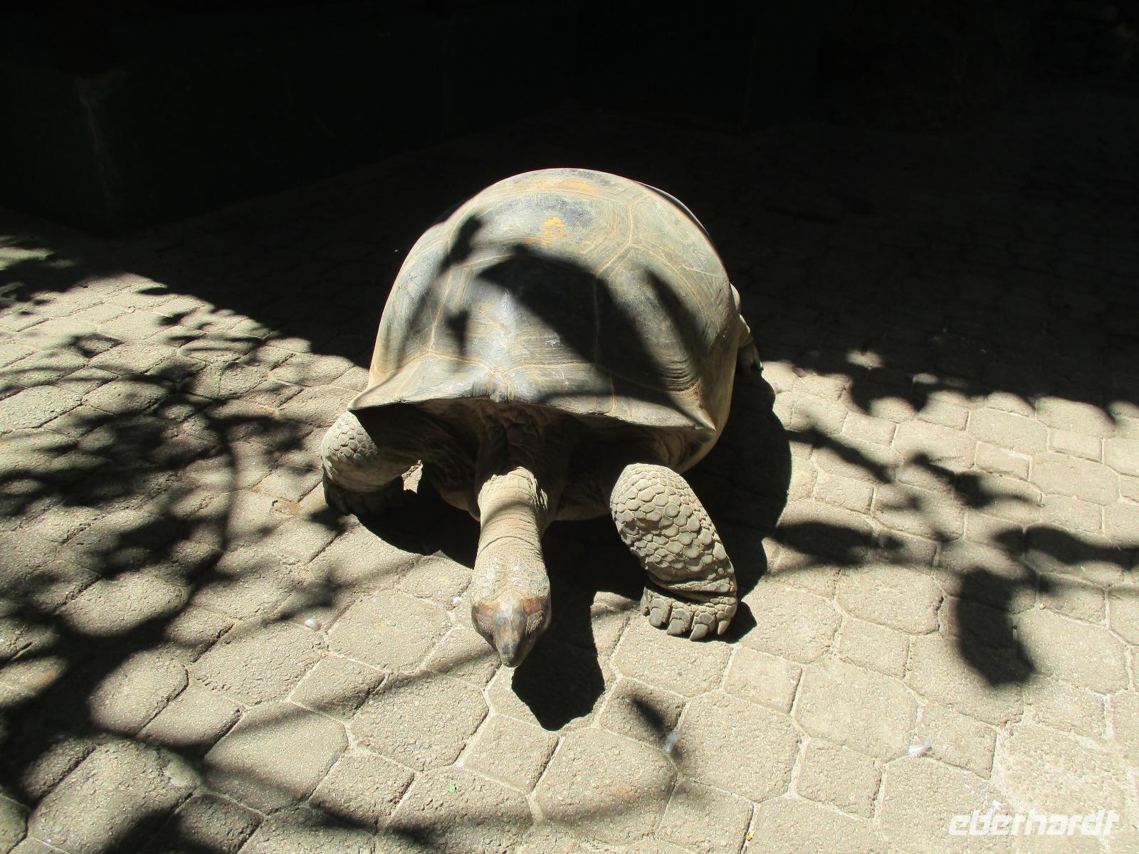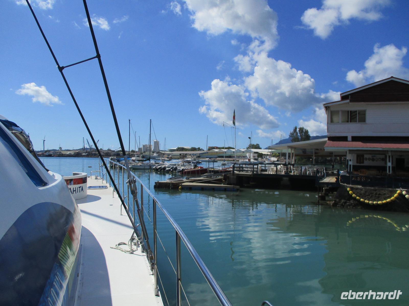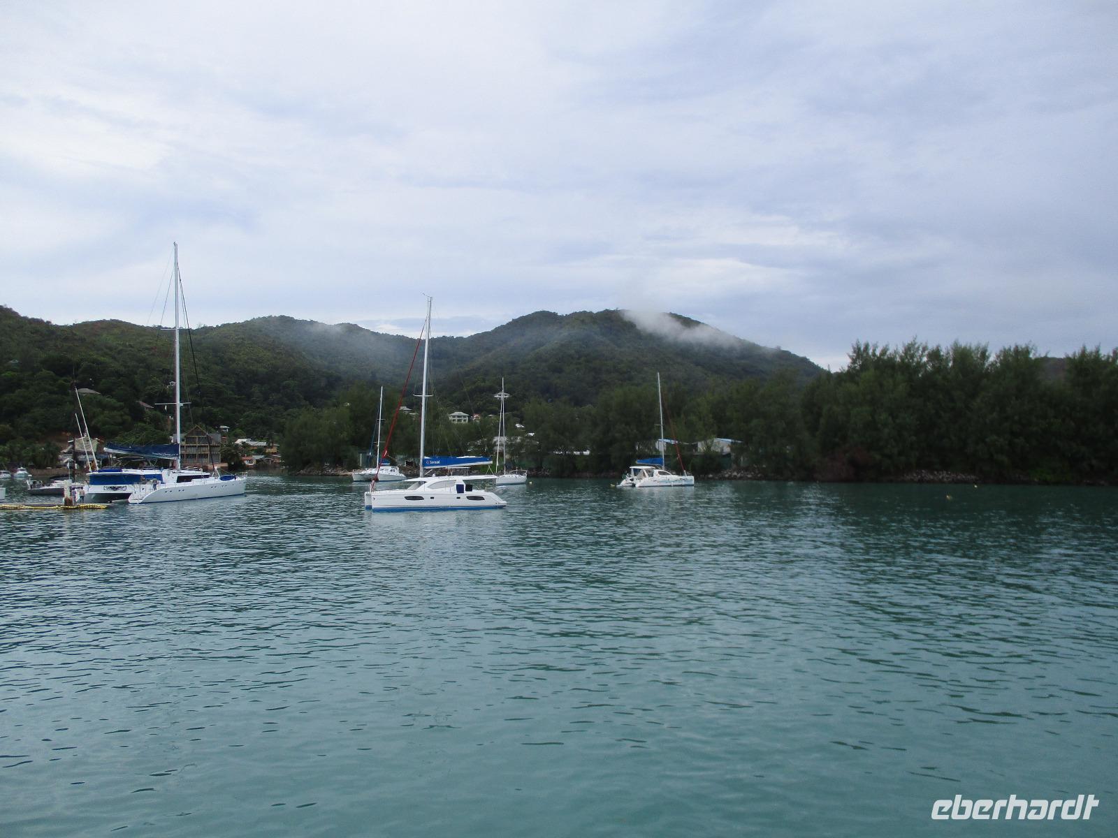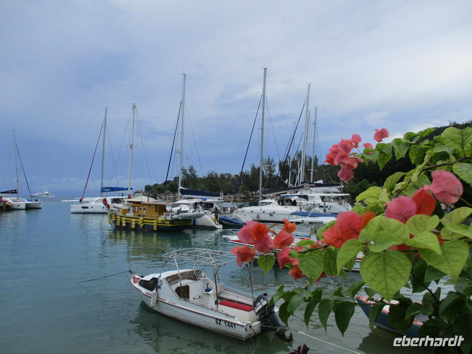 Gleich nach dem Frühstück wurden wir von Cyrill und einem Kleinbus abgeholt. Wir fuhren auf sich windenden Straßen, gesäumt von Palmen, herrlichen Ausblicken aufs Meer und bunten Häusern, hinunter bis zum Hafen von Victoria. Ein Katamaran wartete schon auf uns, und wir begannen unsere Fahrt hinaus zum St. Anne Marine Park, das ist ein Nationalpark bestehend aus 6 Inseln und dem Wasser drum herum. Wir genossen die Fahrt, während eine traumhafte Landschaft an uns vorbeizog. Auch Fische wurden gefüttert, die sogleich in dichten Schwärmen neben unserem Katamaran auftauchten und schöne Fotomotive lieferten. Wir konnten schnorcheln und mit einem Glasbodenboot fahren. Der Meeresboden glitt an uns vorbei, durch die Glasscheiben unter Wasser konnten wir verschiedene Korallenarten und auch einige Fische entdecken. Die Namen der Korallen kommen von deren Aussehen, wie uns Cyrill erklärte. So sahen wir zum Beispiel Salat-, Gehirn- und Fingerkorallen. Auf dem Katamaran ließen wir uns ein leckeres Mittagessen schmecken und am Nachmittag legten wir an der Insel Moyenne an. Wir stiegen ins seichte Wasser vor dem weißen Strand. Ein kleiner Aufstieg führte uns hinauf bis zur Kapelle der Insel, wo auch das Grab des Engländers Brendon Grimshaw zu finden ist, dem einst die Insel gehört hatte und der seitdem für die Erhaltung der ursprünglichen Natur hier gekämpft hatte. Erste große Landschildkröten luden zu zaghaften Begegnungen mit den urzeitlichen Tieren ein. Wir fotografierten so manchen überwältigenden Ausblick aufs türkisfarbene Meer im Sonnenschein. Während einer Pause am Strand ruhten wir aus im Schatten oder genossen die Sonne und das Meer. Am späten Nachmittag schließlich legte unser Katamaran schließlich wieder im Hafen von Victoria an, wir stiegen in unseren kleinen Bus und wurden zurück zum Hotel gebracht. Ein bisschen Freizeit noch, dann trafen wir uns wieder zum gemeinsamen Abendessen. Danach gingen die meisten in ihre Zimmer, einige Gäste unserer Gruppe genossen den Abend noch am Hotelpool bei einem Getränk aus der Bar, eine Liveband spielte und sorgte für einen entspannten Abend.