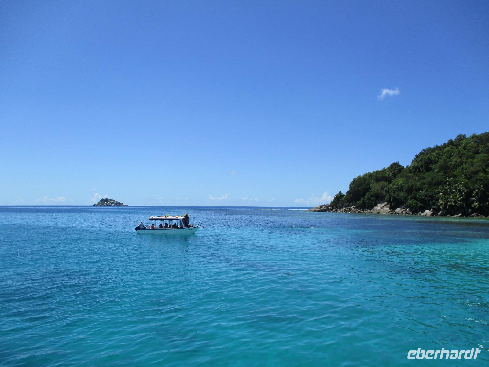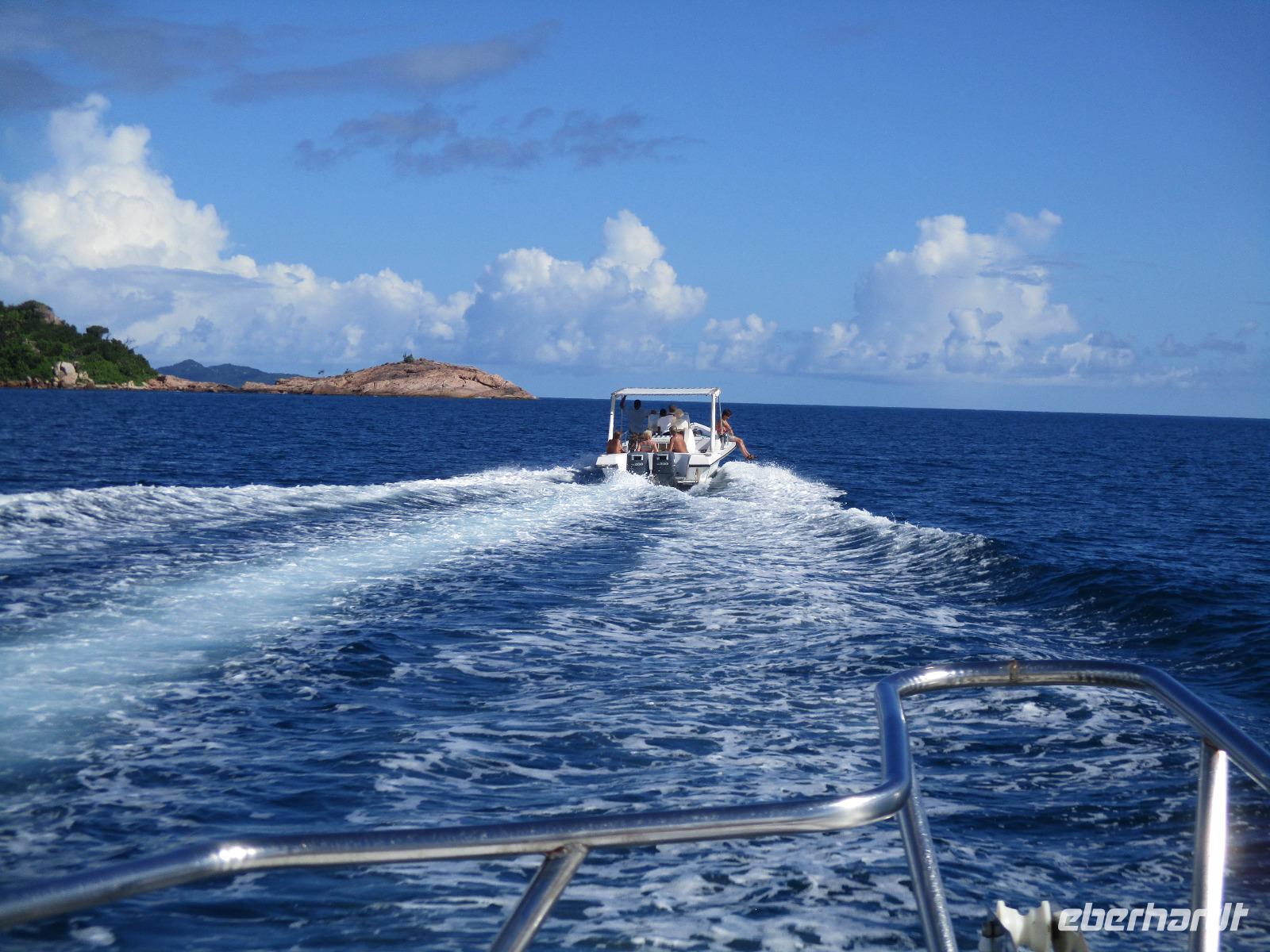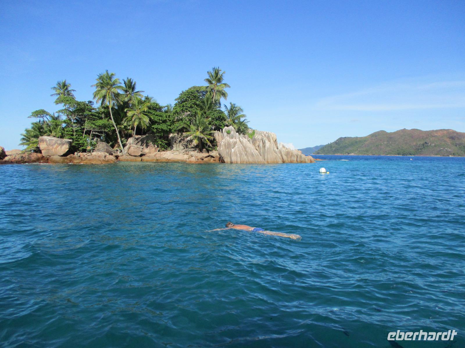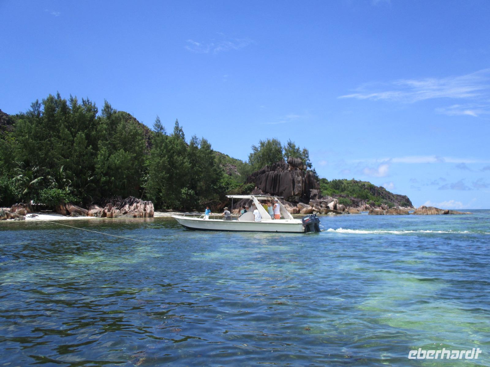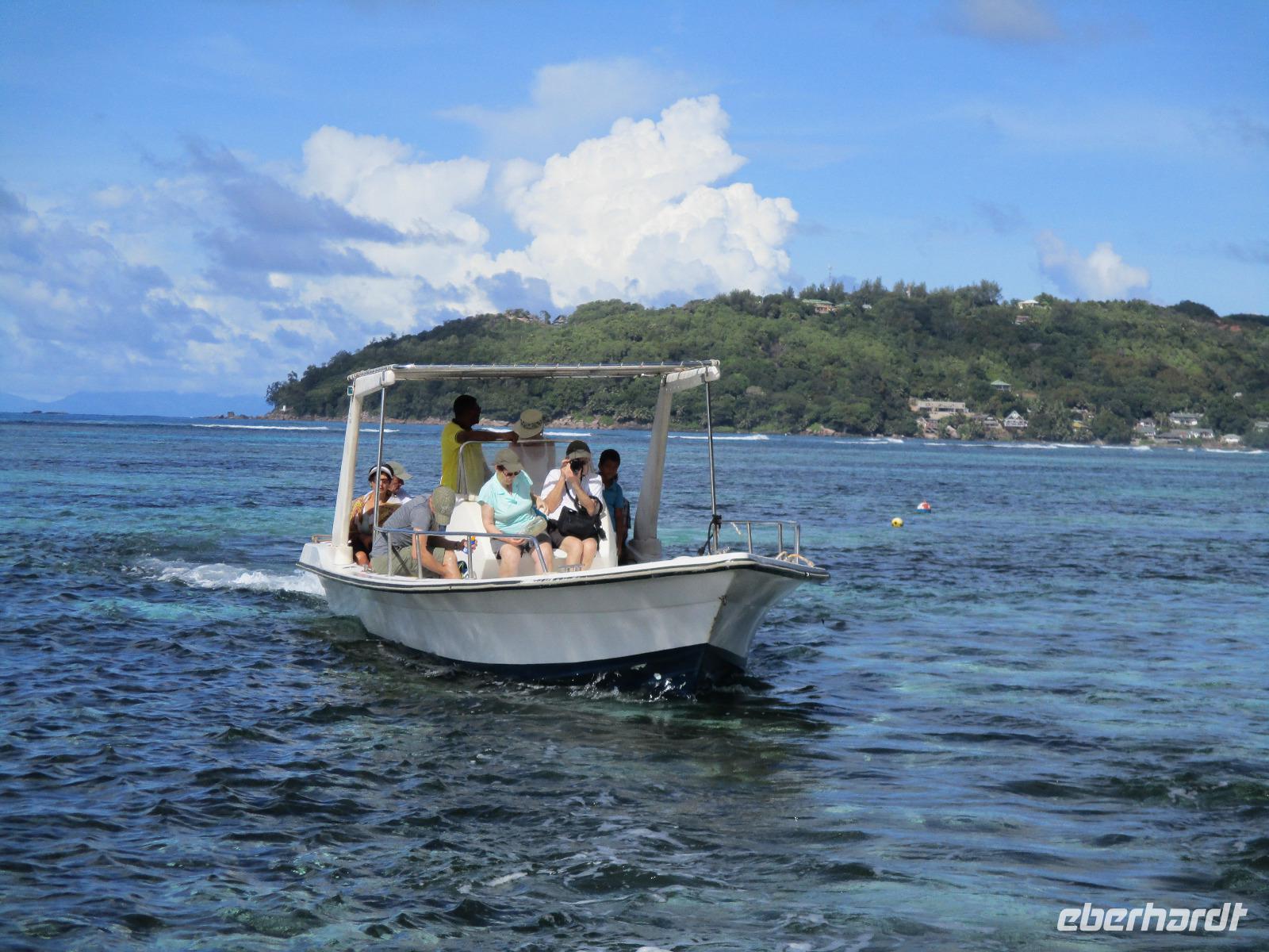 Gleich vom Hotel aus startete unser Ausflug auf drei Inseln, die heute unser Ziel waren. Unsere Skipper hatten noch einen Koch und das vorbereitete Mittagessen an Bord. Vorbei an kleinen Inseln mit weißen Stränden, grauen abgespülten Granitfelsen und Palmen fuhr eines unserer zwei Boote bis zur Insel Curieuse, wo wir später ein Grillessen am Strand bekommen sollten. Damit der Koch alles vorbereiten konnte, wurden er und der Proviant dort abgesetzt. Wir blieben im Boot, denn unser erstes Ziel dieses Tages war die Vogelinsel Cousin. Von einem der Ranger dort wurden wir über die Insel geführt. Da die nistenden Vögel hier keine Feinde wie Katzen, Hunde oder Ratten zu befürchten haben, denn die gibt es hier einfach nicht, legen sie ihre Eier irgendwo ab: in hohlen Baumresten von Palmen, in Mulden zu ebener Erde, auf bequem zu erreichenden Astvertiefungen. Dort werden die einzelnen Eier ausgebrütet und die putzigen kleinen Jungvögel sitzen dann dort, bewegen sich kein Stück, und werden gefüttert von den Eltern, bis sie schließlich flügge sind. In der Hauptsaison, die noch nicht begonnen hatte, leben mehrere Hunderttausend Vögel auf der Insel und sorgen so für eine ganze Menge tierischen Dünger, den Guano. Ganze Mauern sind hier aus hart gewordenen Guano-Brocken gebaut. Wir bestaunten nicht nur Vögel wie die Feenseeschwalbe, den Lesser Noddy oder den Weißschwanz-Tropikvogel, auch behäbigen Landschildkröten begegneten wir auf unserem Weg, die sich gern von uns am Kopf streicheln ließen. Nach unserem Rundgang, der durch einen heftigen Regenguss etwas durcheinander geraten war, bestiegen wir wieder unsere Boote und fuhren nun auf die Insel Curieuse, wo uns schon ein leckeres Grillmittagessen erwartete. Unser Koch vom Hotel hatte gute Arbeit geleistet und so genossen wir leckeren Fisch, Hähnchen, Reis und Salat im Freien. Als Nachtisch ließen wir uns Passionsfrüchte und Orangen schmecken. Auch die mitgebrachten eisgekühlten Getränke waren eine Wohltat. Nach dem Essen hatten wir noch Zeit, die Landschildkröten zu besuchen, die hier frei auf dem Rasen umherspazieren können. Es gibt sogar eine Art Kinderstation, in der der kleine Nachwuchs geschützt heranwachsen kann. Einige der erwachsenen Tiere waren so anhänglich, dass sie uns folgten wie Hunde, um noch die ein oder andere menschliche Streicheleinheit abzubekommen. Bevor wie Curieuse ganz verließen, machten wir noch einen Spaziergang über die Insel zu einem anderen Strand. Dort besichtigten wir das Doctors' House, eine ehemalige Krankenstation, die heute als Museum eingerichtet ist. Denn die Insel Curieuse diente mehrere Jahrzehnte als Quarantäne-Insel für Leprakranke. Ein englischer Arzt hat sich damals um die Erkrankten sehr bemüht und ihnen in ihrer misslichen Lage geholfen. Für ein kurzes erfrischendes Bad im Meer war auch noch Zeit. Nachdem wir Curieuse verlassen hatten, legten wir noch einen Stopp vor der kleinen Insel St. Pierre ein. Hier gab es Gelegenheit, an den Felsen der Insel zu schnorcheln. Einige Gäste unserer Gruppe nutzten diese Gelegenheit, die anderen ruhten sich im Boot aus und beobachteten die Schnorchler.
