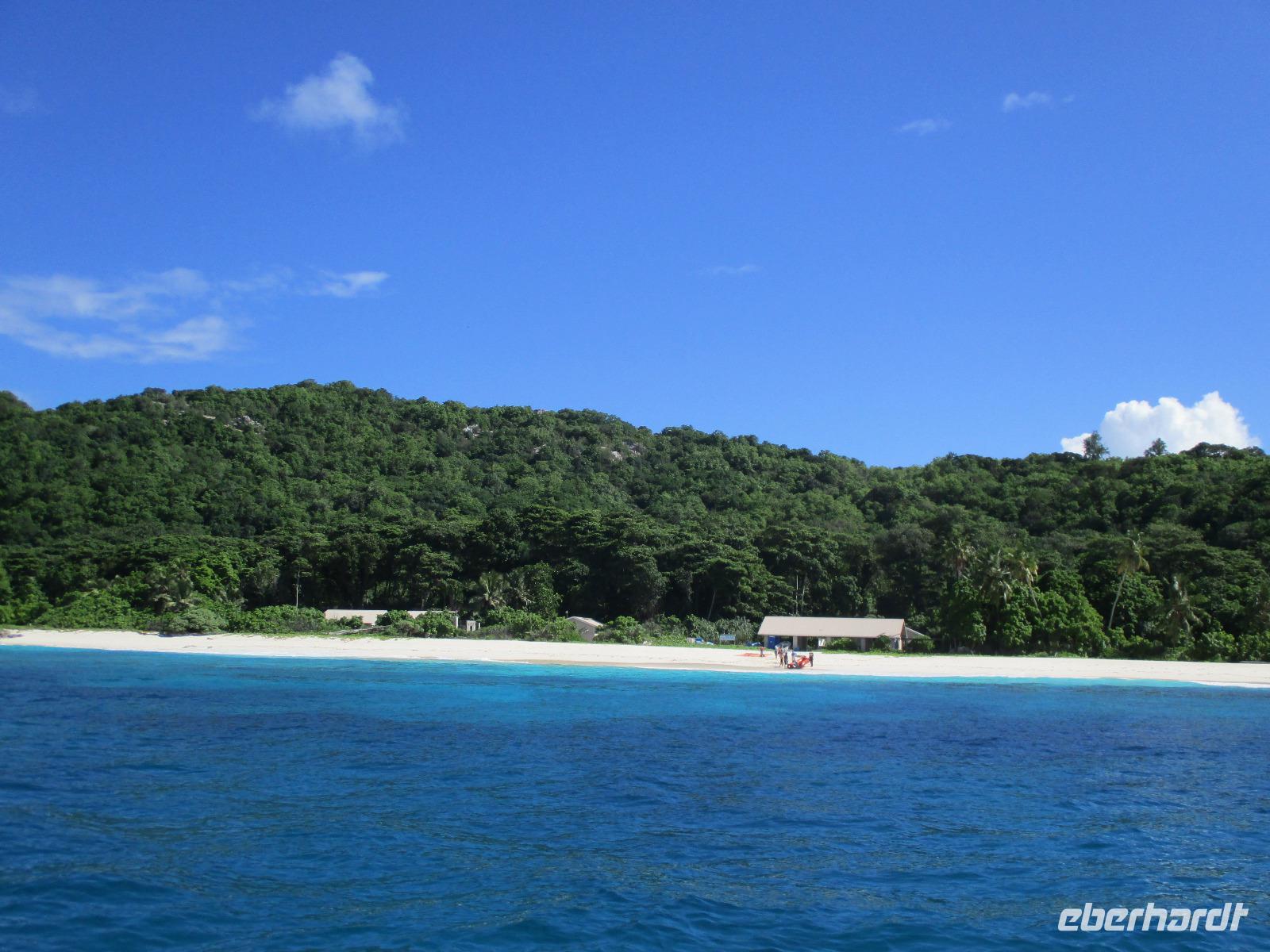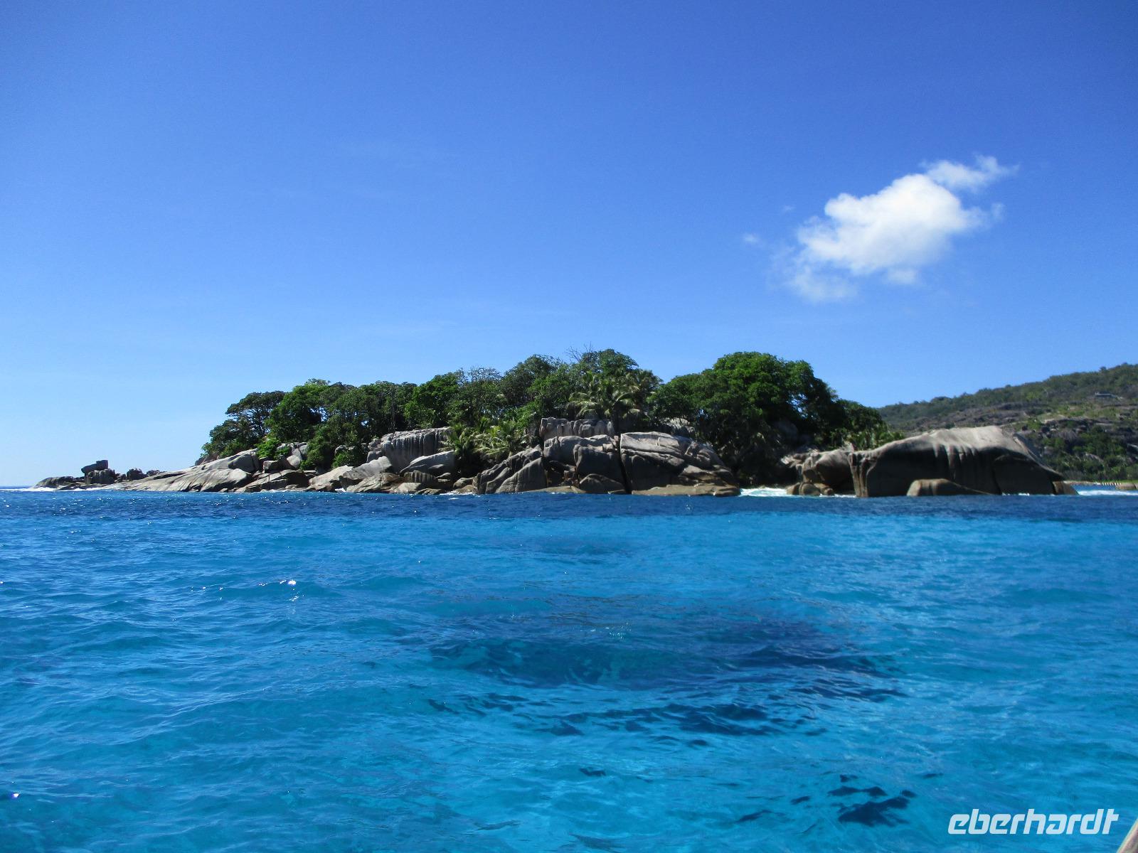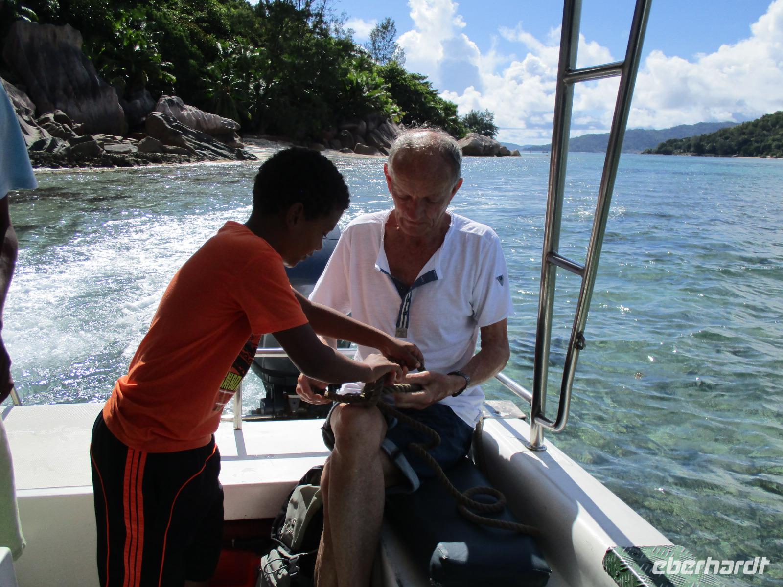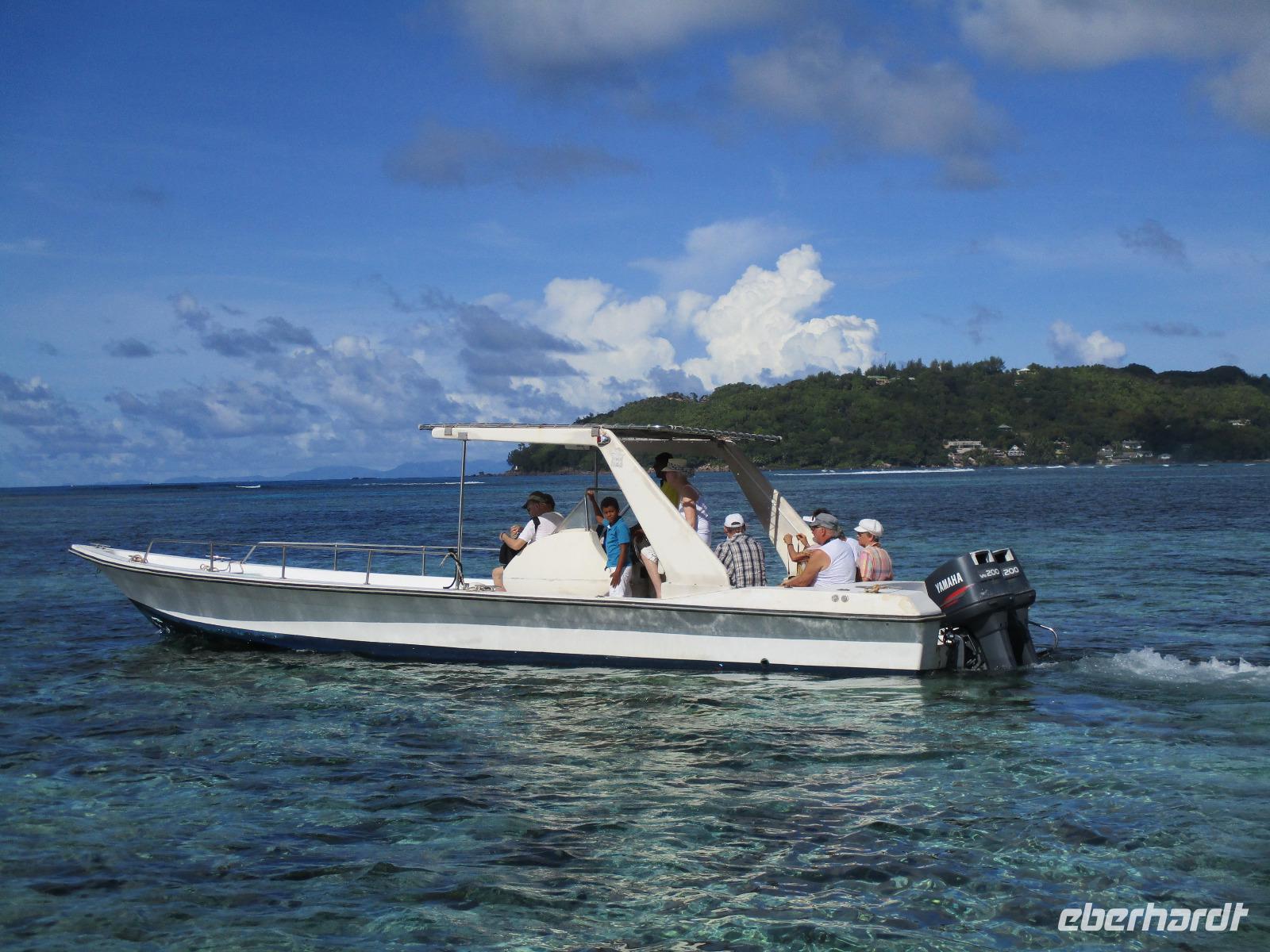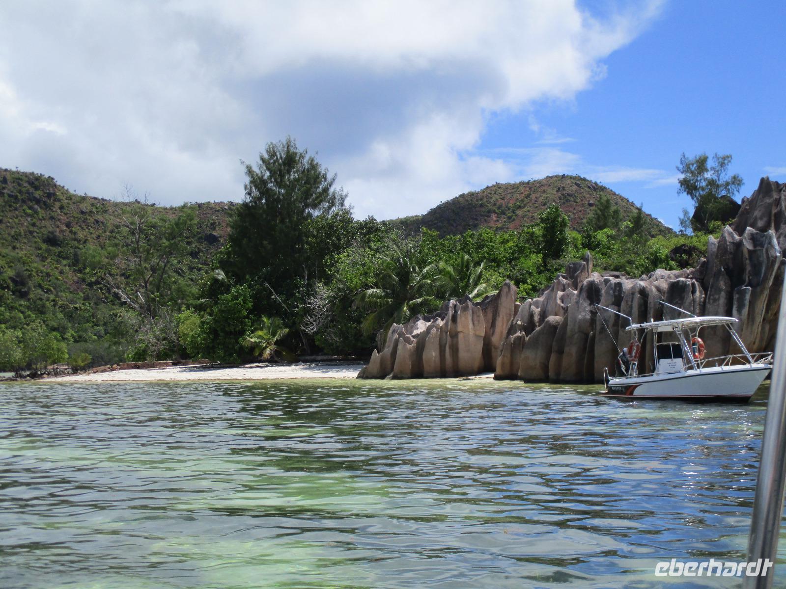Gleich vom Hotel aus startete unser Ausflug auf drei Inseln, die heute unser Ziel waren. Unsere Skipper hatten noch einen Koch und das vorbereitete Mittagessen an Bord. Vorbei an kleinen Inseln mit weißen Stränden, grauen abgespülten Granitfelsen und Palmen fuhr eines unserer zwei Boote bis zur Insel Curieuse, wo wir später ein Grillessen am Strand bekommen sollten. Damit der Koch alles vorbereiten konnte, wurden er und der Proviant dort abgesetzt. Wir blieben im Boot, denn unser erstes Ziel dieses Tages war die Vogelinsel Cousin. Von einem der Ranger dort wurden wir über die Insel geführt. Da die nistenden Vögel hier keine Feinde wie Katzen, Hunde oder Ratten zu befürchten haben, denn die gibt es hier einfach nicht, legen sie ihre Eier irgendwo ab: in hohlen Baumresten von Palmen, in Mulden zu ebener Erde, auf bequem zu erreichenden Astvertiefungen. Dort werden die einzelnen Eier ausgebrütet und die putzigen kleinen Jungvögel sitzen dann dort, bewegen sich kein Stück, und werden gefüttert von den Eltern, bis sie schließlich flügge sind. In der Hauptsaison, die noch nicht begonnen hatte, leben mehrere Hunderttausend Vögel auf der Insel und sorgen so für eine ganze Menge tierischen Dünger, den Guano. Ganze Mauern sind hier aus hart gewordenen Guano-Brocken gebaut. Wir bestaunten nicht nur Vögel wie die Feenseeschwalbe, den Lesser Noddy oder den Weißschwanz-Tropikvogel, auch behäbigen Landschildkröten begegneten wir auf unserem Weg, die sich gern von uns am Kopf streicheln ließen. Nach unserem Rundgang, der durch einen heftigen Regenguss etwas durcheinander geraten war, bestiegen wir wieder unsere Boote und fuhren nun auf die Insel Curieuse, wo uns schon ein leckeres Grillmittagessen erwartete. Unser Koch vom Hotel hatte gute Arbeit geleistet und so genossen wir leckeren Fisch, Hähnchen, Reis und Salat im Freien. Als Nachtisch ließen wir uns Passionsfrüchte und Orangen schmecken. Auch die mitgebrachten eisgekühlten Getränke waren eine Wohltat. Nach dem Essen hatten wir noch Zeit, die Landschildkröten zu besuchen, die hier frei auf dem Rasen umherspazieren können. Es gibt sogar eine Art Kinderstation, in der der kleine Nachwuchs geschützt heranwachsen kann. Einige der erwachsenen Tiere waren so anhänglich, dass sie uns folgten wie Hunde, um noch die ein oder andere menschliche Streicheleinheit abzubekommen. Bevor wie Curieuse ganz verließen, machten wir noch einen Spaziergang über die Insel zu einem anderen Strand. Dort besichtigten wir das Doctors' House, eine ehemalige Krankenstation, die heute als Museum eingerichtet ist. Denn die Insel Curieuse diente mehrere Jahrzehnte als Quarantäne-Insel für Leprakranke. Ein englischer Arzt hat sich damals um die Erkrankten sehr bemüht und ihnen in ihrer misslichen Lage geholfen. Für ein kurzes erfrischendes Bad im Meer war auch noch Zeit. Nachdem wir Curieuse verlassen hatten, legten wir noch einen Stopp vor der kleinen Insel St. Pierre ein. Hier gab es Gelegenheit, an den Felsen der Insel zu schnorcheln. Einige Gäste unserer Gruppe nutzten diese Gelegenheit, die anderen ruhten sich im Boot aus und beobachteten die Schnorchler.