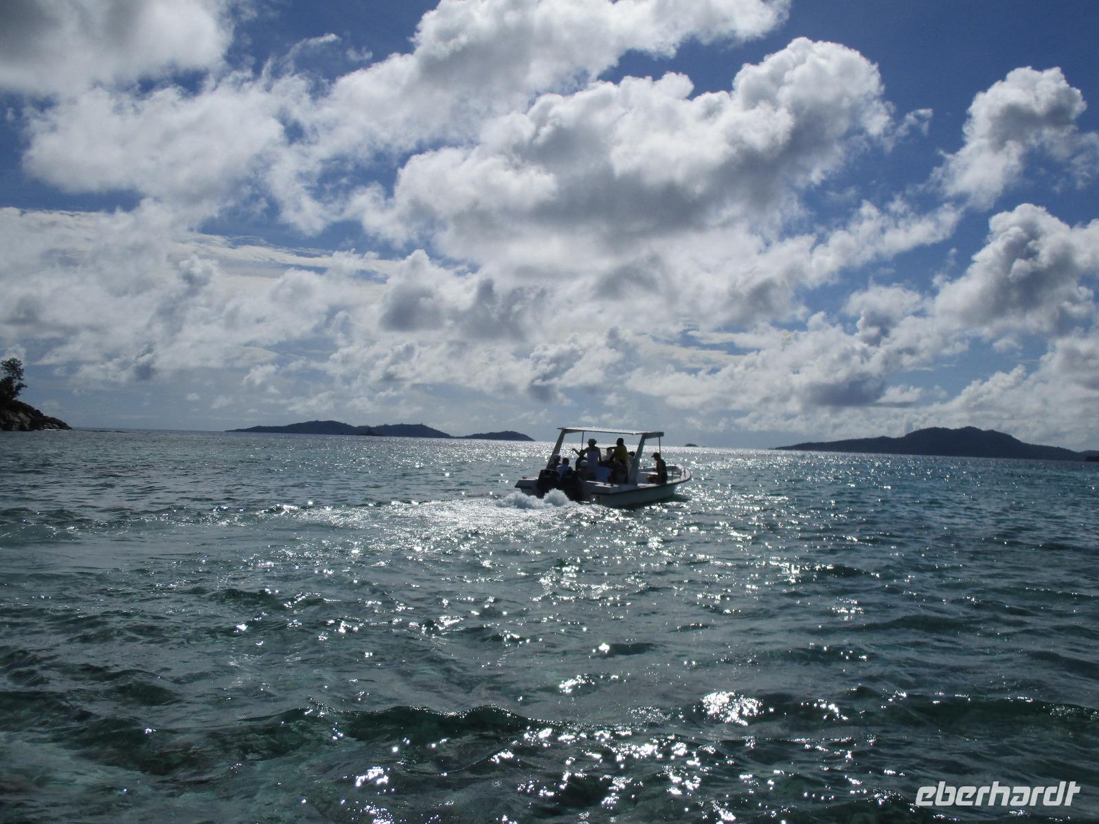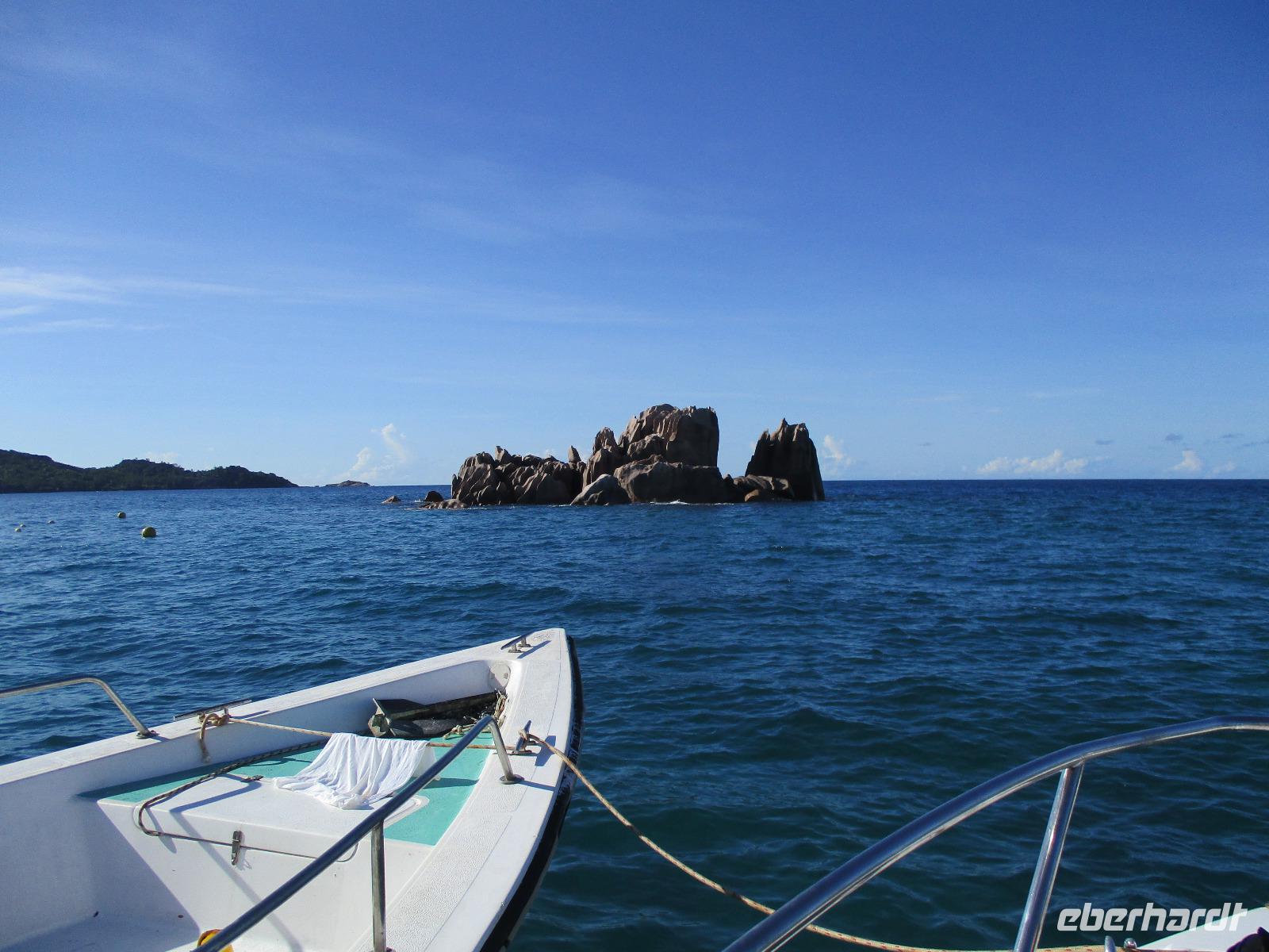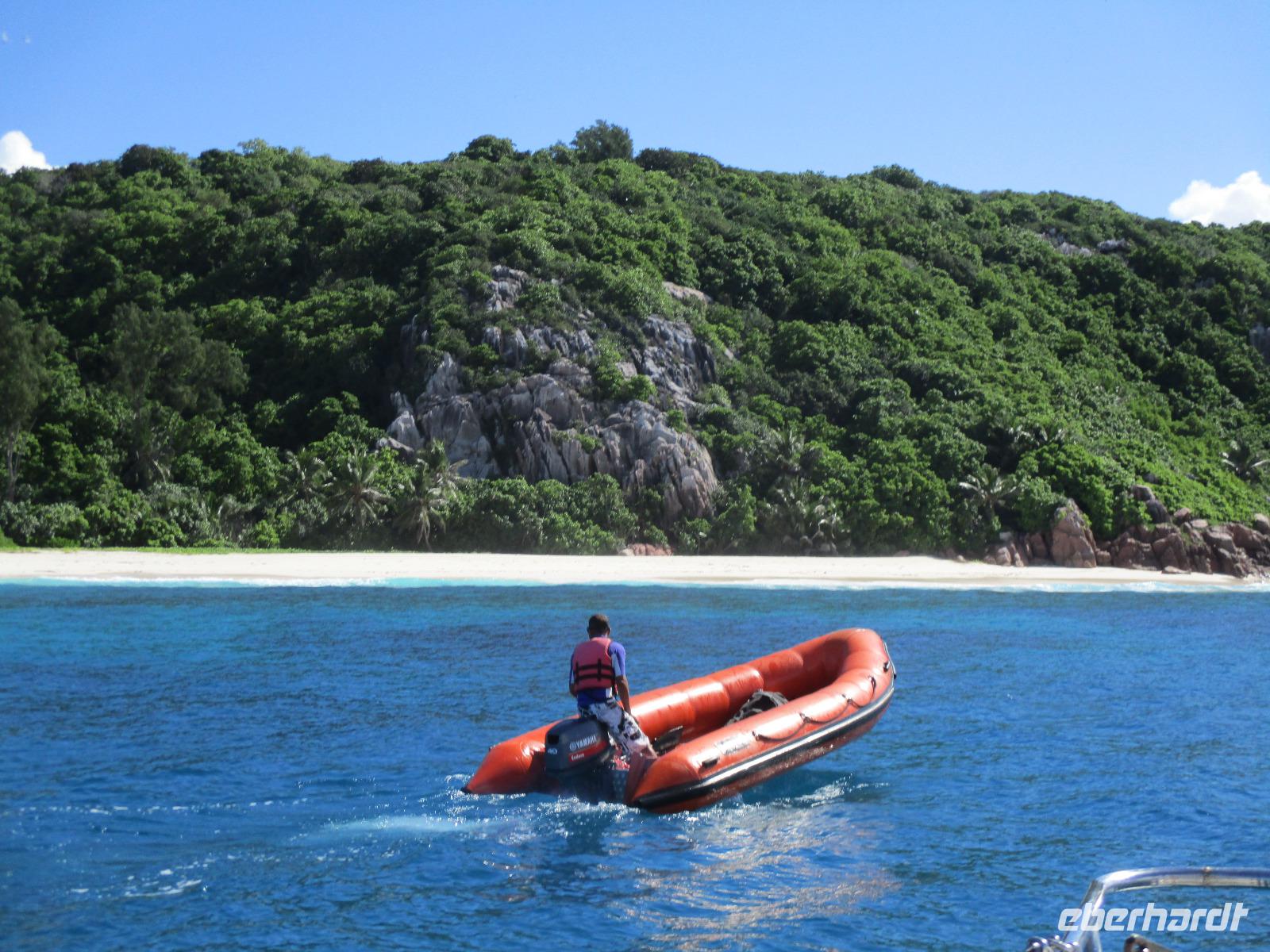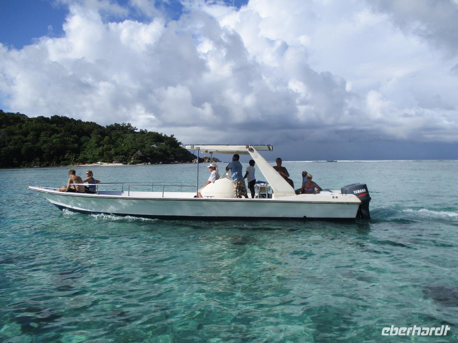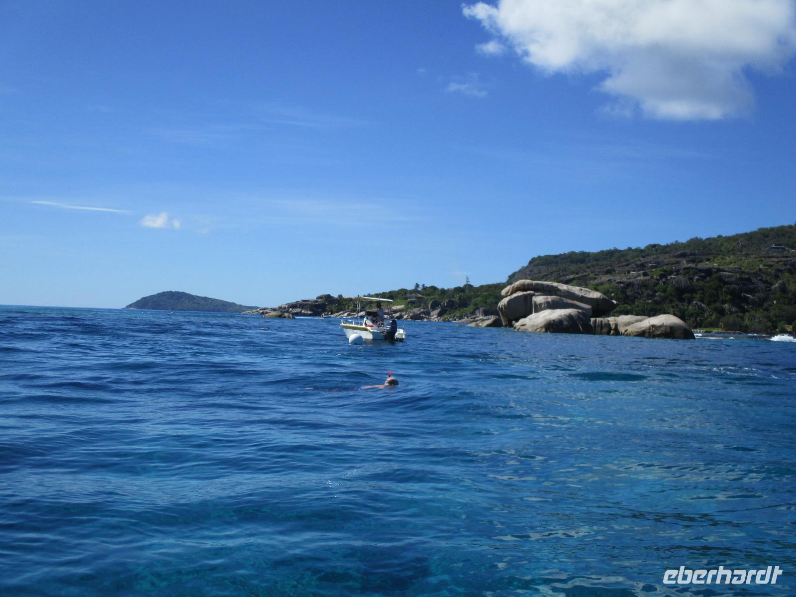 Gleich vom Hotel aus startete unser Ausflug auf drei Inseln, die heute unser Ziel waren. Unsere Skipper hatten noch einen Koch und das vorbereitete Mittagessen an Bord. Vorbei an kleinen Inseln mit weißen Stränden, grauen abgespülten Granitfelsen und Palmen fuhr eines unserer zwei Boote bis zur Insel Curieuse, wo wir später ein Grillessen am Strand bekommen sollten. Damit der Koch alles vorbereiten konnte, wurden er und der Proviant dort abgesetzt. Wir blieben im Boot, denn unser erstes Ziel dieses Tages war die Vogelinsel Cousin. Von einem der Ranger dort wurden wir über die Insel geführt. Da die nistenden Vögel hier keine Feinde wie Katzen, Hunde oder Ratten zu befürchten haben, denn die gibt es hier einfach nicht, legen sie ihre Eier irgendwo ab: in hohlen Baumresten von Palmen, in Mulden zu ebener Erde, auf bequem zu erreichenden Astvertiefungen. Dort werden die einzelnen Eier ausgebrütet und die putzigen kleinen Jungvögel sitzen dann dort, bewegen sich kein Stück, und werden gefüttert von den Eltern, bis sie schließlich flügge sind. In der Hauptsaison, die noch nicht begonnen hatte, leben mehrere Hunderttausend Vögel auf der Insel und sorgen so für eine ganze Menge tierischen Dünger, den Guano. Ganze Mauern sind hier aus hart gewordenen Guano-Brocken gebaut. Wir bestaunten nicht nur Vögel wie die Feenseeschwalbe, den Lesser Noddy oder den Weißschwanz-Tropikvogel, auch behäbigen Landschildkröten begegneten wir auf unserem Weg, die sich gern von uns am Kopf streicheln ließen. Nach unserem Rundgang, der durch einen heftigen Regenguss etwas durcheinander geraten war, bestiegen wir wieder unsere Boote und fuhren nun auf die Insel Curieuse, wo uns schon ein leckeres Grillmittagessen erwartete. Unser Koch vom Hotel hatte gute Arbeit geleistet und so genossen wir leckeren Fisch, Hähnchen, Reis und Salat im Freien. Als Nachtisch ließen wir uns Passionsfrüchte und Orangen schmecken. Auch die mitgebrachten eisgekühlten Getränke waren eine Wohltat. Nach dem Essen hatten wir noch Zeit, die Landschildkröten zu besuchen, die hier frei auf dem Rasen umherspazieren können. Es gibt sogar eine Art Kinderstation, in der der kleine Nachwuchs geschützt heranwachsen kann. Einige der erwachsenen Tiere waren so anhänglich, dass sie uns folgten wie Hunde, um noch die ein oder andere menschliche Streicheleinheit abzubekommen. Bevor wie Curieuse ganz verließen, machten wir noch einen Spaziergang über die Insel zu einem anderen Strand. Dort besichtigten wir das Doctors' House, eine ehemalige Krankenstation, die heute als Museum eingerichtet ist. Denn die Insel Curieuse diente mehrere Jahrzehnte als Quarantäne-Insel für Leprakranke. Ein englischer Arzt hat sich damals um die Erkrankten sehr bemüht und ihnen in ihrer misslichen Lage geholfen. Für ein kurzes erfrischendes Bad im Meer war auch noch Zeit. Nachdem wir Curieuse verlassen hatten, legten wir noch einen Stopp vor der kleinen Insel St. Pierre ein. Hier gab es Gelegenheit, an den Felsen der Insel zu schnorcheln. Einige Gäste unserer Gruppe nutzten diese Gelegenheit, die anderen ruhten sich im Boot aus und beobachteten die Schnorchler.