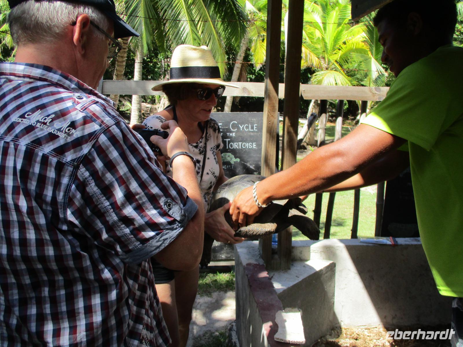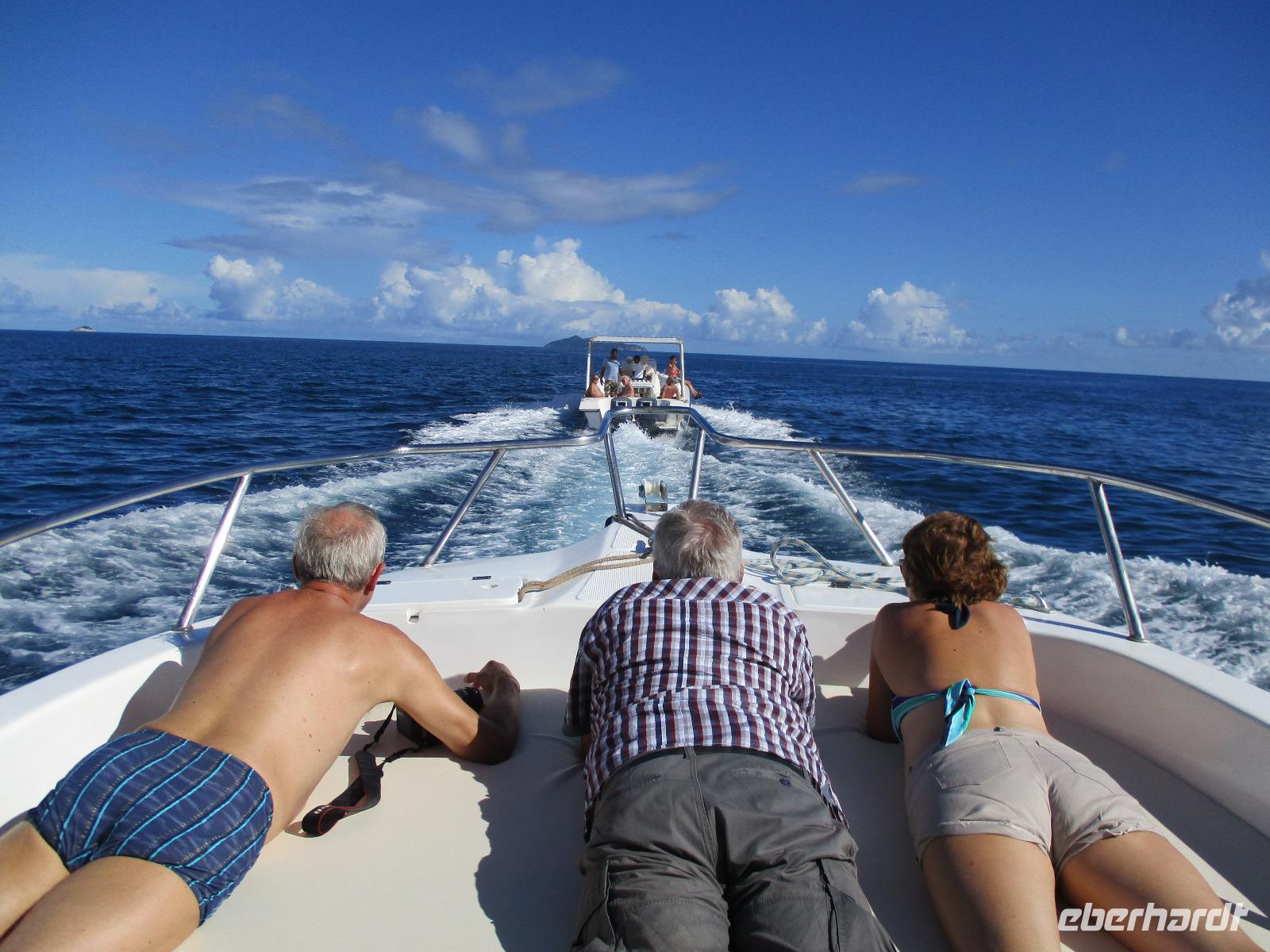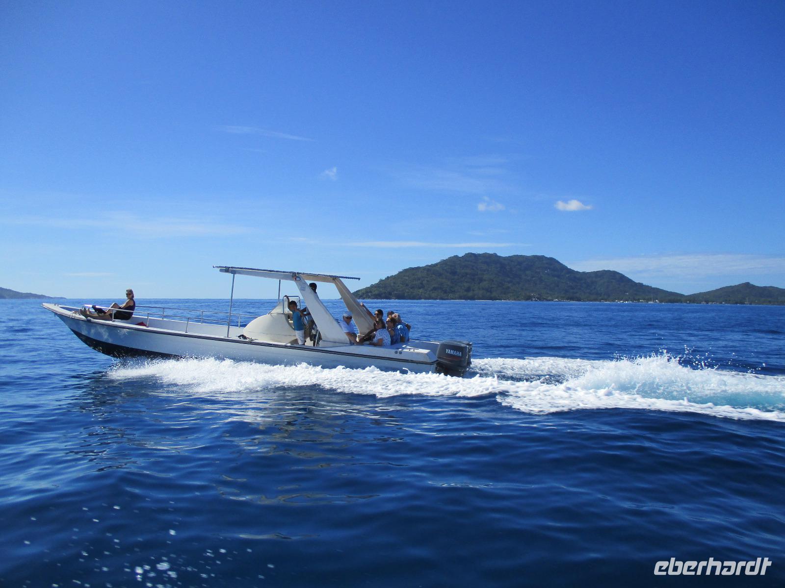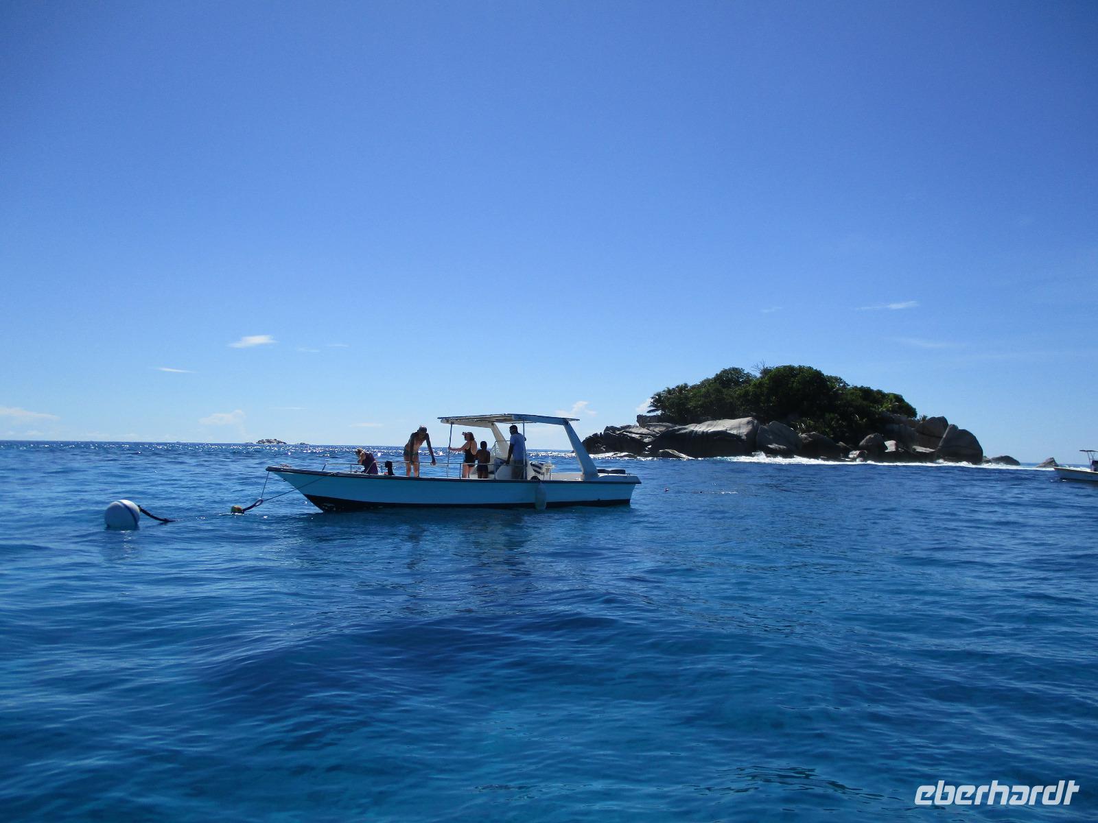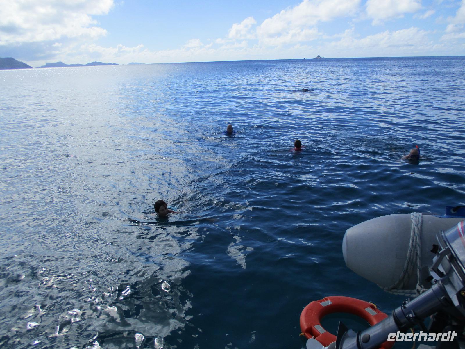 Gleich vom Hotel aus startete unser Ausflug auf drei Inseln, die heute unser Ziel waren. Unsere Skipper hatten noch einen Koch und das vorbereitete Mittagessen an Bord. Vorbei an kleinen Inseln mit weißen Stränden, grauen abgespülten Granitfelsen und Palmen fuhr eines unserer zwei Boote bis zur Insel Curieuse, wo wir später ein Grillessen am Strand bekommen sollten. Damit der Koch alles vorbereiten konnte, wurden er und der Proviant dort abgesetzt. Wir blieben im Boot, denn unser erstes Ziel dieses Tages war die Vogelinsel Cousin. Von einem der Ranger dort wurden wir über die Insel geführt. Da die nistenden Vögel hier keine Feinde wie Katzen, Hunde oder Ratten zu befürchten haben, denn die gibt es hier einfach nicht, legen sie ihre Eier irgendwo ab: in hohlen Baumresten von Palmen, in Mulden zu ebener Erde, auf bequem zu erreichenden Astvertiefungen. Dort werden die einzelnen Eier ausgebrütet und die putzigen kleinen Jungvögel sitzen dann dort, bewegen sich kein Stück, und werden gefüttert von den Eltern, bis sie schließlich flügge sind. In der Hauptsaison, die noch nicht begonnen hatte, leben mehrere Hunderttausend Vögel auf der Insel und sorgen so für eine ganze Menge tierischen Dünger, den Guano. Ganze Mauern sind hier aus hart gewordenen Guano-Brocken gebaut. Wir bestaunten nicht nur Vögel wie die Feenseeschwalbe, den Lesser Noddy oder den Weißschwanz-Tropikvogel, auch behäbigen Landschildkröten begegneten wir auf unserem Weg, die sich gern von uns am Kopf streicheln ließen. Nach unserem Rundgang, der durch einen heftigen Regenguss etwas durcheinander geraten war, bestiegen wir wieder unsere Boote und fuhren nun auf die Insel Curieuse, wo uns schon ein leckeres Grillmittagessen erwartete. Unser Koch vom Hotel hatte gute Arbeit geleistet und so genossen wir leckeren Fisch, Hähnchen, Reis und Salat im Freien. Als Nachtisch ließen wir uns Passionsfrüchte und Orangen schmecken. Auch die mitgebrachten eisgekühlten Getränke waren eine Wohltat. Nach dem Essen hatten wir noch Zeit, die Landschildkröten zu besuchen, die hier frei auf dem Rasen umherspazieren können. Es gibt sogar eine Art Kinderstation, in der der kleine Nachwuchs geschützt heranwachsen kann. Einige der erwachsenen Tiere waren so anhänglich, dass sie uns folgten wie Hunde, um noch die ein oder andere menschliche Streicheleinheit abzubekommen. Bevor wie Curieuse ganz verließen, machten wir noch einen Spaziergang über die Insel zu einem anderen Strand. Dort besichtigten wir das Doctors' House, eine ehemalige Krankenstation, die heute als Museum eingerichtet ist. Denn die Insel Curieuse diente mehrere Jahrzehnte als Quarantäne-Insel für Leprakranke. Ein englischer Arzt hat sich damals um die Erkrankten sehr bemüht und ihnen in ihrer misslichen Lage geholfen. Für ein kurzes erfrischendes Bad im Meer war auch noch Zeit. Nachdem wir Curieuse verlassen hatten, legten wir noch einen Stopp vor der kleinen Insel St. Pierre ein. Hier gab es Gelegenheit, an den Felsen der Insel zu schnorcheln. Einige Gäste unserer Gruppe nutzten diese Gelegenheit, die anderen ruhten sich im Boot aus und beobachteten die Schnorchler.