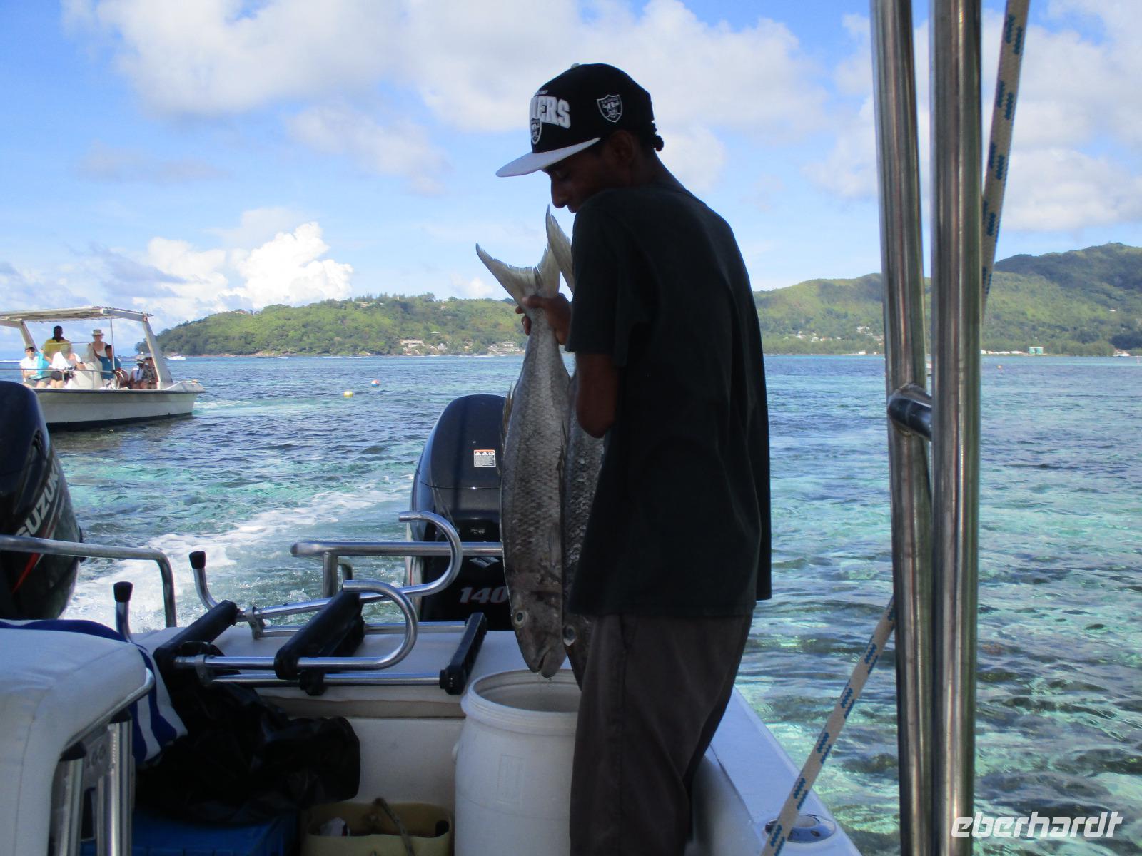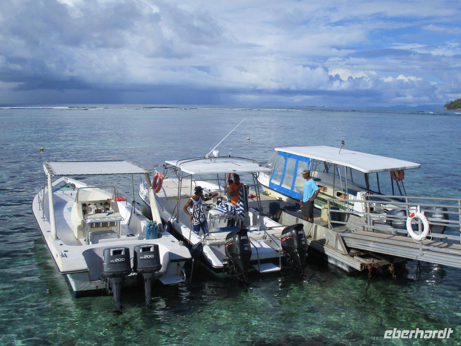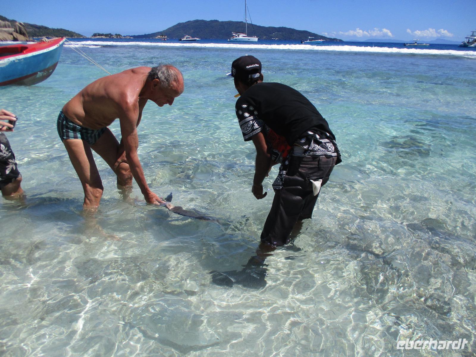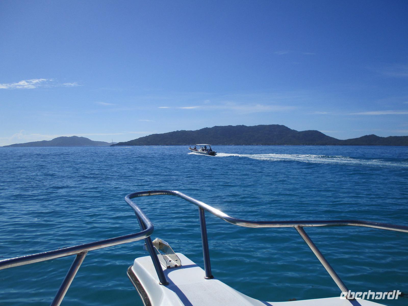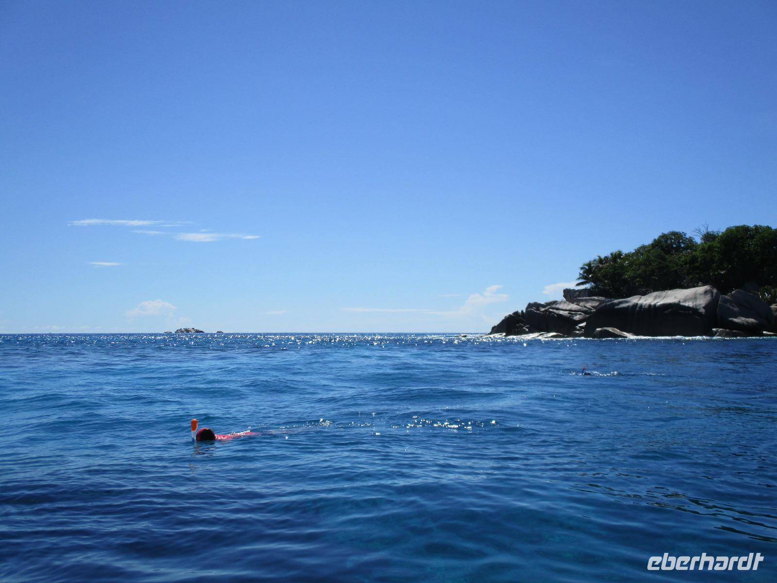 Gleich vom Hotel aus startete unser Ausflug auf drei Inseln, die heute unser Ziel waren. Unsere Skipper hatten noch einen Koch und das vorbereitete Mittagessen an Bord. Vorbei an kleinen Inseln mit weißen Stränden, grauen abgespülten Granitfelsen und Palmen fuhr eines unserer zwei Boote bis zur Insel Curieuse, wo wir später ein Grillessen am Strand bekommen sollten. Damit der Koch alles vorbereiten konnte, wurden er und der Proviant dort abgesetzt. Wir blieben im Boot, denn unser erstes Ziel dieses Tages war die Vogelinsel Cousin. Von einem der Ranger dort wurden wir über die Insel geführt. Da die nistenden Vögel hier keine Feinde wie Katzen, Hunde oder Ratten zu befürchten haben, denn die gibt es hier einfach nicht, legen sie ihre Eier irgendwo ab: in hohlen Baumresten von Palmen, in Mulden zu ebener Erde, auf bequem zu erreichenden Astvertiefungen. Dort werden die einzelnen Eier ausgebrütet und die putzigen kleinen Jungvögel sitzen dann dort, bewegen sich kein Stück, und werden gefüttert von den Eltern, bis sie schließlich flügge sind. In der Hauptsaison, die noch nicht begonnen hatte, leben mehrere Hunderttausend Vögel auf der Insel und sorgen so für eine ganze Menge tierischen Dünger, den Guano. Ganze Mauern sind hier aus hart gewordenen Guano-Brocken gebaut. Wir bestaunten nicht nur Vögel wie die Feenseeschwalbe, den Lesser Noddy oder den Weißschwanz-Tropikvogel, auch behäbigen Landschildkröten begegneten wir auf unserem Weg, die sich gern von uns am Kopf streicheln ließen. Nach unserem Rundgang, der durch einen heftigen Regenguss etwas durcheinander geraten war, bestiegen wir wieder unsere Boote und fuhren nun auf die Insel Curieuse, wo uns schon ein leckeres Grillmittagessen erwartete. Unser Koch vom Hotel hatte gute Arbeit geleistet und so genossen wir leckeren Fisch, Hähnchen, Reis und Salat im Freien. Als Nachtisch ließen wir uns Passionsfrüchte und Orangen schmecken. Auch die mitgebrachten eisgekühlten Getränke waren eine Wohltat. Nach dem Essen hatten wir noch Zeit, die Landschildkröten zu besuchen, die hier frei auf dem Rasen umherspazieren können. Es gibt sogar eine Art Kinderstation, in der der kleine Nachwuchs geschützt heranwachsen kann. Einige der erwachsenen Tiere waren so anhänglich, dass sie uns folgten wie Hunde, um noch die ein oder andere menschliche Streicheleinheit abzubekommen. Bevor wie Curieuse ganz verließen, machten wir noch einen Spaziergang über die Insel zu einem anderen Strand. Dort besichtigten wir das Doctors' House, eine ehemalige Krankenstation, die heute als Museum eingerichtet ist. Denn die Insel Curieuse diente mehrere Jahrzehnte als Quarantäne-Insel für Leprakranke. Ein englischer Arzt hat sich damals um die Erkrankten sehr bemüht und ihnen in ihrer misslichen Lage geholfen. Für ein kurzes erfrischendes Bad im Meer war auch noch Zeit. Nachdem wir Curieuse verlassen hatten, legten wir noch einen Stopp vor der kleinen Insel St. Pierre ein. Hier gab es Gelegenheit, an den Felsen der Insel zu schnorcheln. Einige Gäste unserer Gruppe nutzten diese Gelegenheit, die anderen ruhten sich im Boot aus und beobachteten die Schnorchler.