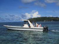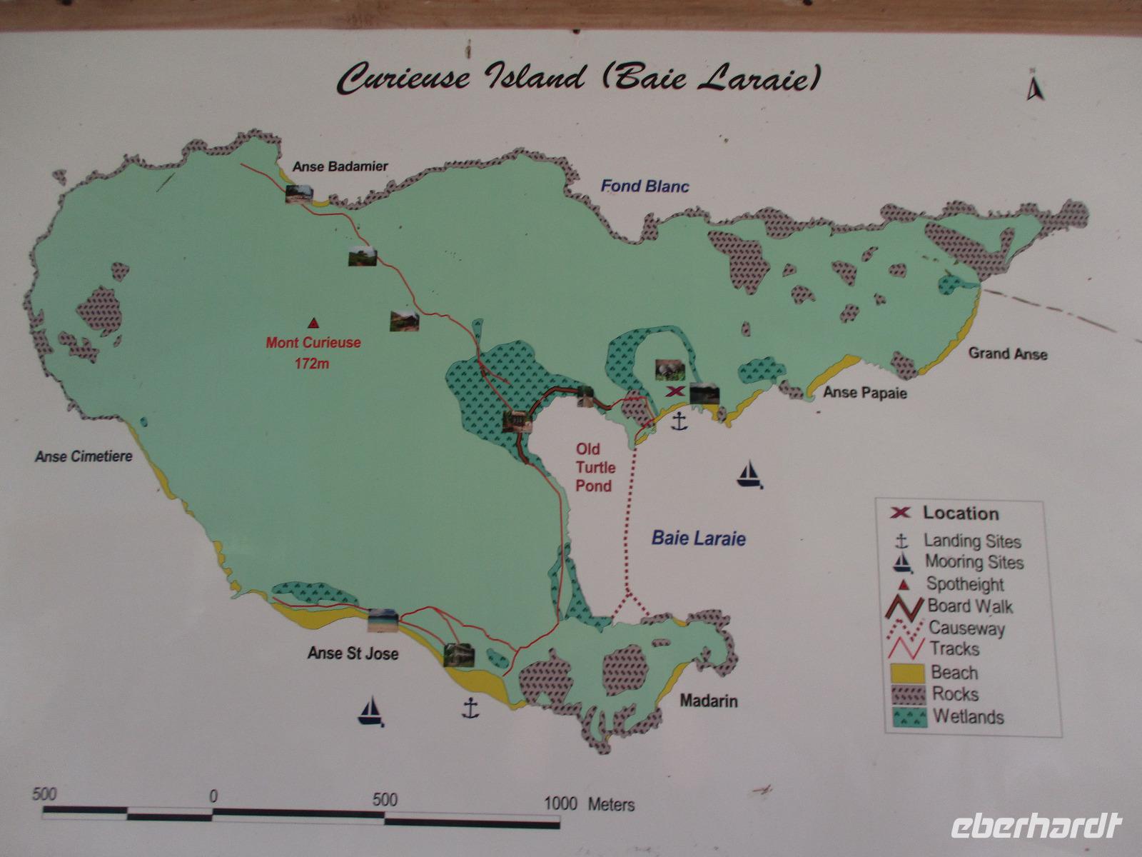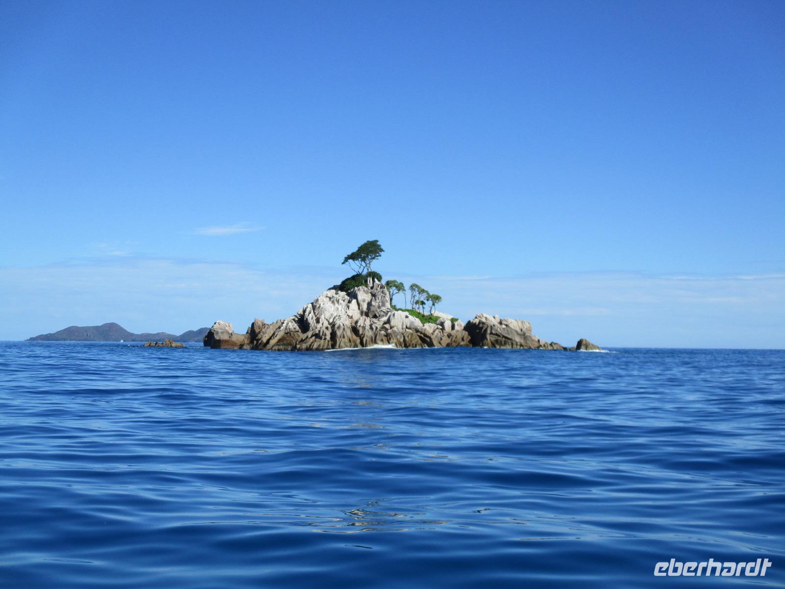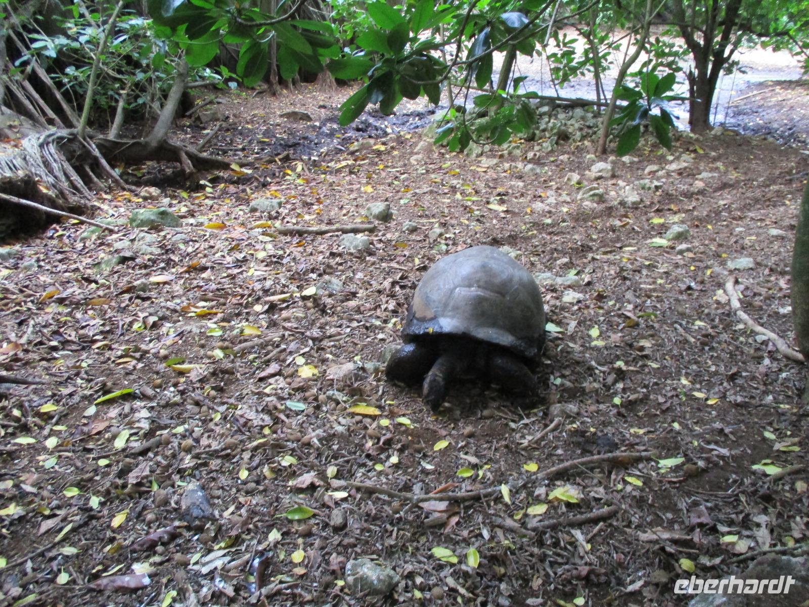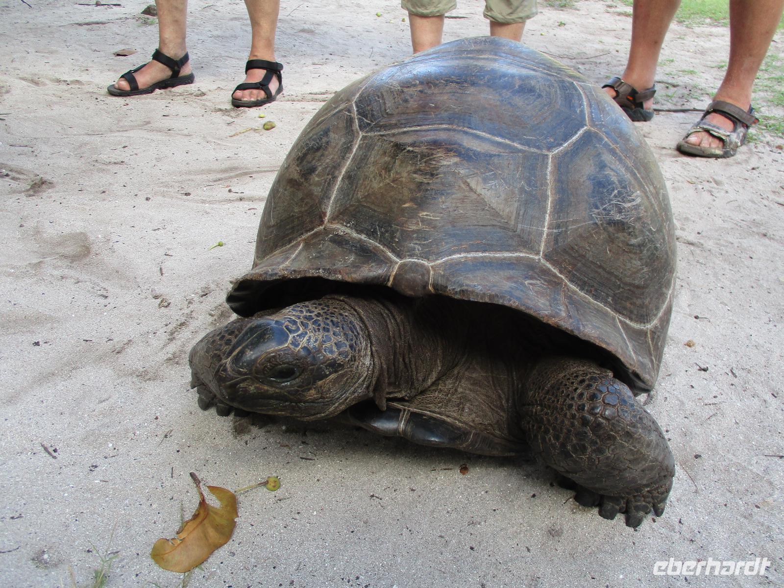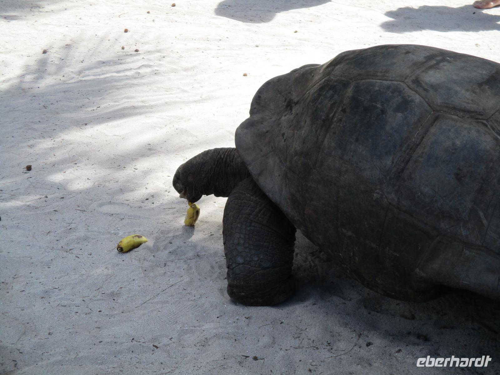 Gleich vom Hotel aus startete unser Ausflug auf drei Inseln, die heute unser Ziel waren. Unsere Skipper hatten noch einen Koch und das vorbereitete Mittagessen an Bord. Vorbei an kleinen Inseln mit weißen Stränden, grauen abgespülten Granitfelsen und Palmen fuhr eines unserer zwei Boote bis zur Insel Curieuse, wo wir später ein Grillessen am Strand bekommen sollten. Damit der Koch alles vorbereiten konnte, wurden er und der Proviant dort abgesetzt. Wir blieben im Boot, denn unser erstes Ziel dieses Tages war die Vogelinsel Cousin. Von einem der Ranger dort wurden wir über die Insel geführt. Da die nistenden Vögel hier keine Feinde wie Katzen, Hunde oder Ratten zu befürchten haben, denn die gibt es hier einfach nicht, legen sie ihre Eier irgendwo ab: in hohlen Baumresten von Palmen, in Mulden zu ebener Erde, auf bequem zu erreichenden Astvertiefungen. Dort werden die einzelnen Eier ausgebrütet und die putzigen kleinen Jungvögel sitzen dann dort, bewegen sich kein Stück, und werden gefüttert von den Eltern, bis sie schließlich flügge sind. In der Hauptsaison, die noch nicht begonnen hatte, leben mehrere Hunderttausend Vögel auf der Insel und sorgen so für eine ganze Menge tierischen Dünger, den Guano. Ganze Mauern sind hier aus hart gewordenen Guano-Brocken gebaut. Wir bestaunten nicht nur Vögel wie die Feenseeschwalbe, den Lesser Noddy oder den Weißschwanz-Tropikvogel, auch behäbigen Landschildkröten begegneten wir auf unserem Weg, die sich gern von uns am Kopf streicheln ließen. Nach unserem Rundgang, der durch einen heftigen Regenguss etwas durcheinander geraten war, bestiegen wir wieder unsere Boote und fuhren nun auf die Insel Curieuse, wo uns schon ein leckeres Grillmittagessen erwartete. Unser Koch vom Hotel hatte gute Arbeit geleistet und so genossen wir leckeren Fisch, Hähnchen, Reis und Salat im Freien. Als Nachtisch ließen wir uns Passionsfrüchte und Orangen schmecken. Auch die mitgebrachten eisgekühlten Getränke waren eine Wohltat. Nach dem Essen hatten wir noch Zeit, die Landschildkröten zu besuchen, die hier frei auf dem Rasen umherspazieren können. Es gibt sogar eine Art Kinderstation, in der der kleine Nachwuchs geschützt heranwachsen kann. Einige der erwachsenen Tiere waren so anhänglich, dass sie uns folgten wie Hunde, um noch die ein oder andere menschliche Streicheleinheit abzubekommen. Bevor wie Curieuse ganz verließen, machten wir noch einen Spaziergang über die Insel zu einem anderen Strand. Dort besichtigten wir das Doctors' House, eine ehemalige Krankenstation, die heute als Museum eingerichtet ist. Denn die Insel Curieuse diente mehrere Jahrzehnte als Quarantäne-Insel für Leprakranke. Ein englischer Arzt hat sich damals um die Erkrankten sehr bemüht und ihnen in ihrer misslichen Lage geholfen. Für ein kurzes erfrischendes Bad im Meer war auch noch Zeit. Nachdem wir Curieuse verlassen hatten, legten wir noch einen Stopp vor der kleinen Insel St. Pierre ein. Hier gab es Gelegenheit, an den Felsen der Insel zu schnorcheln. Einige Gäste unserer Gruppe nutzten diese Gelegenheit, die anderen ruhten sich im Boot aus und beobachteten die Schnorchler.