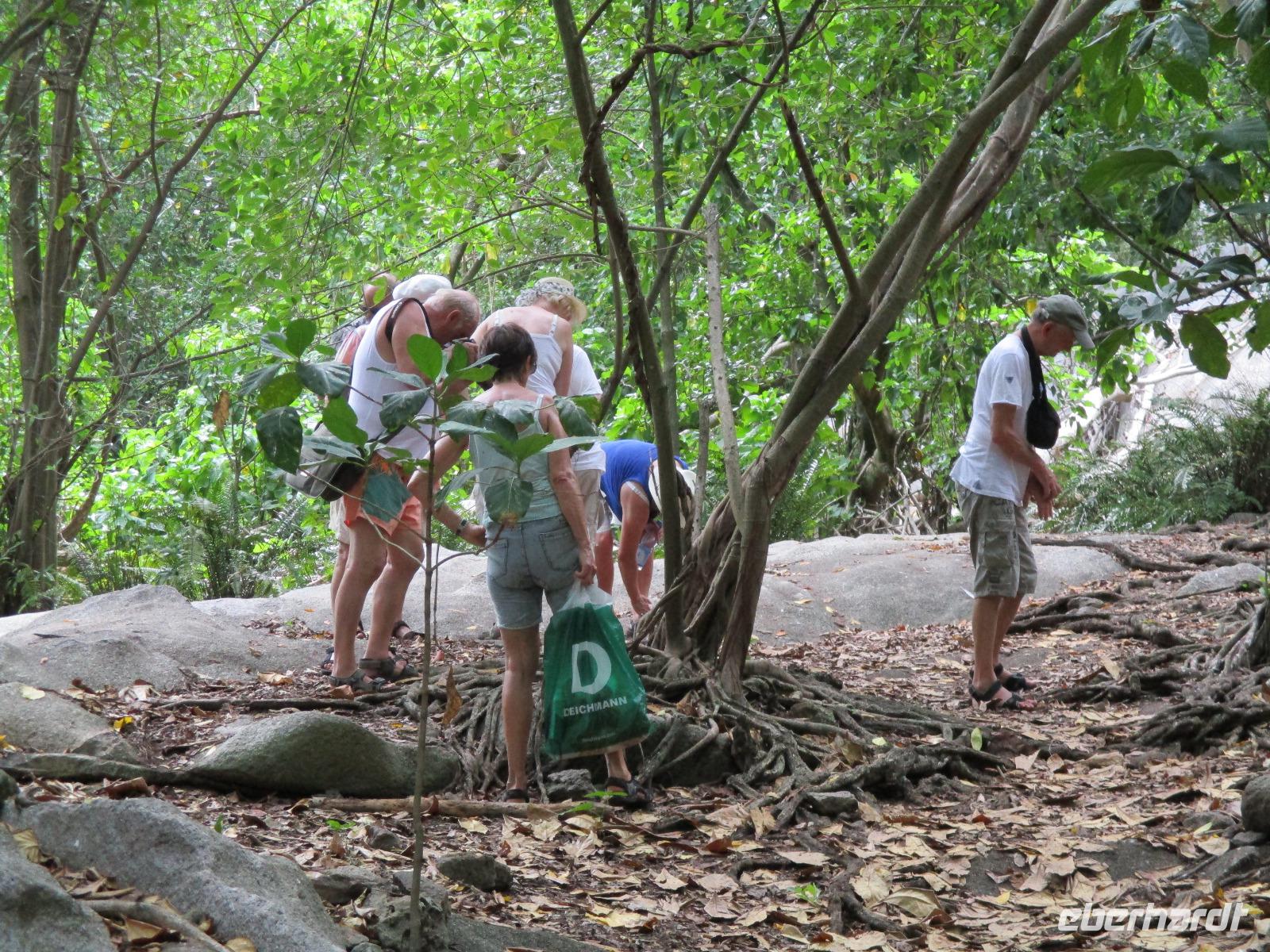 Nach dem Frühstück fuhren wir mit dem Hotelboot hinüber zum Praslin Jetty. Dort trafen wir Cyrill wieder, der uns schon erwartete. Wir stiegen in einen kleinen Bus und fuhren in Richtung Zentrum der Insel Praslin. Dort besuchten wir eine der größten Attraktionen hier: das Vallée de Mai. Dabei handelt es sich um einen Urwald im Zentrum der Insel, der im Jahre 1983 auf die Weltkulturerbe-Liste der UNESCO gesetzt worden ist. Das Besondere hier sind fünf endemische Palmenarten, die es eben nur hier gibt. Darunter die berühmteste der Seychellen: die Coco de Mer. Die weiblichen Palmen bilden die größte Nuss der Welt, ihr Aussehen gleicht dem wohlgeformten Po einer Frau, auch die Blütenstände der männlichen Coco de Mer erinnern an durchaus menschliche männliche Körperteile. Cyrill führte uns durch den Park, der wie ein Urwald vieles zu entdecken hat. Wir fotografierten Geckos und verschiedene Vögel, er erklärte uns viel Neues über die Palmen und andere hier vorkommenden Pflanzen, wie Farne und Schraubenbäume. Nach einem interessanten Spaziergang durch das Vallée de Mai stiegen wir wieder in unseren Bus und fuhren in Richtung Nordwesten der Insel. Wieder wurde uns ein creolisches Mittagessen angeboten, dieses Mal im Britannia Hotel. Die Mitarbeiter dort präsentierten uns stolz die von Ihnen zubereiteten Köstlichkeiten. Weil es uns so gut geschmeckt hatte, baten wir um ein Foto mit ihnen und so entstand eine schöne Erinnerung an dieses Mittagessen. Im Souvenirshop des Hotels wurden wieder Andenken und luftige Kleidung angeboten. Den Nachmittag verbrachten wir am berühmtesten Strand auf Praslin: Anse Lazio. Dieser wird in allen Reiseführern und Prospekten als der schönste der Insel angepriesen. Wir machten uns ein Bild davon und auch uns hat dieser breite weiße Sandstrand beeindruckt. Nach einer kurzen Zeit der Entspannung am Meer trafen wir uns an unserem Bus wieder. Auf dem Weg zum Jetty hielten wir noch an einem kleinen Supermarkt, wo wir uns mit Wasser, Keksen und Bier versorgen konnten. Am späten Nachmittag erreichten wir dann unser Hotel, pünktlich zur Teestunde, die wir natürlich auch genossen. Das gemeinsame Abendessen bildete den gemütlichen Ausklang eines interessanten und schönen Tages.