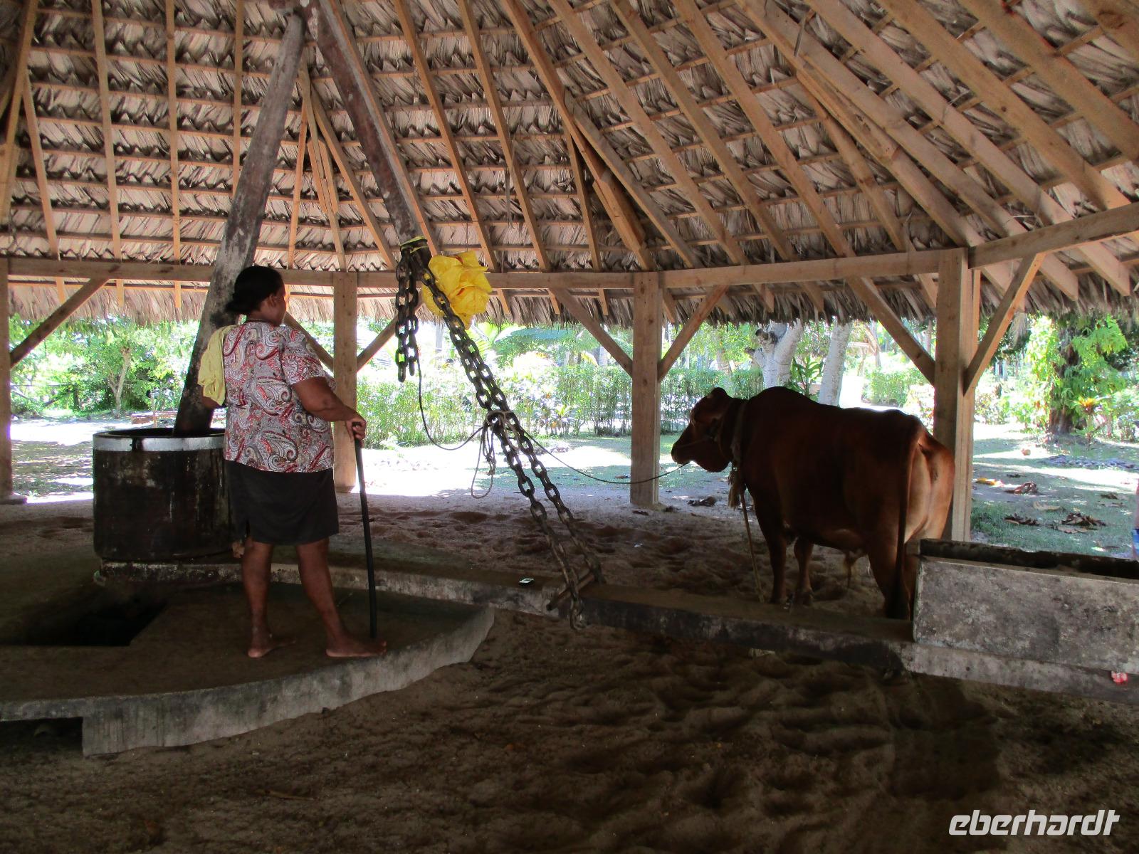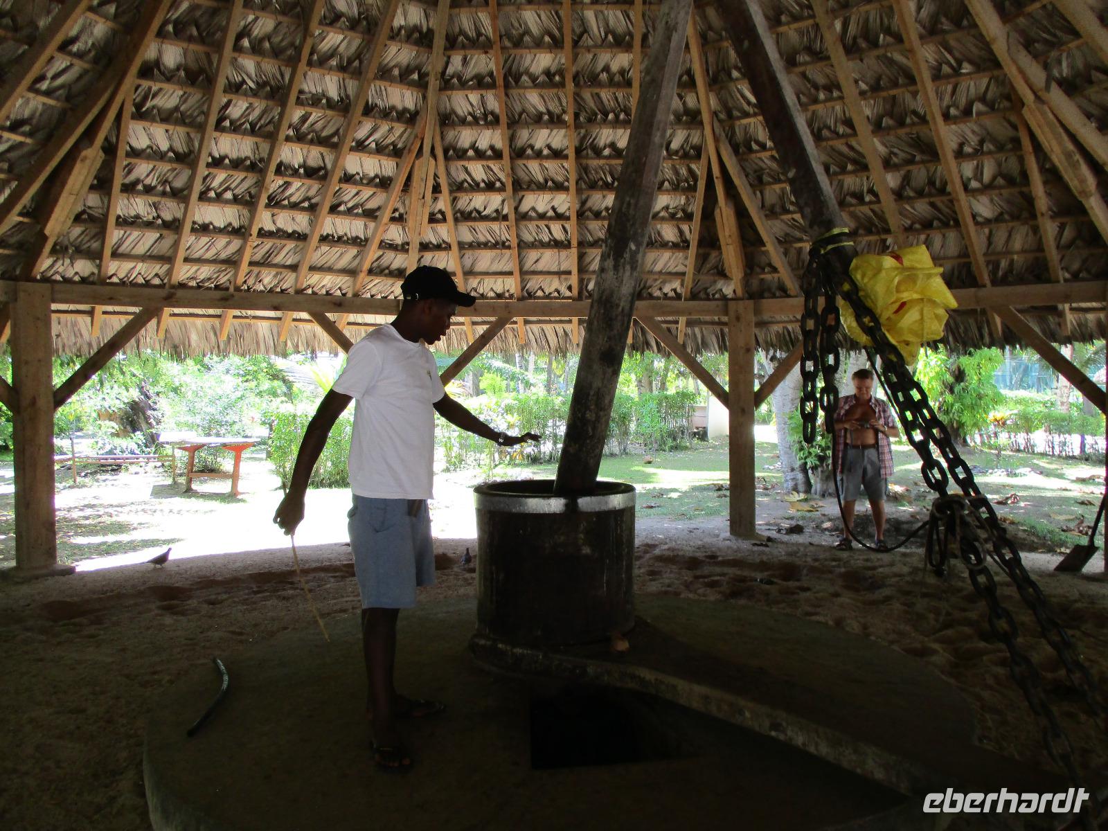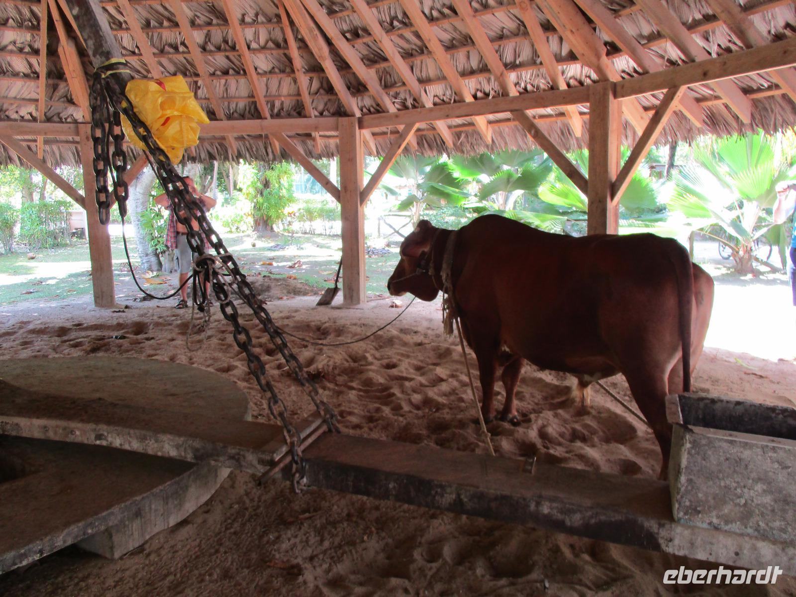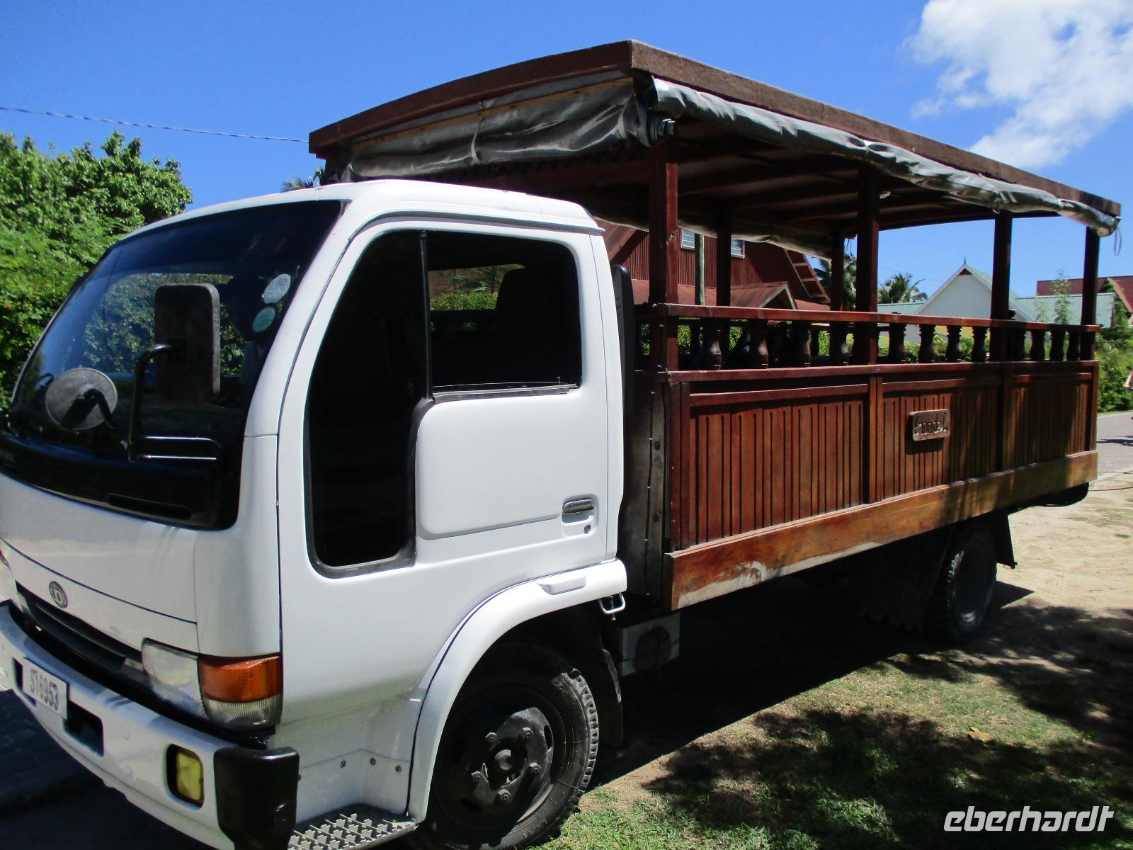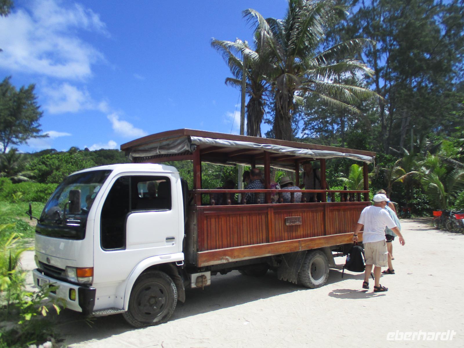 Zunächst fuhren wir mit dem Hotelboot wieder zum Praslin Jetty, um auf einen schönen privaten Katamaran zu klettern. Gemütlich setzten wir damit auf die drittgrößte Insel der Seychellen über, eine gemütliche Fahrt mit ausreichend Zeit und Gelegenheit für Fotos und zum Genießen. Auf La Digue angekommen, erwartete uns schon ein kleiner LKW, auf dessen Ladefläche hölzerne Sitzreihen aufgebaut waren, eingefasst von einem Geländer aus gedrechselten Holzteilen. So haben dereinst die berühmten Ochsenkarren auf der Insel ausgesehen, von denen es heute nur noch ganz wenige gibt. Dennoch sind ein paar Sachen anders auf La Dique als anderswo: es gibt keinen privaten Autoverkehr, lediglich Lieferfahrzeuge und Taxen sind erlaubt, und gibt es auf der Insel Tausende von Fahrrädern. Nicht nur Einheimische, auch Touristen, nutzen dieses Fortbewegungsmittel ausgiebig. Wir aber fuhren mit unserem kleinen LKW an allen vorbei und genossen die Ausblicke. Eine belebte Insel mit buntem Treiben. Es gibt eine kleine Kirche, eine Schule und auch eine historische Plantage, die wir besuchten. Wir sahen, wie Vanille angebaut wird, beobachteten einen Ochsen an einer Kokosmühle, der, wenn er im Kreis herum geführt wird, dem zuvor getrockneten Kokosnussfleisch durch einen drehenden Mahlstein das Kokosnussöl entlockt. Wir fotografierten uns vor malerischer Kulisse und spazierten am berühmten Strand Anse Source d'Argent entlang, der der schönste Strand auf La Digue sein soll. Die vom Wasser abgeschliffenen Granitfelsen am weißen Traumstrand vor türkisblauem Meer sprechen deutlich dafür. Unser Mittagessen hatten wir wieder in einem Grillrestaurant, dieses Mal direkt am Strand. Nach dem Essen gab es noch Zeit für Spaziergänge am Strand oder ein kurzes Wellenbad, einige unserer Gruppe ließen sich frische Kokosmilch direkt aus der aufgeschlagenen Nuss mittels Strohhalm schmecken. Bevor wir am Nachmittag wieder unseren Katamaran bestiegen, kauften wir noch ein paar Souvenirs im Zentrum der Insel, wo es auch Banken und eine Post gibt. Vor dem Banana-Strand ankerte unser Katamaran für eine Weile. Wir nutzten die Gelegenheit, um zu schwimmen oder zu schnorcheln. Einer der Matrosen reichte uns frisch geschnittenes Obst und Avocado. Nach einiger Zeit erreichten wir wieder den Praslin Jetty und setzten mit unserem Hotelboot über. Wir entspannten zur Teestunde und trafen uns später zum gemeinsamen Abendessen wieder.