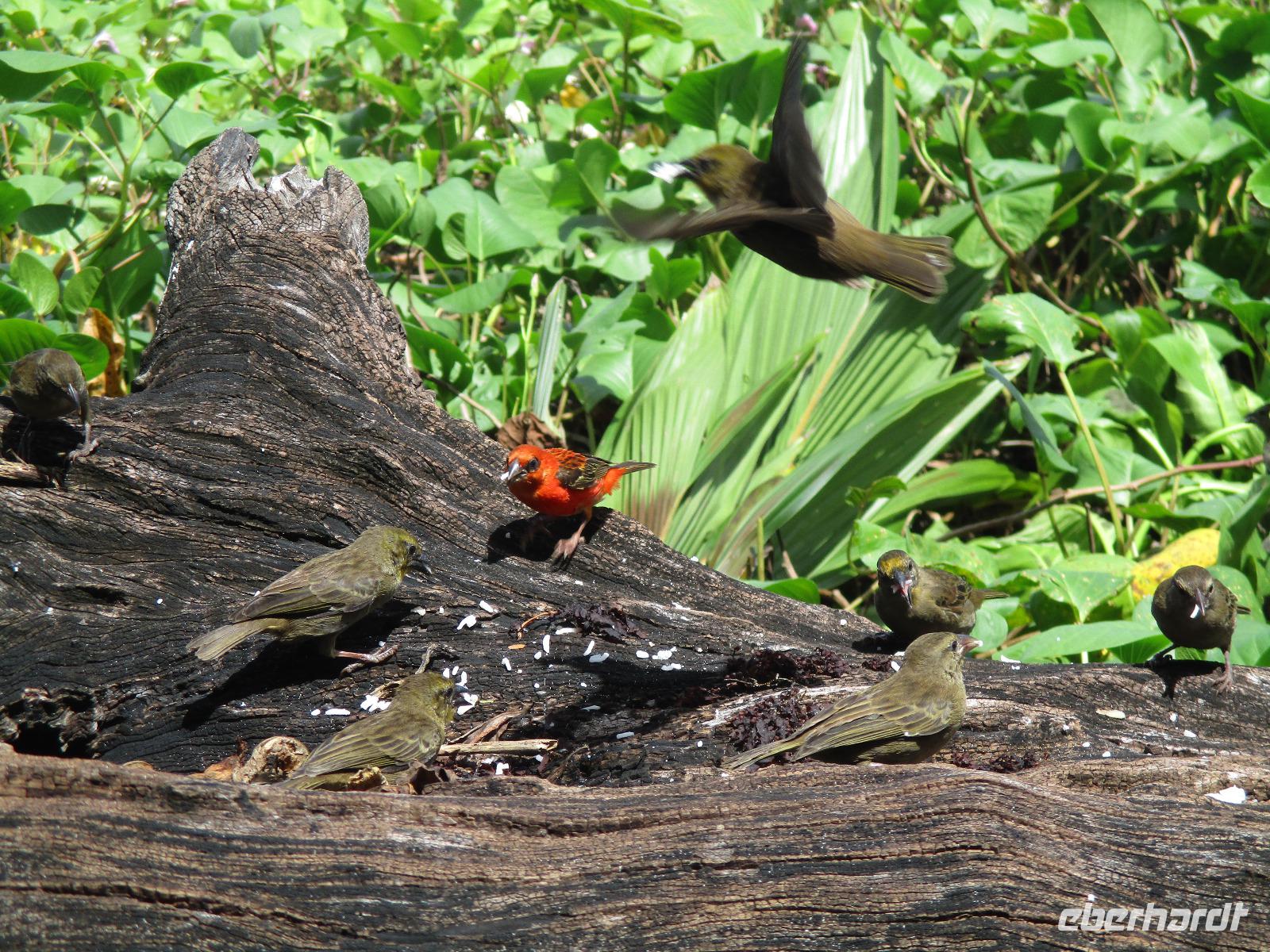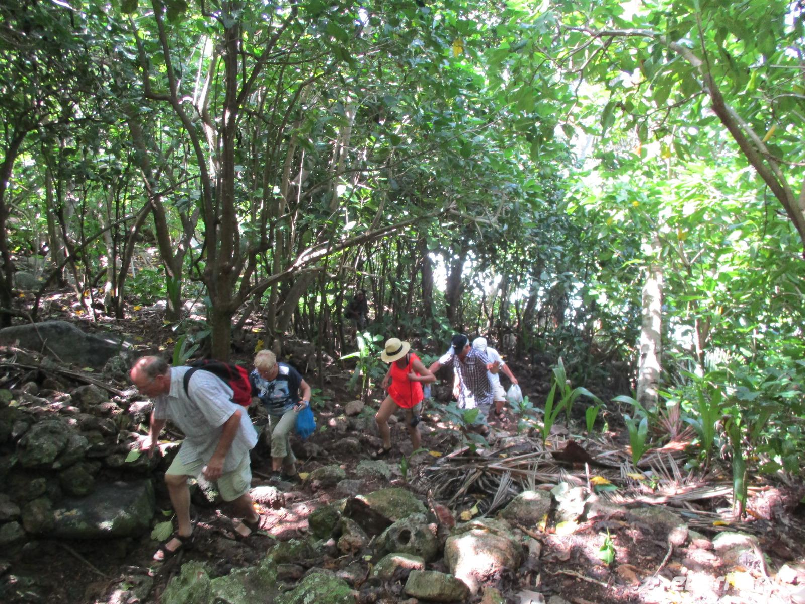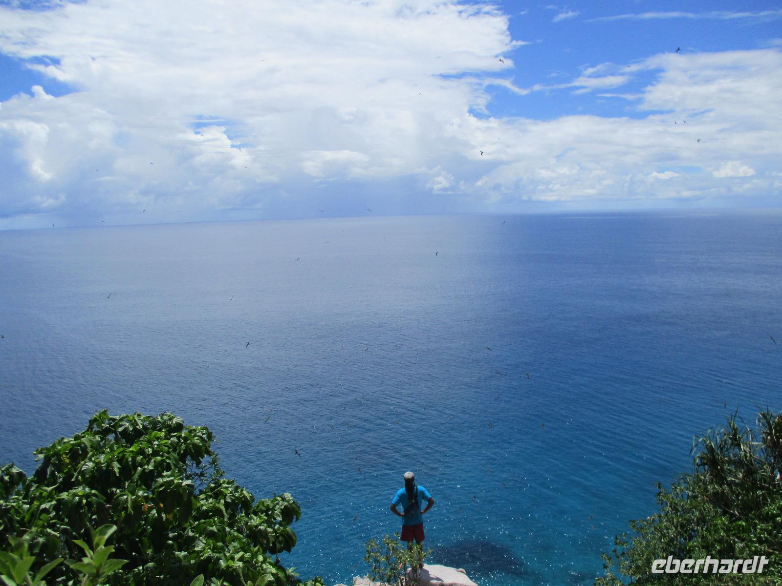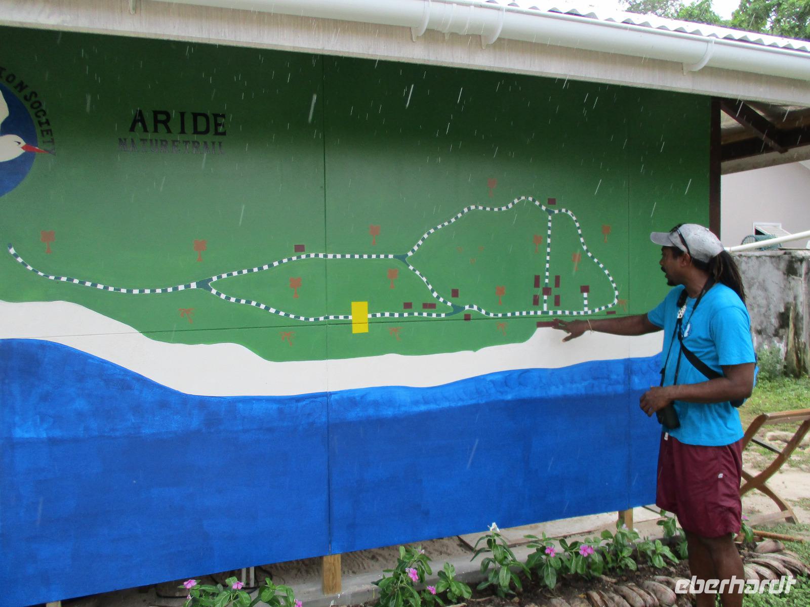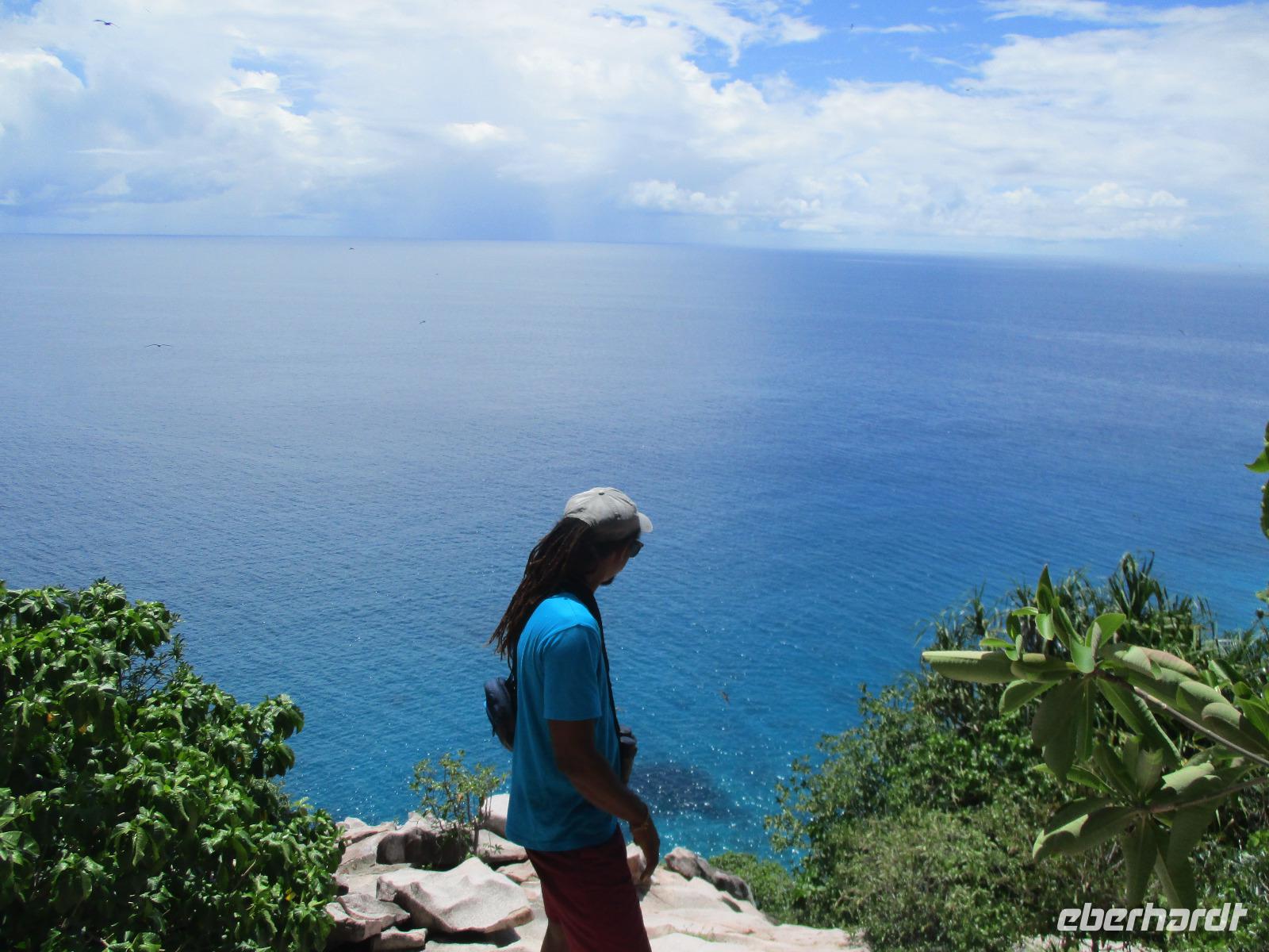 Mit Spannung erwarteten wir den Morgen. Das Wetter machte keinen schlechten Eindruck und so hofften wir, dass heute Aride möglich sein würde. Und wir wurden belohnt, der Ausflug konnte stattfinden. Alle Gäste hatten den fakultativen Ausflug nach Aride gebucht. Am Morgen fuhren wir mit den Hotelbooten los, auch der Koch war wieder mit von der Partie. Er hatte einen fangfrischen Red Snapper dabei, den er für uns zubereiten würde. Fast eine Stunde fuhren wir bis zur Insel Aride, denn sie ist die Insel, die auf unserer Route die am weitesten entfernte war. Das heißt aber nicht, dass es auf den Seychellen nicht noch weiter geht. Die einzelnen Inseln sind teilweise Hunderte von Kilometern voneinander entfernt. Wir erreichten die Insel und warteten wieder, bis wir, wie andere Bootpassagiere auch, vom Team der Insel mit einem motorisierten Schlauchboot an Land gebracht wurden. Dort angekommen, wurden die Besucher aufgeteilt in verschiedene Gruppen. Unsere Reisebegleiterin übersetzte für uns. Geführt wurden wir von Albert, der auf der Insel schon seit 15 Jahren als Wissenschaftler arbeitet. Zu seinen Aufgaben gehört neben der wissenschaftlichen und erhaltenden Arbeit auch das Führen von Touristen über die Insel. Wir sahen wieder verschiedene Vögel brüten, Einsiedlerkrabben, Geckos, Tausendfüßler auf den Wegen. Ein mühsamer Aufstieg zum Aussichtspunkt der Insel ließ den Schweiß in Strömen fließen, aber der Ausblick aufs Meer über einem Felsplateau, über dem Fregattvögel kreisten, belohnte uns für die Mühe. Auf dem Rückweg machten wir Rast an einem kleinen Strand, der einen grandiosen Blick auf eine Bucht freigab. Am liebsten wären wir dort geblieben. Aber unser Koch und Skipper Ravel erwarteten uns schon für das Grillmittagessen am Strand, ebenso der kleine Enkel von Ravel, der fast wie ein Großer die Boote mit steuerte. Also trennten wir uns schließlich vom schönen Ausblick und freuten uns auf ein weiteres köstliches Mahl unter Palmen. Und so war es dann auch. Sie hatten wieder gegrillt für uns, es gab Filet vom Red Snapper, Rindersteak und Reis, Salat und Ost zum Dessert. Weil wir ja auf einer Vogelinsel waren, bekamen auch sie ihren Anteil am Reis auf einem umgestürzten Baumstamm. Für uns natürlich eine tolle Gelegenheit für Nahaufnahmen. Nach dem Essen genossen wir noch etwas die Ruhe am Strand. Dann hieß es auch für uns, die Insel Aride zu verlassen. Wir wurden mit dem Schlauchboot zurück zum Boot gebracht und fuhren wieder Richtung Hotel. Zur gewohnten Teestunde trafen wir uns wieder und genossen später am Abend unser gemeinsames Essen.