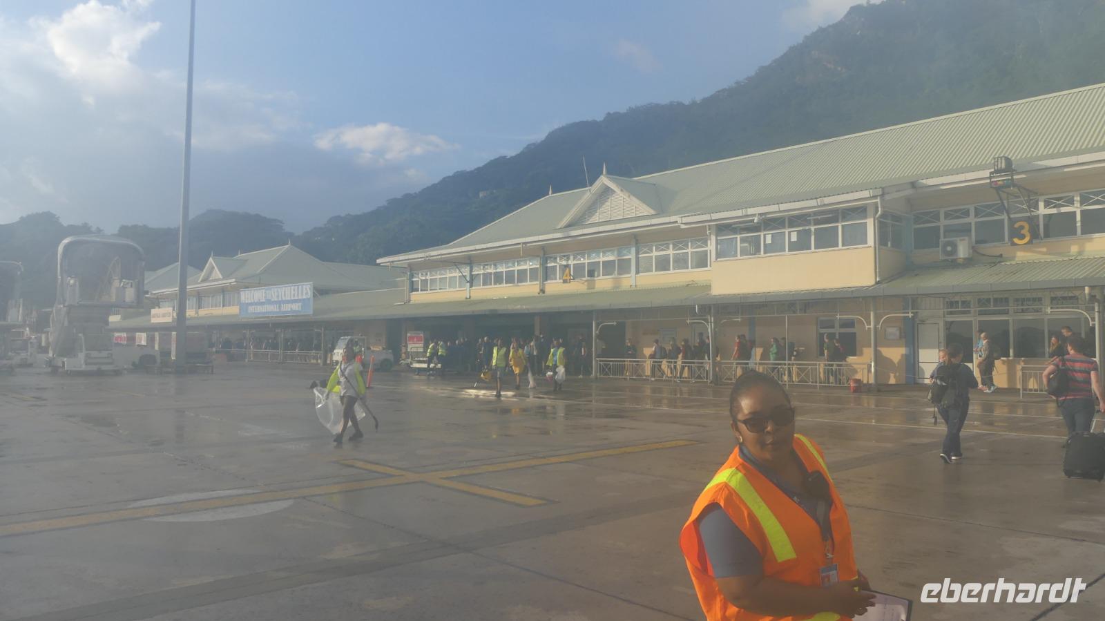 Nach 9 Stunden Flugzeit erreichen ihr am nächsten Morgen Mahé, die Hauptinsel der Seychellen. Der erste Eindruck ist das feuchtwarme, schweißtreibende Klima, mit rund 30 Grad. Da noch ein zweiter Flieger angekommen ist, herrscht am Flughafen Hochbetrieb und die Passkontrolle hat viel zu tun. Wir werden freundlich von Reiseleiter Cyril oder auch Herr „Schade" genannt, herzlich empfangen. Zum Kurs von 15,2 tauschen wir Seychellen-Rupien und die Koffer werden irgendwie im Fahrgastraum des Busses verstaut. Dann brechen wir auf nach Victoria, der kleinsten Hauptstadt unter den UN-Mitgliedsstaaten.