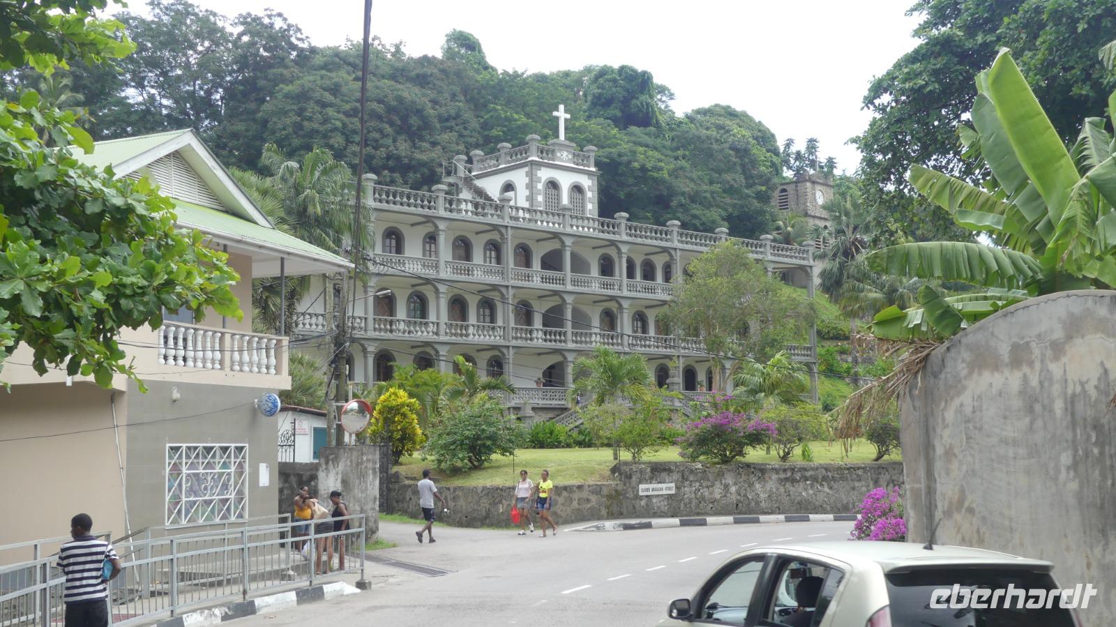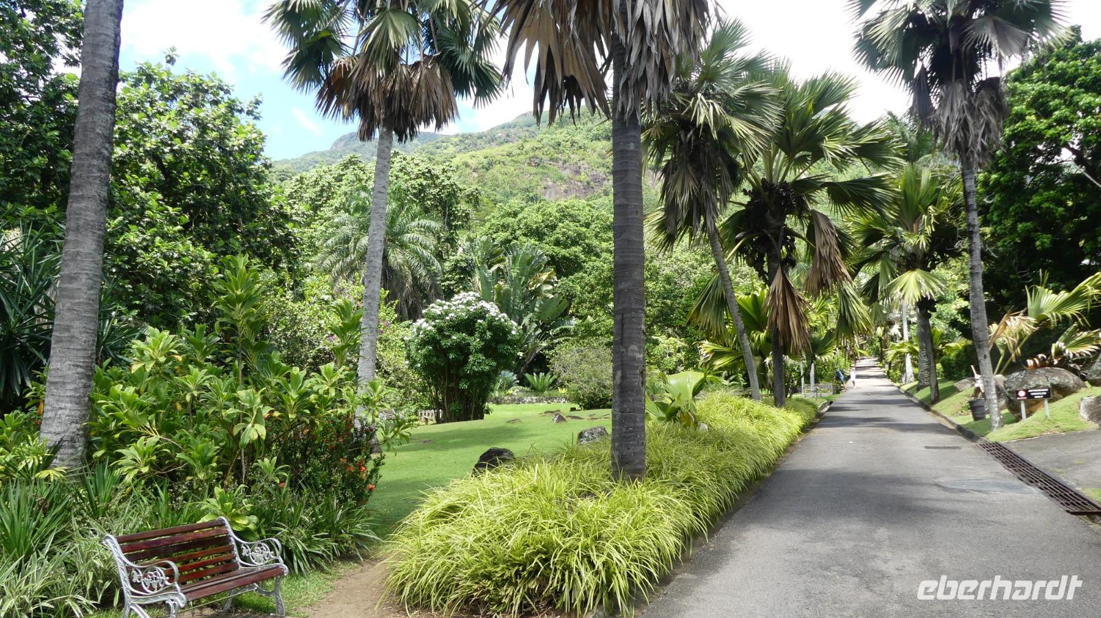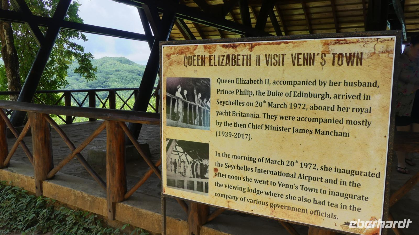 Unser nächstes Ziel ist Venn´s Town Mission in südwestlicher Richtung in den Bergen, das heißt so ca. 500 bis 600 m hoch gelegen. Der Ort ist eng mit der Geschichte der afrikanischen Sklaven verbunden, von denen einige hier lebten. An diesem Ort gibt es eine interessante Flora wie z. B. Zimt- , Drachenblut-, Sandel- und Mahagonibäume, Zitronengras und Gewürznelken. Nicht zu vergessen ist der Aussichtspunkt, den schon Queen Elizabeth II. besucht hat, als sie 1972 nach Mahé zur feierlichen Eröffnung des Flughafens kam (sie reiste allerdings mit dem Schiff).