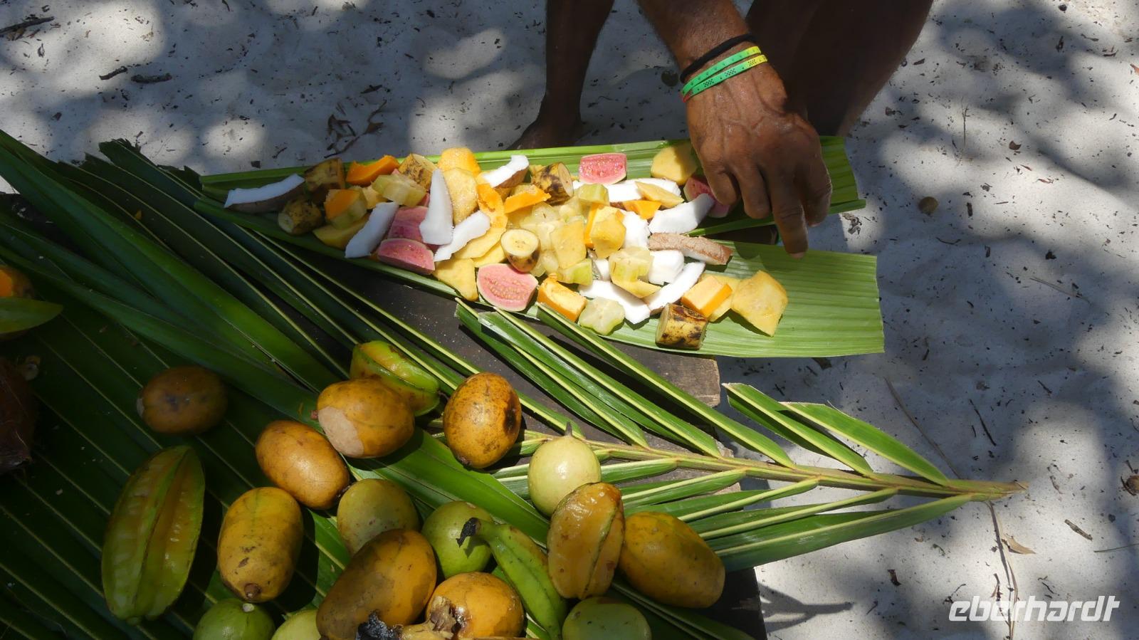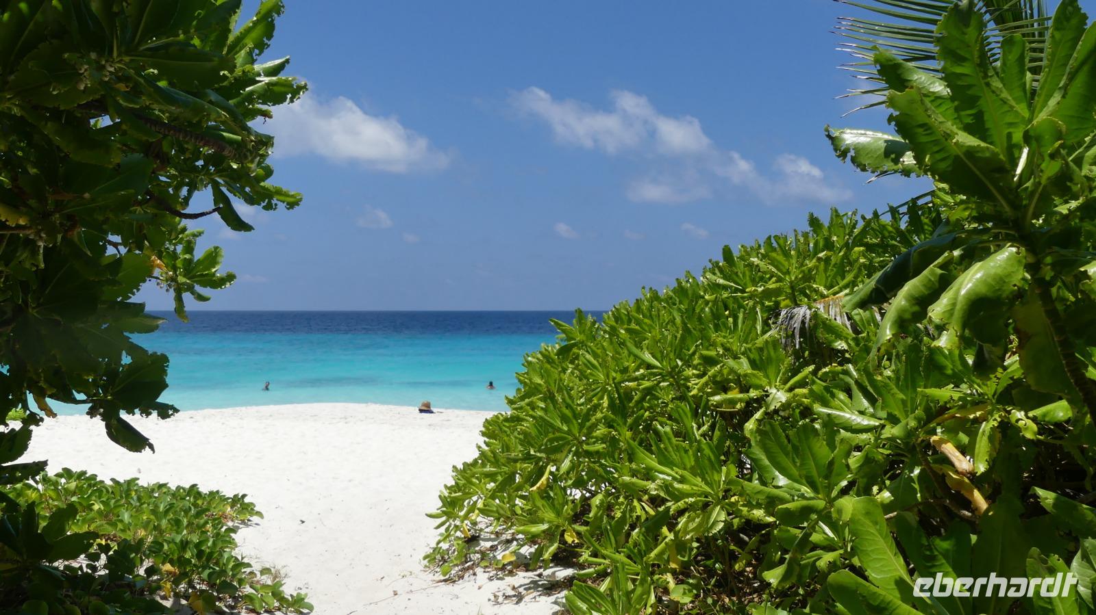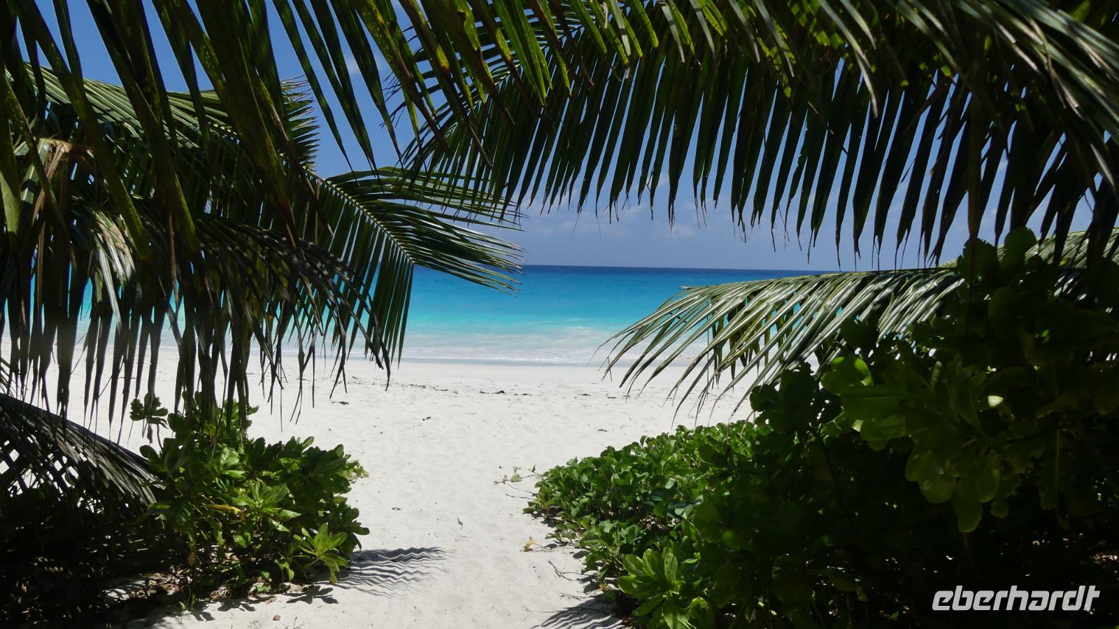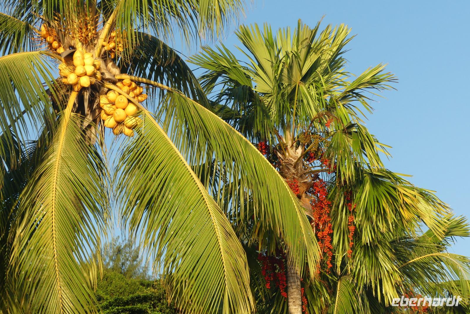Der heutige Tag steht ganz im Zeichen von Entspannung. Den Strand nach links oder rechts erkunden? Ich entscheide mich mit einigen Gästen dafür, nach rechts zu laufen, wo wir an einem schmalen langgezogenen Strand gut wandern können. Hier findet sich auch eine Kokospalme die voll dieses Idealbild erfüllt - tief zum Meer geneigt mit Palmenwedeln die das Wasser berühren.