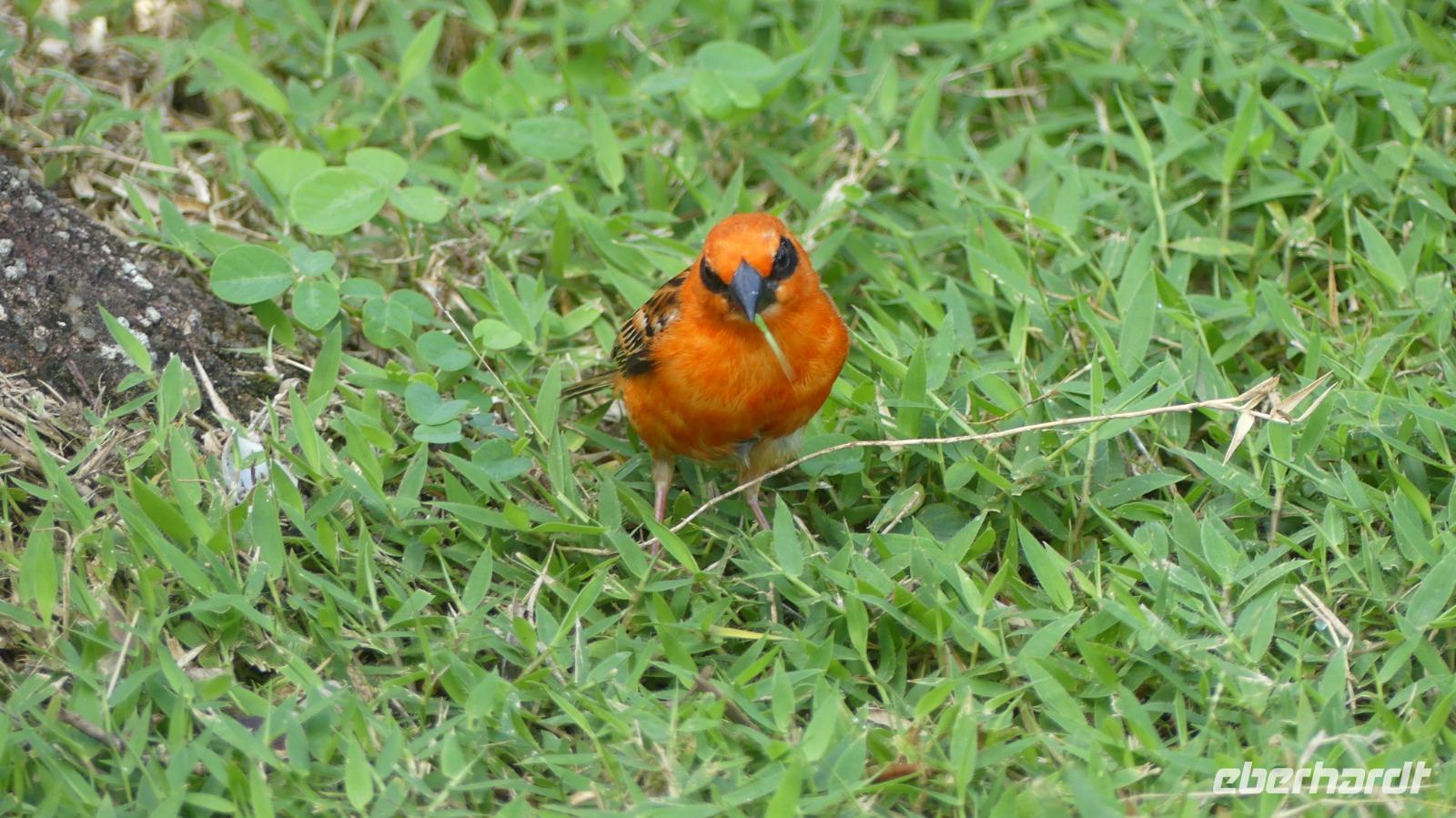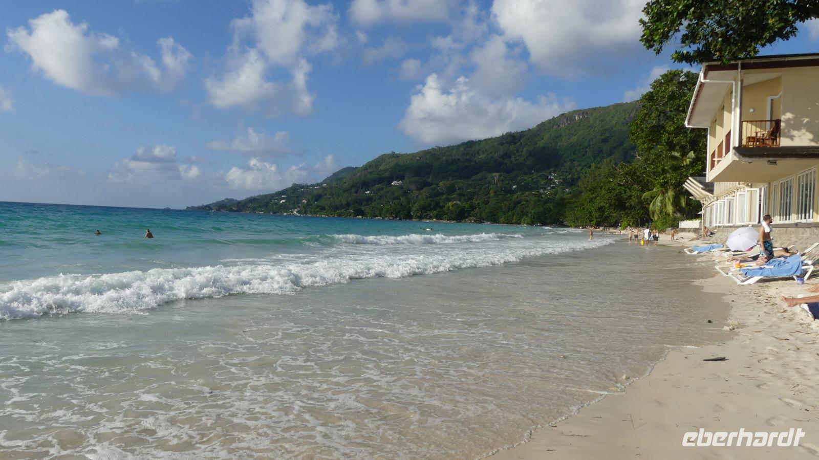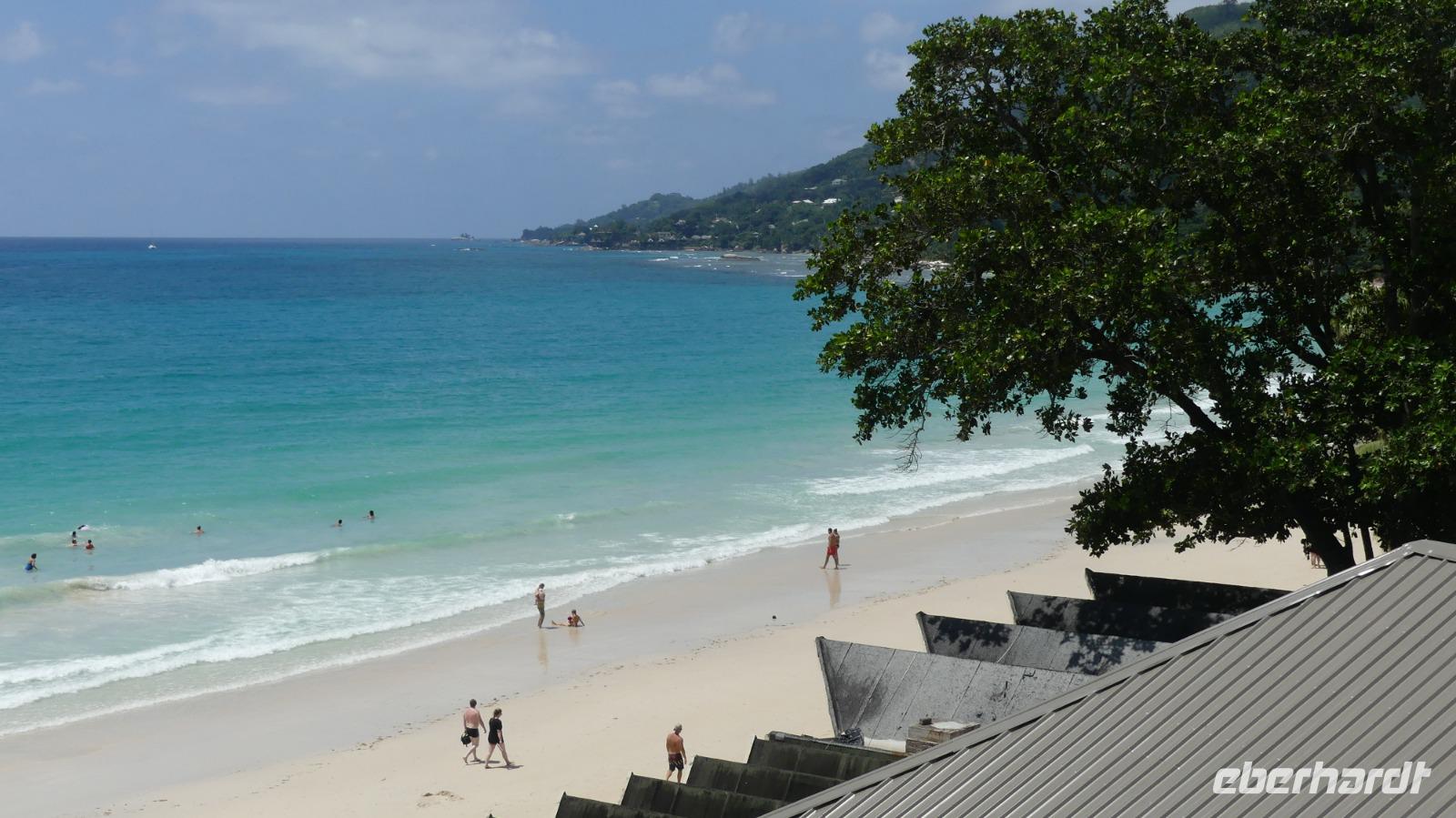 Der Hindutempel und die katholische Kathedrale sind weitere Stationen unseres Rundgangs. An der Kathedrale fällt uns das erste Mal dieser kleine orangefarbene Vogel auf, Madagaskar-Foddy genannt. Die Weiterfahrt zum Hotel auf der anderen Inselseite nutzen wir für eine Panoramafahrt entlang der Nordspitze. Unser Hotel Coral Strand liegt direkt am Strand von Beau Vallon. Strände auf den Seychellen sind öffentliche Strände. Was eine sehr gescheite Regel ist. So bekommen wir einen guten Eindruck, wie die Seychellois das Wochenende verbringen. Aus meiner Sicht sind es gelassene und lebensfrohe Menschen und die Stimmung vermittelt ein karibisches Flair.