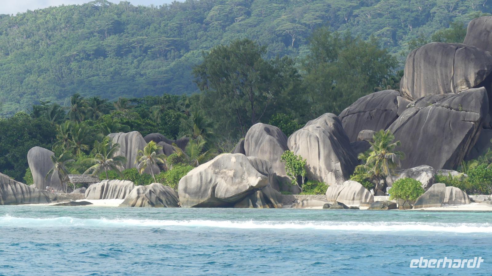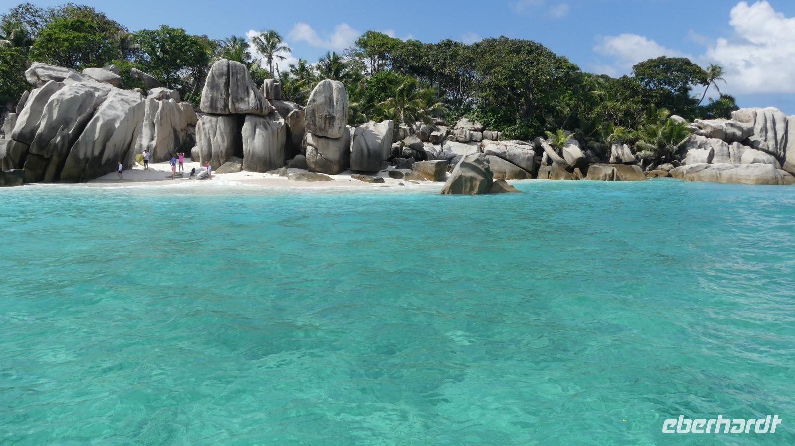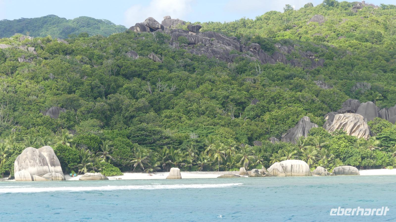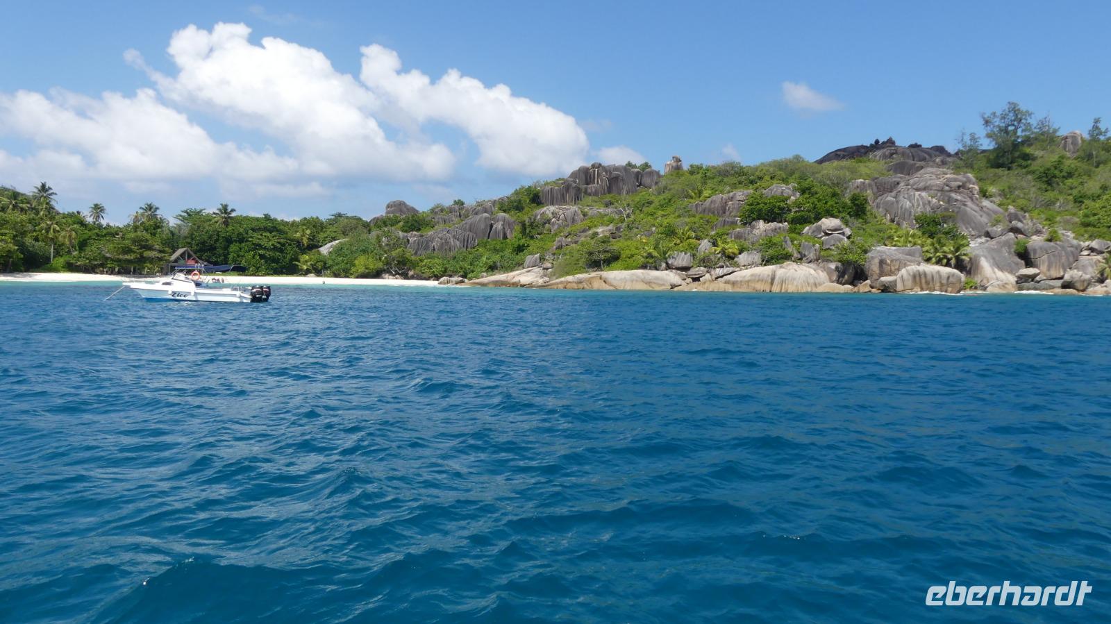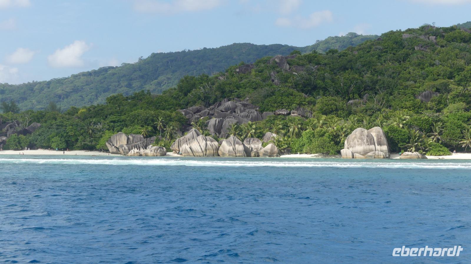 Nach dem Essen kehren wir zu unserem Katamaran zurück und nutzen diesen den ganzen Nachmittag. Zunächst umfahren wir damit La Digue und legen eine Schnorchel-/Schwimmpause vorm Traumstrand Anse Cocos ein. Wir passieren den Anse Source d'Argent und haben jetzt die Perspektive von der Seeseite auf den berühmten Strand.