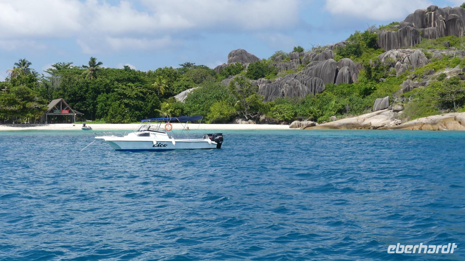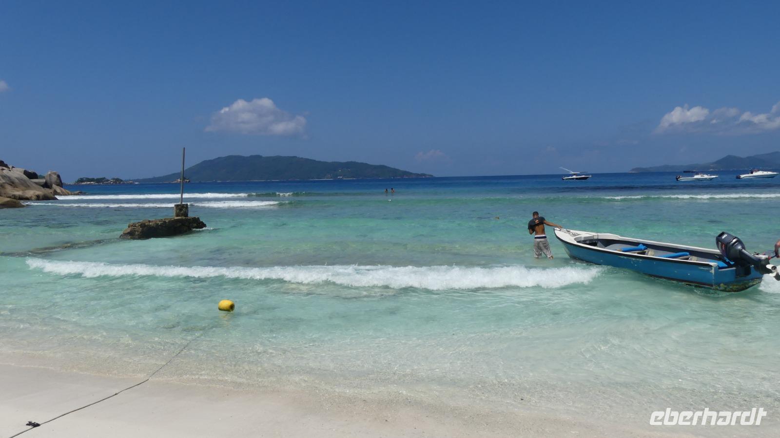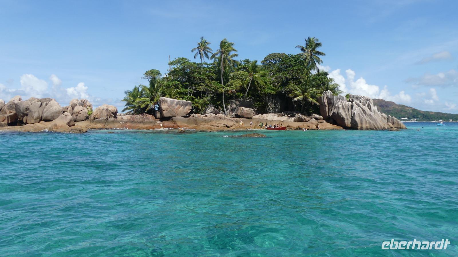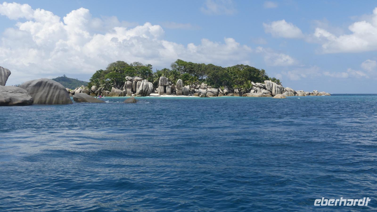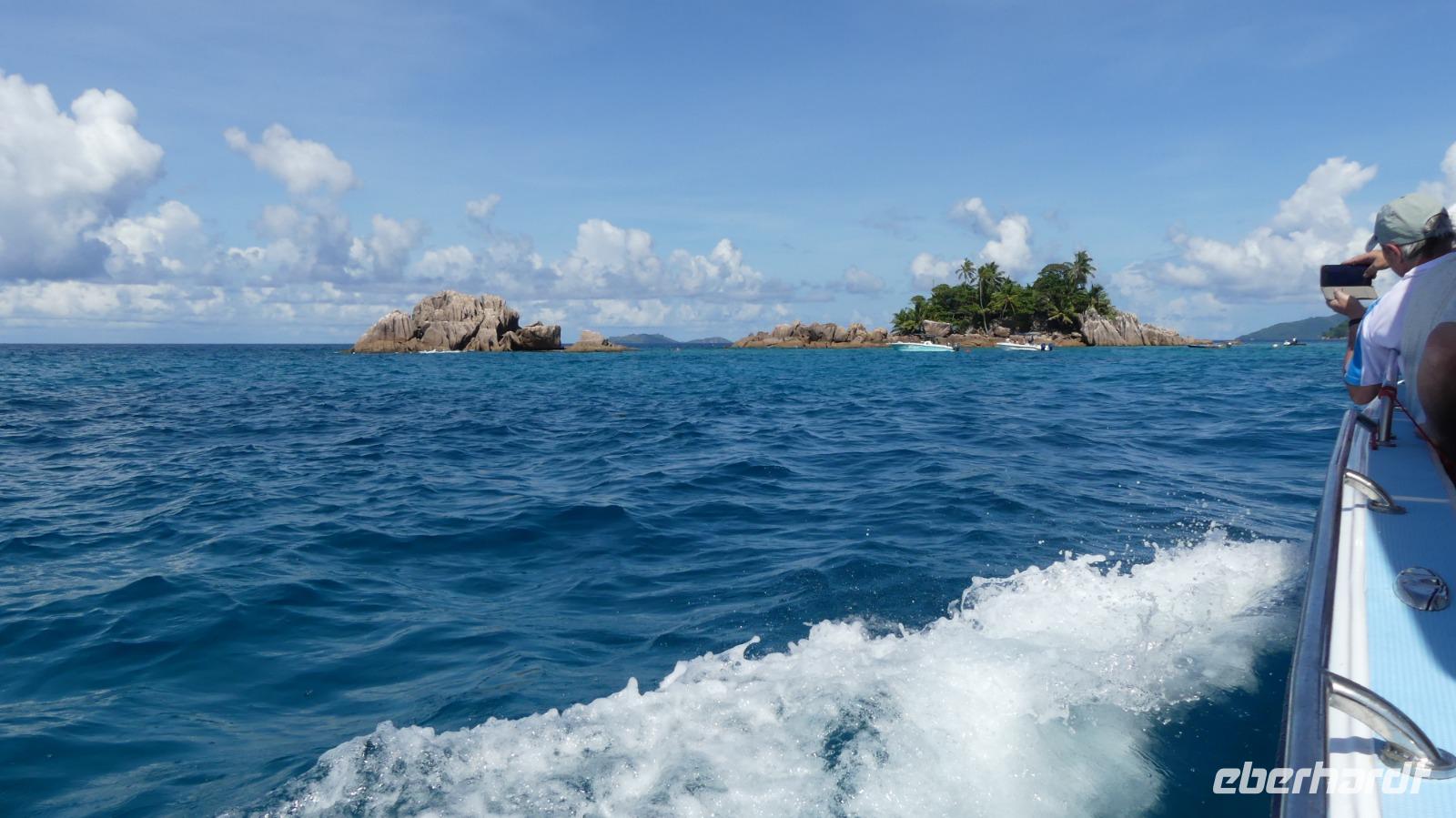 Nach dem Essen kehren wir zu unserem Katamaran zurück und nutzen diesen den ganzen Nachmittag. Zunächst umfahren wir damit La Digue und legen eine Schnorchel-/Schwimmpause vorm Traumstrand Anse Cocos ein. Wir passieren den Anse Source d'Argent und haben jetzt die Perspektive von der Seeseite auf den berühmten Strand.