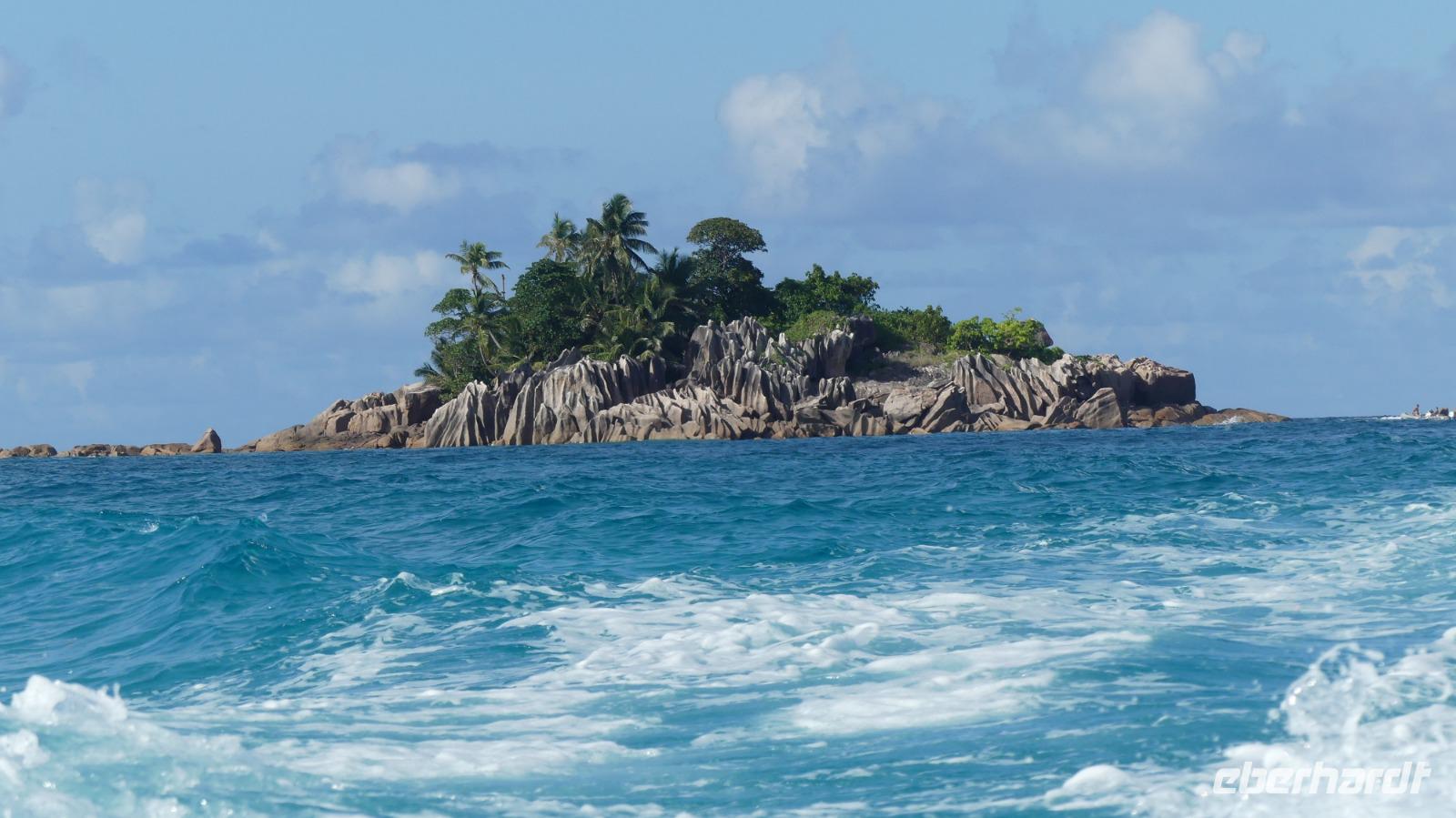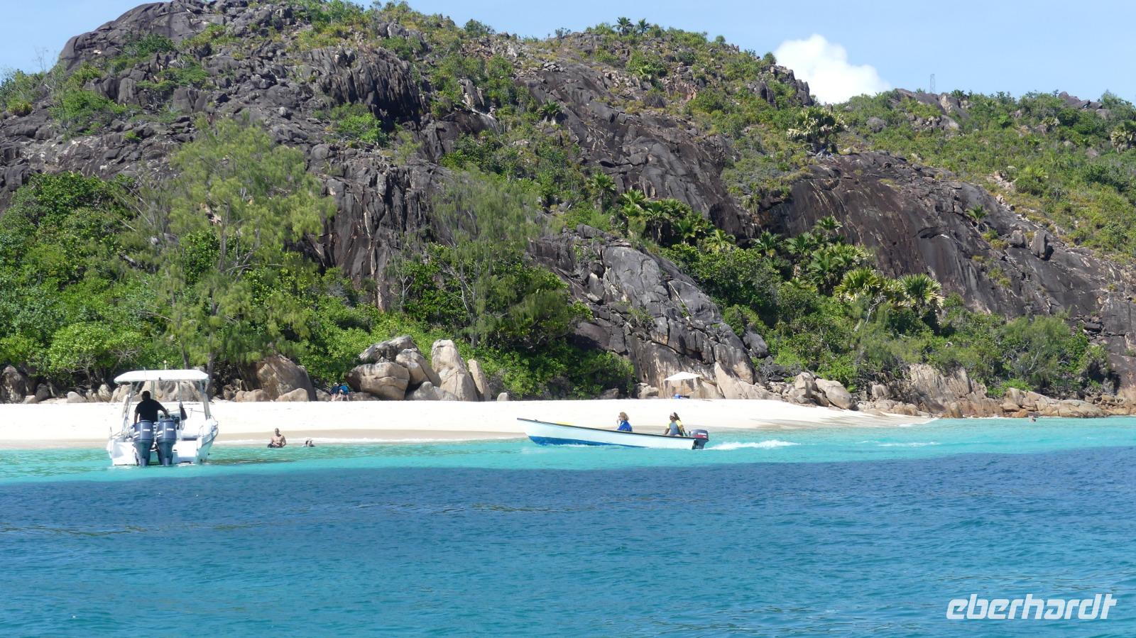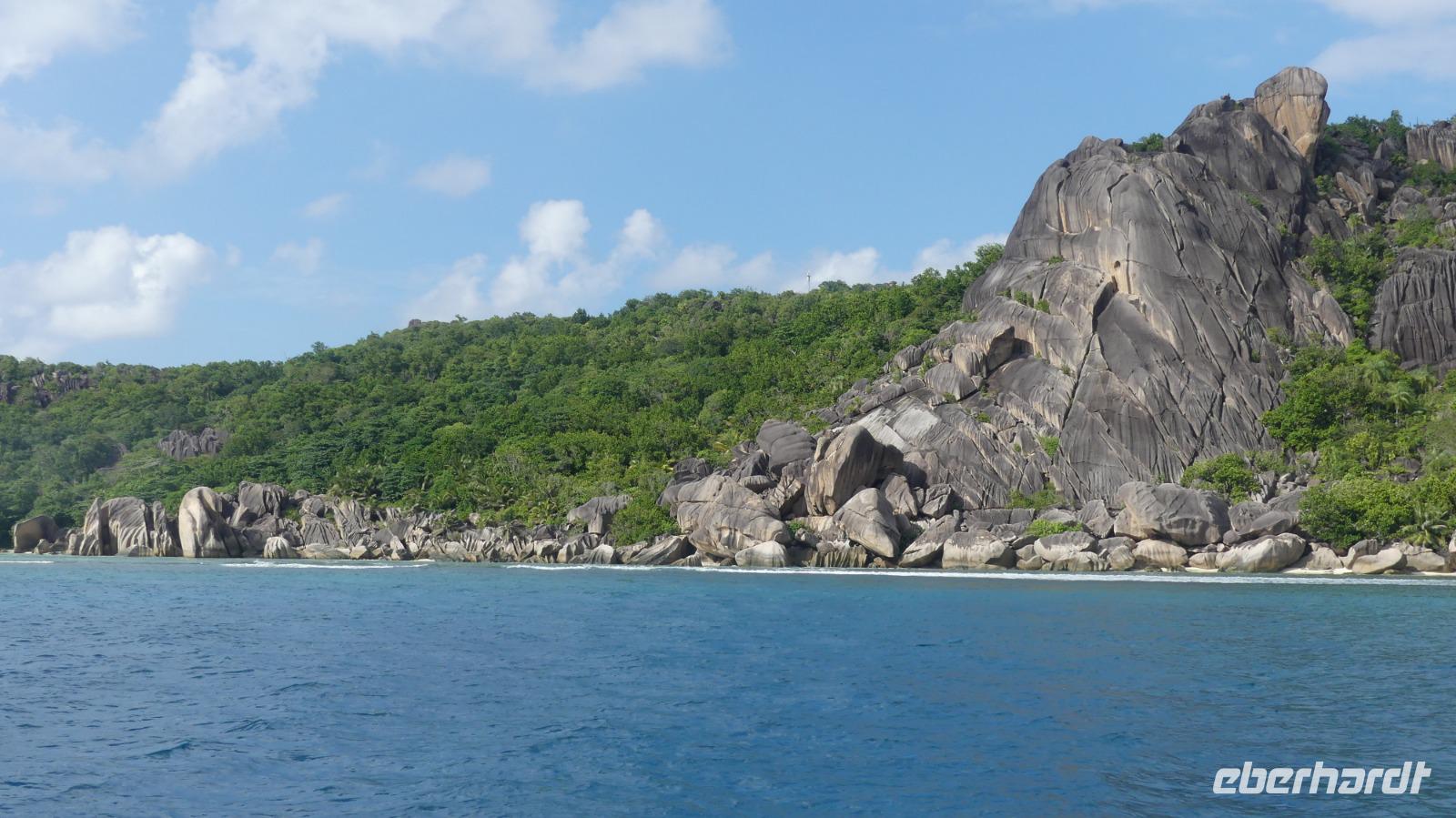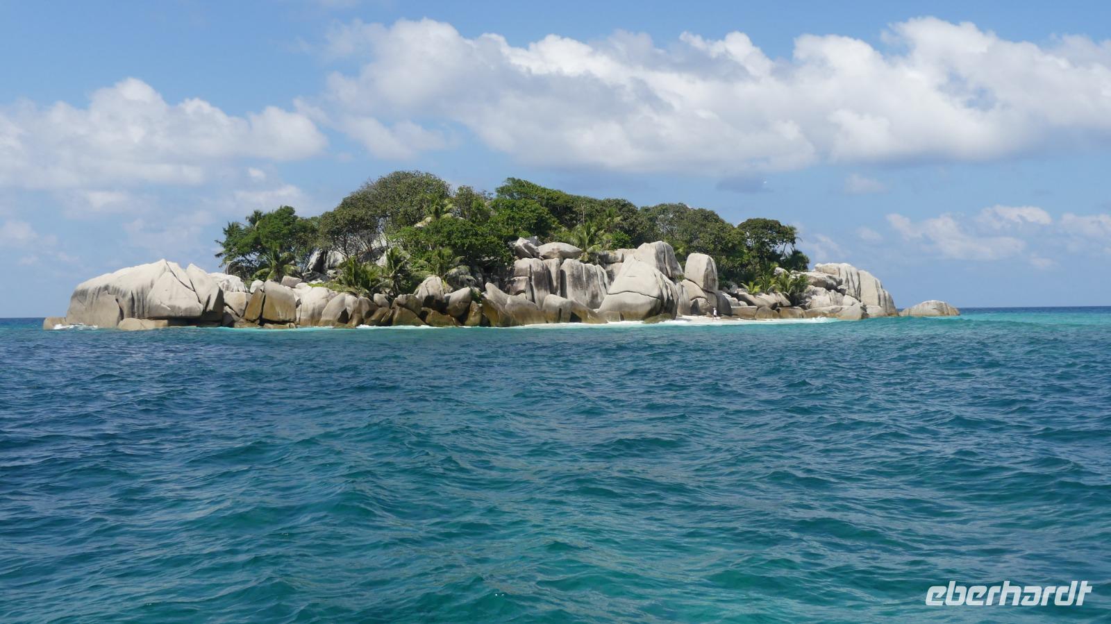 Nach dem Essen kehren wir zu unserem Katamaran zurück und nutzen diesen den ganzen Nachmittag. Zunächst umfahren wir damit La Digue und legen eine Schnorchel-/Schwimmpause vorm Traumstrand Anse Cocos ein. Wir passieren den Anse Source d'Argent und haben jetzt die Perspektive von der Seeseite auf den berühmten Strand.