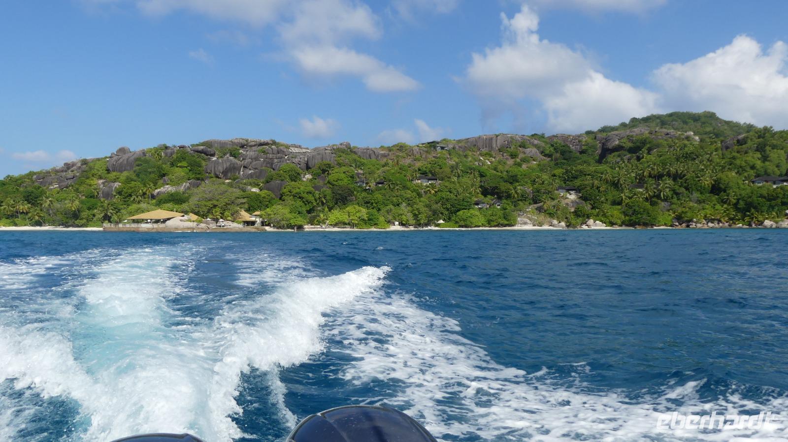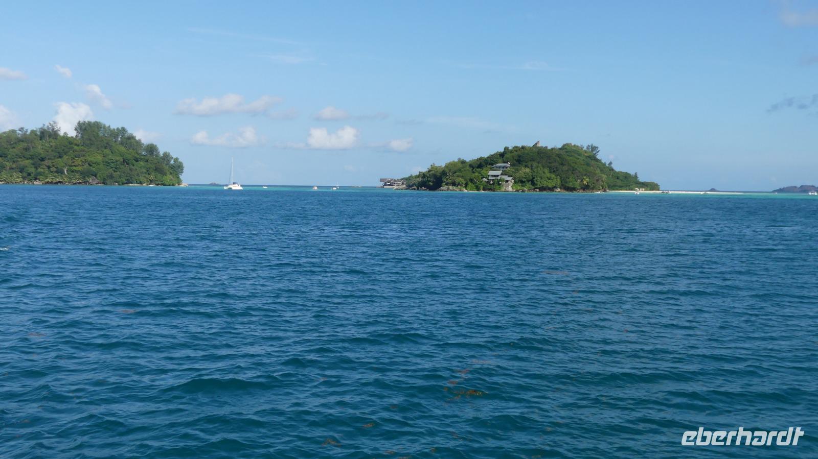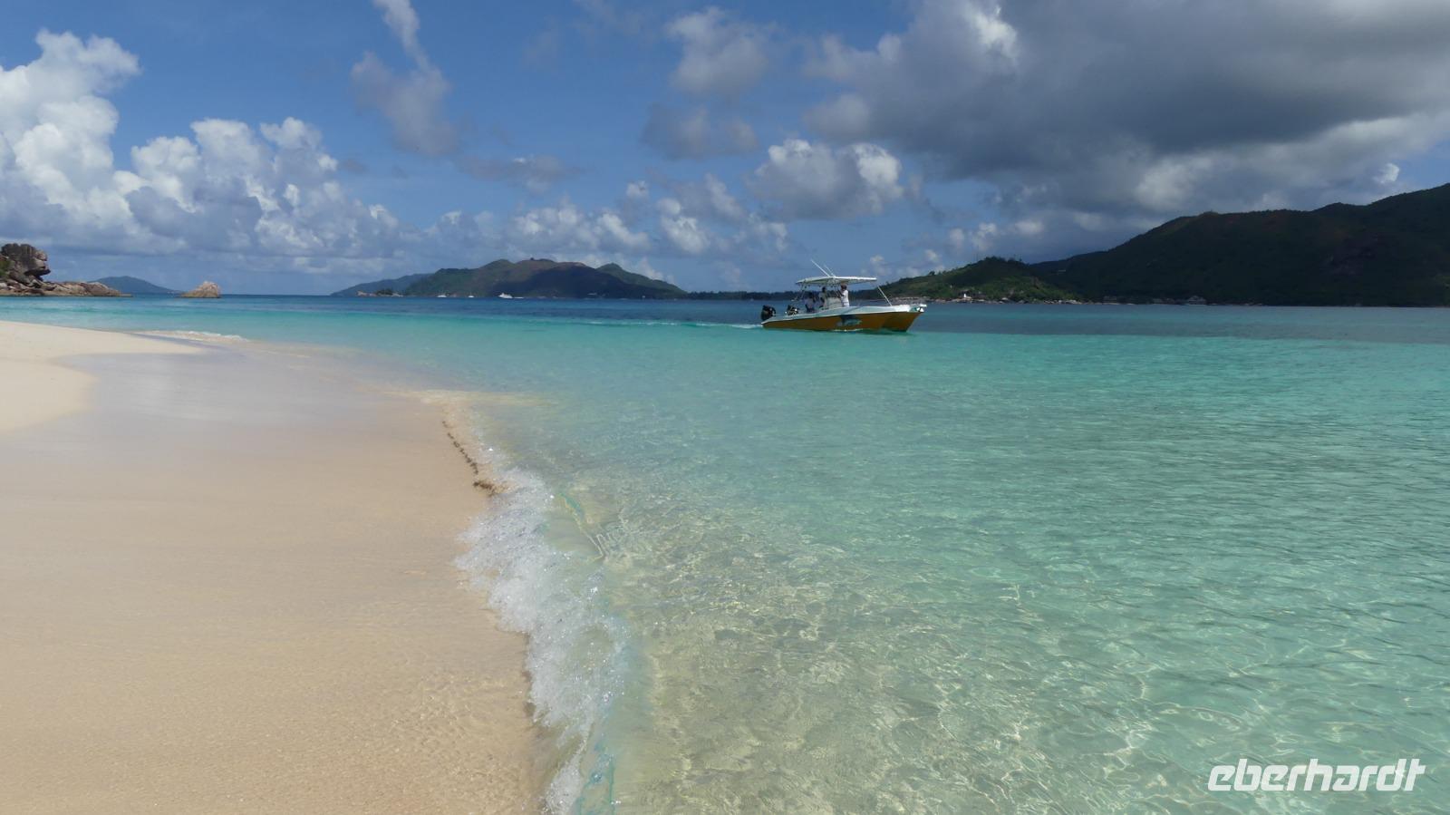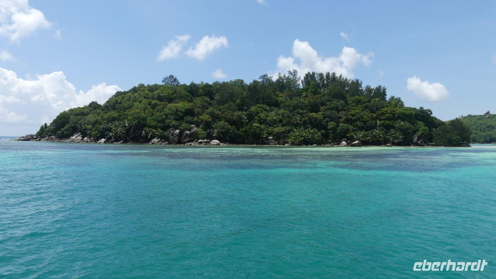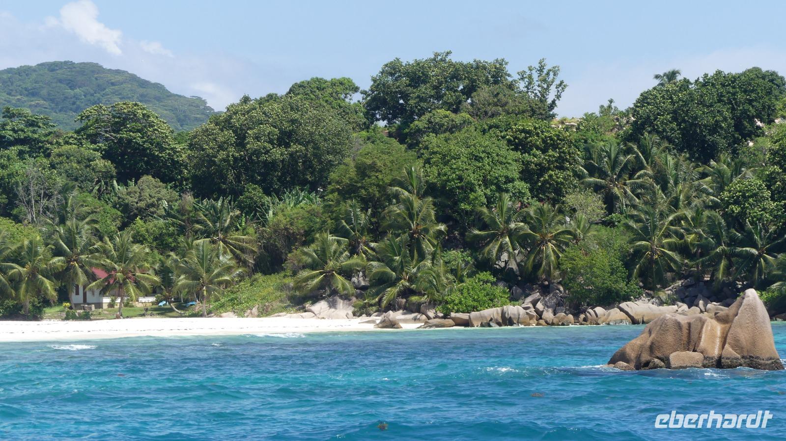 Nach dem Essen kehren wir zu unserem Katamaran zurück und nutzen diesen den ganzen Nachmittag. Zunächst umfahren wir damit La Digue und legen eine Schnorchel-/Schwimmpause vorm Traumstrand Anse Cocos ein. Wir passieren den Anse Source d'Argent und haben jetzt die Perspektive von der Seeseite auf den berühmten Strand.