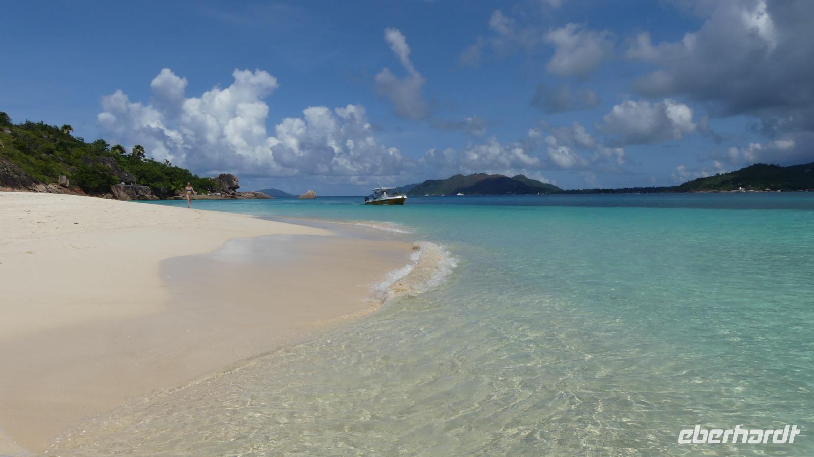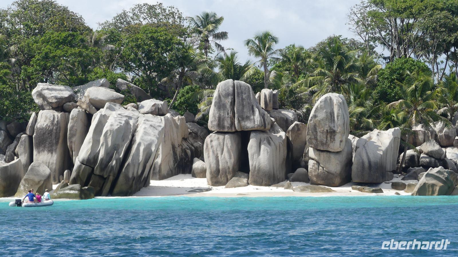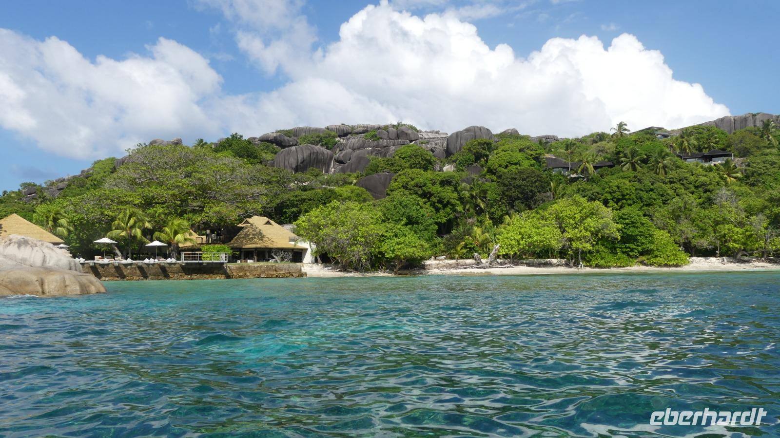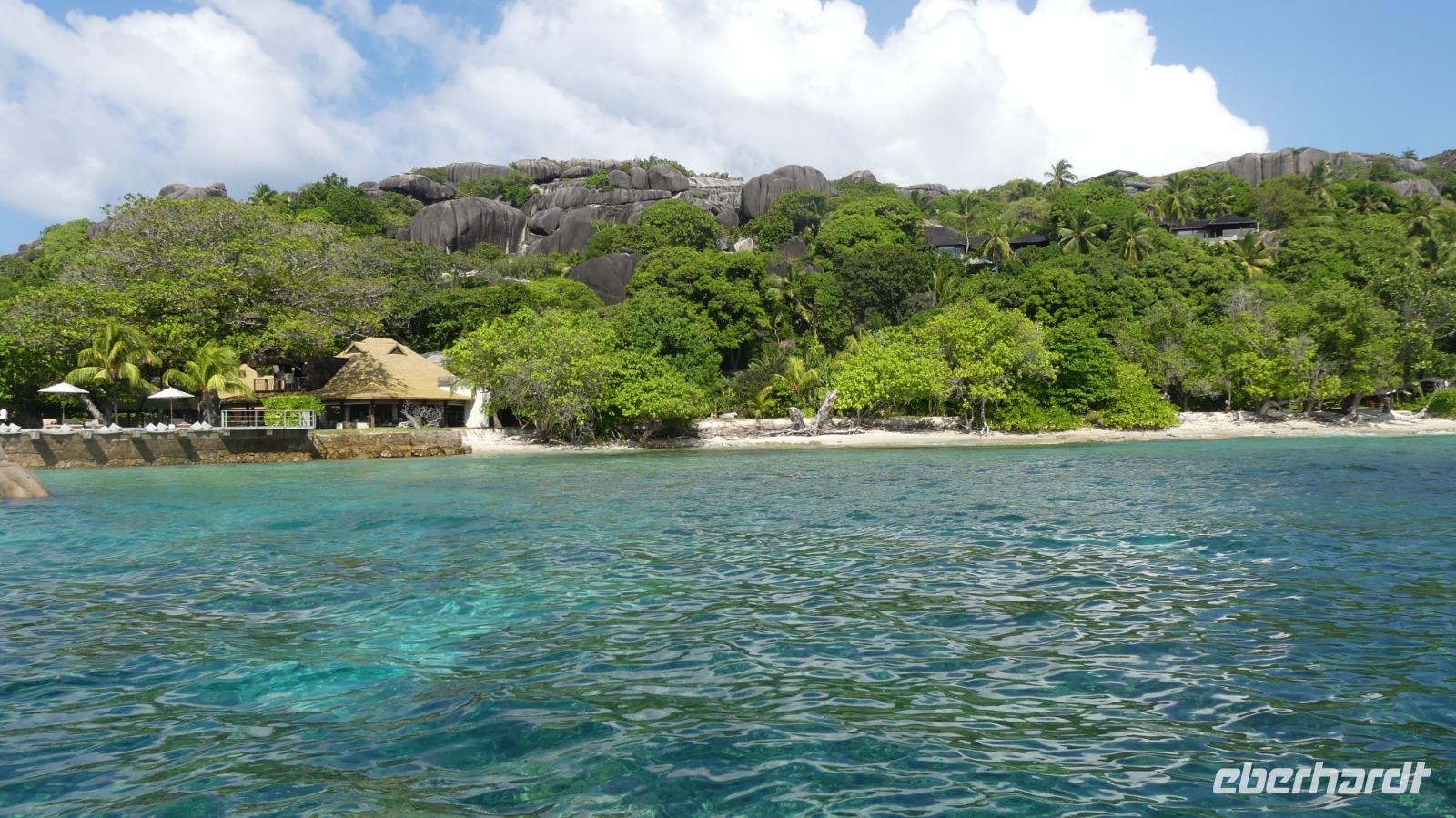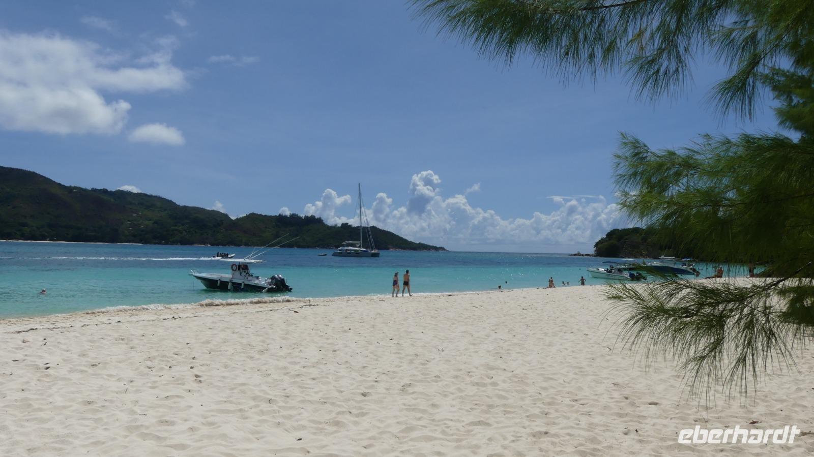 Nach dem Essen kehren wir zu unserem Katamaran zurück und nutzen diesen den ganzen Nachmittag. Zunächst umfahren wir damit La Digue und legen eine Schnorchel-/Schwimmpause vorm Traumstrand Anse Cocos ein. Wir passieren den Anse Source d'Argent und haben jetzt die Perspektive von der Seeseite auf den berühmten Strand.