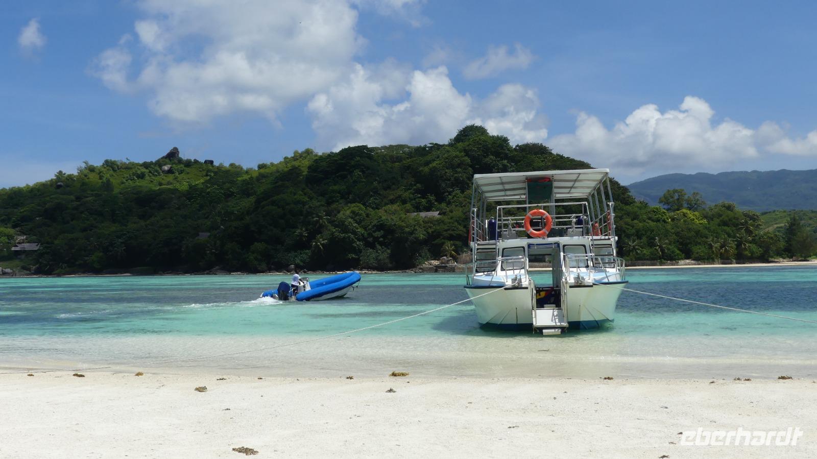 Für unseren Ausflug nach La Digue haben wir einen Katamaran nur für unsere Gruppe. Dazu kommt eine äußerst nette Crew. Wir können heute direkt vom Hotel aus den Katamaran betreten. Dazu bringt uns das Beiboot vom Hotelstrand an Bord. Auf La Digue angekommen, steigen wir auf einen LKW um, dessen Ladefläche, mit Schattendach und Bänken ausgestattet ist. Busse gibt es auf La Digue nicht. Unser erstes Ziel sind der Park "L'Union Estate" und der berühmte Traumstrand Anse Source d'Argent, einer der am häufigsten fotografierten Strände der Welt.