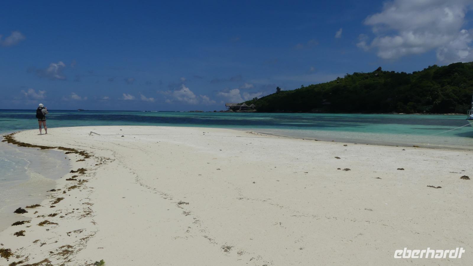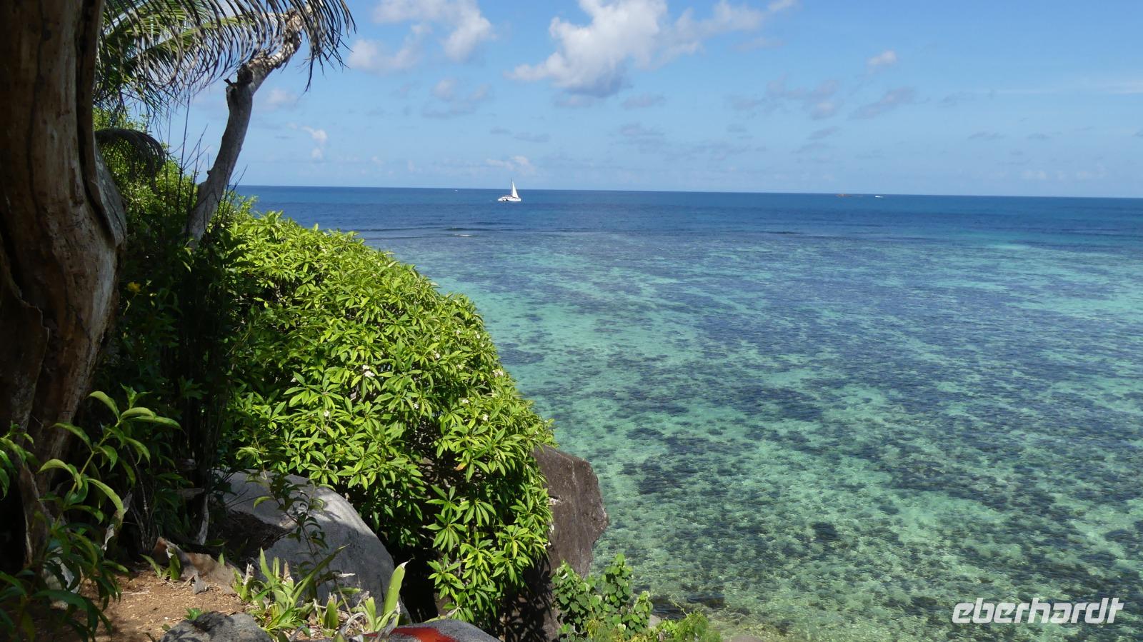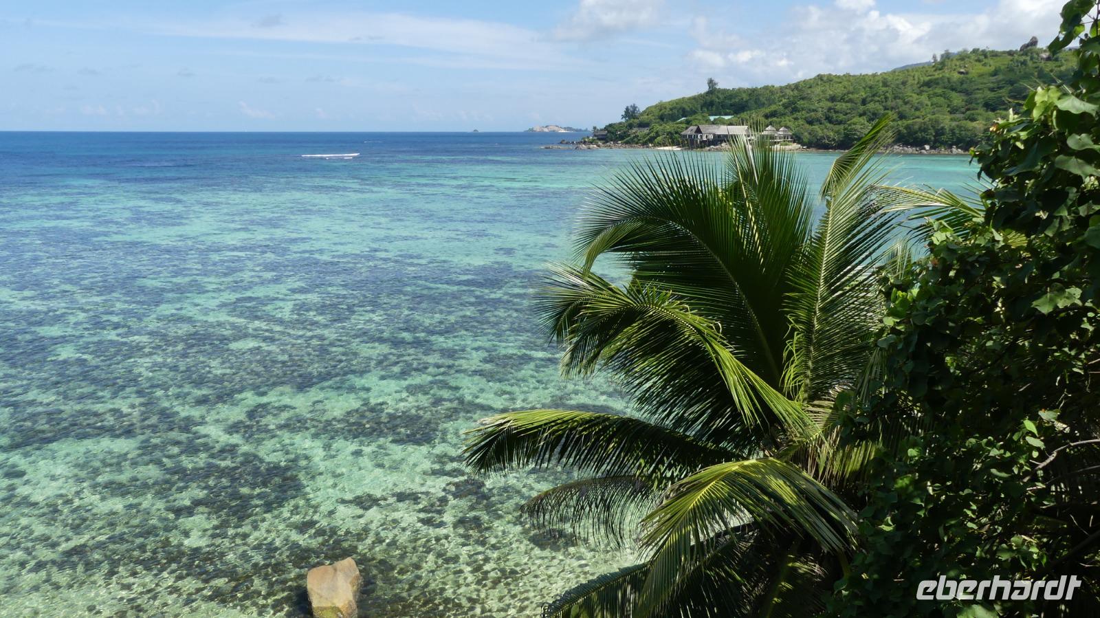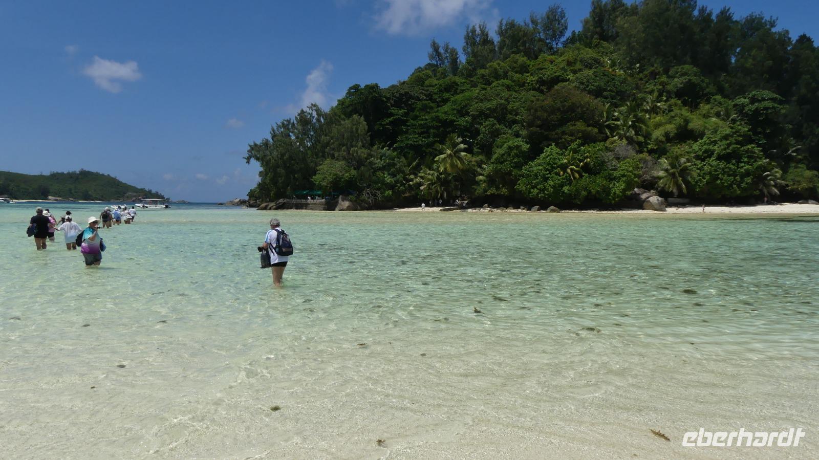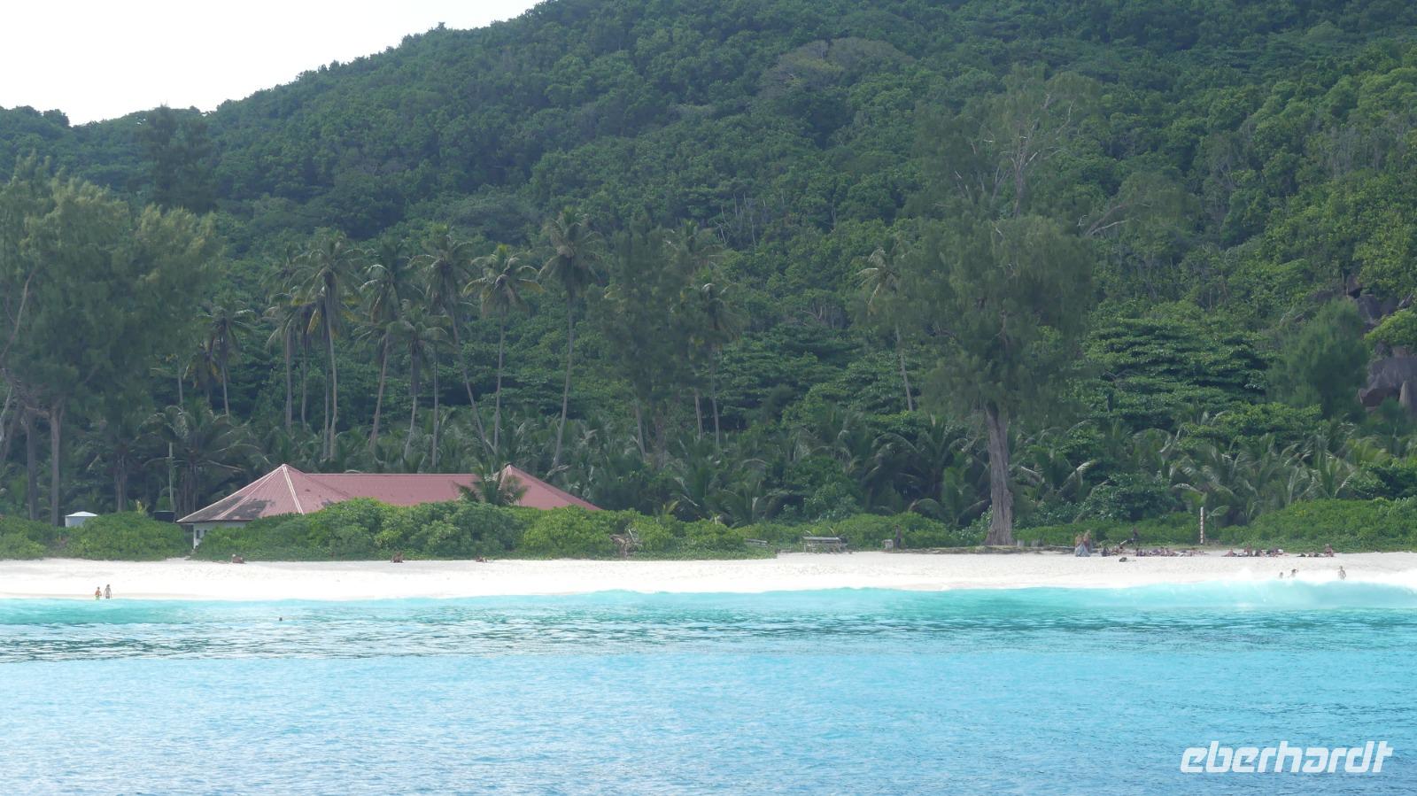 Jeder in unserer Gruppe hat sich für die Badeverlängerung entschieden. Man kann es ganz ruhig angehen, einem Strandspaziergang, Fische füttern am Steg, Rochen in Strandnähe beobachten und pünktlich 4 Uhr nachmittags trifft man sich in der Mango Bar zum Kaffee oder Tee. Für Unternehmungslustige gibt es verschiedene Möglichkeiten. Einige von uns wandern mit Ryan auf dem Naturlehrpfad zum 260 m hohen Aussichtspunkt. Eine schweißtreibende Tour, aber hinsichtlich Flora und Fauna sehr interessant und der Ausblick entschädigt für die Mühen. An einem anderen Tag geht es mit dem Hotelshuttle zum berühmten Strand Anse Lazio.
