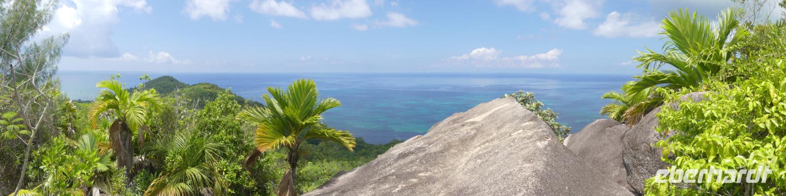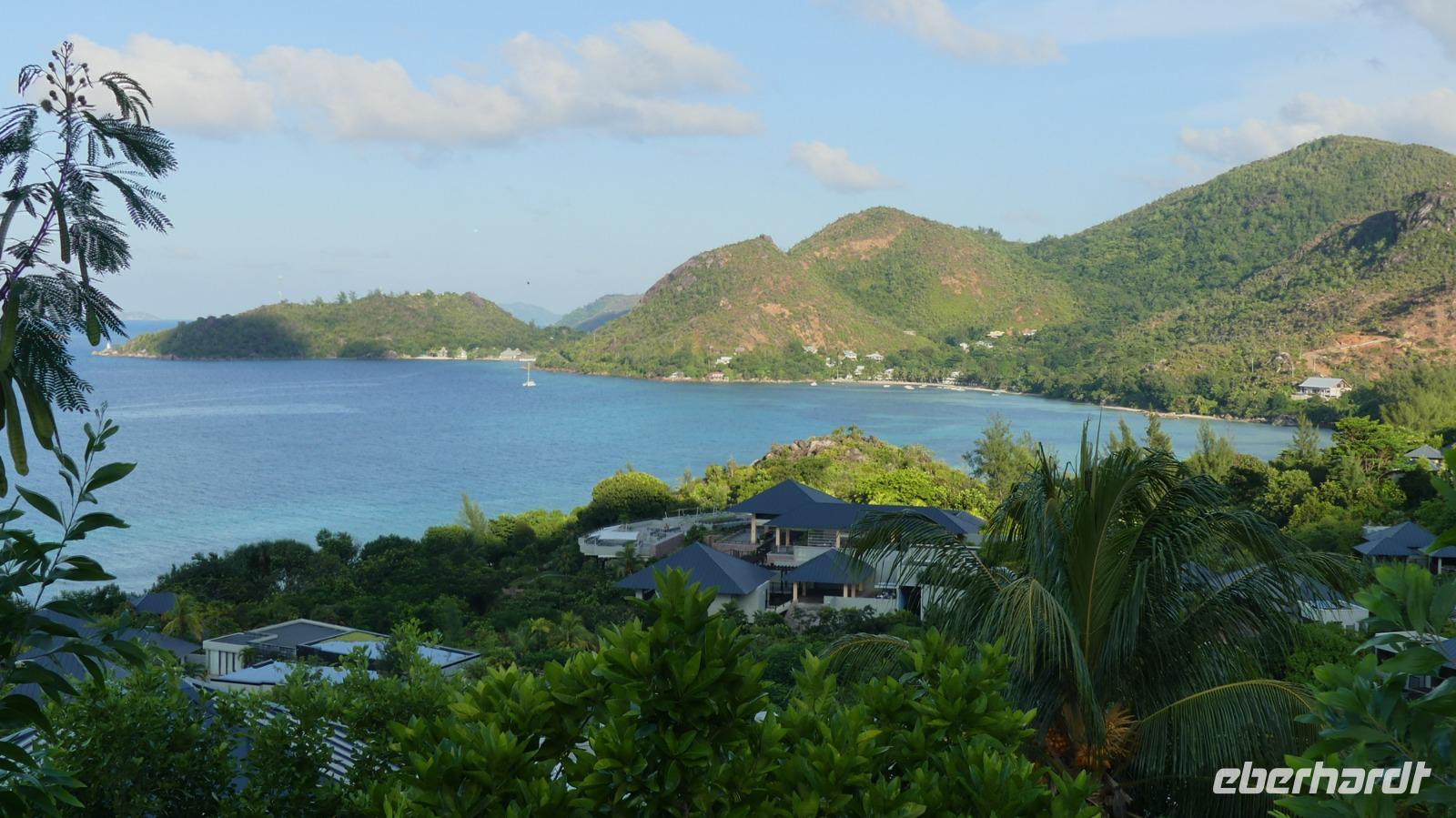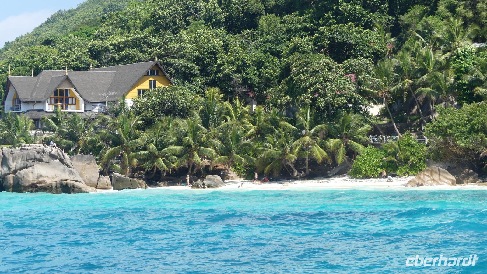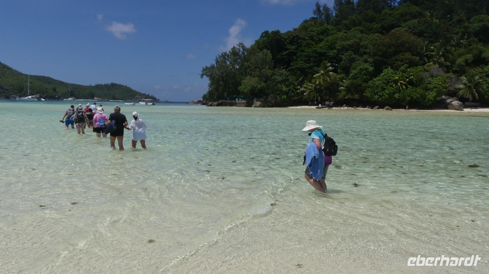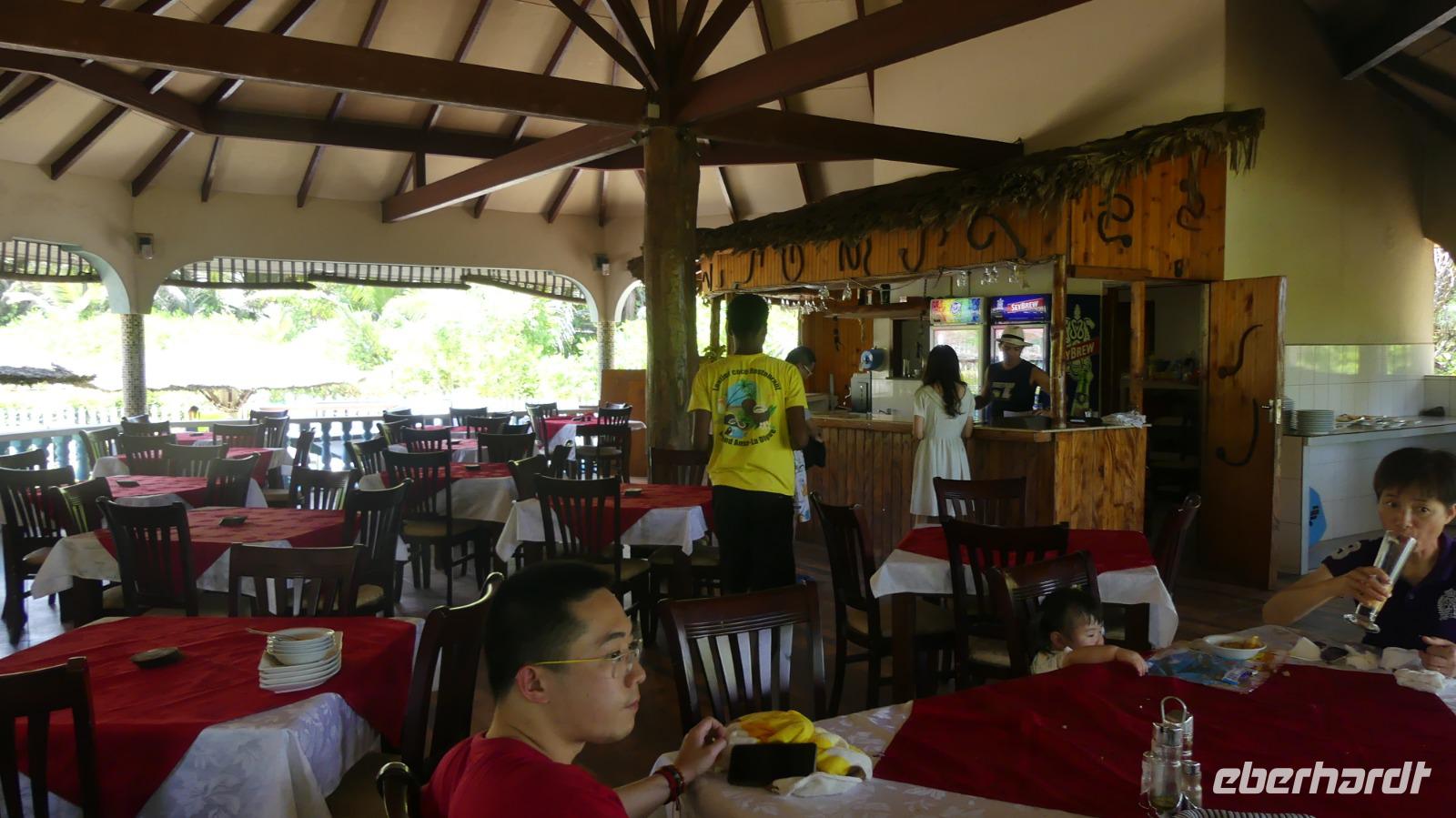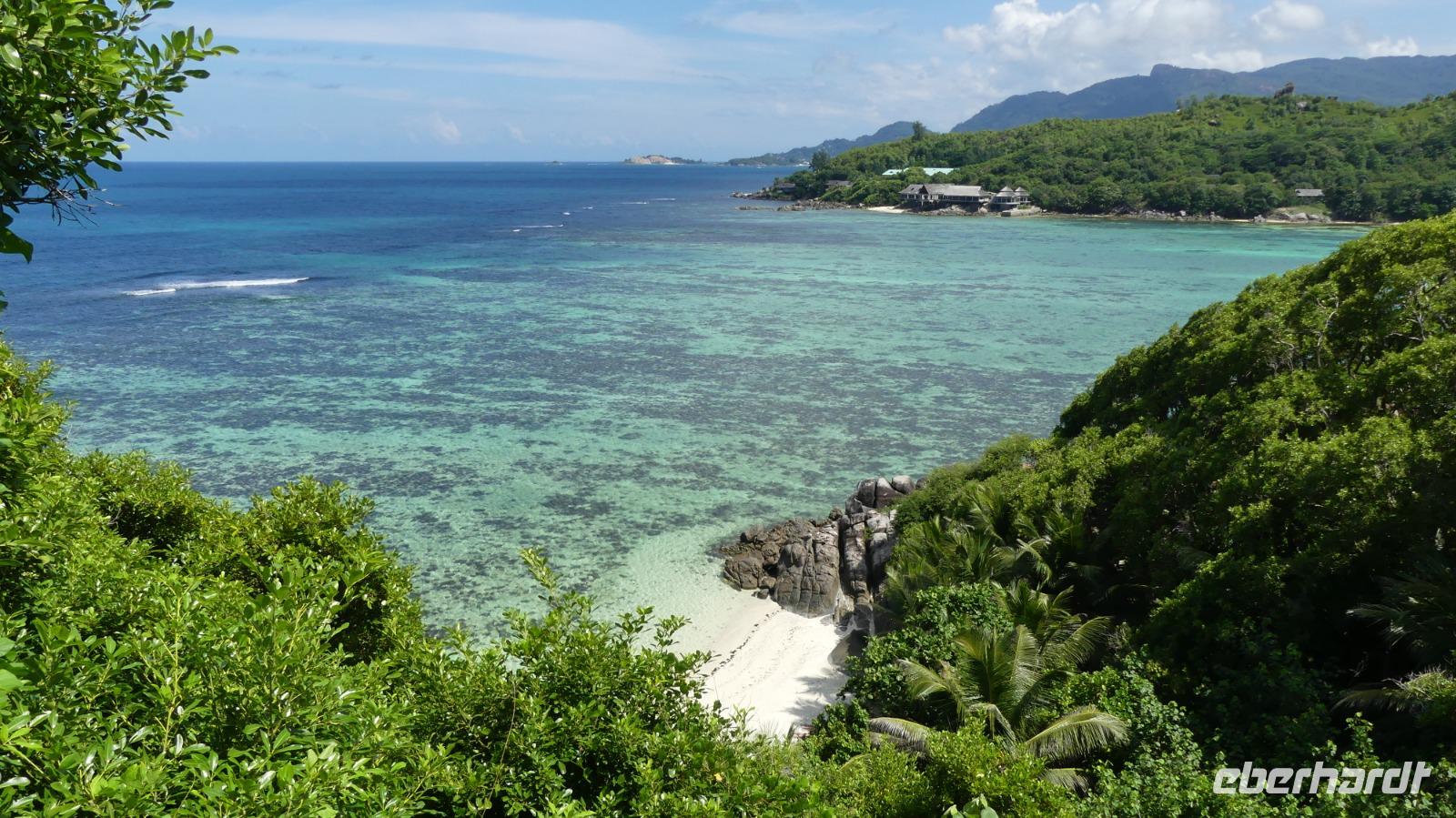 Jeder in unserer Gruppe hat sich für die Badeverlängerung entschieden. Man kann es ganz ruhig angehen, einem Strandspaziergang, Fische füttern am Steg, Rochen in Strandnähe beobachten und pünktlich 4 Uhr nachmittags trifft man sich in der Mango Bar zum Kaffee oder Tee. Für Unternehmungslustige gibt es verschiedene Möglichkeiten. Einige von uns wandern mit Ryan auf dem Naturlehrpfad zum 260 m hohen Aussichtspunkt. Eine schweißtreibende Tour, aber hinsichtlich Flora und Fauna sehr interessant und der Ausblick entschädigt für die Mühen. An einem anderen Tag geht es mit dem Hotelshuttle zum berühmten Strand Anse Lazio.