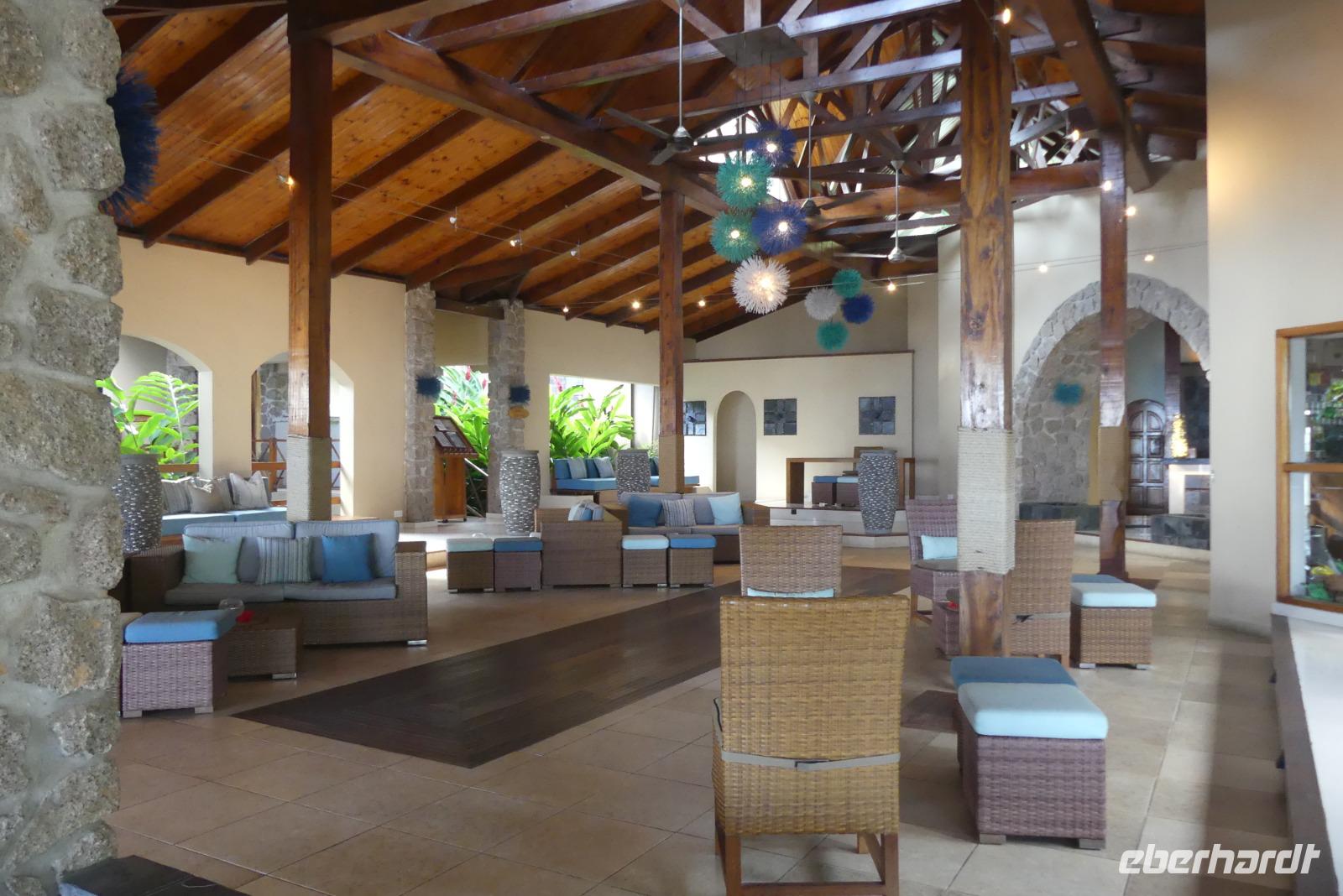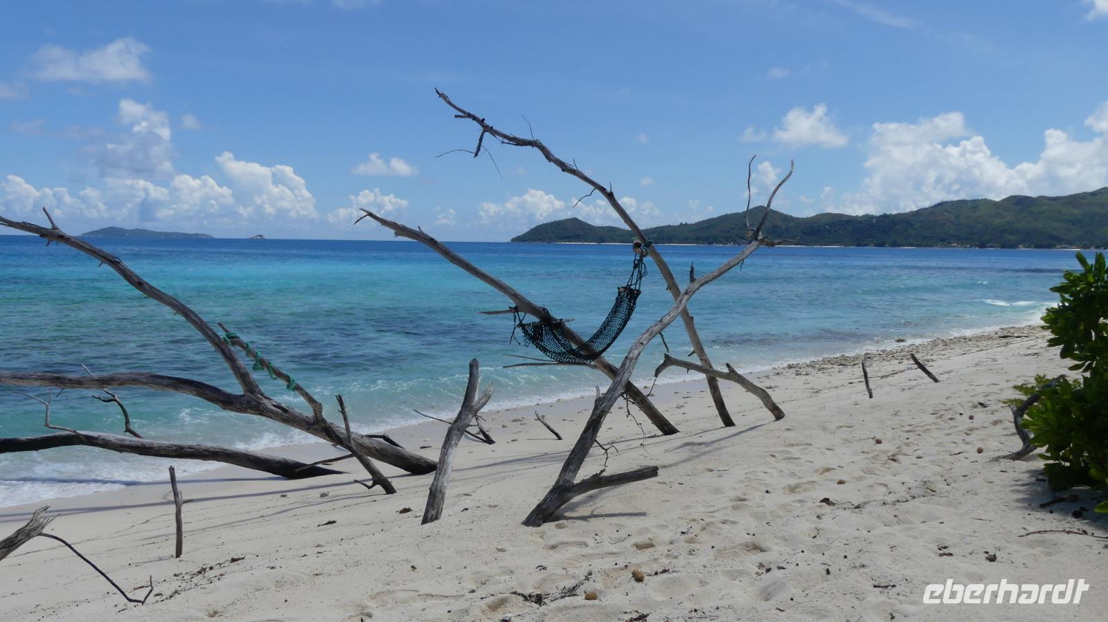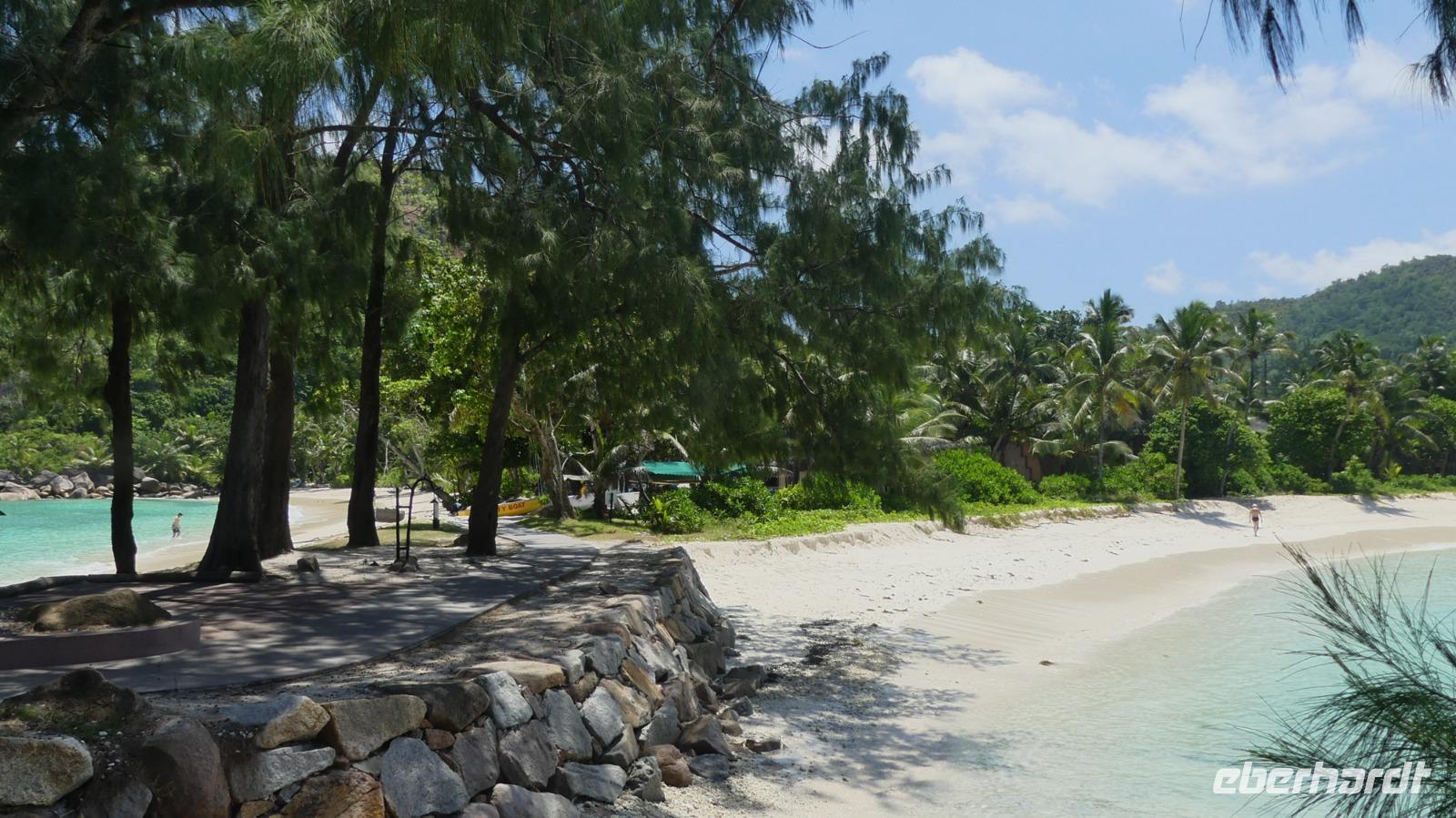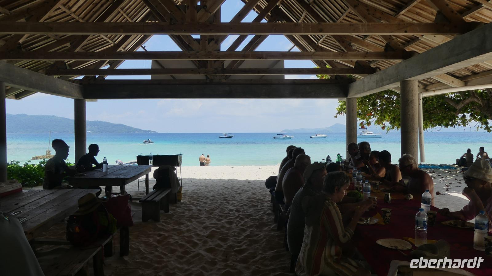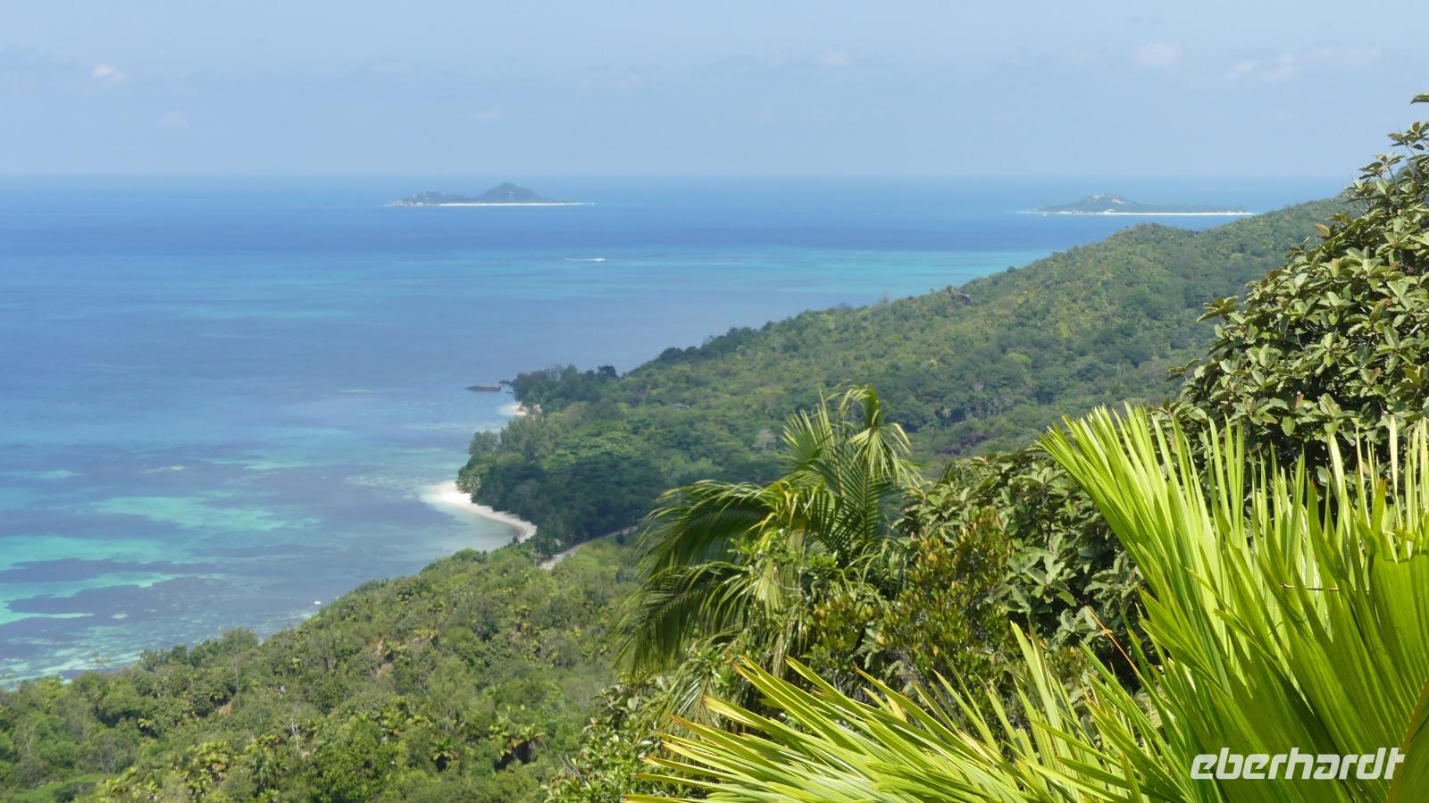 Jeder in unserer Gruppe hat sich für die Badeverlängerung entschieden. Man kann es ganz ruhig angehen, einem Strandspaziergang, Fische füttern am Steg, Rochen in Strandnähe beobachten und pünktlich 4 Uhr nachmittags trifft man sich in der Mango Bar zum Kaffee oder Tee. Für Unternehmungslustige gibt es verschiedene Möglichkeiten. Einige von uns wandern mit Ryan auf dem Naturlehrpfad zum 260 m hohen Aussichtspunkt. Eine schweißtreibende Tour, aber hinsichtlich Flora und Fauna sehr interessant und der Ausblick entschädigt für die Mühen. An einem anderen Tag geht es mit dem Hotelshuttle zum berühmten Strand Anse Lazio.
