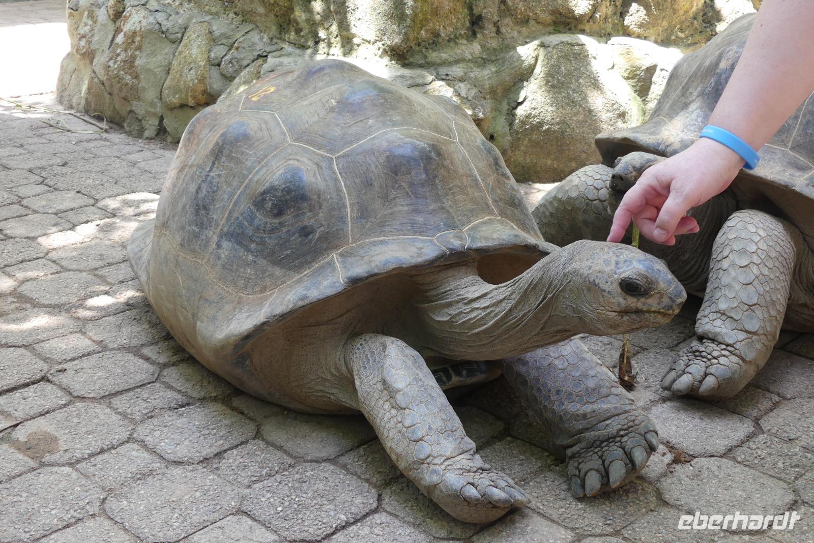 Für eine Stärkung an Bord ist gesorgt, die Besatzung stellt für uns und die anderen Gäste ein kleines Buffet zusammen. Dazu gibt es mit der Gitarre Gute-Laune-Livemusik. Am Nachmittag sind wir auf der Insel Moyenne, ein kleines Schlauchboot bringt uns zum Inselrand, die letzten Meter geht es zu Fuß durch das Wasser zur Insel. Auf Moyenne wurden viele Landschildkröten angesiedelt, die wir in verschiedenen Größen und ganz aus der Nähe betrachten können. Schnell finden wir heraus, wie sehr sie es mögen, wenn man sie am Hals streichelt, dann halten sie ganz still. Manchmal begegnen wir den Schildkröten auf dem Wanderweg Richtung Insel Friedhof. Beim Vorbeigehen verwechselt eine Schildkröte wohl die Wade von K. mit etwas Essbarem - ein Schildkrötenbiss in der Wade ist wohl ein Souvenir was man nicht haben muss (zur Beruhigung aller Leser, er hat es überlebt, musste nicht ärztlich versorgt werden und der Biss hat sich auch nicht entzündet.)