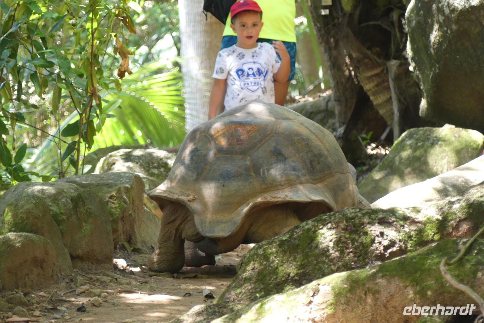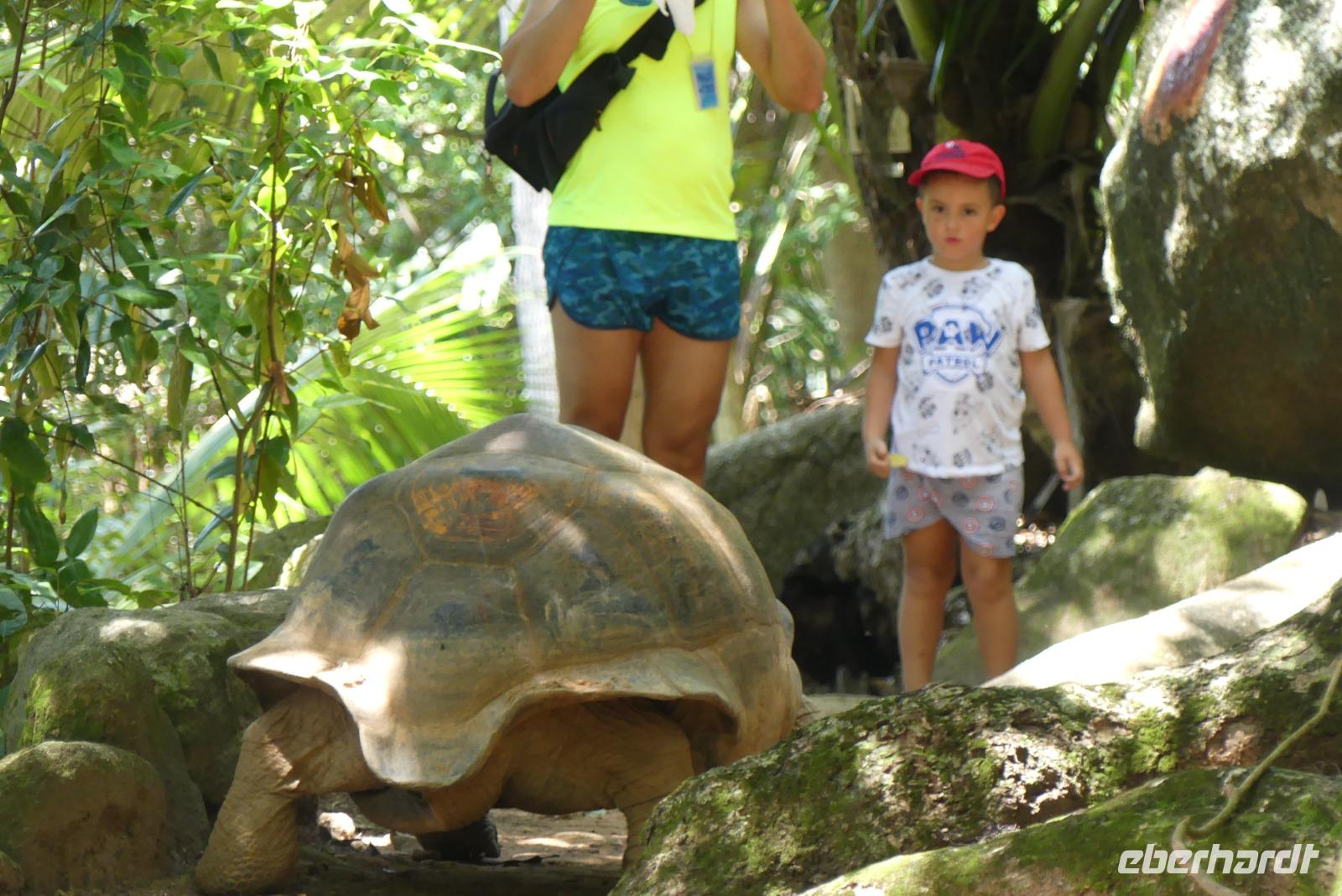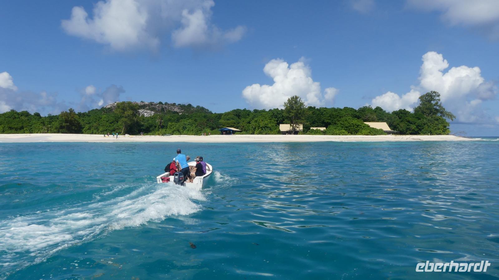 Mit 38 Knoten, das sind rund 70 km/h fahren wir mit dem Schnellboot zur Vogelinsel Cousine. Aufgrund von Umweltauflagen dürfen keine größeren Boote an der Insel anlanden, deshalb tendern wir um auf Cousine zu gelangen. Da es hier am Boden keine Schlangen und Nager gibt, kommen verschiedene Vogelarten gern hierher, um ihren Nachwuchs am Boden aufzuziehen. Eine gute Gelegenheit, die Seevögel und ihre Jungtiere, wie den Weißschwanz-Tropikvogel (der mit dem langen weißen Schanz) sowie Foddy-Arten ganz aus der Nähe zu beobachten. Auch drei besondere große Exemplare von Landschildkröten begegnen wir.