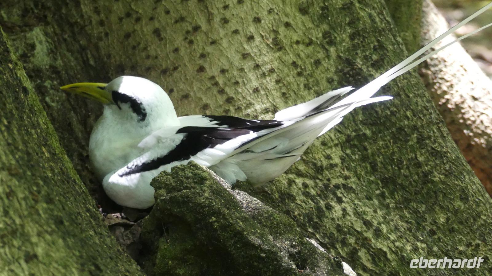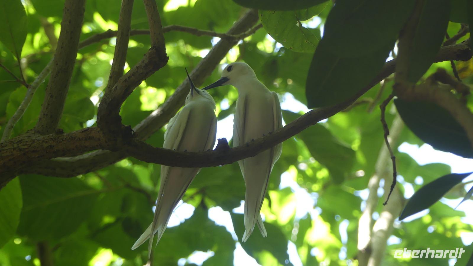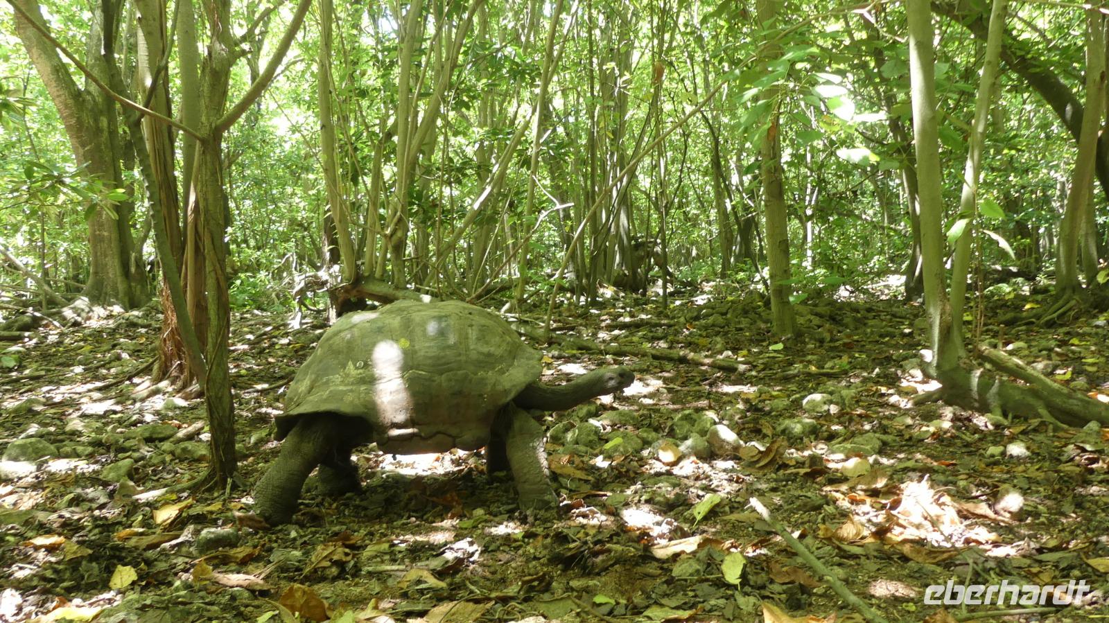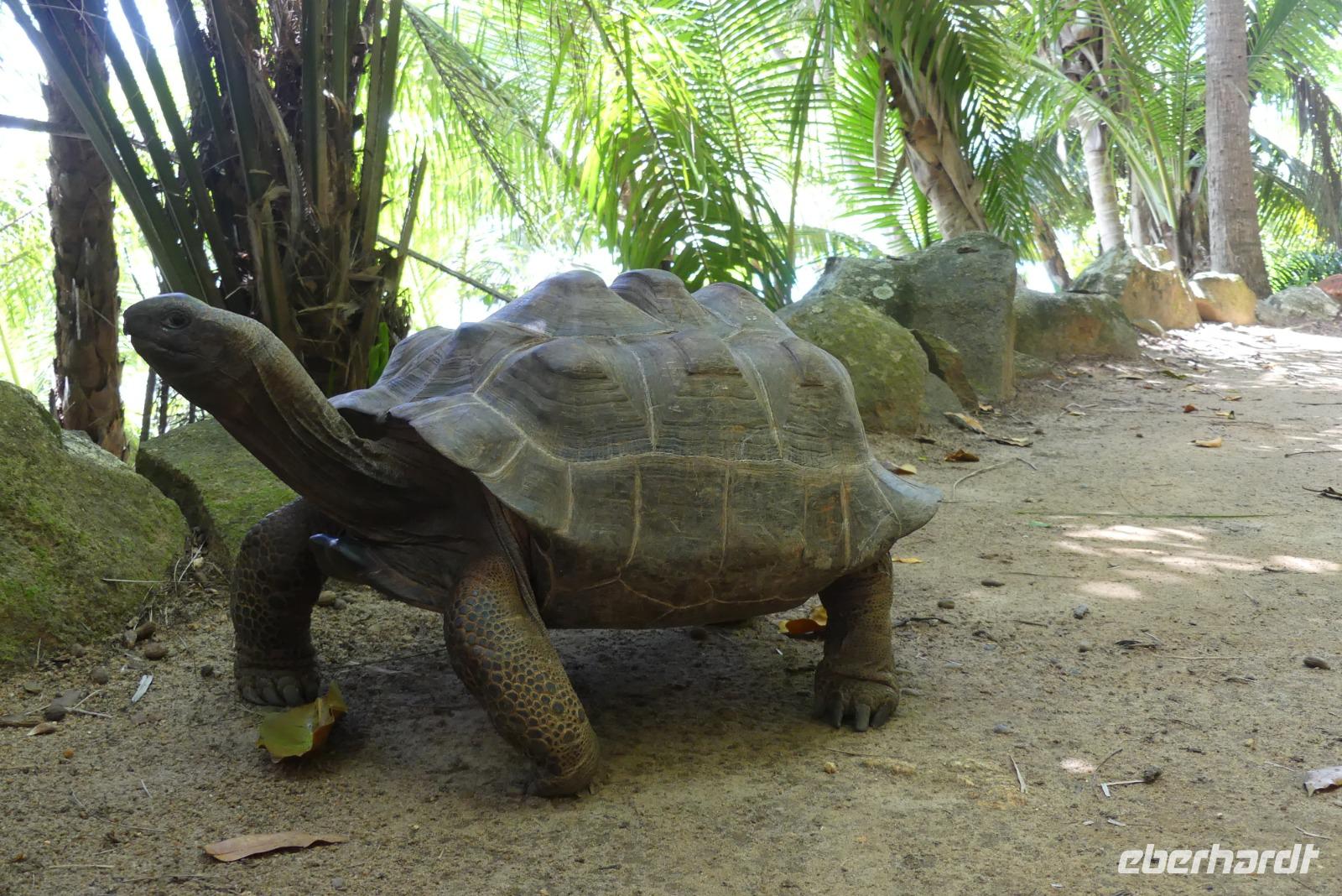 Mit 38 Knoten, das sind rund 70 km/h fahren wir mit dem Schnellboot zur Vogelinsel Cousine. Aufgrund von Umweltauflagen dürfen keine größeren Boote an der Insel anlanden, deshalb tendern wir um auf Cousine zu gelangen. Da es hier am Boden keine Schlangen und Nager gibt, kommen verschiedene Vogelarten gern hierher, um ihren Nachwuchs am Boden aufzuziehen. Eine gute Gelegenheit, die Seevögel und ihre Jungtiere, wie den Weißschwanz-Tropikvogel (der mit dem langen weißen Schanz) sowie Foddy-Arten ganz aus der Nähe zu beobachten. Auch drei besondere große Exemplare von Landschildkröten begegnen wir.
