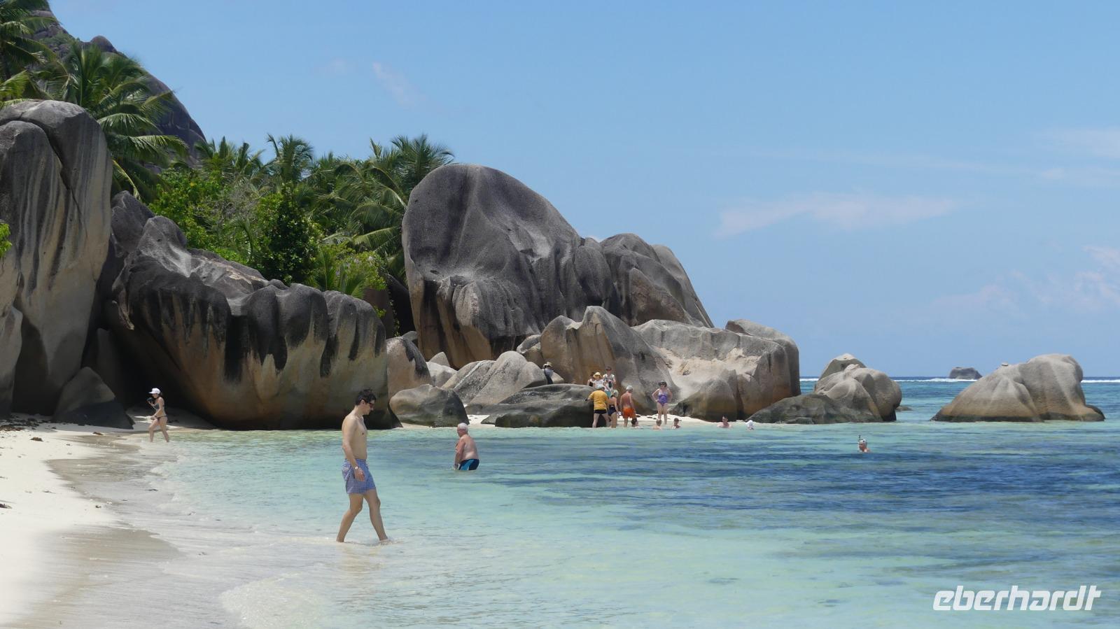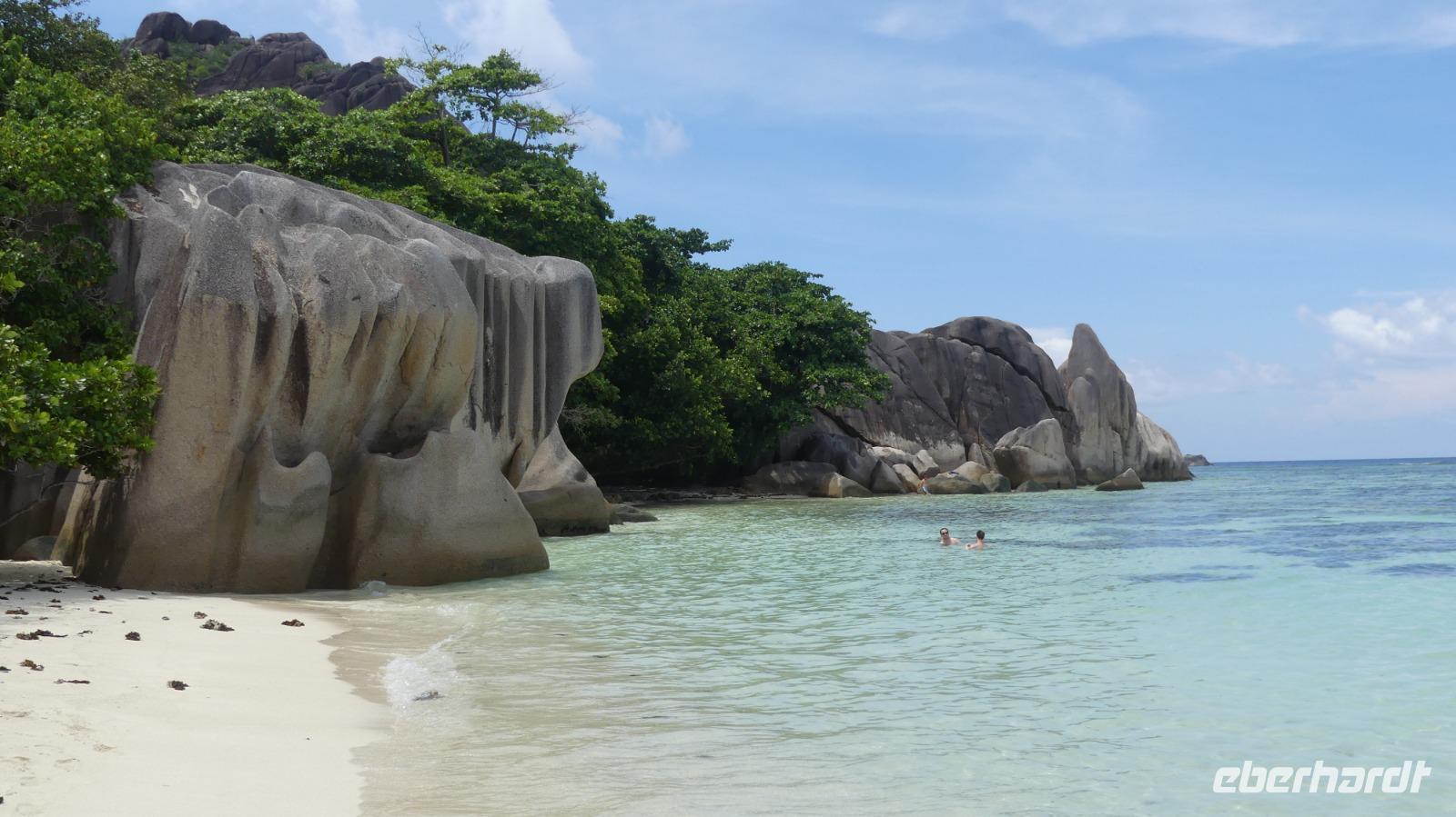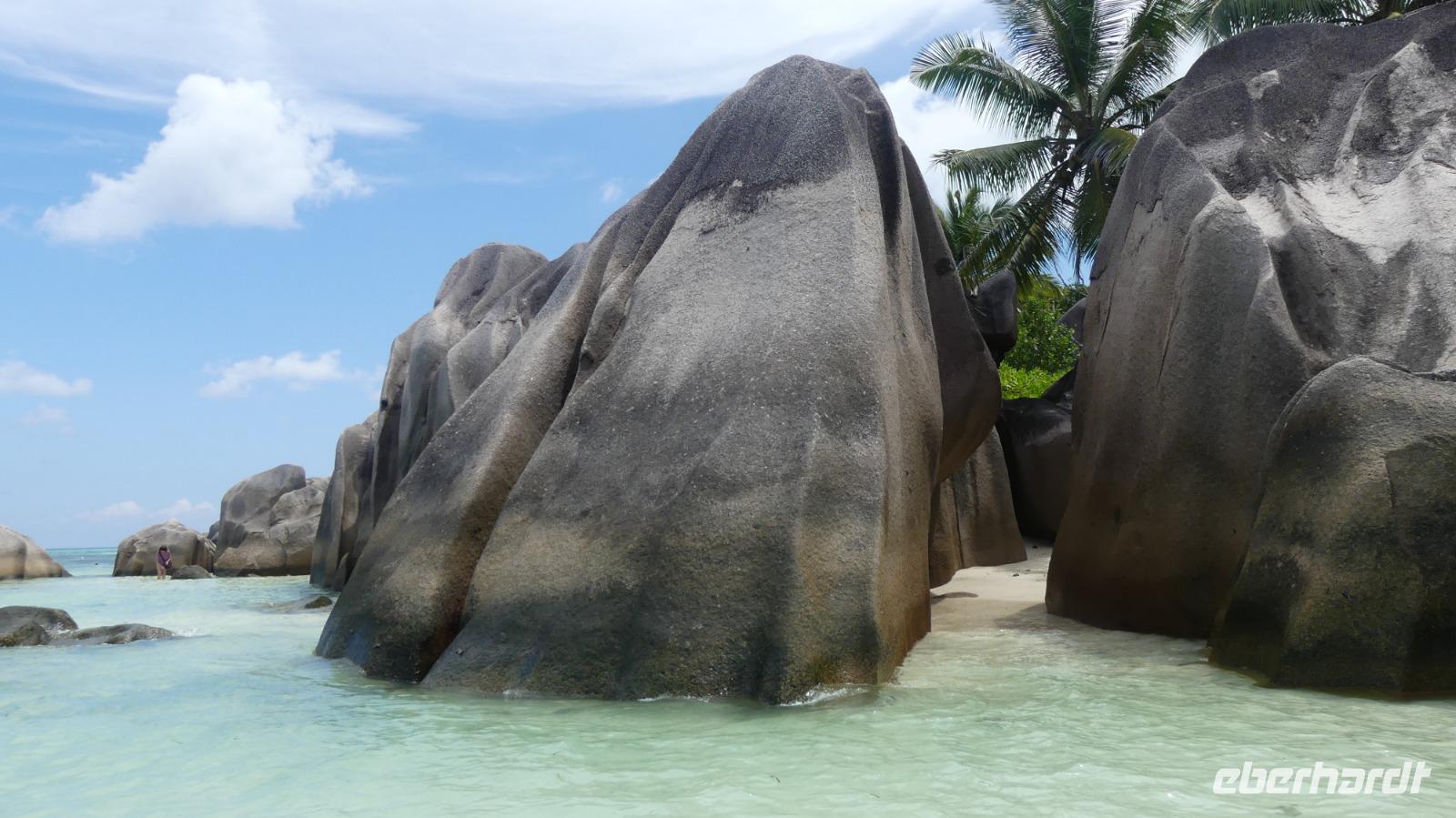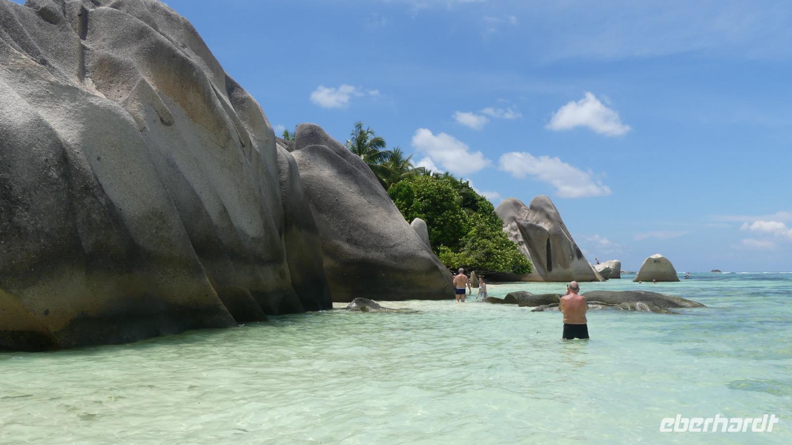 Die Zeit für den Besuch des Traumstrandes Anse Source d'Argent ist sehr günstig, denn es ist gerade Flut. So verweilen wir hier zum Baden und Fotografieren. Die verschiedenen Formationen des Granitgesteins bieten reichlich Motive.