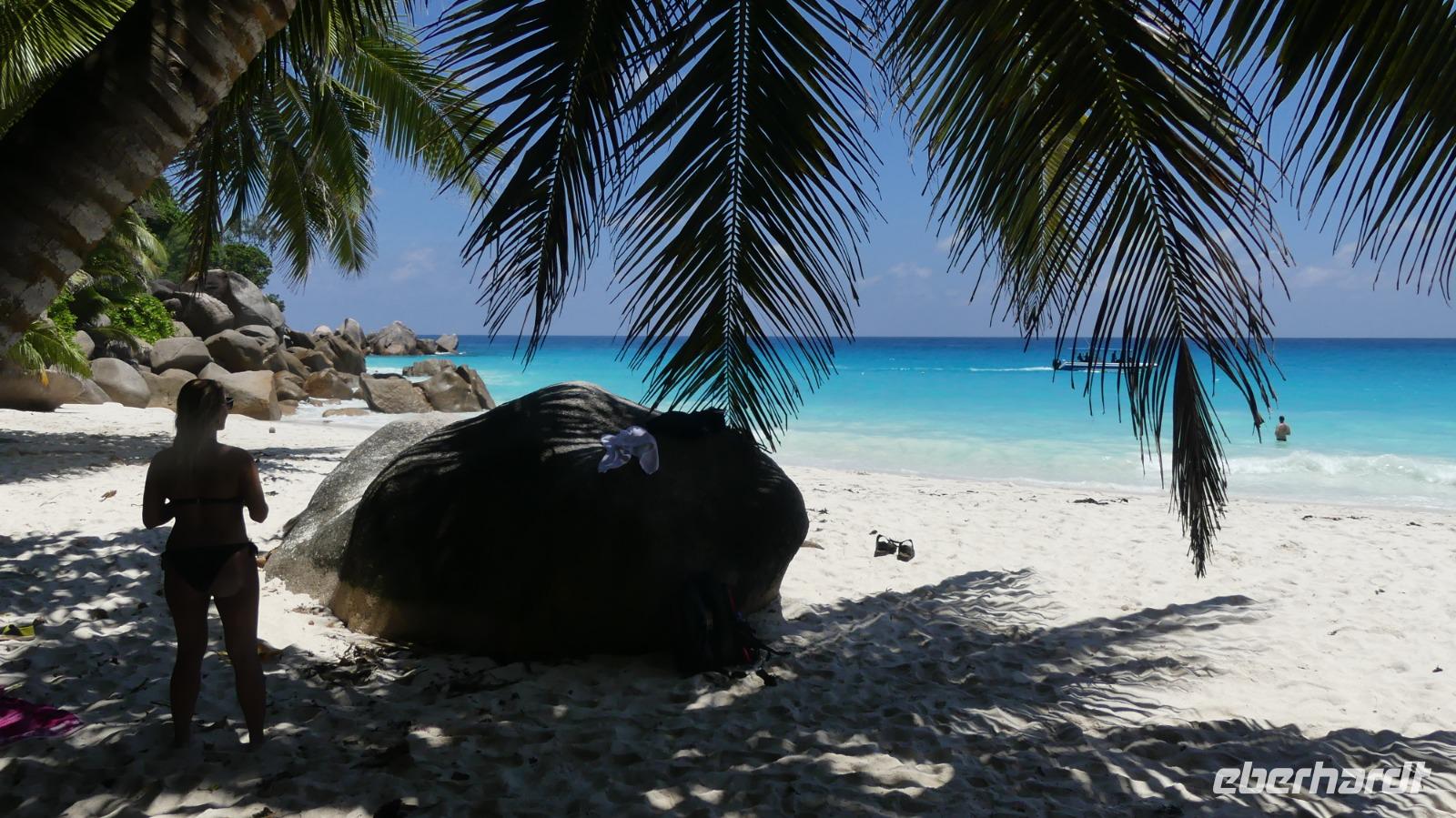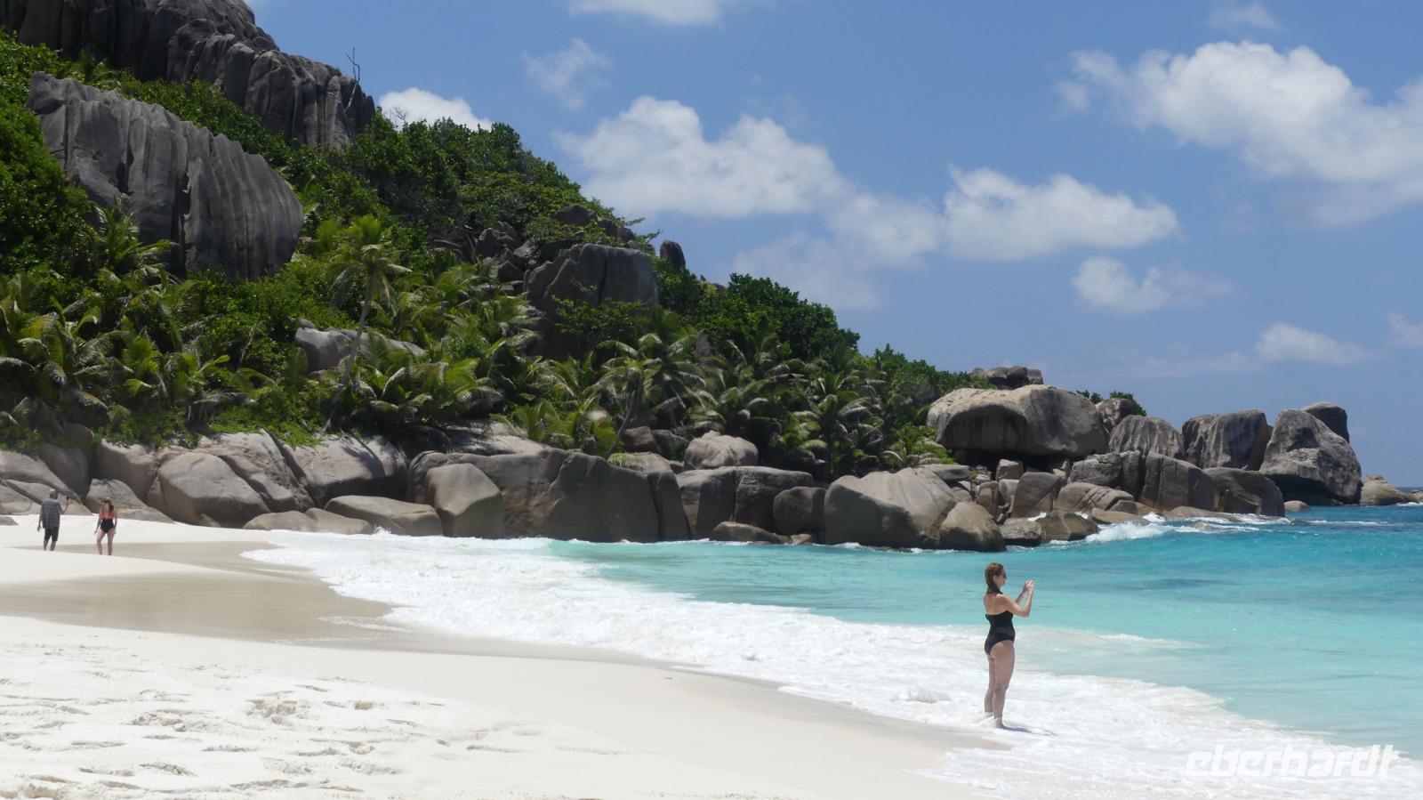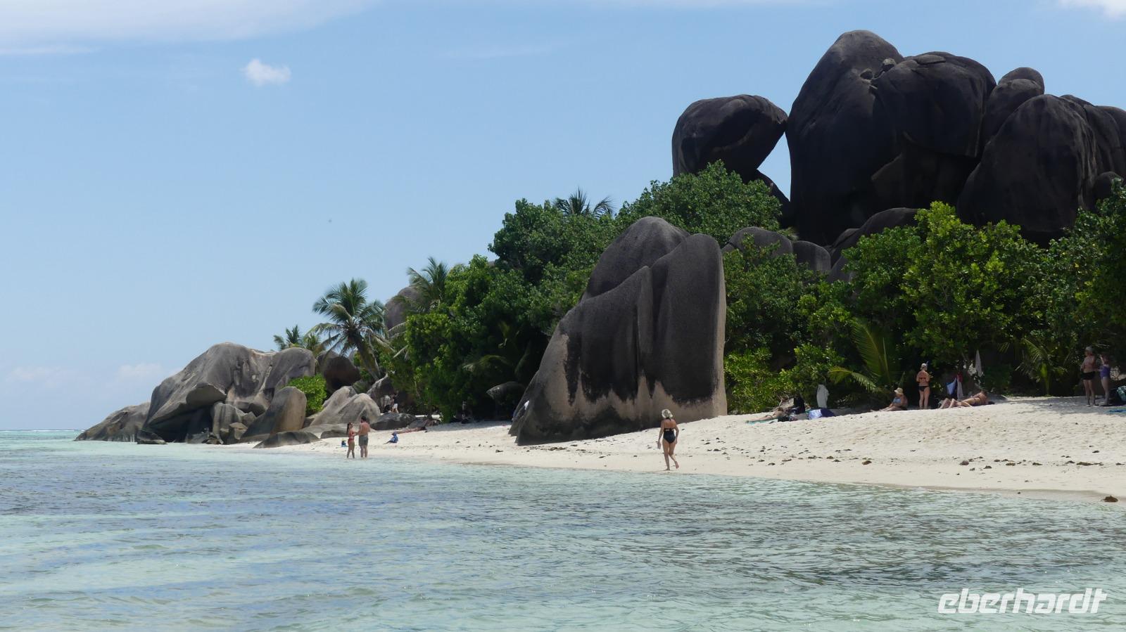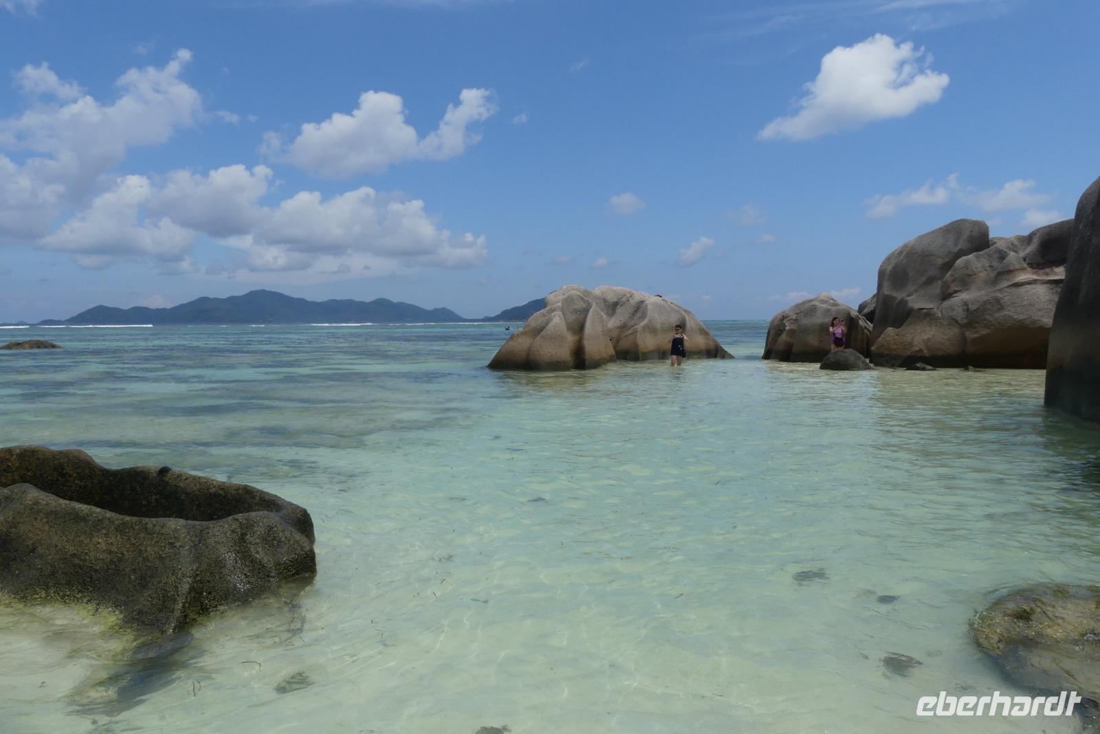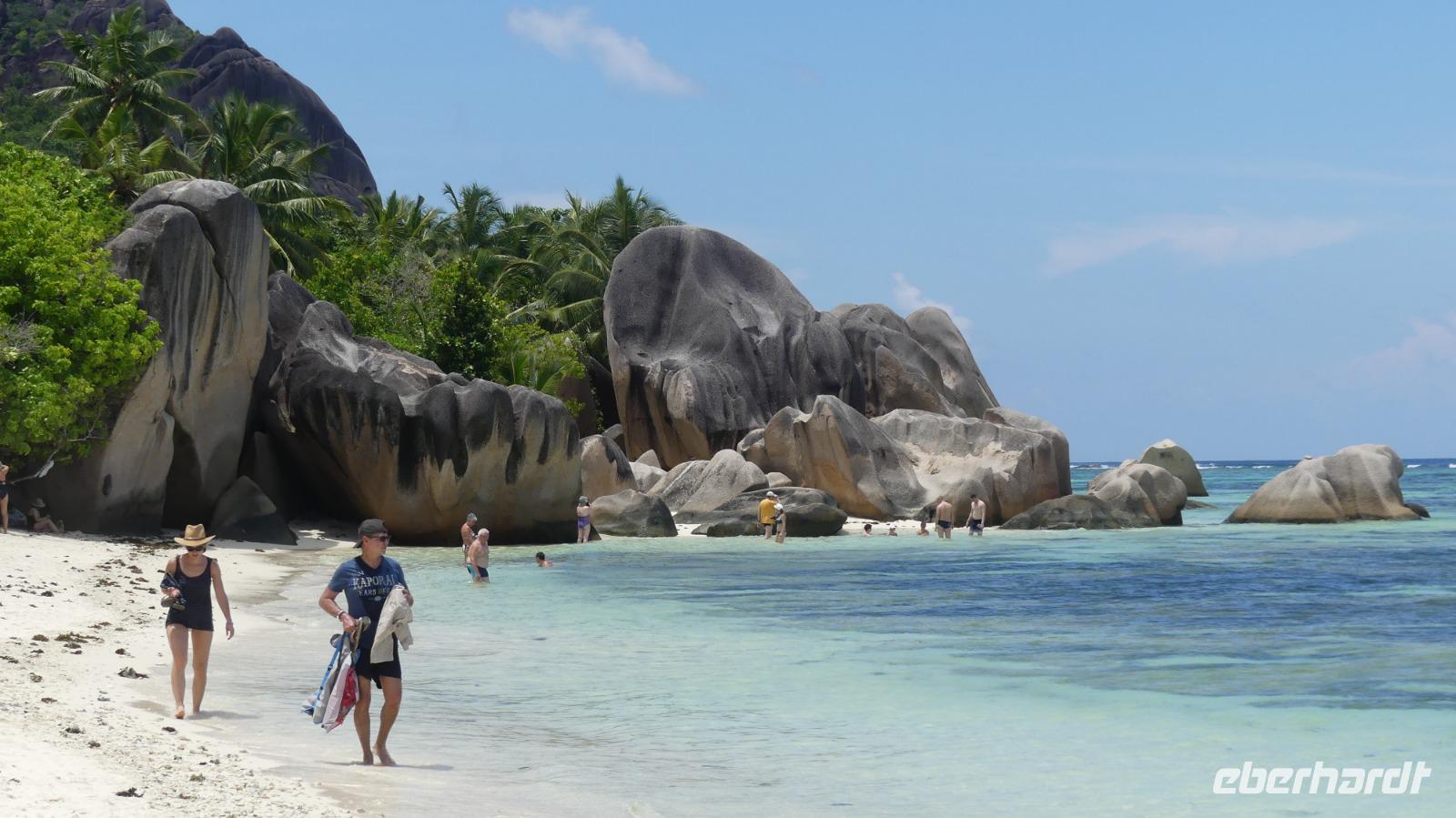 Die Zeit für den Besuch des Traumstrandes Anse Source d'Argent ist sehr günstig, denn es ist gerade Flut. So verweilen wir hier zum Baden und Fotografieren. Die verschiedenen Formationen des Granitgesteins bieten reichlich Motive.