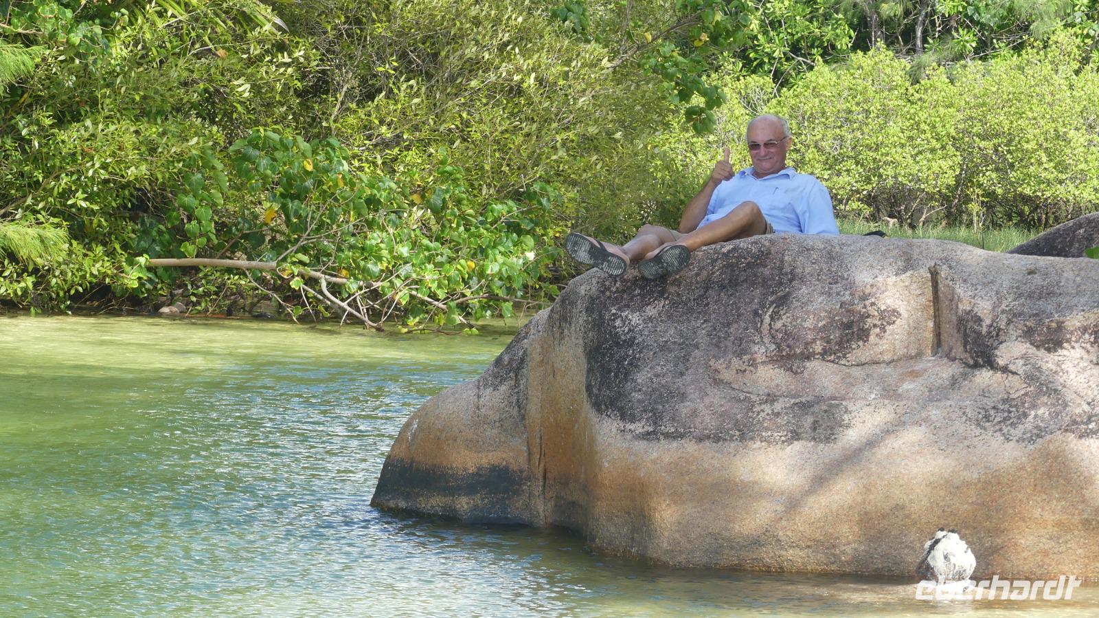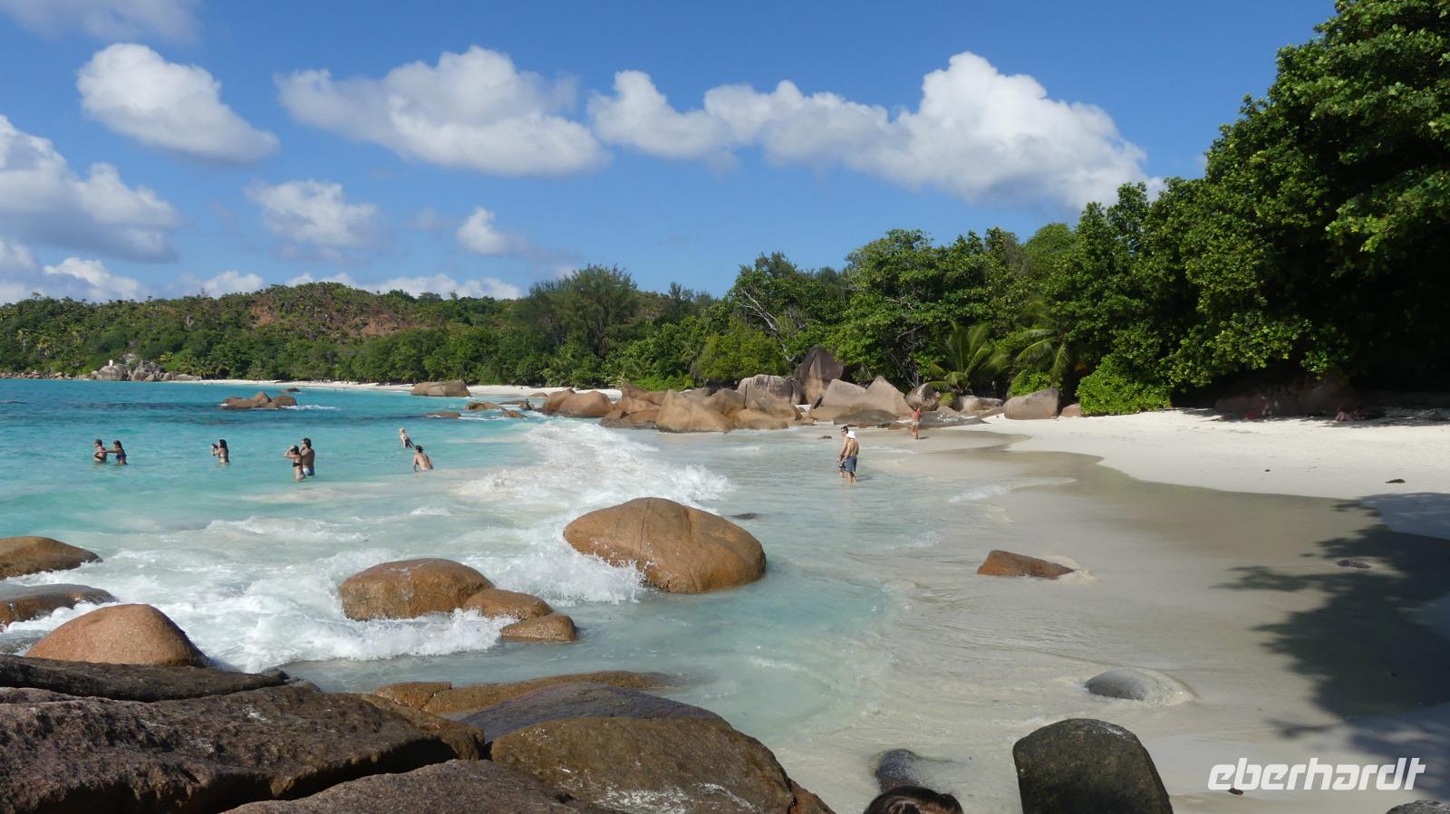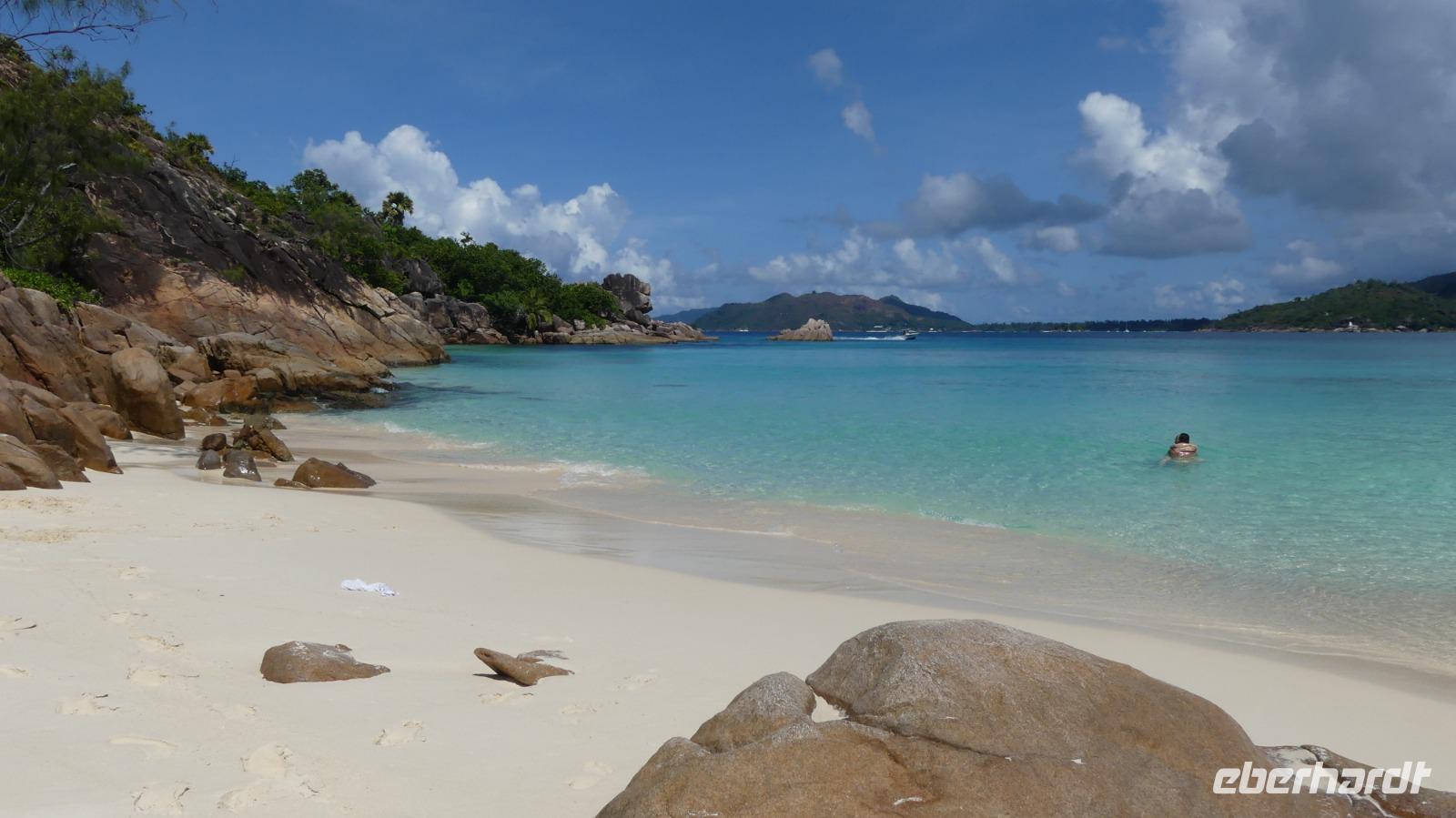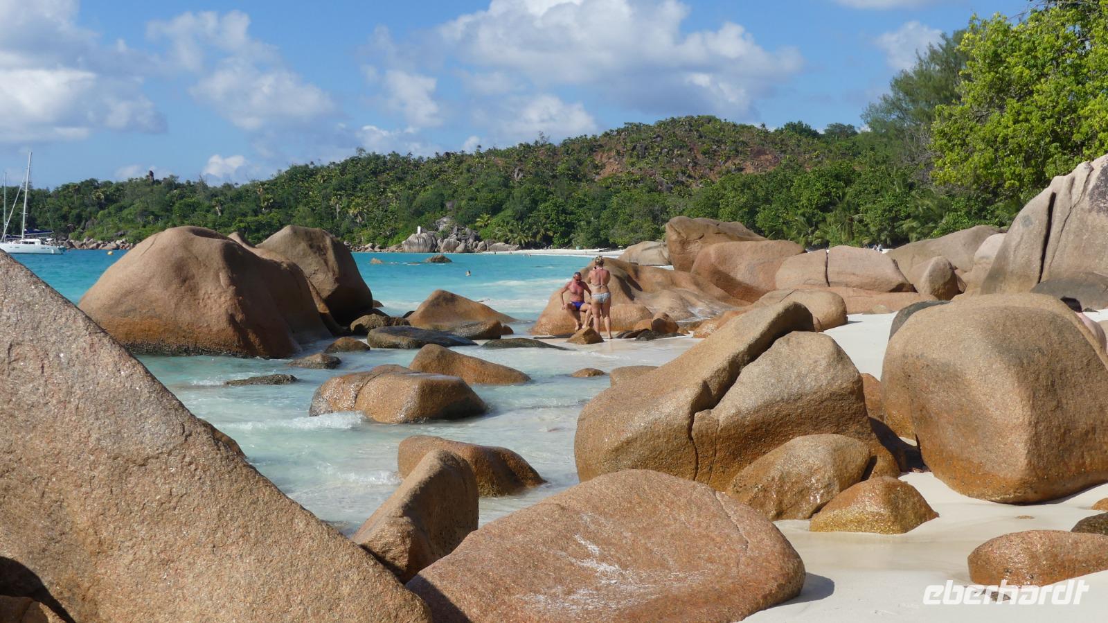 Die Zeit für den Besuch des Traumstrandes Anse Source d'Argent ist sehr günstig, denn es ist gerade Flut. So verweilen wir hier zum Baden und Fotografieren. Die verschiedenen Formationen des Granitgesteins bieten reichlich Motive.