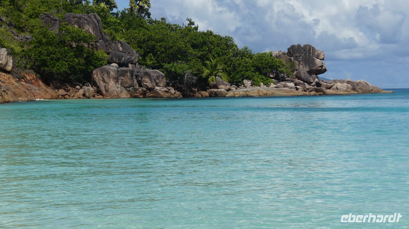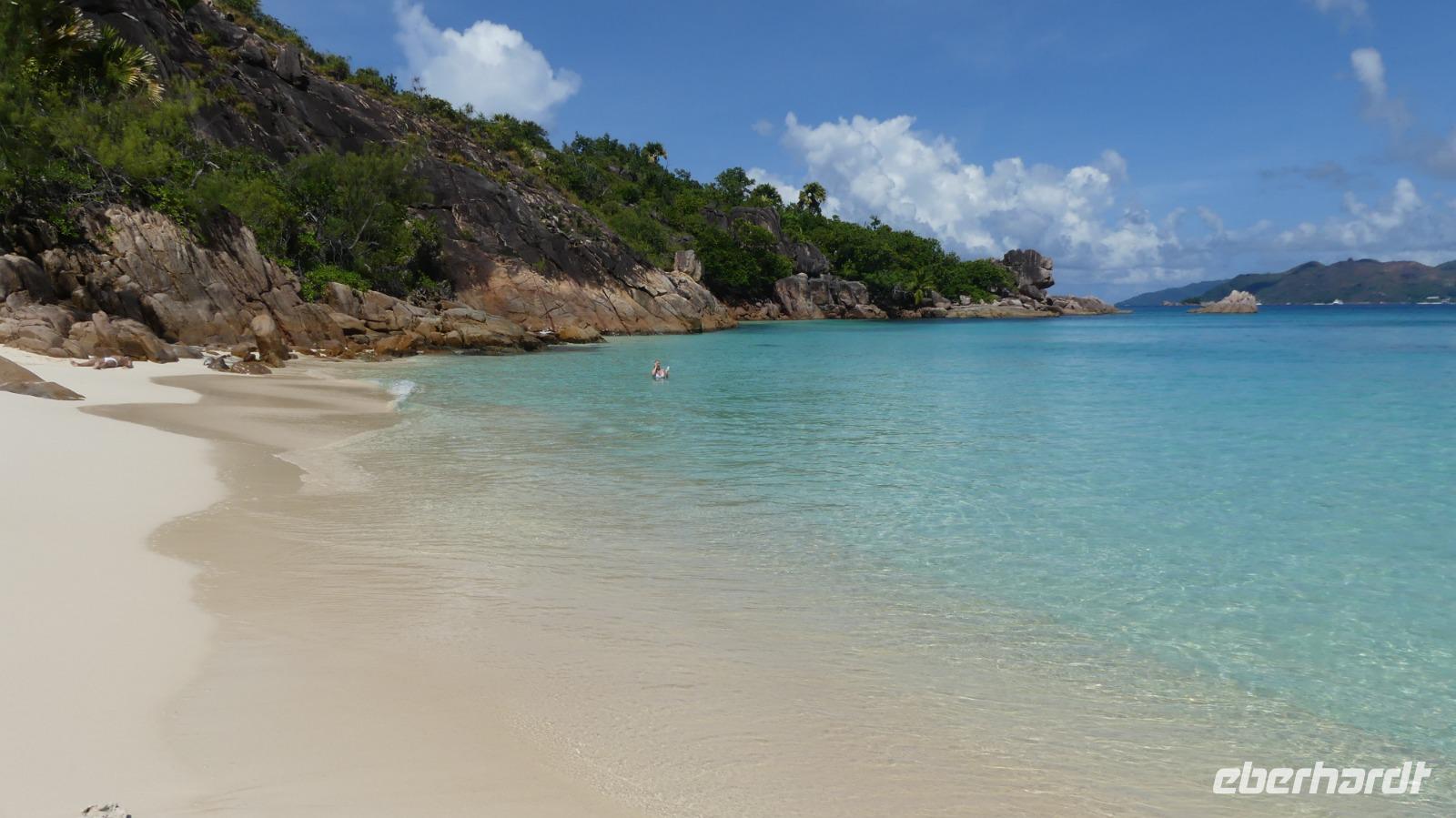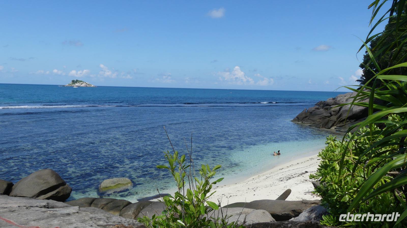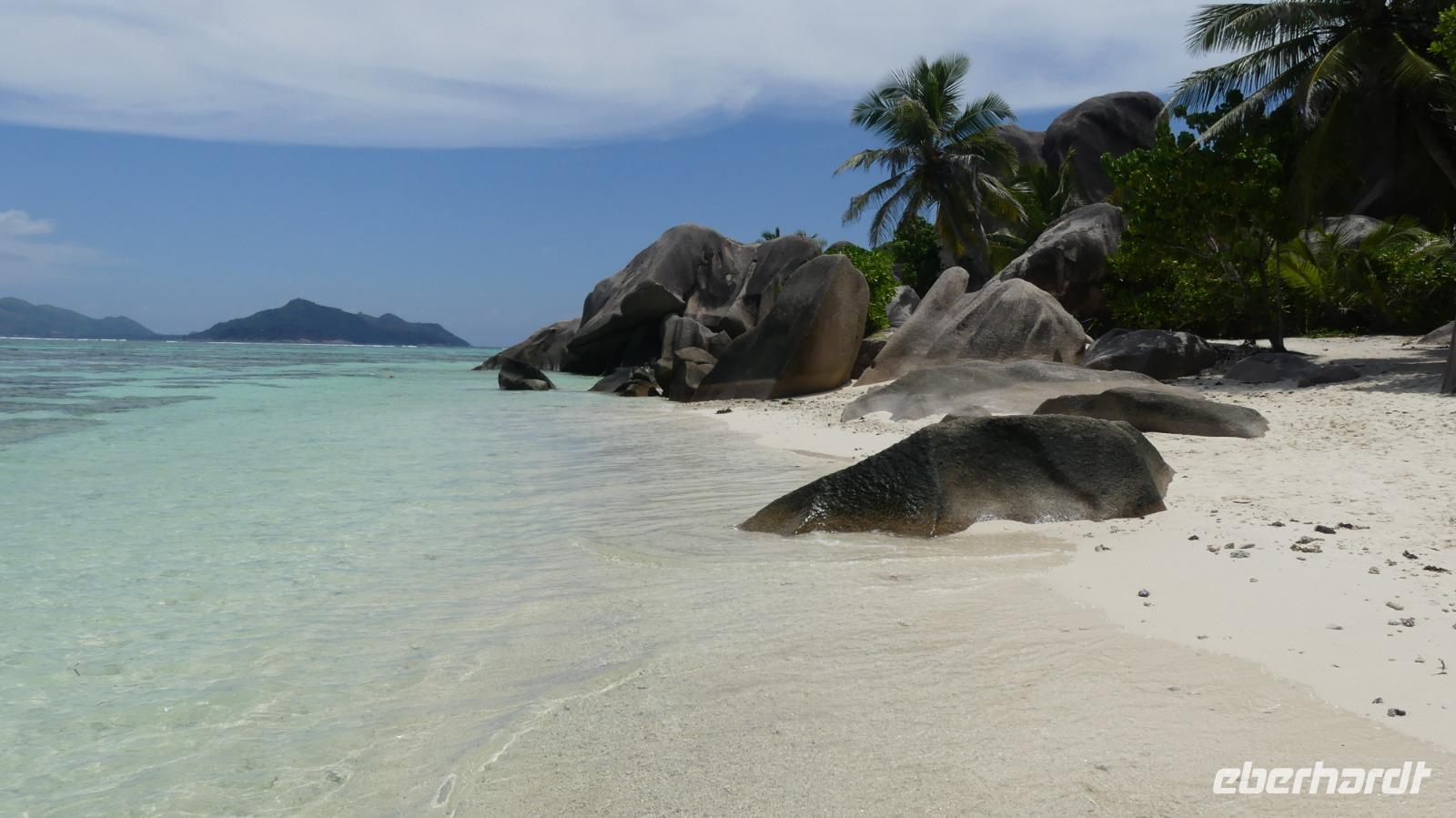 Die Zeit für den Besuch des Traumstrandes Anse Source d'Argent ist sehr günstig, denn es ist gerade Flut. So verweilen wir hier zum Baden und Fotografieren. Die verschiedenen Formationen des Granitgesteins bieten reichlich Motive.