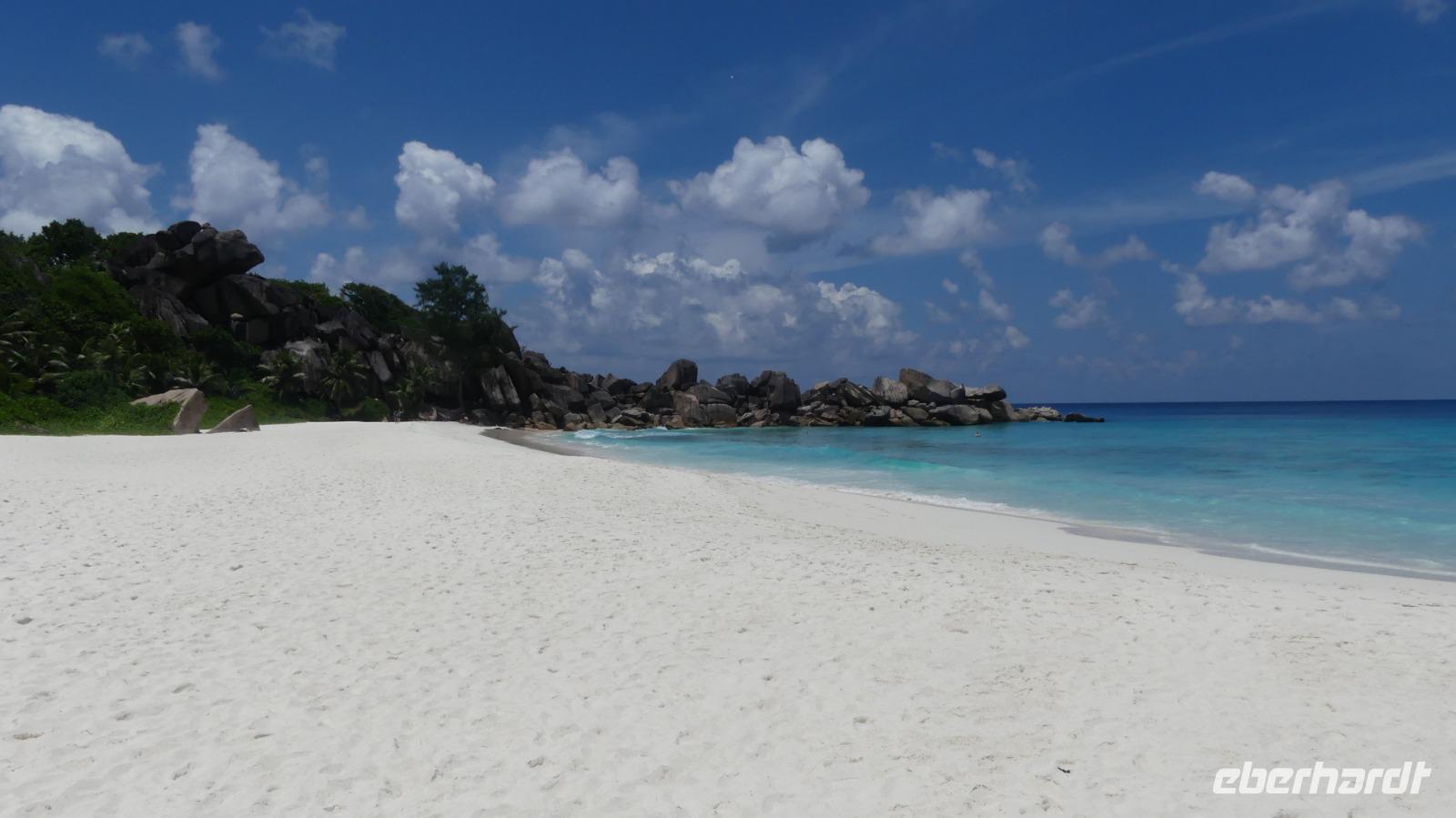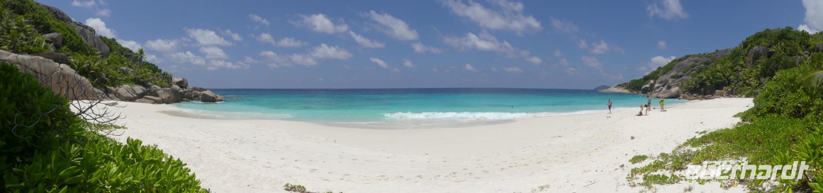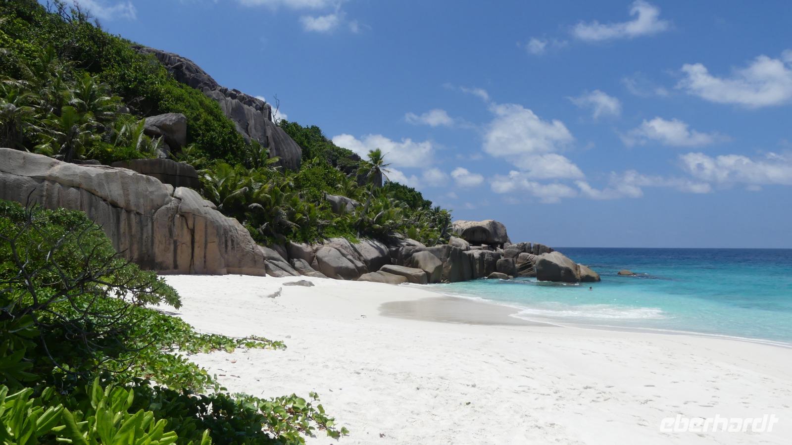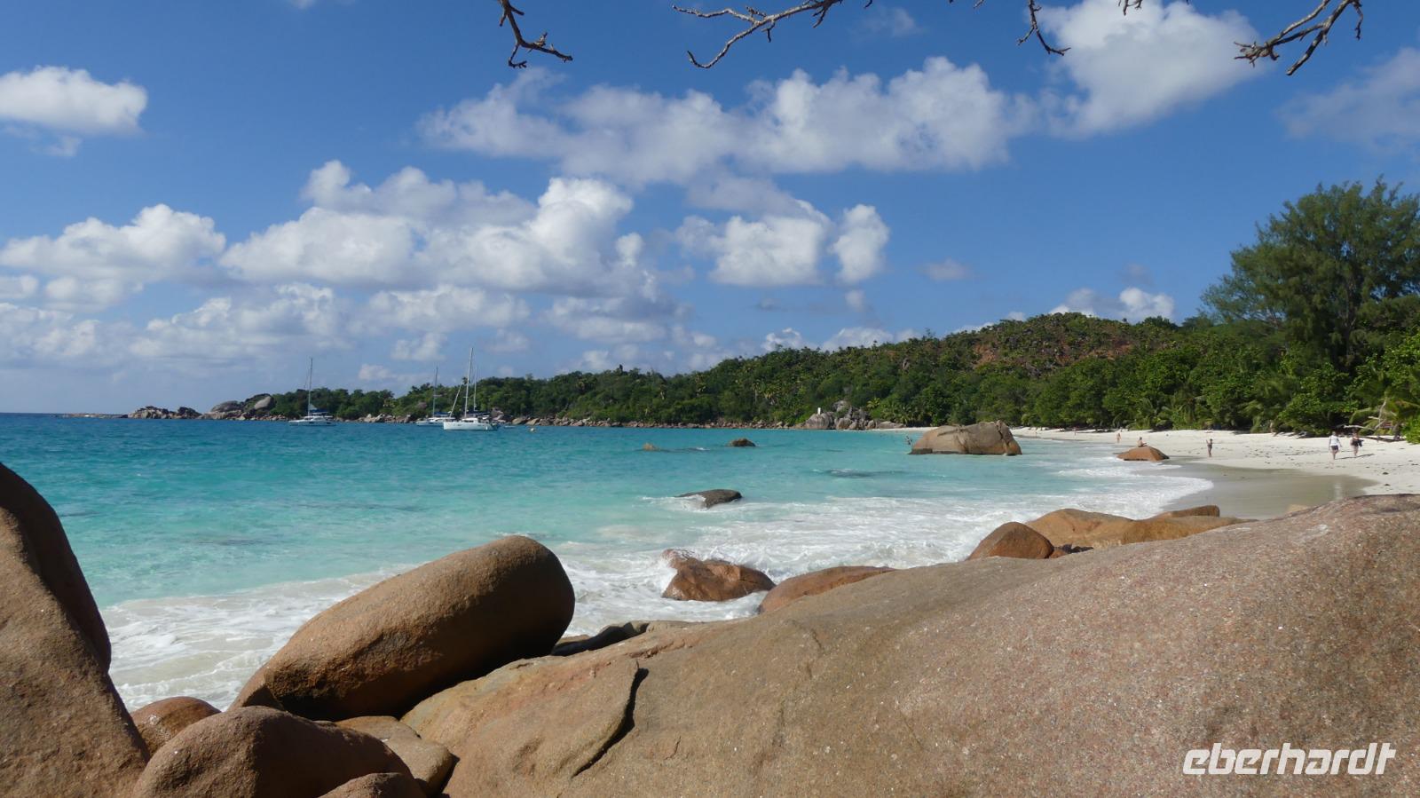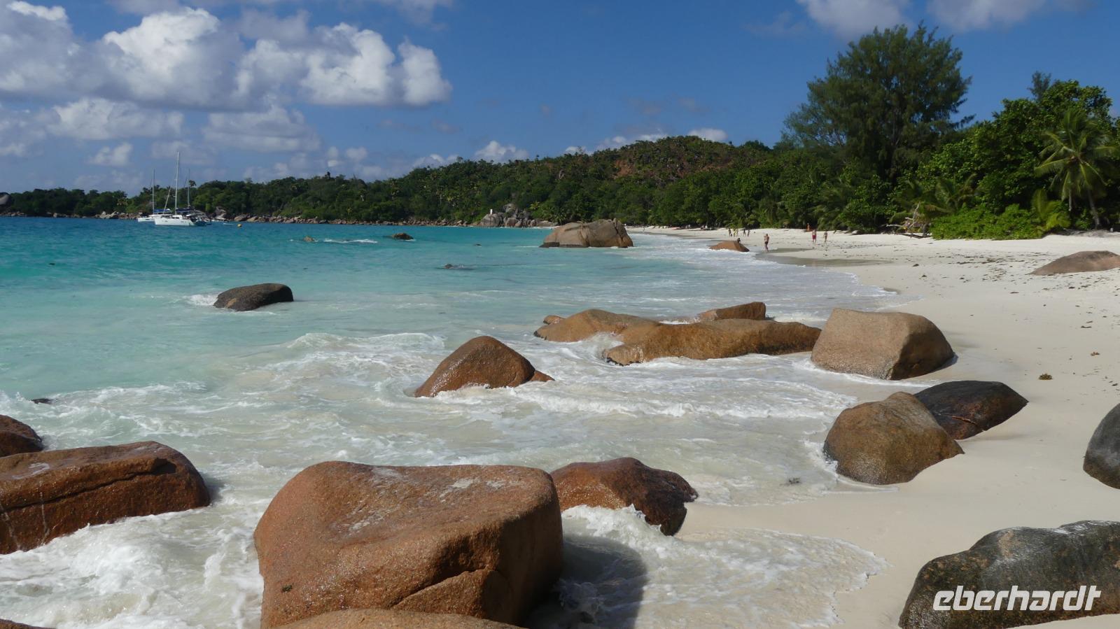 Die Zeit für den Besuch des Traumstrandes Anse Source d'Argent ist sehr günstig, denn es ist gerade Flut. So verweilen wir hier zum Baden und Fotografieren. Die verschiedenen Formationen des Granitgesteins bieten reichlich Motive.