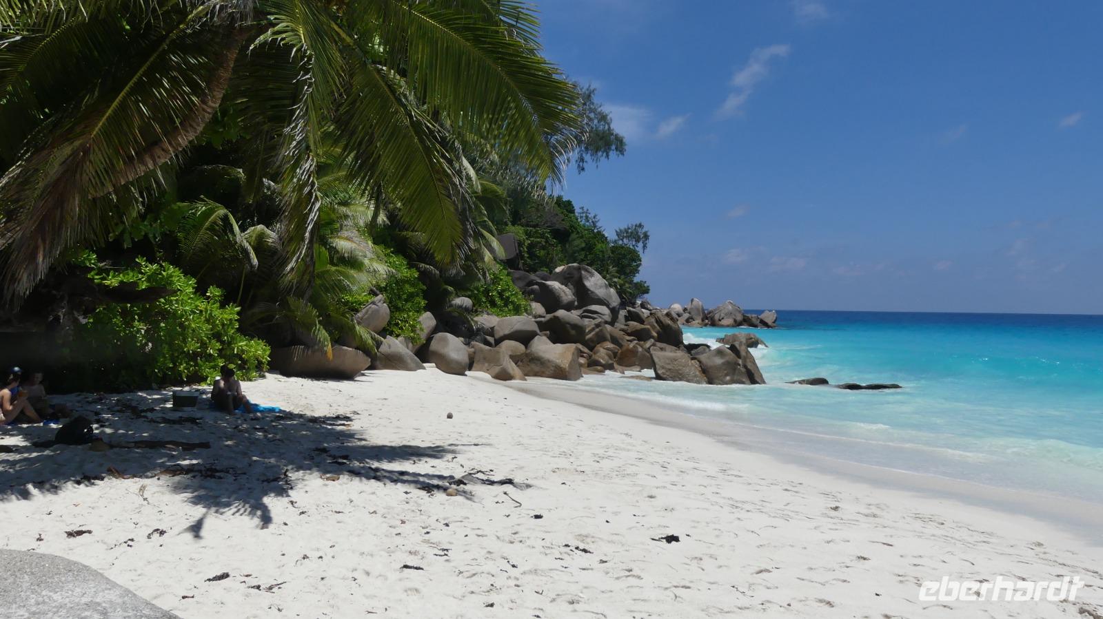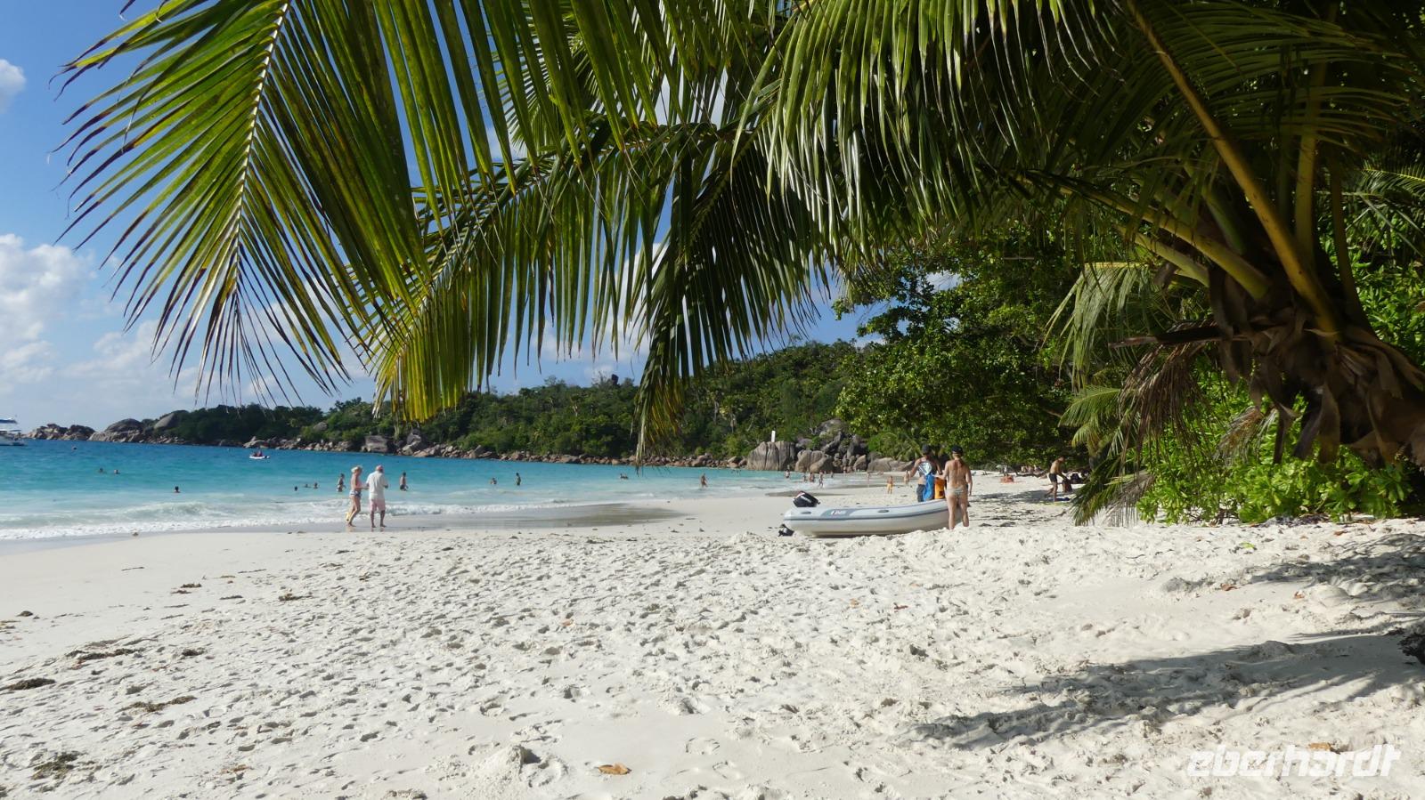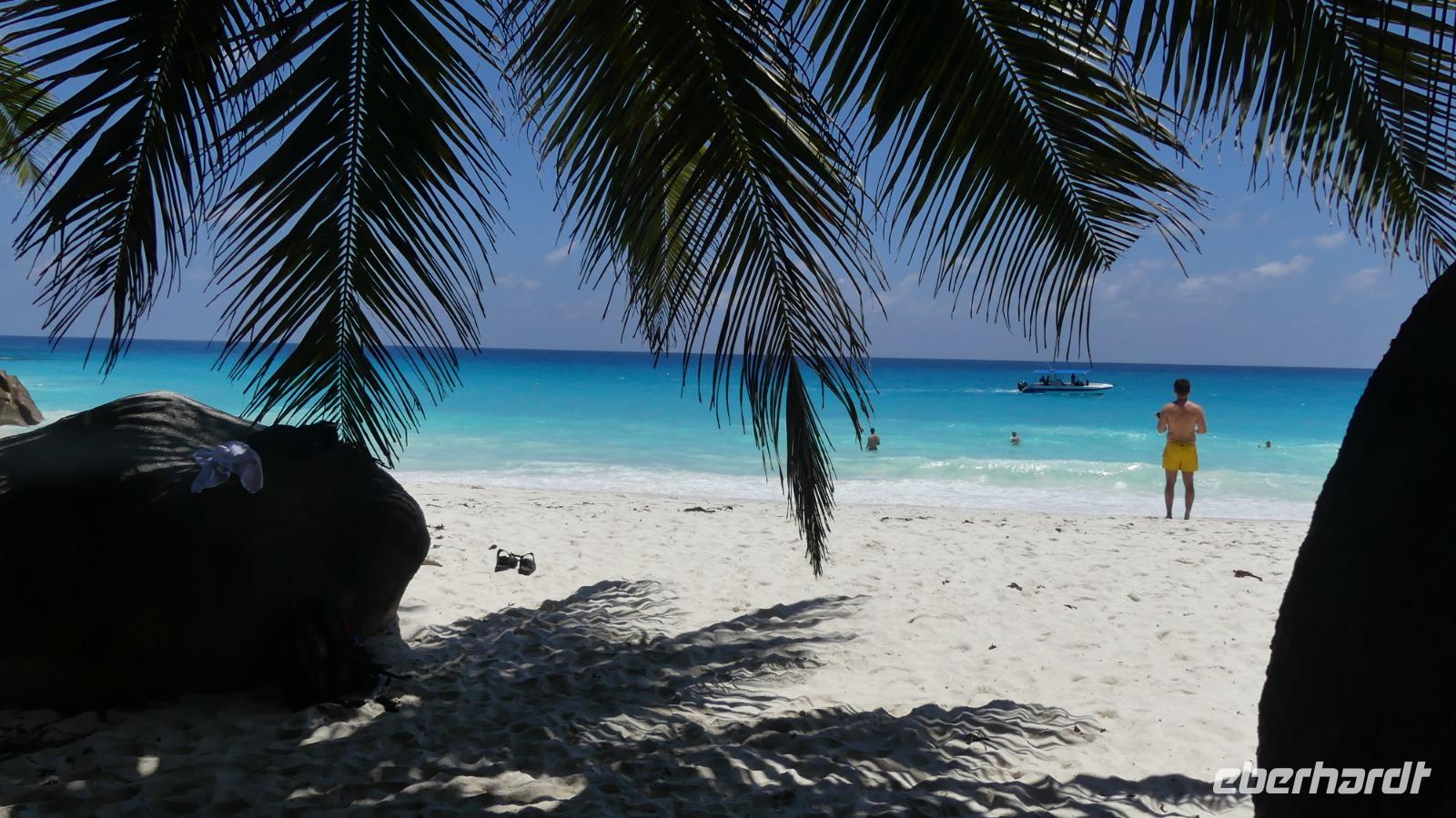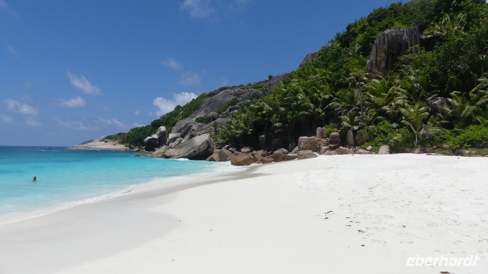 Zum Mittagessen begeben wir uns per LKW auf die andere Inselseite zum nächsten Traumstrand, den Grand´ Anse. Eingerahmt von Granitfelsen liegt der weiße Puderzuckerstrand (feiner Korallensand) am klaren türkisfarbenen Meer. Die intensiven Farben der Seychellen begeistern uns immer wieder aufs Neue. Kleiner Schönheitsfehler: da es kein vorgelagertes Riff gibt, sorgt die Brandung für Strömungen, weshalb man nicht weit hinausschwimmen sollte.