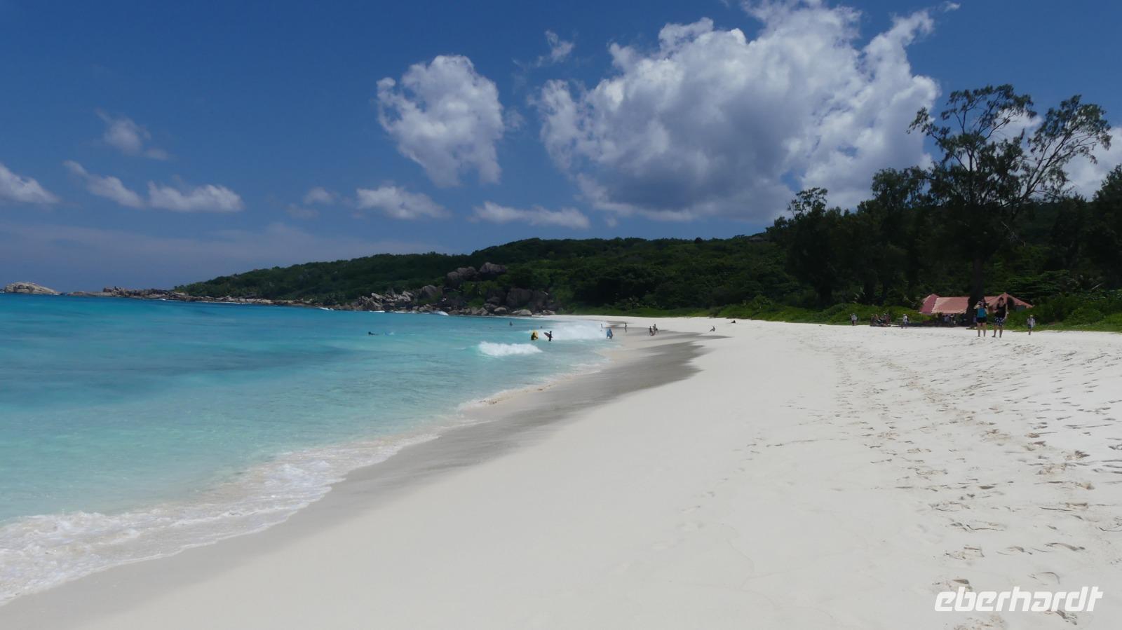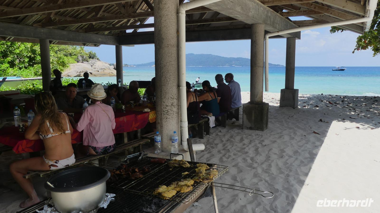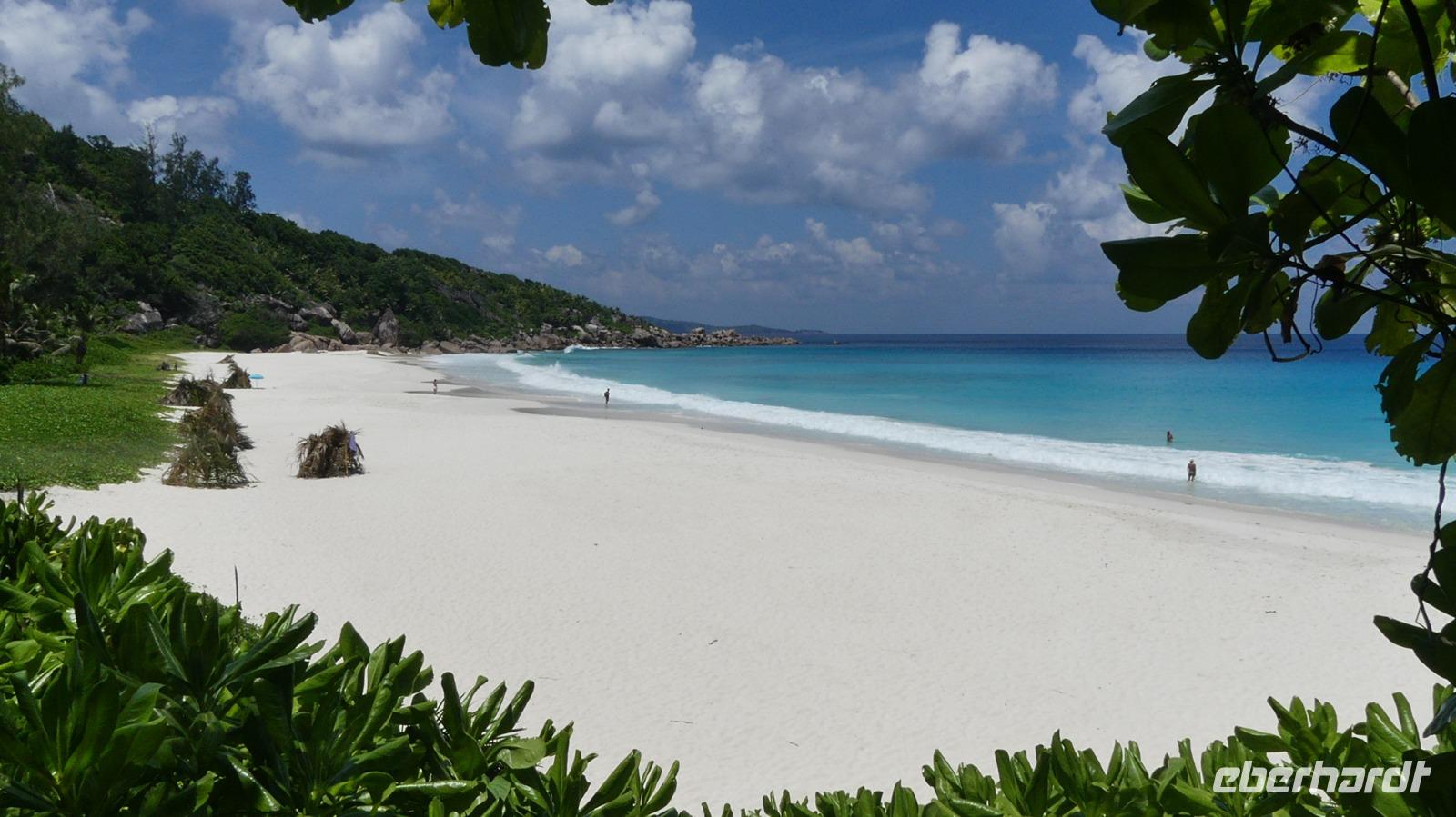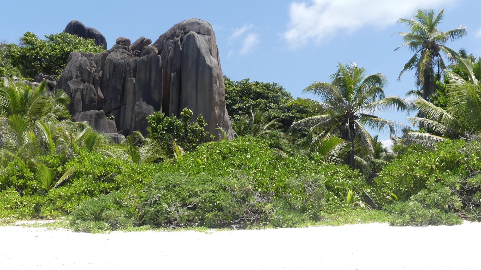 Zum Mittagessen begeben wir uns per LKW auf die andere Inselseite zum nächsten Traumstrand, den Grand´ Anse. Eingerahmt von Granitfelsen liegt der weiße Puderzuckerstrand (feiner Korallensand) am klaren türkisfarbenen Meer. Die intensiven Farben der Seychellen begeistern uns immer wieder aufs Neue. Kleiner Schönheitsfehler: da es kein vorgelagertes Riff gibt, sorgt die Brandung für Strömungen, weshalb man nicht weit hinausschwimmen sollte.